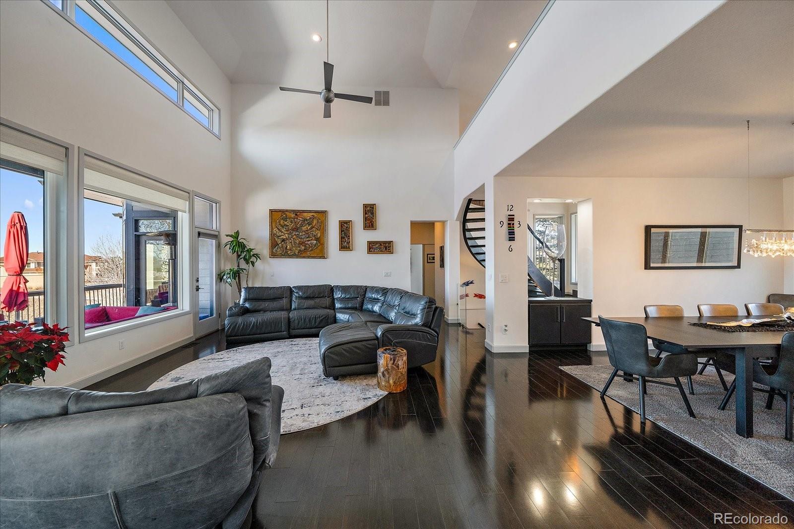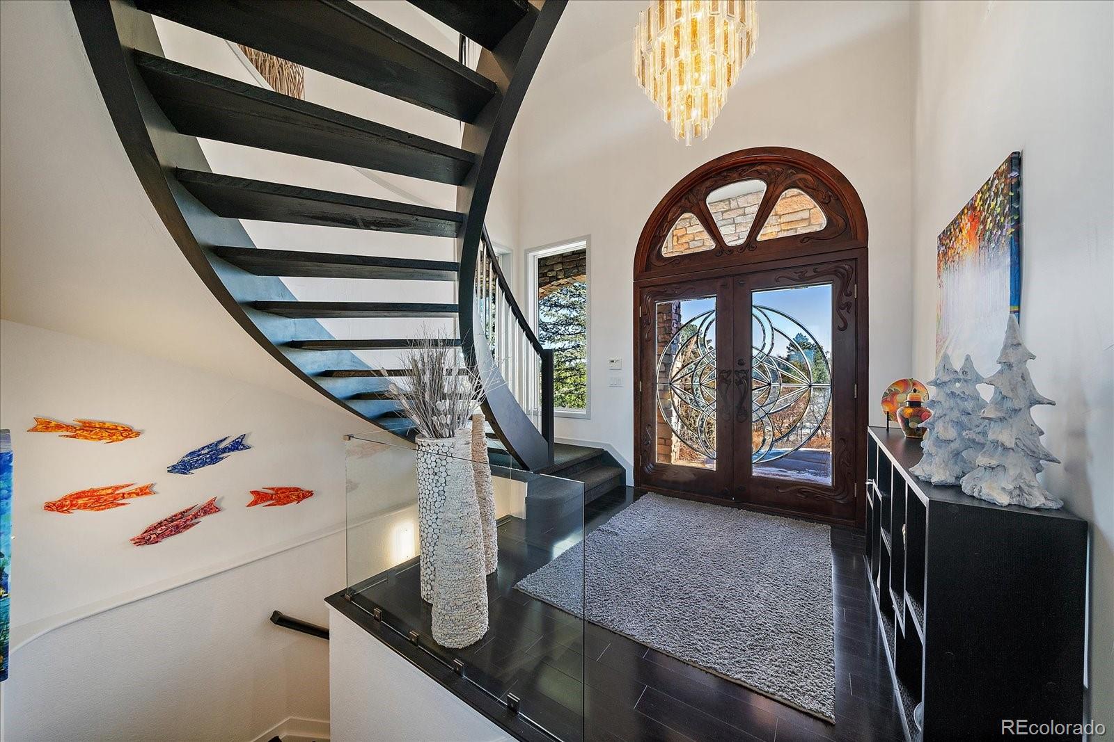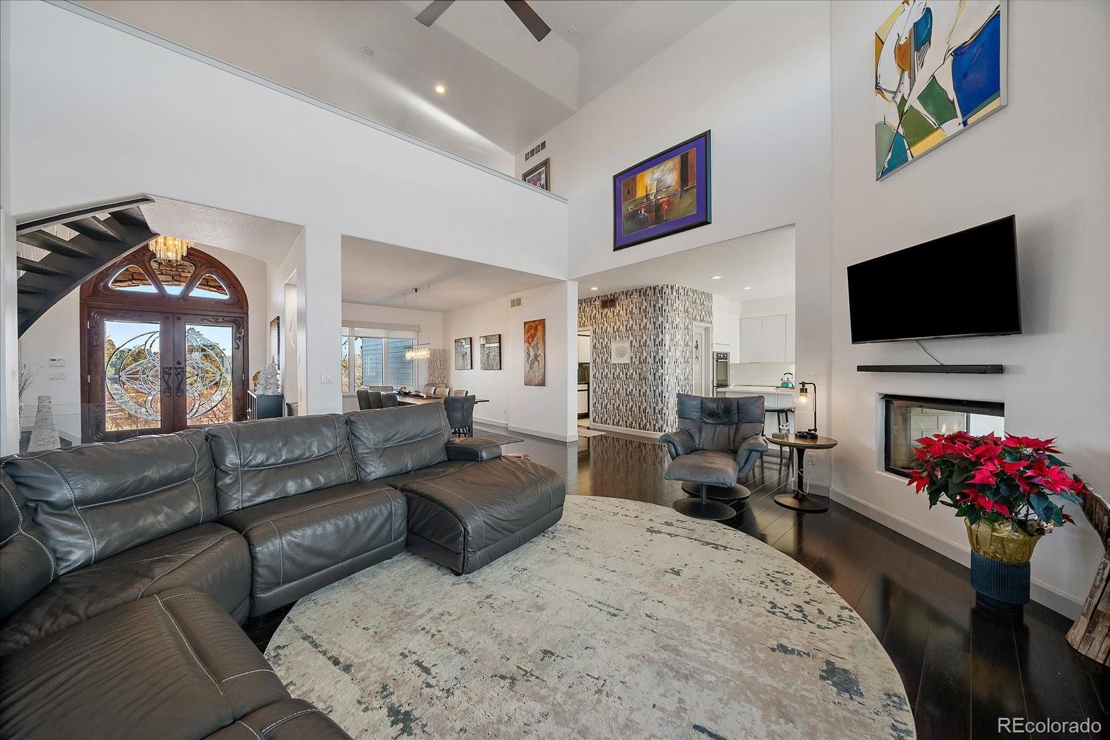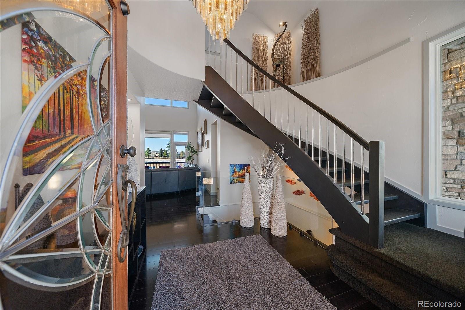 Experience luxury living on the ridge in this exquisite 5,800-square-foot walkout estate, perfectly positioned along the 18th hole of the prestigious Ridge Golf Course in Castle Pines. This masterpiece of design welcomes you with soaring 12-foot ceilings on the main level and an elegant oak curved staircase that sets a sophisticated tone.