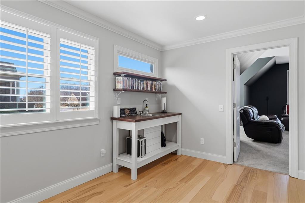 Tony Abu built, this home offers a foundational setting for aspirational & comfortable living. The front foyer is flanked by a sun splashed front living or office/library & oversized dining room with a tray ceiling & custom millwork. The great room is accented with a built-in book case & fireplace while a wall of windows with transoms overlooks the private wooded back yard & hilltop views.