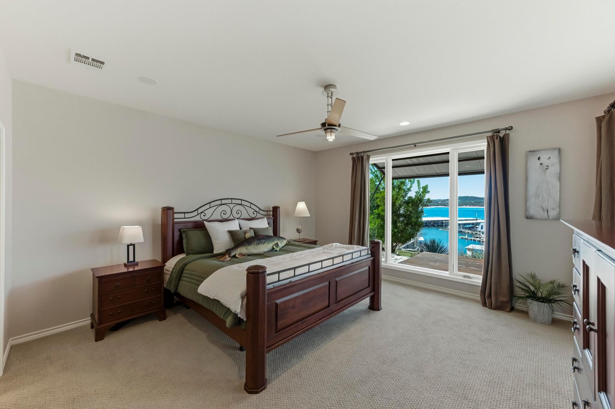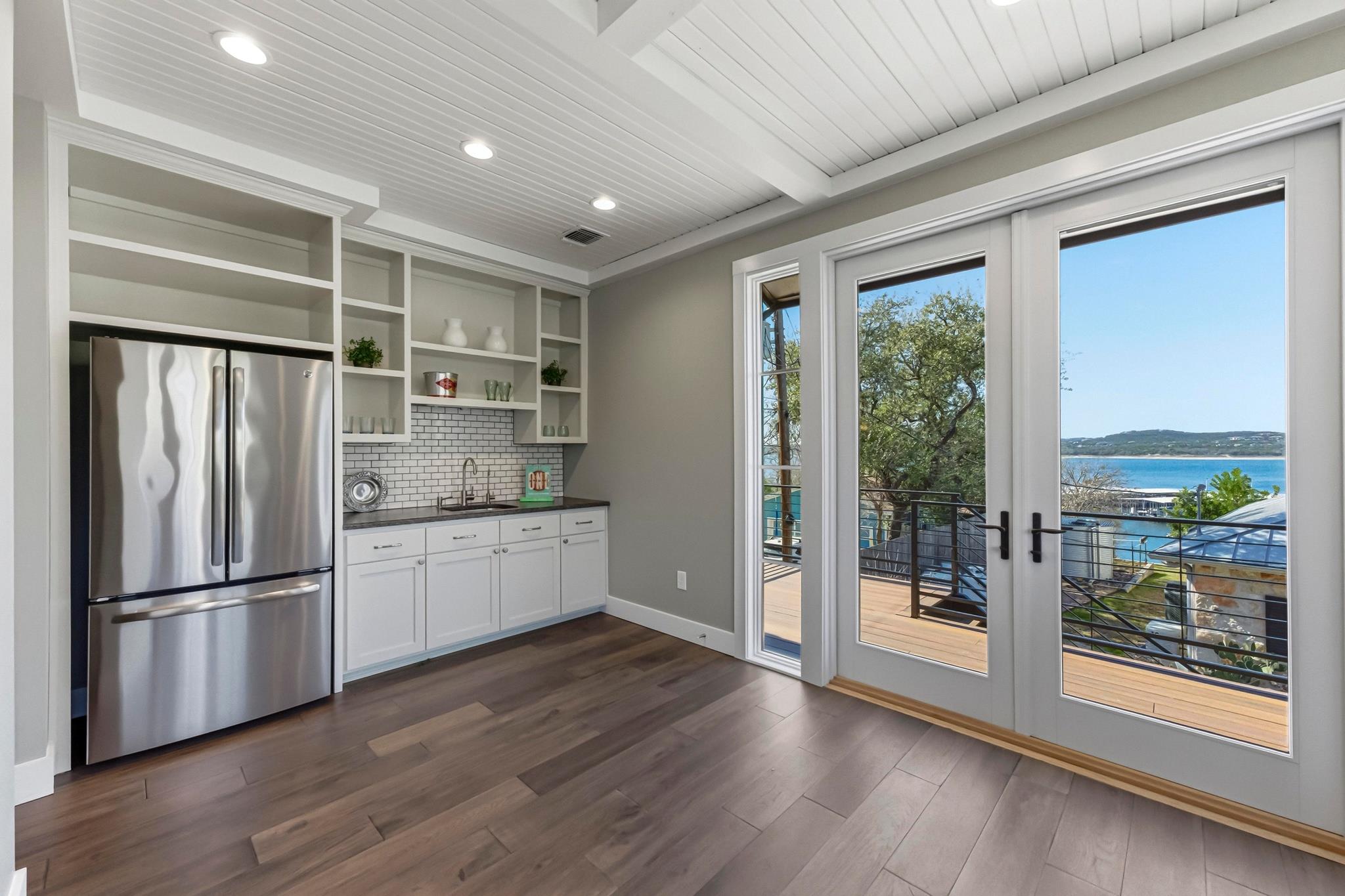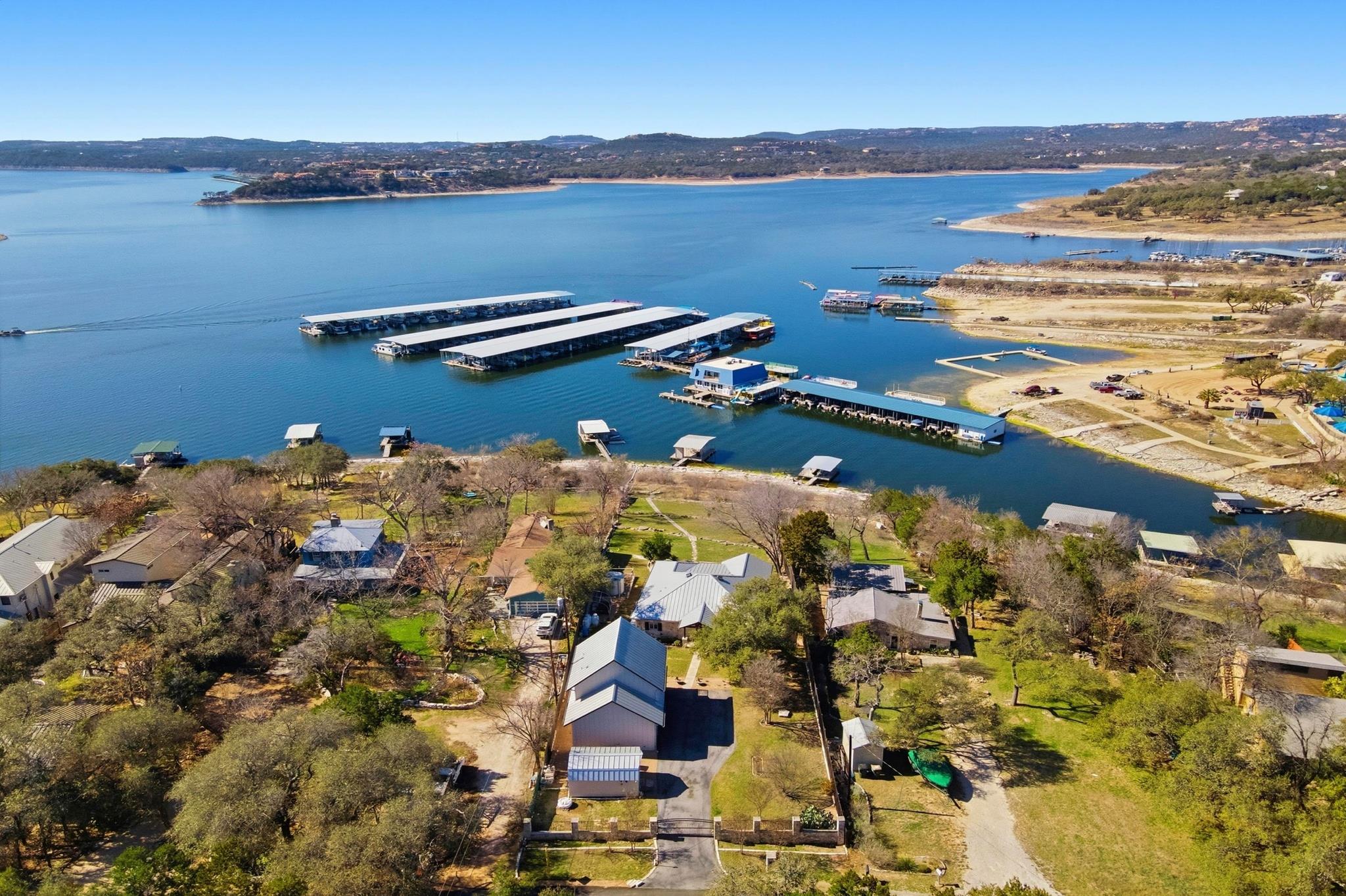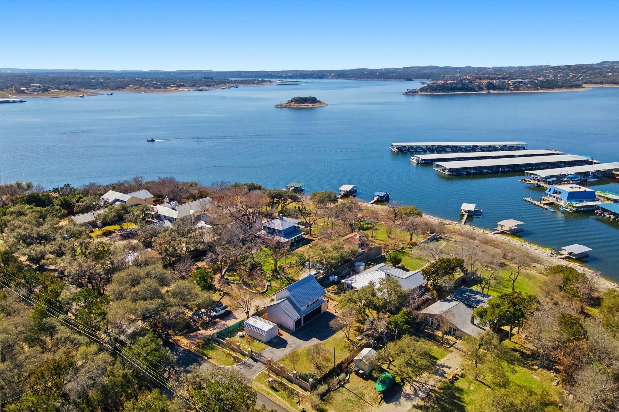 Texas Hill Country meets Lake Travis at this exceptional waterfront retreat! Blending historic character with modern comfort. Breathtaking views of Lake Travis with resort-style living behind a private gate. Open the front door of this stunning 1 story home and you are greeted by walls of windows framing amazing lake views. This home has the original stone walls from its 1946, preserving its historic charm, the thoughtful updates from 1995-2012 added all the modern conveniences. The kitchen is designed for both everyday living & entertaining, granite counters, abundant cabinetry, & huge breakfast bar. Open living & dining areas are flooded with natural light & showcase the water views. A versatile front room can serve as an office or additional bedroom. The primary suite offers incredible lake views, a generous closet, a well-appointed bath, & direct access to the expansive Brazilian hardwood deck. Follow the path to the covered dock, built by Spillar Custom Docks. You will experience Lake Travis & enjoy everything this remarkable 64-mile-long lake has to offerboating, jet skiing, water skiing, sailing, fishing, swimming, & numerous recreational areas nearby. A natural setting includes native plants & garden area. Car enthusiasts and hobbyists will appreciate the oversized three-car garage, complete with workbench, utility sink, & extra storage. Above the garage, the second-story penthouse suite features a thoughtfully designed layout. Guests can wake up to lake views, prepare morning coffee in the open kitchen area, and relax in the combined living and dining space. Additional highlights include a versatile storage shed, a whole-house generator, and a rainwater collection systemideal for those seeking self-sufficiency and peace of mind. All of this is conveniently located in the lakeside community of Volente, minutes from the conveniences of the city. An extraordinary opportunity to experience Lake Travis living at its finest! Photos taken 2-23-2026 & NOT AI