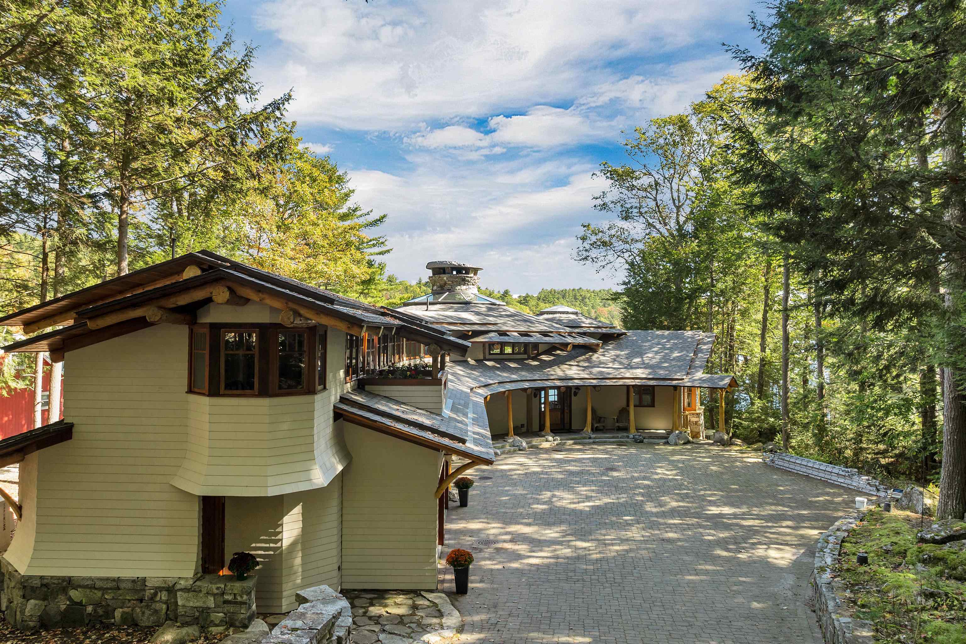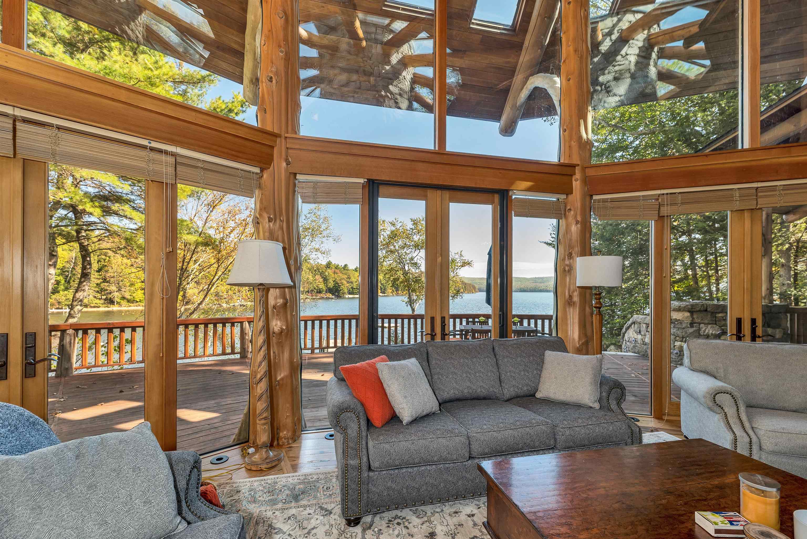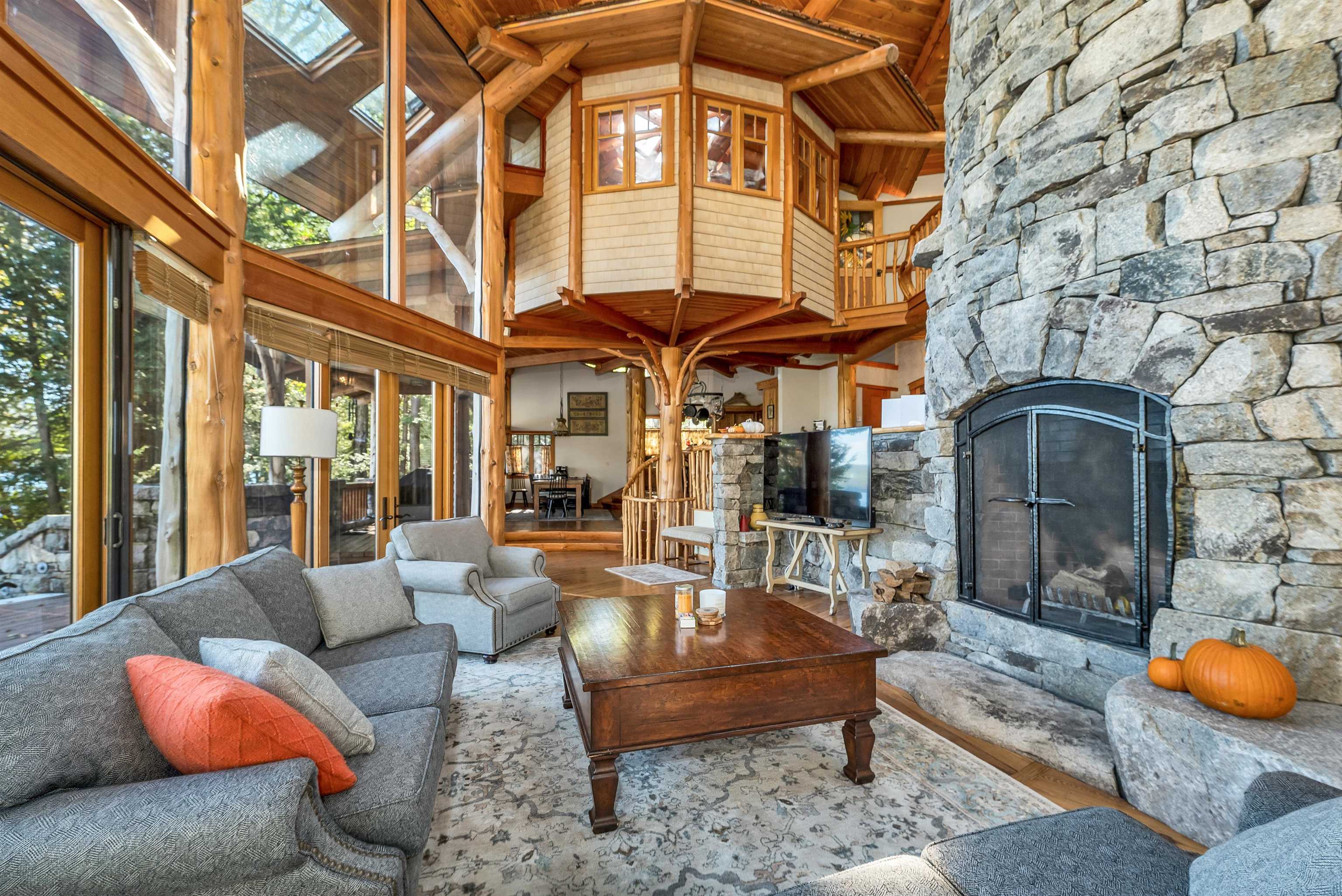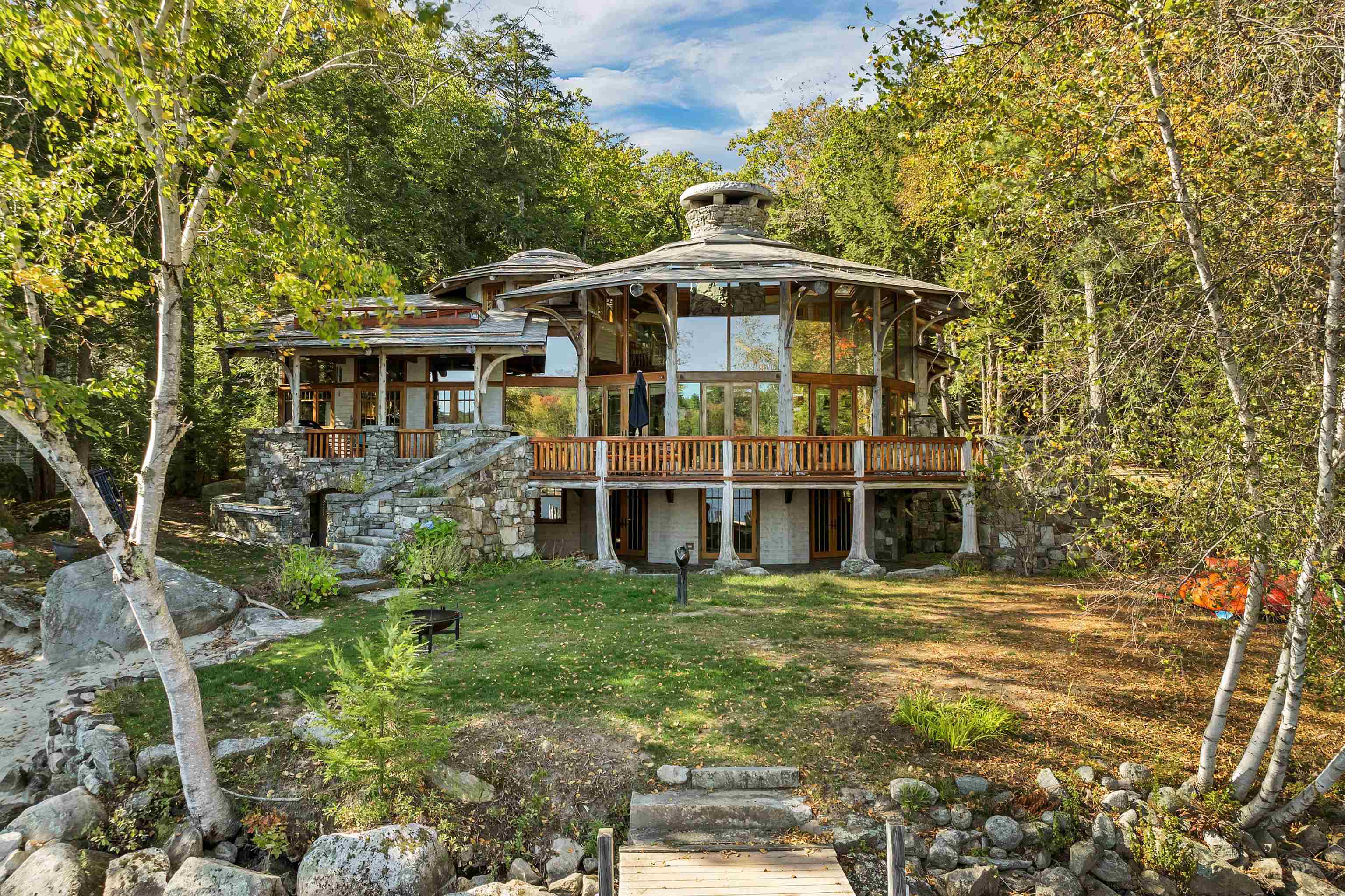 DONT MISS OPEN HOUSE ON 4/4 & 4/5/26! Spectacular ONE-OF -A- KIND Adirondack Stone & Timber style home set on the sandy shores of highly desired MERRYMEETING LAKE. Designed to be open/airy..at-one with the surrounding nature which begins at the *Great Room with 3 story stone fireplace & 20 windows. Features include a Chefs Kitchen with large island, exposed beams, cathedral ceiling & custom cabinets. Then there is the infamous special room known as The Birdhouse w/balcony appearing to be supported by a tree below. Each Bedroom has its own private bathroom. THE FOREST PATH leads to an in-law suite complete with a kitchenette, balcony & private entrance.. *Majestic South Easterly Lake Views, Dock, Raft & Sandy Beach. *Abuts 86 acres of conservation land. ARTISTIC MASTERPIECE/AMAZING CRAFTSMANSHIP ..This was the DREAM HOUSE of an Artist who SPARED NO EXPENSE in its construction.....estimated at 10 Million back in 2005. 1/- Million in MASONRY work alone. Current owners have since repaired/improved every aspect of this amazing property.......now truly in MOVE-IN CONDITION. AMONGST THE ATTACHMENTS IS A LIST OF UPDATES & FIXES MADE OVER THE PAST 3 YEARS & COMMON FEELINGS AND SENTIMENTS SHARED WRITTEN BY THE CURRENT OWNERS. Merrymeeting Lake is always a top rated NH lake known for its pristine crystal clear spring fed waters ideal for fishing, swimming & boating. NEW Durham is the gateway to the Lakes Region and a transition point between the Mountains & the Seacoast........ 90 /- minutes from Boston. No surprise that this property has been widely written about and previously been on the Realtor.com list of MOST POPULAR HOMES. Forgot to mention, the home features state of the art electronics, central air, an on-demand generator and a heated 2 care garage. Excellent Weekly Rental History..Many disappointed tenants that this special property may no longer be available to rent.
