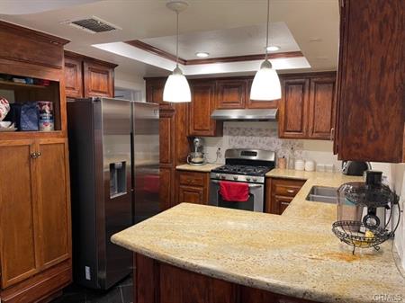 Stunning 2 Story Winnetka Beauty. This Beautiful home boasts 2294 sq ft of living space, 4 bedrooms 3 bathrooms large loft with amazing floor plan. Lovely Black Galaxy Granite flooring downstairs, Granite counter-tops in Kitchen, Wood Cabinets, Wood Spiral stairs, updated bathrooms, beautiful Cathedral Ceiling, formal dining room, formal living room and lovely fireplace, family room with Wet Bar and recessed lights, One bedroom and a full bath at lower level. Fully remodeled two Car Garage decorated with mosaic tiles featuring Extra Kitchen with Granite counter tops. Laminate flooring upstairs. Large master bedroom with balcony, high ceilings, his and hers Walkin closets. Mater Bath with double sink, shower and great size spa tub for relaxing after a long day of work. Two other good size bedrooms upstairs. Extra-large. Fully concrete, delicately manicured Backyard ready to entertain family and friends for those lovely summer nights with a variety of fruit trees such as Guava, Apple, Tangerine, Pomegranate, Grapefruit, and Jujubee. This Gem is ready to move in. Must see property.