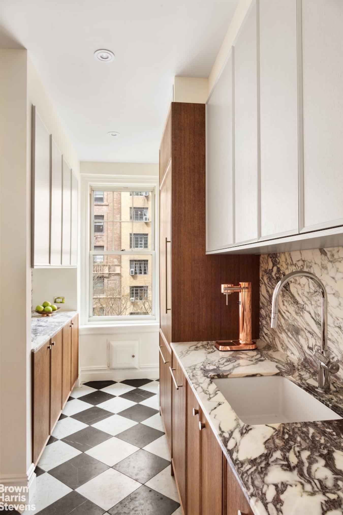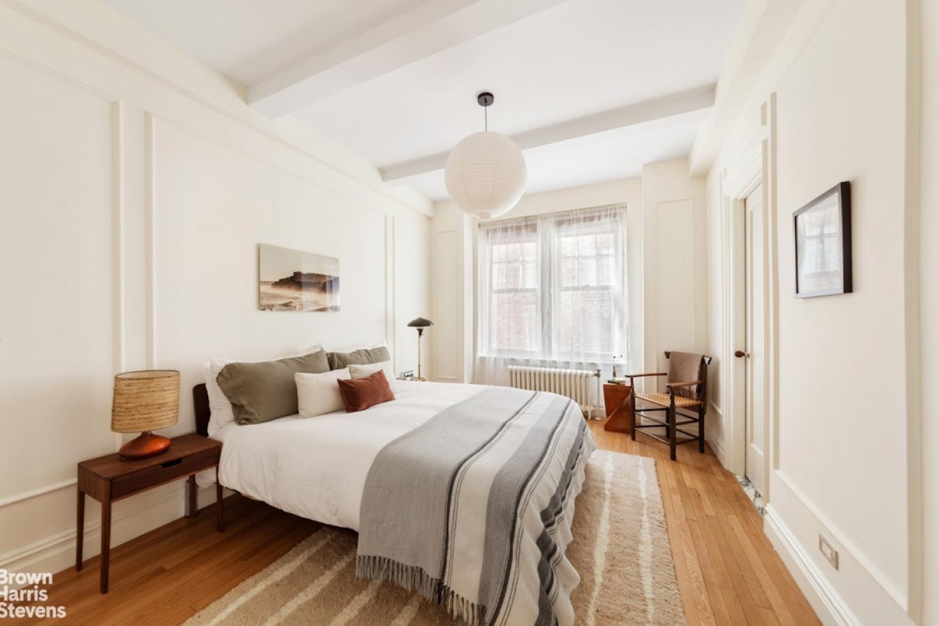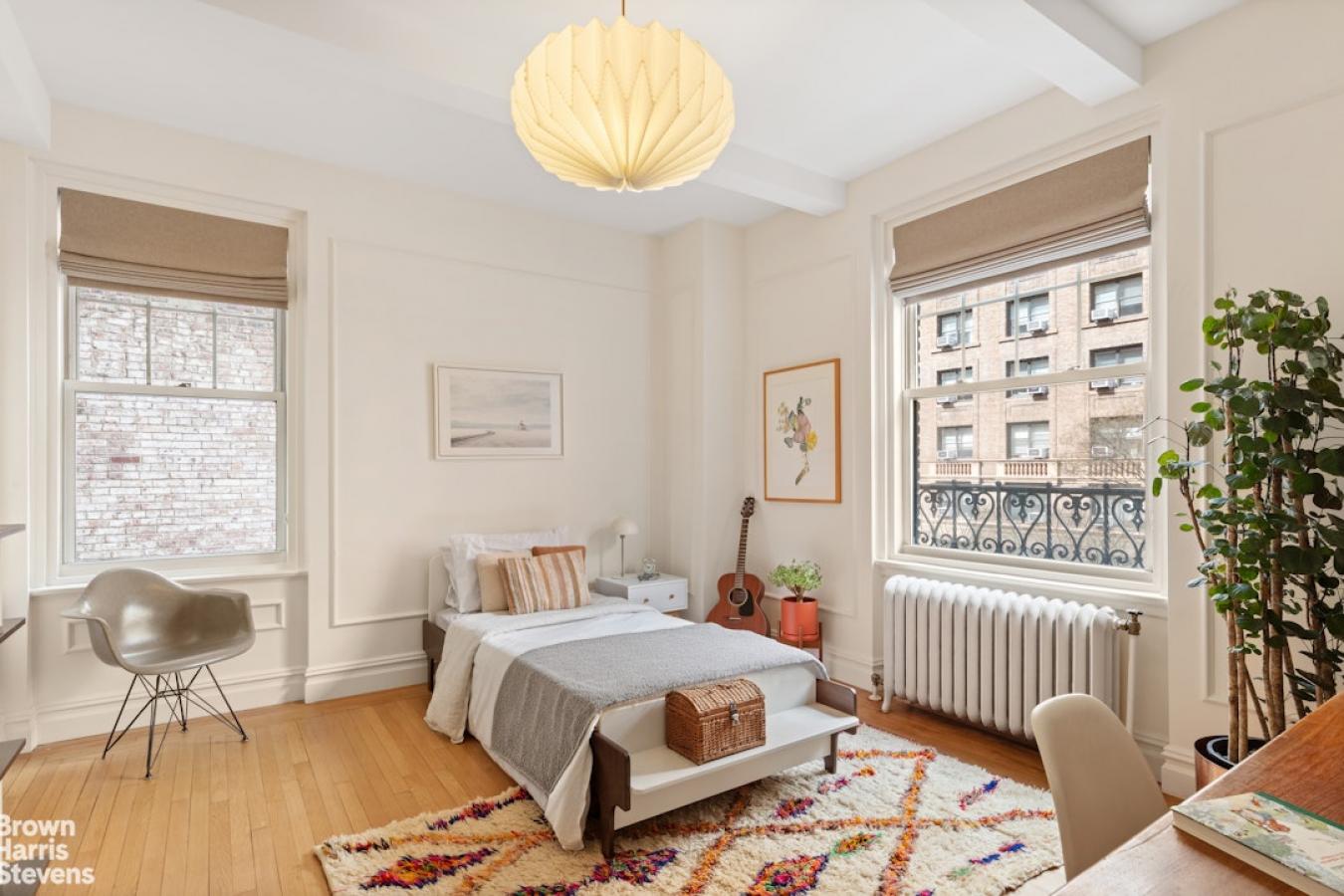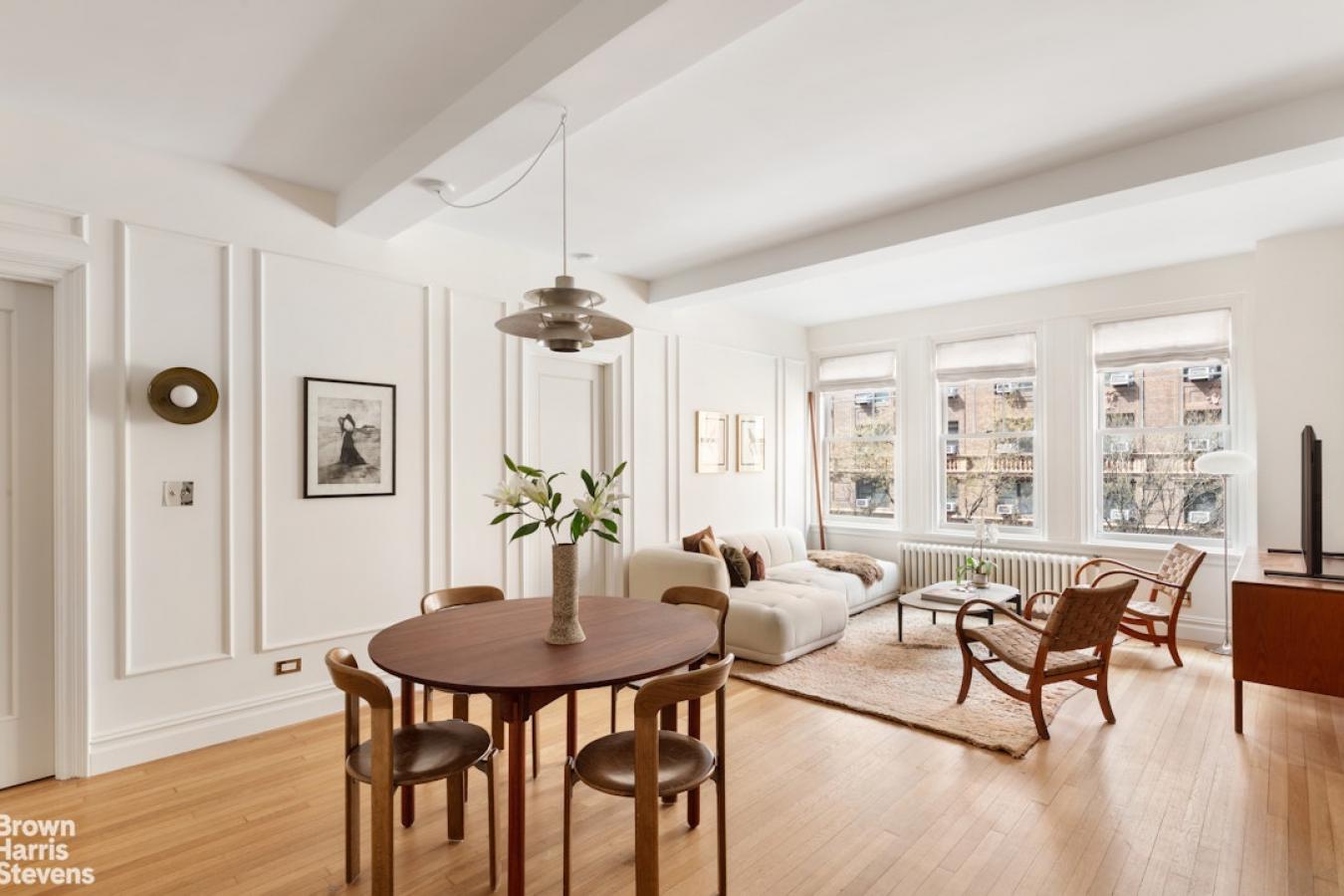 A corner two-bedroom of rare finish, tailored to the most discerning buyer. Residence 4C at 310 West End Avenue is a sun-drenched, meticulously detailed home with a distinctly European sensibility and the ease of modern city living. A gracious entry foyer sets the tone, with two closets and exquisite custom mosaic flooring with heritage detailing. Beyond, an expansive living and dining room unfolds, framed by large windows with picturesque views of tree-lined streets, high beamed ceilings, custom millwork, and intricate molding. A dedicated custom workstation adds both function and flexibility. The windowed kitchen is anchored by a generous island with seating for three, marble countertops and backsplash, custom cabinetry, and a full suite of premium appliances including a Bertazzoni refrigerator, Bosch dishwasher, and Fisher & Paykel induction range. The primary suite is a quiet retreat with excellent light, generous proportions, custom molding, and two walk-in closets. The corner second bedroom offers dual exposures, open city views, and equally generous proportions. Both bedrooms share a beautifully finished bathroom with mosaic tilework, a walnut vanity, Grohe fixtures, and a deep soaking tub with glass enclosure. A powder room serves the entertaining spaces with equal care. Additional features include wide-plank flooring, custom built-ins, and thoughtful storage. Built in 1927 by Emory Roth, 310 West End Avenue is a full-service co-op with a 24-hour doorman, live-in superintendent, private storage, bike room, and laundry facilities. Pet-friendly and located one block from Riverside Park, with convenient access to playgrounds, bike paths, dog runs, express transportation, neighborhood markets including Fairway and Citarella, and the Upper West Sides dining and retail corridors. Assessment: 462.29/month through 2030.