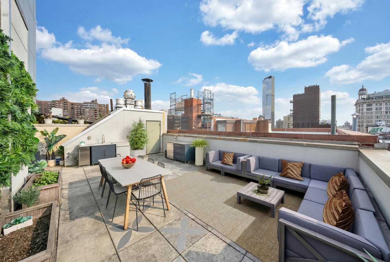 Exceptionally Rare. Trophy Home. Welcome to 50 Orchard Street, a boutique luxury condominium in the vibrant Lower East Side. 7A is a full-floor, private, keyed-elevator penthouse offering exceptional privacy and scale. This one-of-a-kind 2-bedroom, 2-bathroom home spans 1467 square feet with maple plank hardwood flooring throughout. Two private outdoor spaces, including a 584-square-foot private rooftop. There are so many large, deep closets here, plus a private storage room (not a cage) in the basement. Enter via your private keyed elevator into a spacious, sun-filled living and dining area, plus an alcove area (den or office) framed by a full wall of windows showcasing dual exposures, a bright open city view, and rooftop views. The layout comfortably supports multiple seating areas along with a full dining area, allowing for seamless everyday living and entertaining. The cutting-edge Euro-designed kitchen is both thoughtfully designed and highly functional, centered around a substantial butcher-block island. It features a 5-burner SMEG gas range with a hood, a Samsung refrigerator and dishwasher, a farmhouse sink, Carrara marble countertops, a subway tile backsplash, extensive custom cabinetry and drawers, and a laundry closet with a stainless-steel LG washer and dryer. The lengthy hallway offers a deep, double closet and leads to the bedroom wing. The oversized primary bedroom accommodates a king-size bed and includes two double closets, a private balcony, and an ensuite bathroom with a soaking tub. The second bedroom, also king-sized, offers open city views and features a large closet, custom bookshelves, and a desk nook. The second full bathroom is generously proportioned with a glass-enclosed custom-tiled shower. A proper internal wood staircase leads to the private rooftop sanctuary, where the current owners have created a fully realized outdoor space with electric and running water, finished with pavers. The rooftop includes a large seating area, dedicated dining space, and a fully built-out outdoor kitchen with a grill, refrigeration, dishwasher, and running water. A dramatic living green wall serves as a striking focal point. What sets this home apart is the rarity of an outdoor space of this scale that functions as a true extension of the residence. The layout allows for clearly defined entertaining and dining areas, an offering that is exceptionally uncommon in a condominium, especially on Orchard Street. With generous proportions and existing infrastructure, the rooftop also allows for further customization, including the addition of a projection screen for outdoor movie nights, heaters, and more, tailored to a future owners lifestyle. Opportunities for this level of private, usable outdoor entertaining space in the Lower East Side are extraordinarily rare. 50 Orchard Street is a boutique condominium with 26 residences, built in 2003, offering convenient access to the B/D, F, and J/Z trains and located at the center of the Lower East Sides most sought-after residential and lifestyle corridor. Orchard Street between Broome and Hester is one of the Lower East Sides most sought-after blocks, valued for its chill weekends, zoning protections that limit nightlife, and a rare residential vibe in the heart of the downtown Manhattan area. Area Amenities: Shin Gallery. International Center of Photography Museum. Nine Orchard Hotel. Corner Bar & Swan Room. Colbo. Komune. Le Labo Fragrances. Dudleys. Isla & Co. Van Der Plas Gallery. Dirt Candy. Wildair. Katzs Delicatessen. Russ & Daughters and much more. Pets welcome.
