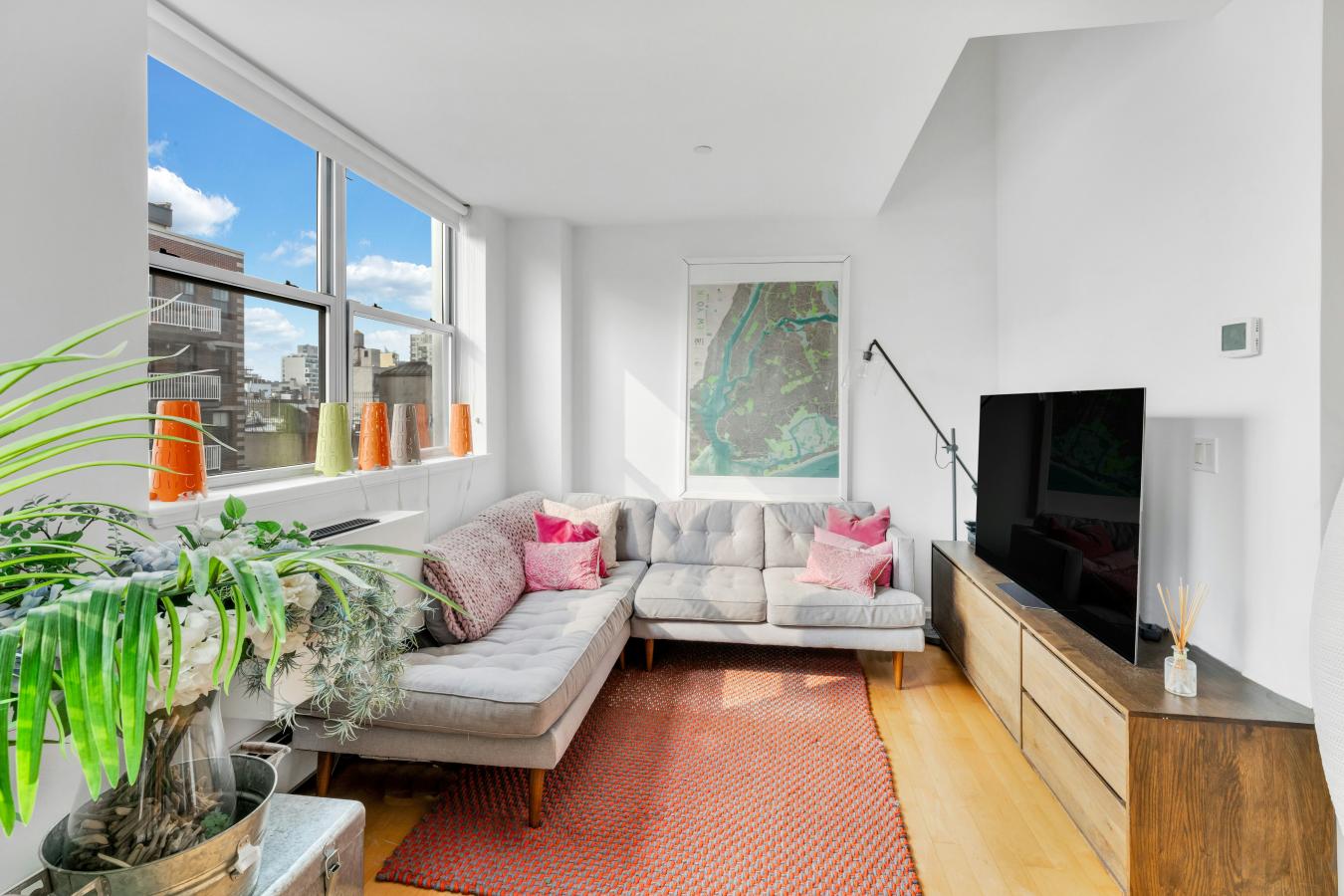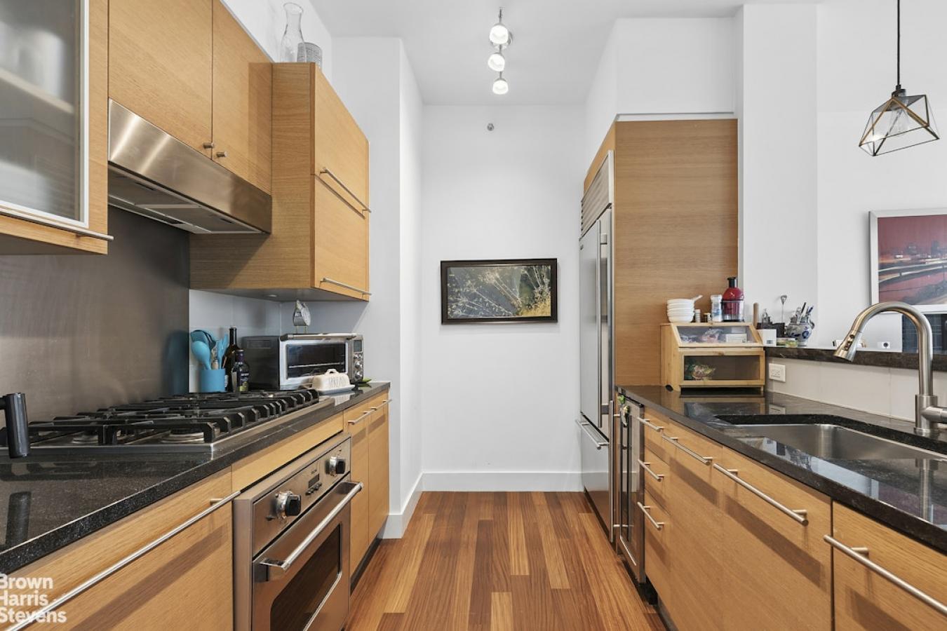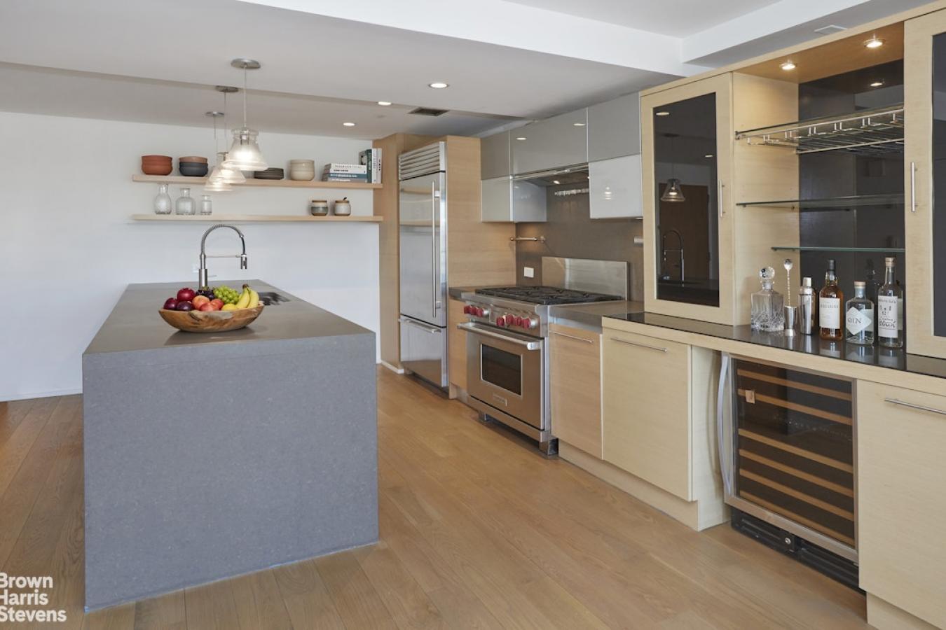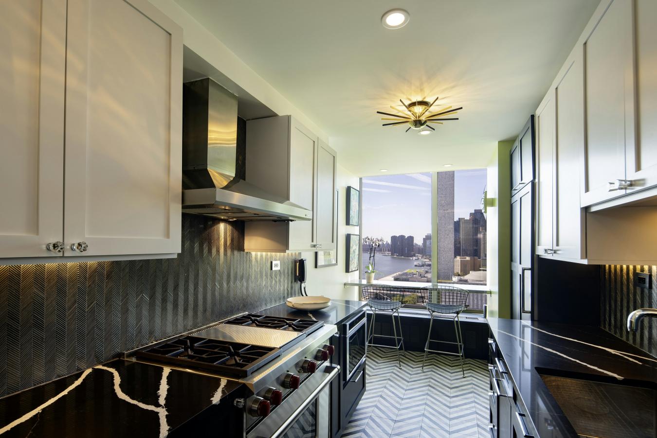 Wide open views ensure sun-filled days from every room in this chic South Harlem home. 9F is in excellent condition with a chefs kitchen, two inviting bedrooms, and a charming private terrace with views of the midtown skyline! THE KITCHEN: Both functional and luxurious, the spacious kitchen features a Sub-Zero refrigerator, Wolfe range, and Miele dishwasher.