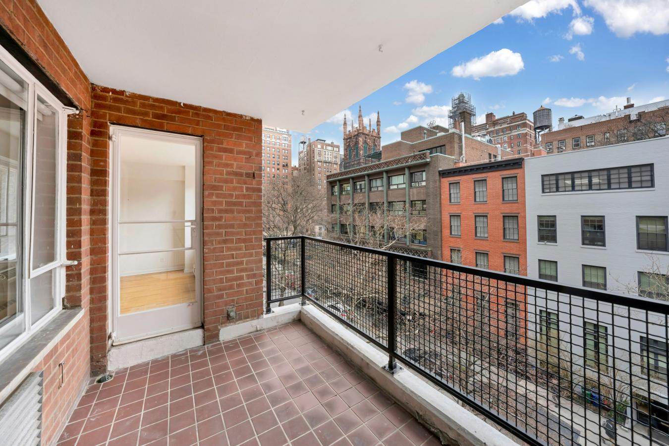 Large south-facing one-bedroom with private terrace. Apartment 5C in this coveted co-op in Greenwich Villages "Gold Coast" is a rarely available line offering an oversized living room with access to a private terrace overlooking the First Presbyterian Church spire. Entering the apartment is a generous foyer with two coat closets and a linen closet.