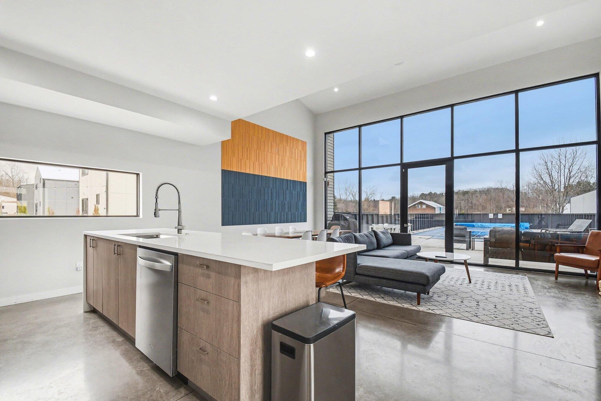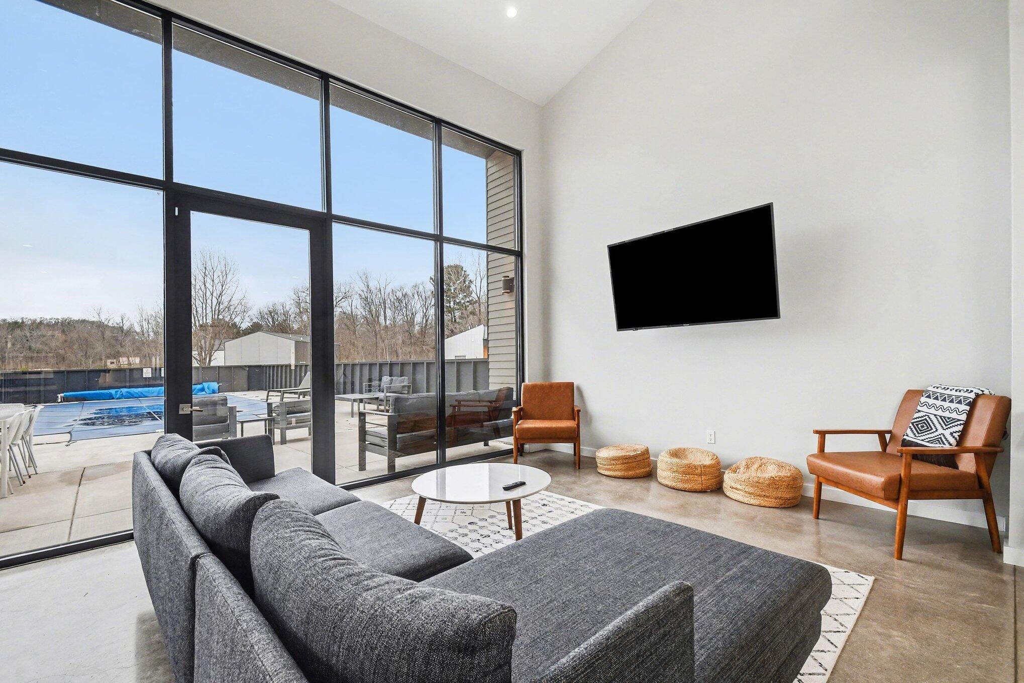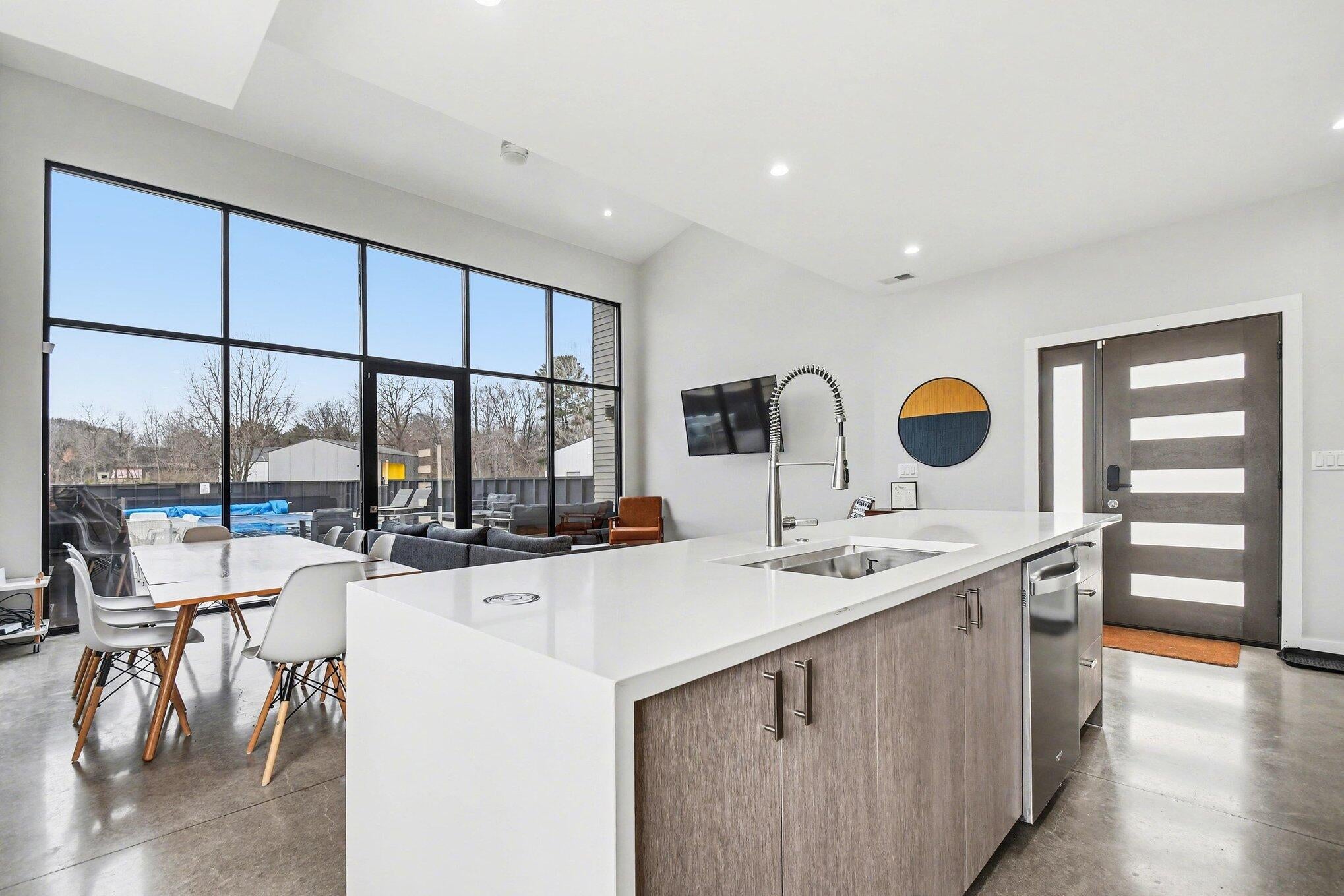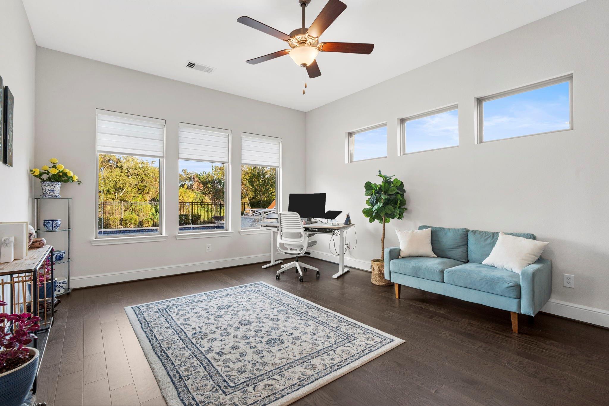Gorgeous home on a quiet dead-end street, offering peaceful surroundings just minutes from everything. Expansive windows fill the home with natural light, highlighting the spacious step-down living room with a wall of floor-to-ceiling windows overlooking the serene backyard.