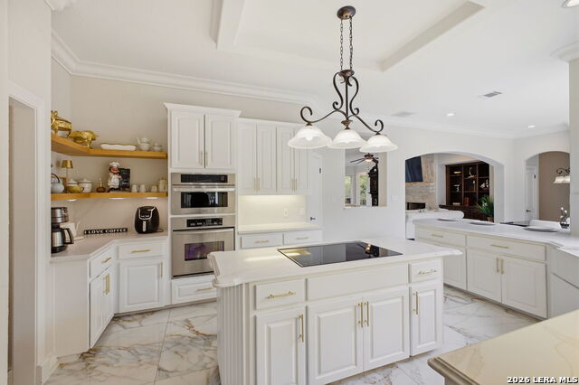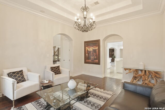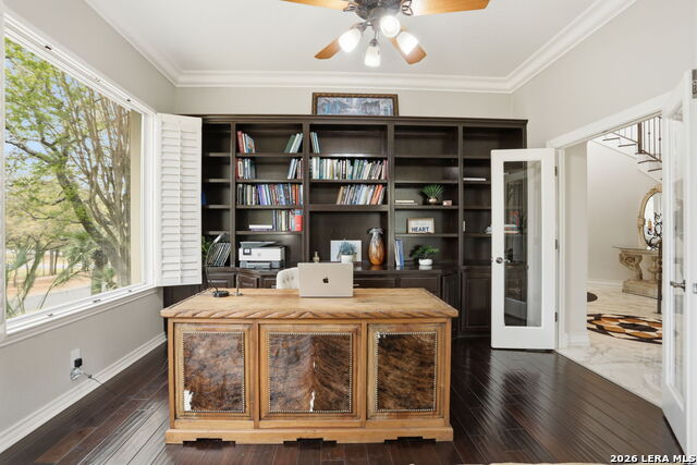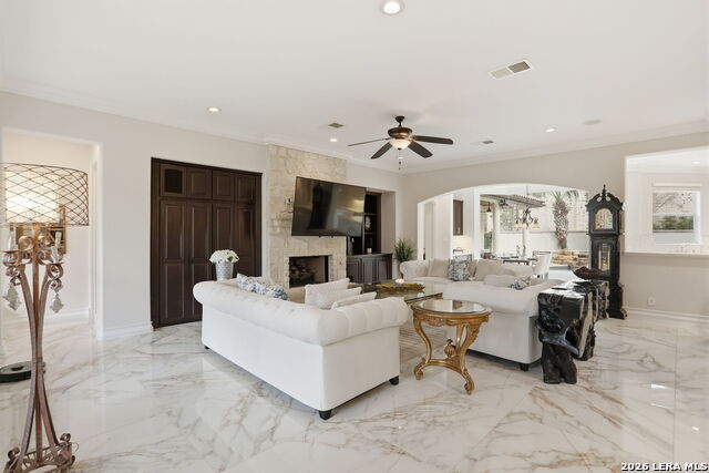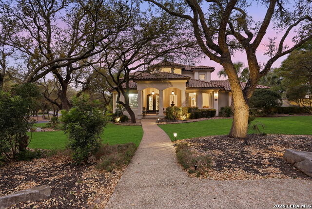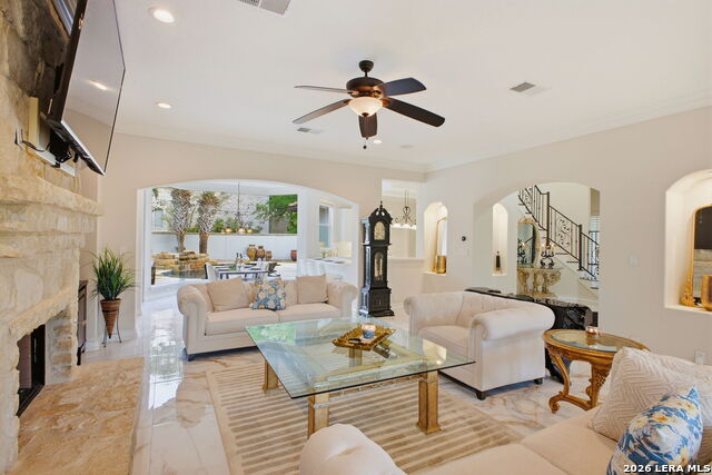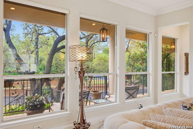 Welcome home to 1 Belcourt Place inside the Dominion! Enjoy over half an acre of mature trees and lush green space inside the highly sought after neighborhood. Host your friends at your pool equipped with the Outdoor projector and sound system entertainment package everyone will be talking about. Send your kiddos off to school with the bus route stopping right at your house. Walk out your front door and enjoy the holiday festivities on the greenbelt directly in front of your home. You even have your very own Golf Cart Garage! Seller has invested significantly in high-quality renovations throughout, including a fully updated chefs kitchen with quartz countertops, backsplash, farmhouse sink, premium faucet, new appliances, and induction cooktop with Sub-Zero refrigerator. Flooring and finishes have been upgraded across the home, creating a modern, move-in-ready luxury feel Home offers 4 bedrooms, 5 baths, Office, Three spacious living areas on the main level plus an additional upstairs living area, and a large formal dining room with direct access to the pool-perfect for large gatherings. The backyard is a private retreat with a stunning heated pool, spa, covered patio, and three palm trees-perfect for entertaining, Two balconies overlook a park, with walking access to scenic Dominion lakes and trails. Located in a highly desirable school zone. The spacious ground floor primary suite features a glamorous bathroom with dual vanities, dual closets, and a walk-through shower and soaking tub. Gorgeous hard wood flooring throughout the Master bedroom. The primary suite features a stunning wall of windows overlooking the serene park and mature trees, filling the space with natural light. Enjoy direct access to a spacious private balcony-perfect for morning coffee or unwinding in the evening surrounded by sunshine and the peaceful sounds of nature. The windows are enhanced with upgraded motorized shades, easily controlled at the touch of a button for added comfort and convenience. The breakfast area is highlighted by a dramatic wall of windows overlooking the private pool and palm trees, bringing in abundant natural light and a true indoor-outdoor living experience. This home is a rare find, ideally located directly across from a serene park, offering exceptional privacy with no homes immediately in front. The spacious main level features multiple living areas, creating an open and comfortable layout that feels both expansive and highly functional. A full bathroom with direct access from the pool area adds everyday convenience. The spacious main level features multiple living areas, creating an open and comfortable layout that feels both expansive and highly functional. This home is truly one of a kind!