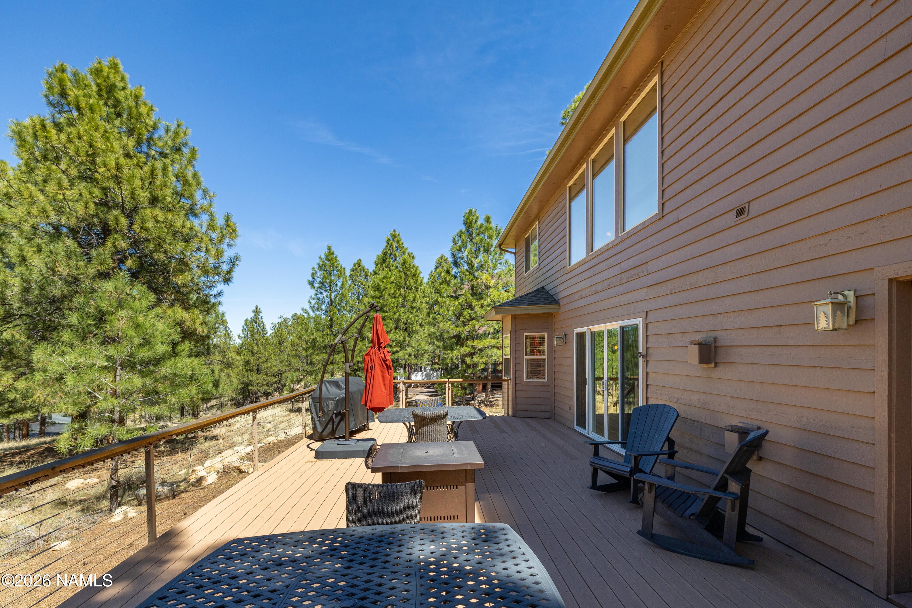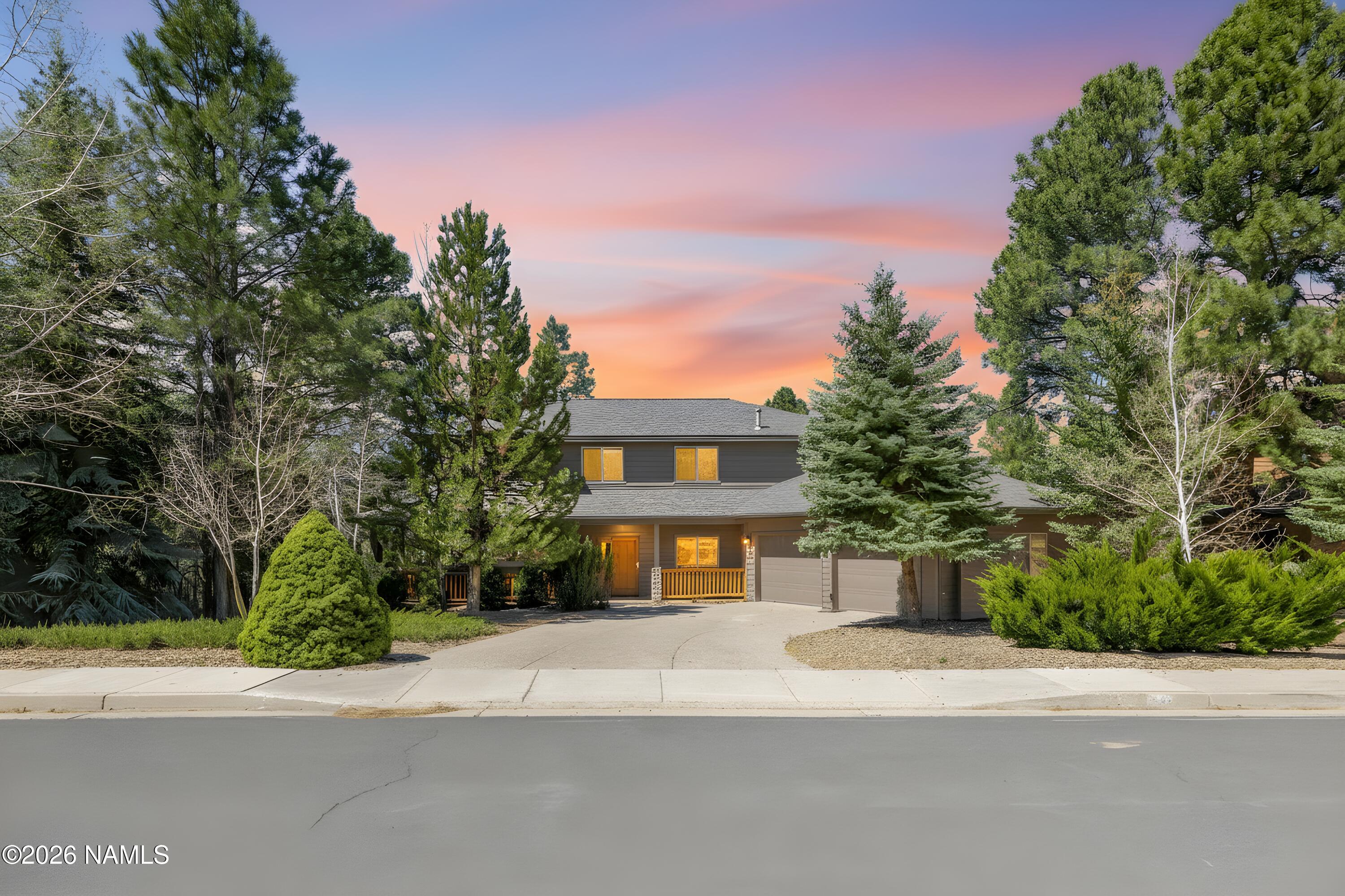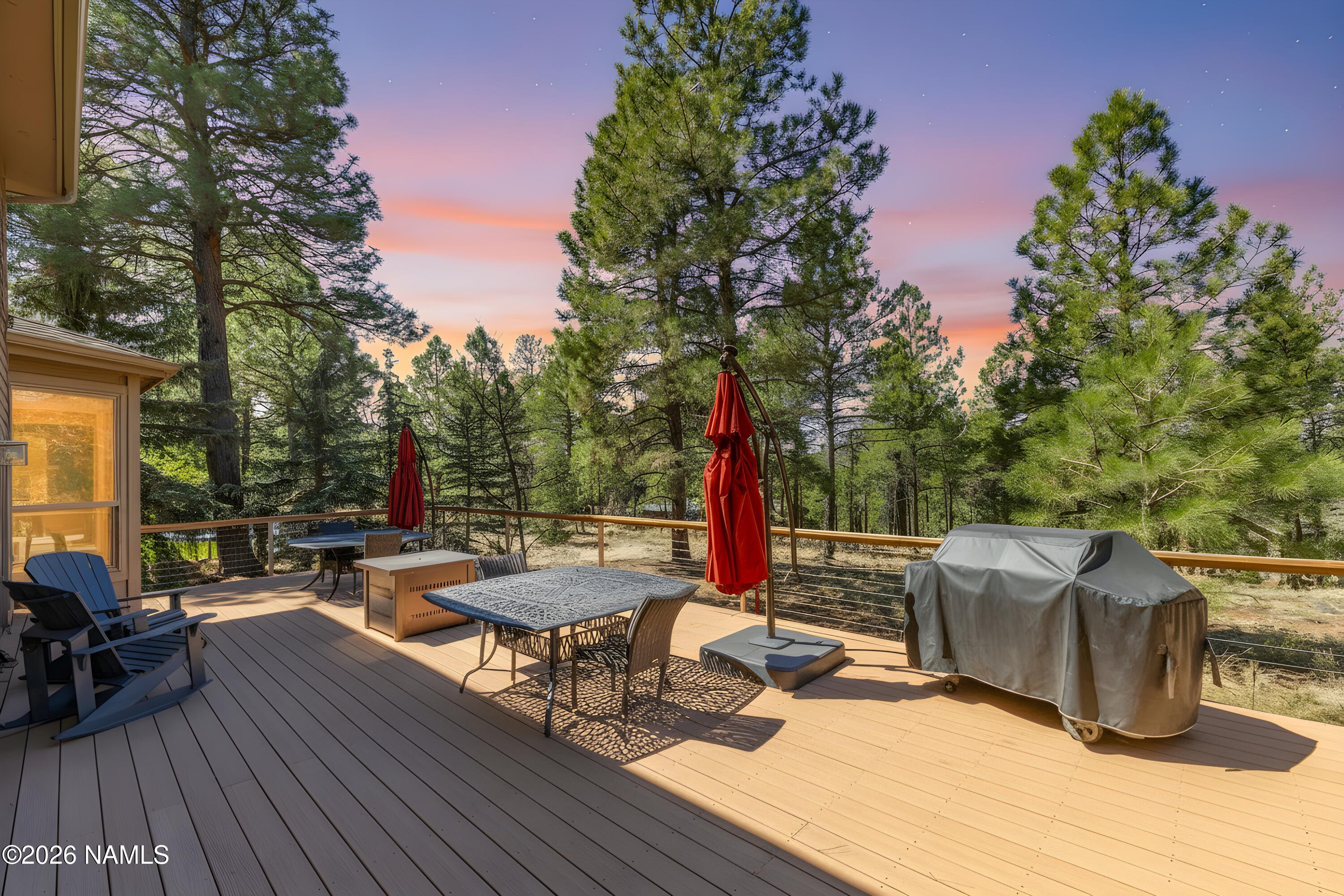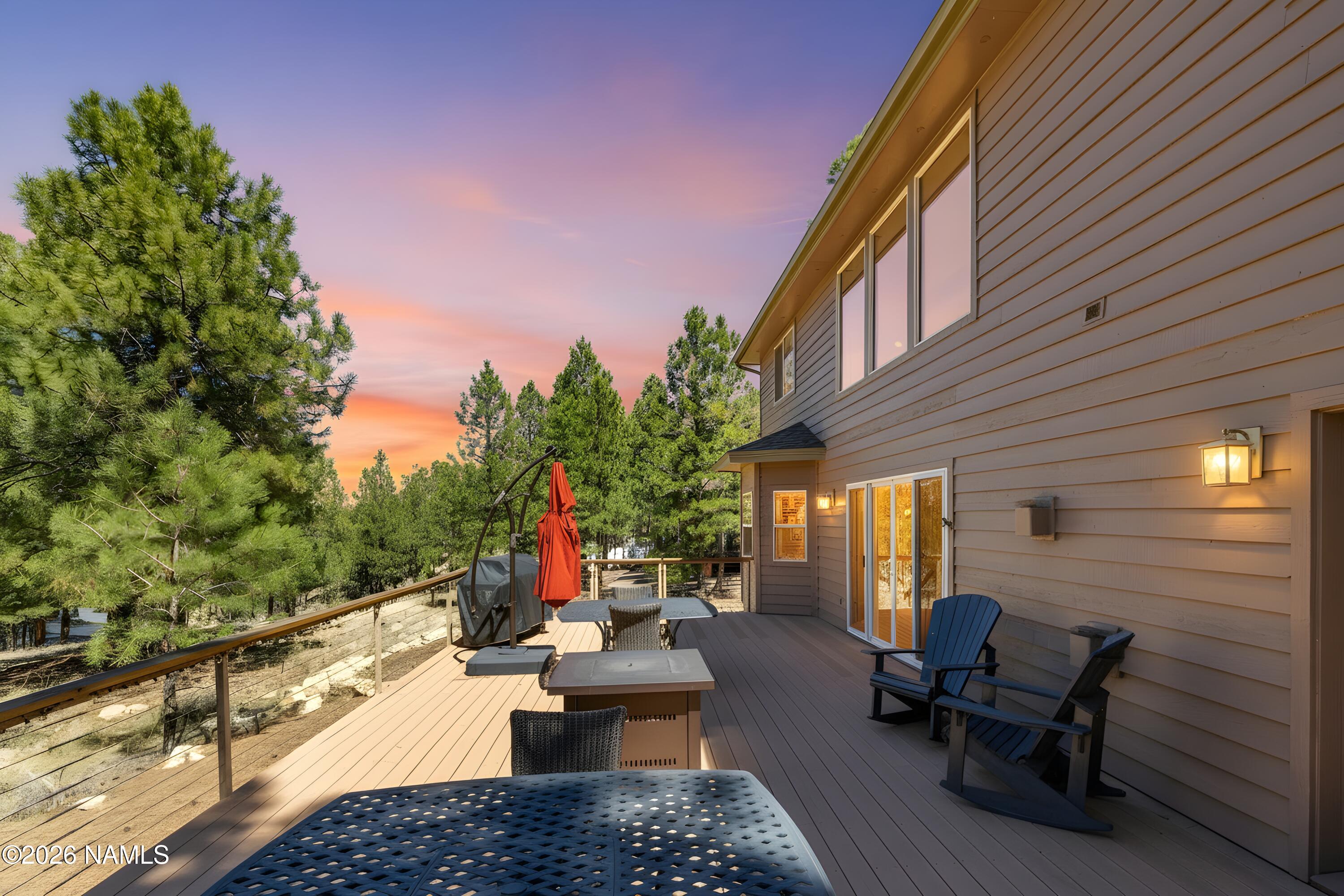 45 Lone Oak is the bright, beautifully updated mountain retreat backing forested green space that buyers wait for. With 5 bedrooms, 3.5 baths, central air, and an upstairs loft that works perfectly as a second living area, this is a rare find and a uniquely beautiful Flagstaff getaway. The open floor plan is filled with natural light, and the main-level primary suite is a standout, complete with a newly remodeled bath and steam shower. In the great room, soaring 18-foot ceilings and a dramatic wall of windows bring in the deep blue sky and peaceful views of the pines. The spacious kitchen has been fully remodeled. A dining room off of the great room makes this floor plan perfect, while a stone fireplace and log accents throughout add just the right amount of mountain charm. Step outside outsie and you may never want to leave the back deck. With open space home to deer and elk, views of Mt. Elden, and bordered by Ponderosa Pines, it is a tranquil and private mountain setting to relax, entertain, play, and enjoy Flagstaffs natural beauty.Short-term rentals are permitted.Recent improvements include a full kitchen remodel, primary bath remodel with steam shower, upstairs bath remodel, new roof, and garage remodel.The inspection has been completed, repairs have been made or scheduled, and the home is in excellent condition. Move right in and enjoy one of Amberwoods rarest and most beautiful settings.