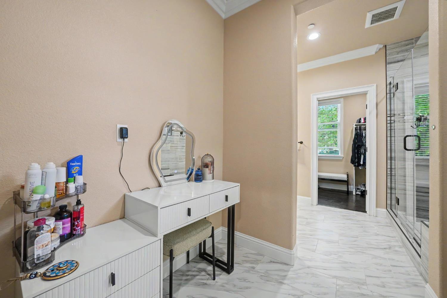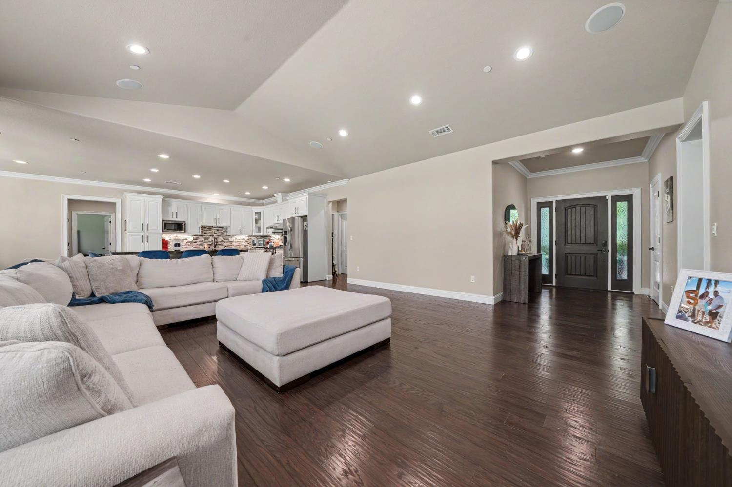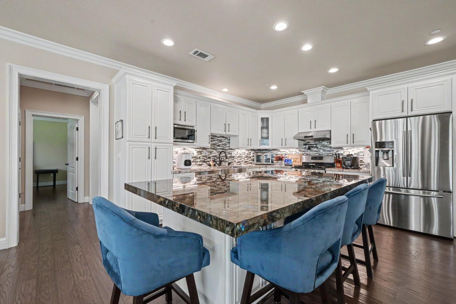 Located in the highly desirable LaContenta Golf Course community, this stunning 4-bedroom, 3-bath home offers 2,958 sq. ft. of beautifully designed living space on an expansive, nearly half-acre lot. Built in 2019 and meticulously maintained, this home shows like new with quality finishes and thoughtful design throughout. Step inside to an open and spacious floor plan featuring beautiful hardwood flooring, custom cabinetry, upgraded countertops, coffered ceilings, and crown molding. The layout is ideal for both everyday living and entertaining, with a private primary suite situated on one side of the home, a junior master suite on the opposite side, and two additional guest bedrooms centrally located for optimal functionality. The oversized primary suite offers a luxurious retreat with a large walk-in closet and a spacious, well-appointed bathroom. Exterior features include exceptional curb appeal with low-maintenance landscaping, ample parking for guests, and potential RV parking. The fully fenced, usable backyard is a blank canvas ready for your dream outdoor oasis with room for a pool, outdoor kitchen, and more all while enjoying scenic golf course views. Perfectly located for golf enthusiasts and those who love to entertain, this immaculate home combines comfort, style, and location in one exceptional package. Offering endless opportunities for recreation and relaxation ready for you to move right in and living the lifestyle youve been dreaming of.