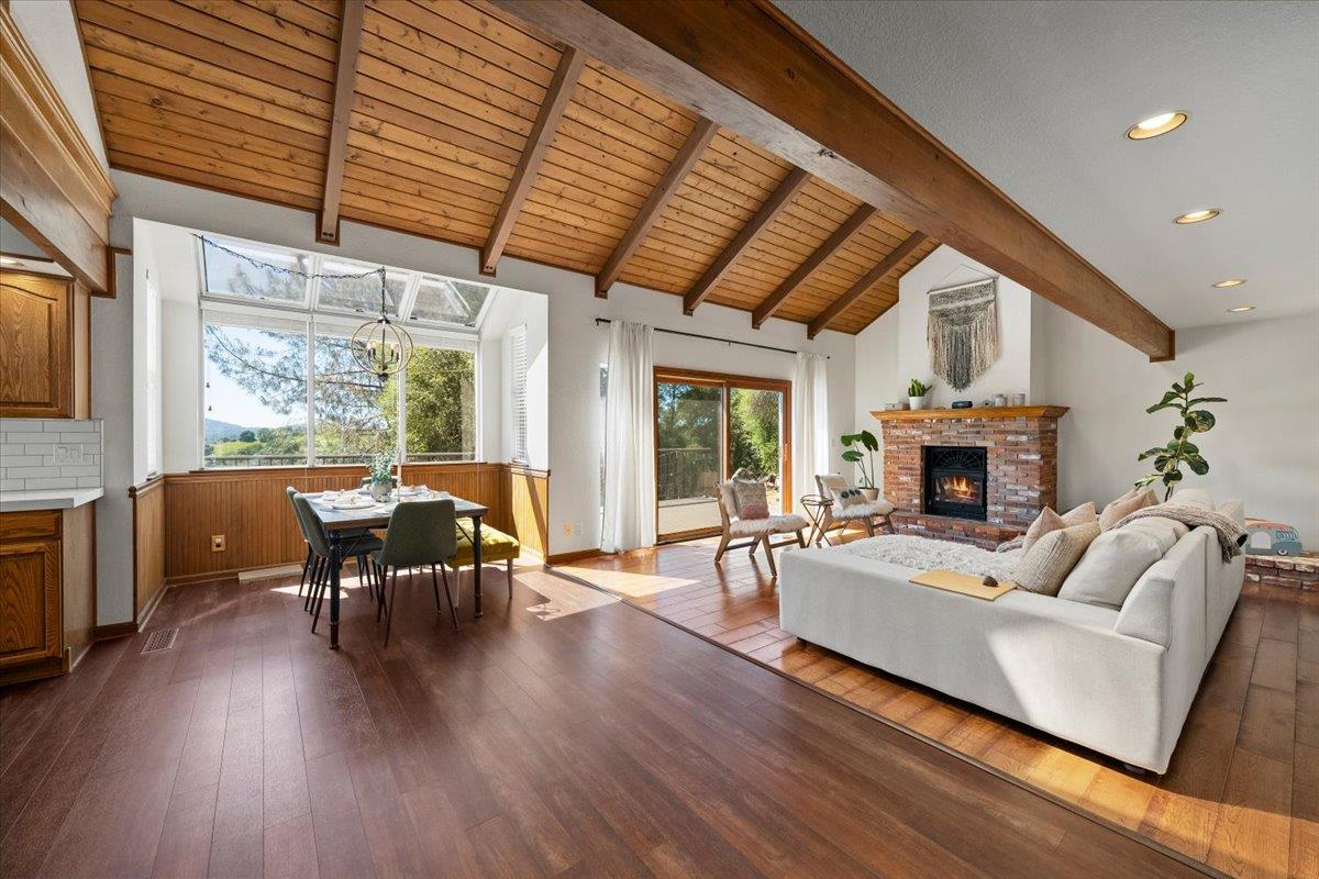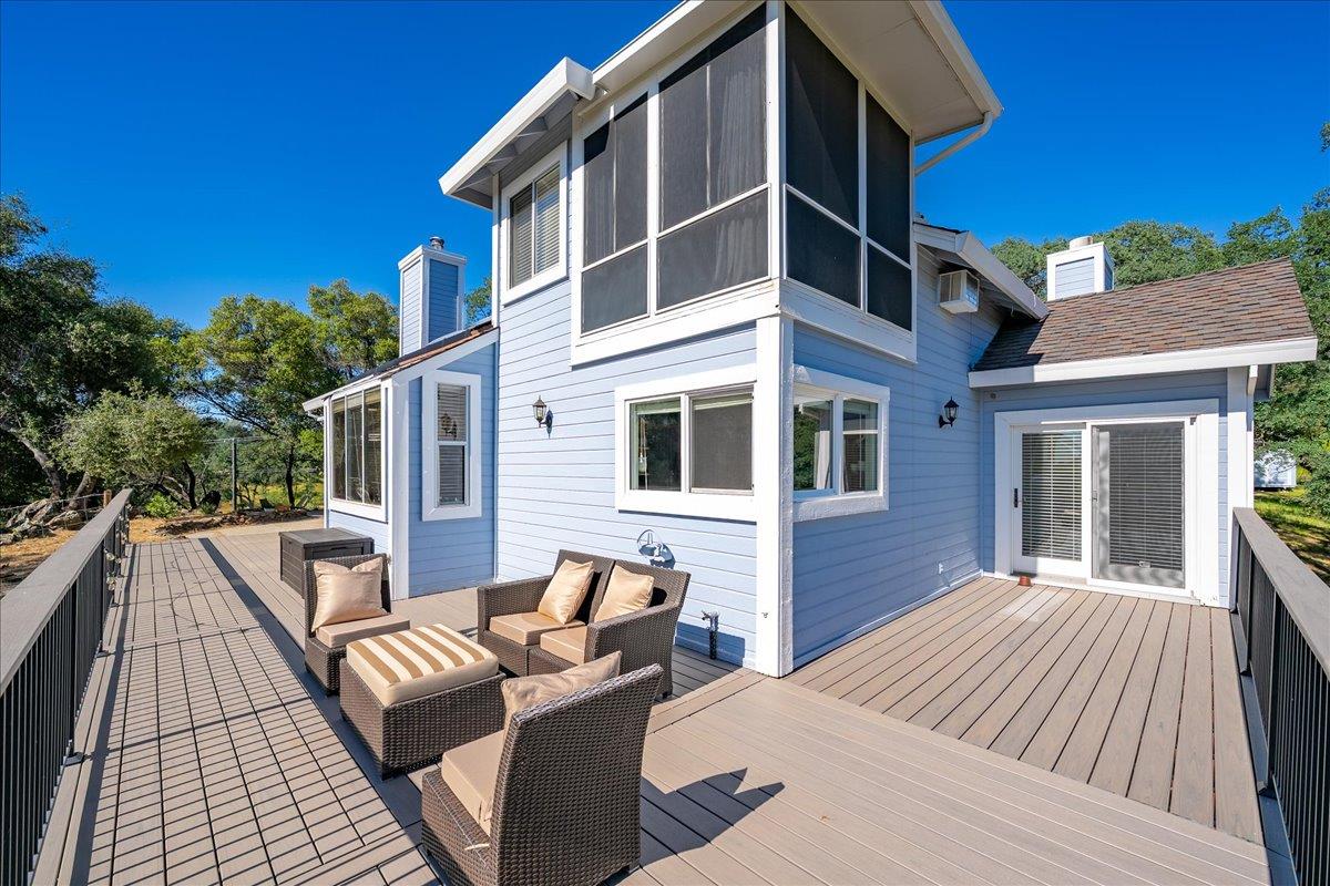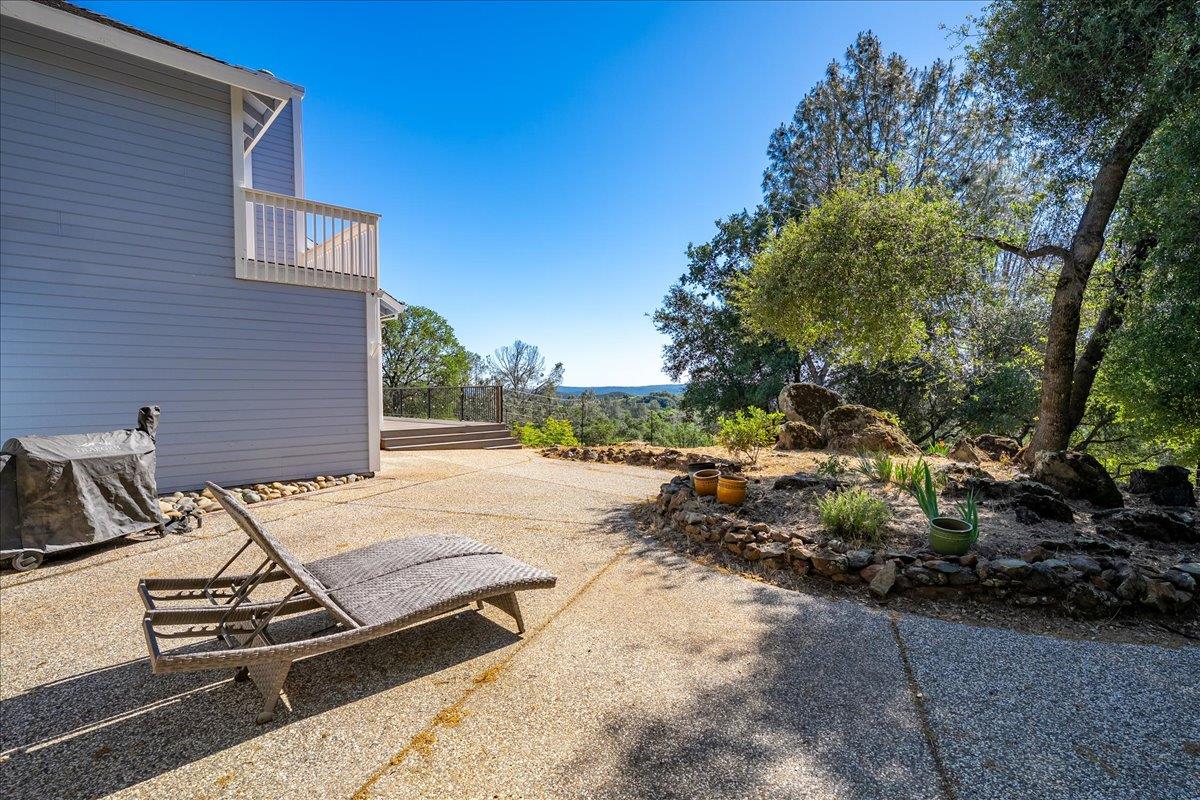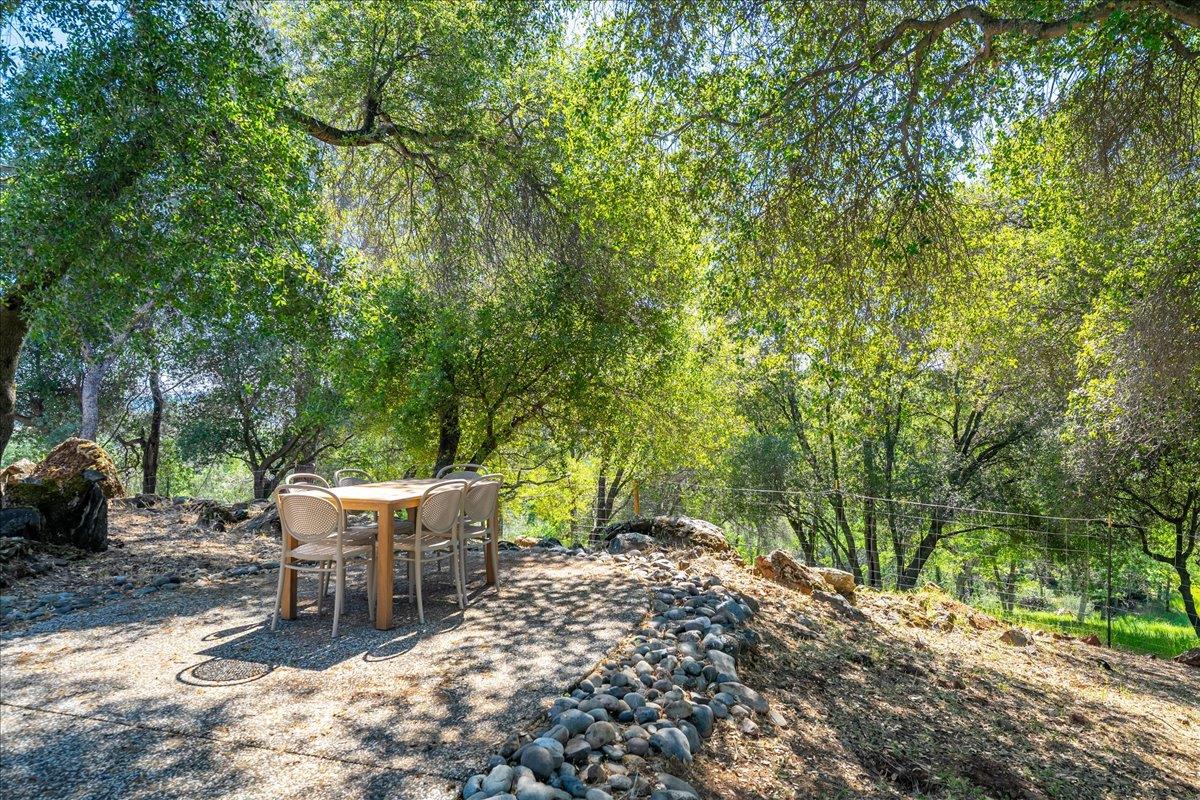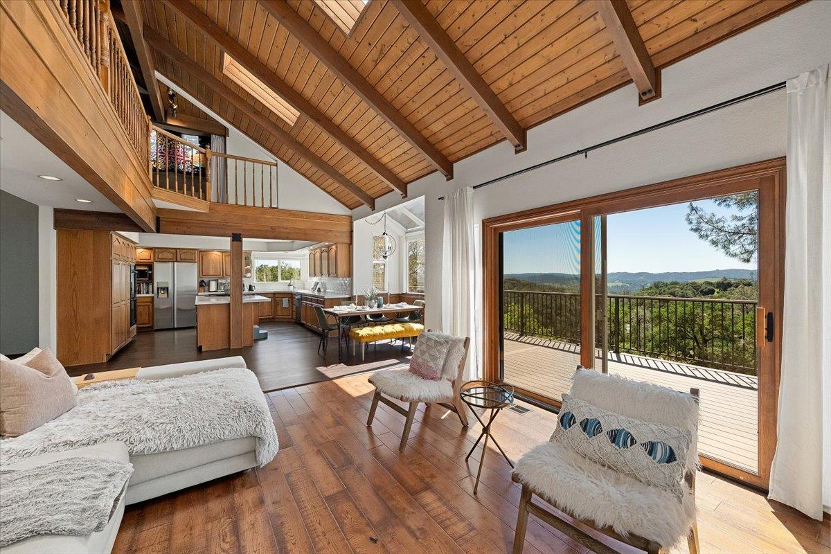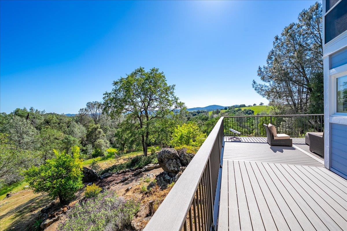 Tucked among the rolling hills of the Sierra foothills, this inviting home offers the perfect blend of comfort, privacy, and natural beauty. Set on a peaceful, tree-studded 5 acre parcel surrounded by mature oaks and scenic views, it provides a tranquil retreat just minutes from town. Inside, the home is bright and welcoming, with wooden vaulted ceilings that add warmth, character, and a sense of openness throughout the main living areas. At the heart of the home is a spacious, open kitchen featuring ample cabinetry and workspace, ideal for both everyday living and entertaining. The kitchen flows seamlessly into a cozy breakfast nook for casual dining, while a separate formal dining room offers an elegant space for hosting gatherings and special occasions. Designed with flexibility in mind, the thoughtful floor plan includes both a comfortable family room and a formal living room, creating distinct spaces for relaxation and entertaining. The main-level primary suite serves as a private retreat, complete with a woodstove and an en-suite bath featuring dual sinks and a jetted tub. Upstairs, three well-sized bedrooms provide comfortable accommodations, along with an updated bathroom that adds modern style and convenience. This layout offers a natural separation between living and sleeping areas, enhancing both privacy and functionality. A generous deck extends the living space outdoors, offering the perfect setting for relaxing, entertaining, or simply taking in the serene surroundings. Whether youre seeking a full-time residence or a peaceful foothill escape, this home delivers comfort, charm, and a true connection to nature.
