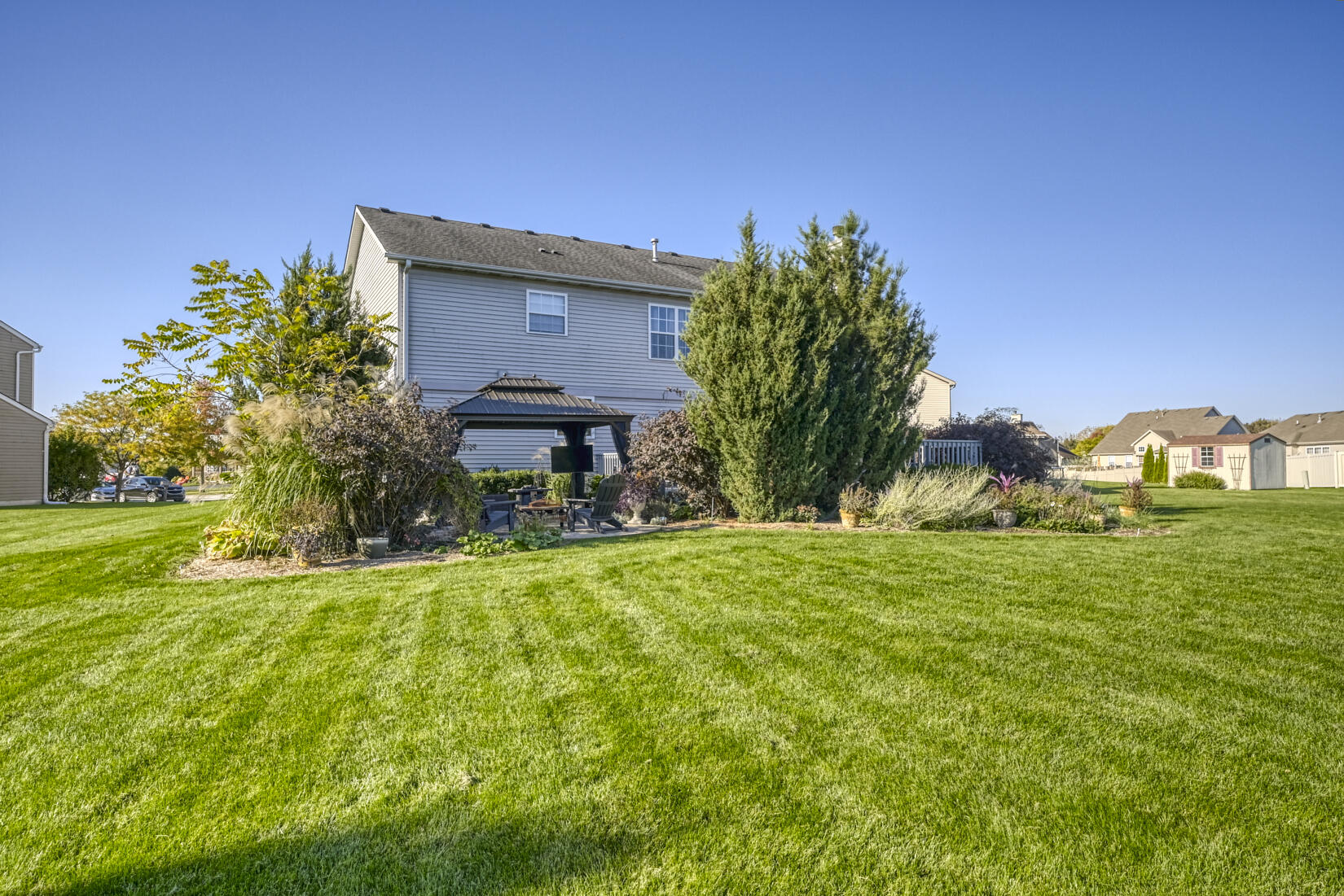 Welcome home to this stunning 5 bdrm, 3,274 sq ft two-story gem tucked away on a quiet cul-de-sac! From the moment you step onto the covered front porch and into the inviting foyer w/rich hardwood flooring, you'll feel the warmth and elegance this home has to offer. The main level is thoughtfully designed for both everyday living and entertaining. A formal dining room w/a convenient storage closet flows seamlessly from the foyer, while a stylish powder room adds functionality. The show-stopping flex room features wood flooring, exposed wood beams, and classic French doors--perfect as a home office, library or playroom. The spacious family room has a charming brick fireplace and opens into a massive eat-in kitchen that truly is the heart of the home. You'll love the walk-in pantry, granite counters, custom butcher block island w/butler's sink, SS appliances, and double ovens--ideal for hosting gatherings of any size. Off the attached garage, a mudroom w/additional storage and utility sink keeps everything organized, plus a separate laundry room for added convenience. Upstairs, retreat to the luxurious primary suite featuring a private en-suite bath with a jacuzzi tub, separate shower, and an expansive walk-in closet. Three additional bdrms share a full bath, while an oversized loft area w/ a closet provides the perfect space for gaming, studying, or relaxing. The full basement offers even more potential, already partially finished with a 5th bedroom complete w/closet organizers--ready for guests or extended living. Major updates provide peace of mind, including a newer furnace and A/C (2019), hot water heater (2020), owned water softener, and reverse osmosis system. The home is also prepped for an electronic dog fence. Step outside to your own private oasis featuring multiple areas for entertaining, lush landscaping and a beautiful gazebo! Located in St. John township w/the highly sought after Lake Central School system, this home has it all - space, style and comfort!