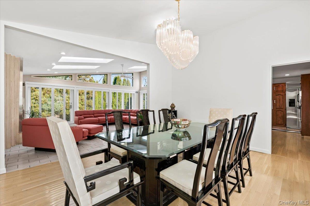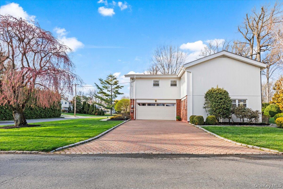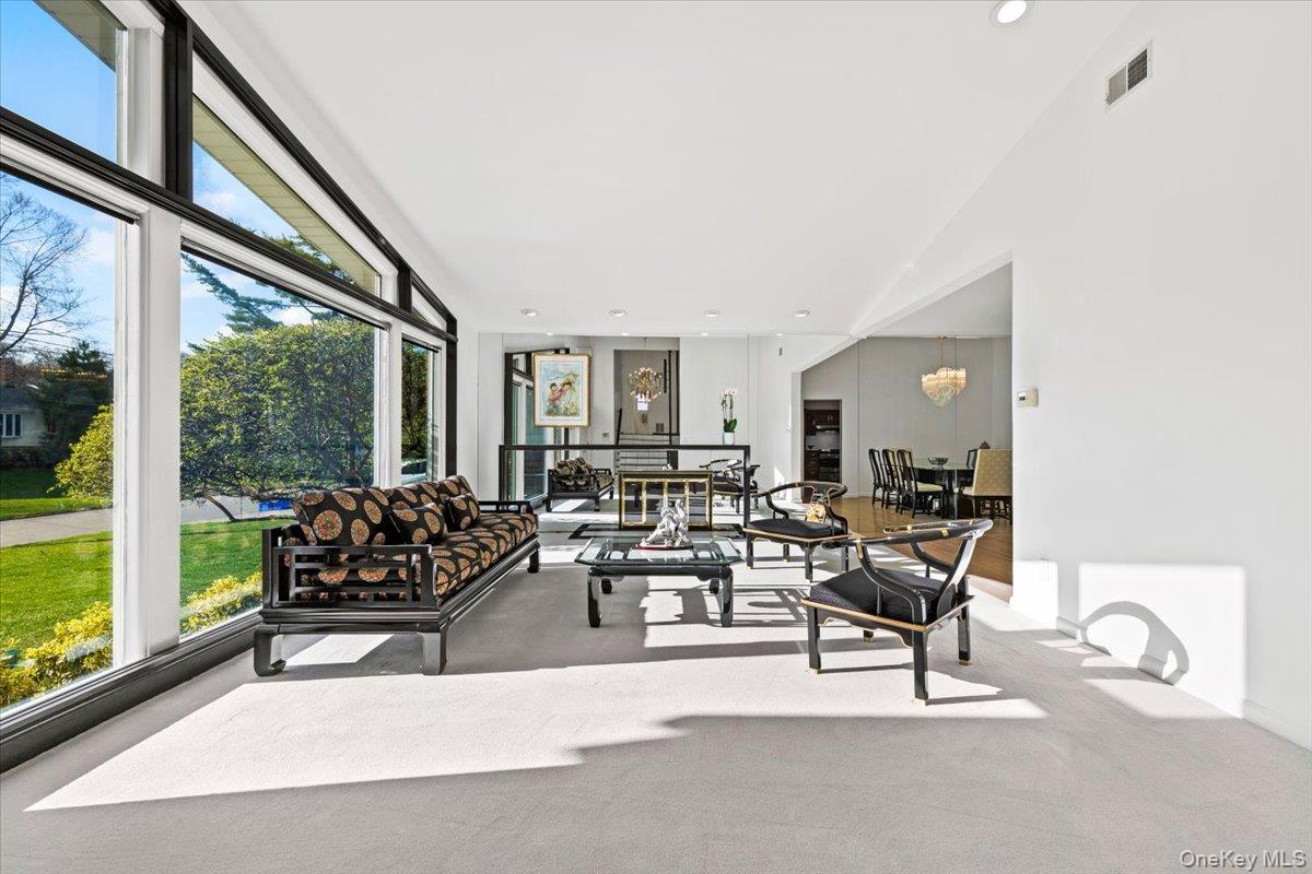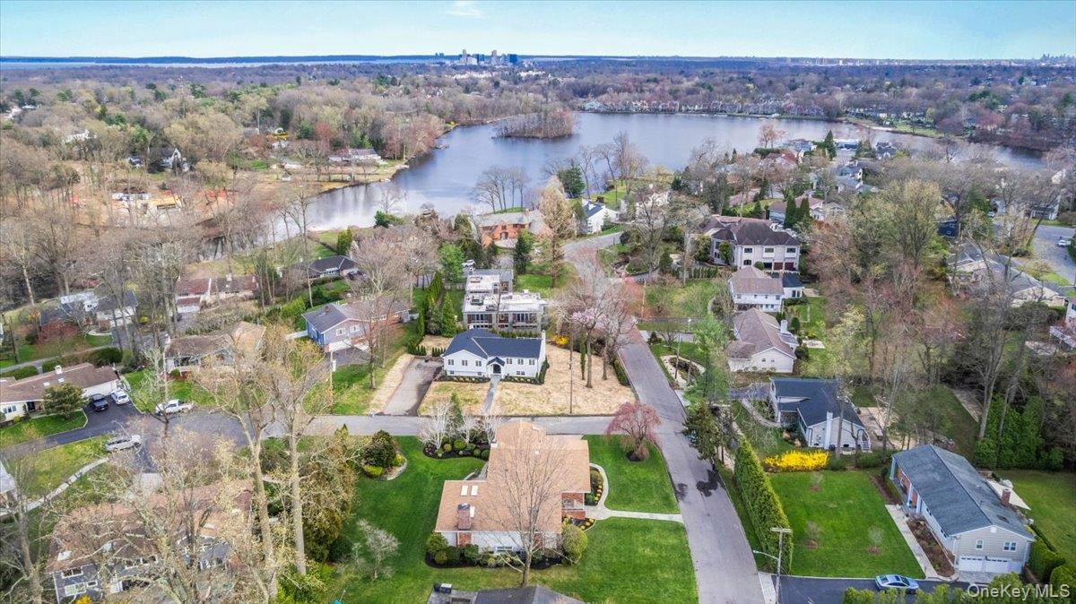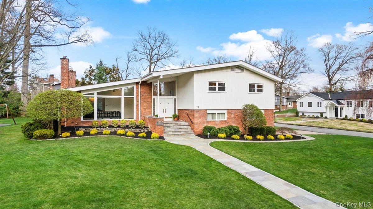 Welcome to 16 Dell Drive, an elegant Mid-Century Modern split-level residence perfectly positioned on a coveted corner lot in Lake Isle Estates. This impeccably maintained home offers five expansive bedrooms and three full baths, blending architectural sophistication with refined comfort. The grand entry sets the tone with soaring ceilings, a custom designer chandelier, and sweeping sightlines that showcase the homes exceptional scale. The main level features an airy living room anchored by a sleek fireplace, a formal dining room illuminated by a handcrafted Italian Murano crystal chandelier, and an impressive family room with a second fireplace, vaulted ceilings, skylights, and custom plantation shutters framing serene views of the park-like grounds. The oversized eat-in kitchen is ideal for both daily living and entertaining, complete with generous prep space and a built-in wine refrigerator. The upper level hosts a luxurious primary suite with dual walk-in closets, a spacious spa-inspired bath, and tranquil vistas of the property. Three additional bedroomseach generously proportionedshare a beautifully appointed hall bath. The lower level offers exceptional versatility, featuring a large family room with a wood-burning stove, an additional bedroom with a walk-in closet, a full bath, and direct access to the two-car garagean ideal setup for guests, extended family, or private living quarters. Additional premium features include a new roof, all-new LED lighting, a new secondary HVAC system, and a partial basement with laundry and ample storage. Residents of Lake Isle Estates enjoy exclusive access to The Shore Club, offering a private pool, kayaking, and non-motorized water sports. Membership eligibility at the renowned Lake Isle Country Club provides further luxury amenities, including golf, tennis, and resort-style swimming. Located within the highly regarded Eastchester Union Free School Districtwith bus service to all grade levelsand convenient to transportation, shopping, and more, this home presents a rare opportunity in a premier setting.