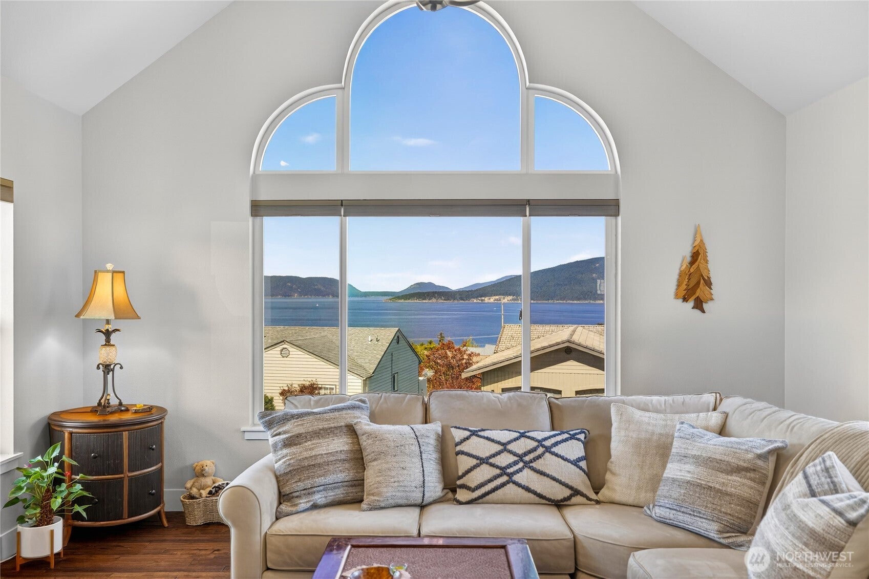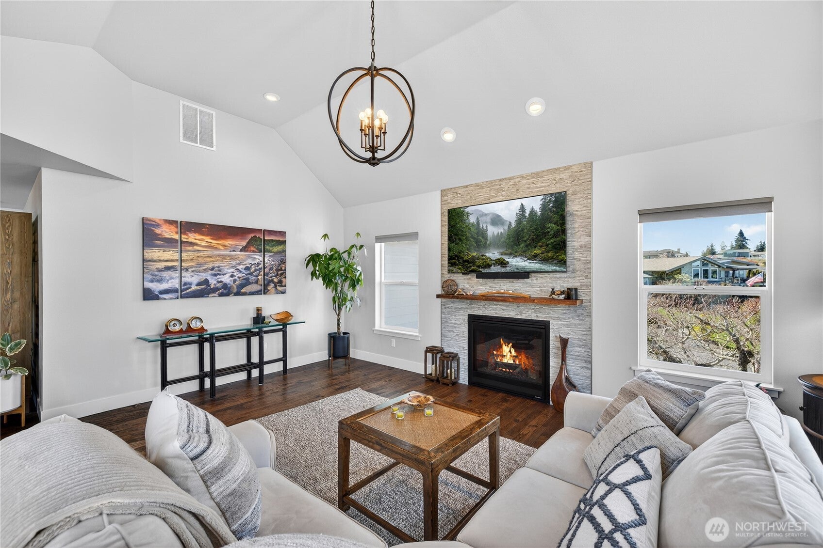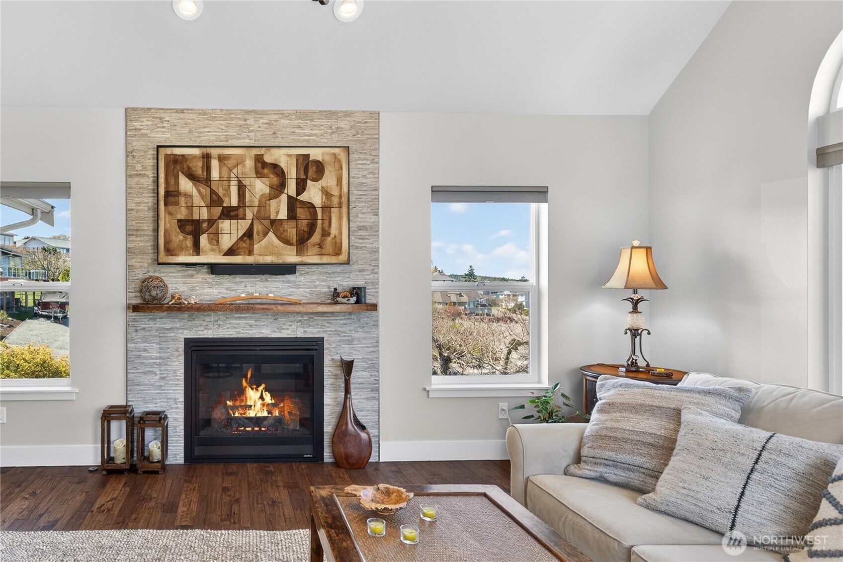 Perched on a beautifully landscaped corner lot, this light-filled home captures sweeping water, island, and mountain views that define the Pacific Northwest lifestyle. Step inside to an inviting open-concept layout where rich hardwood floors, vaulted ceilings, and a stunning stone fireplace create a warm, elevated living space designed for both everyday comfort and effortless entertaining.
