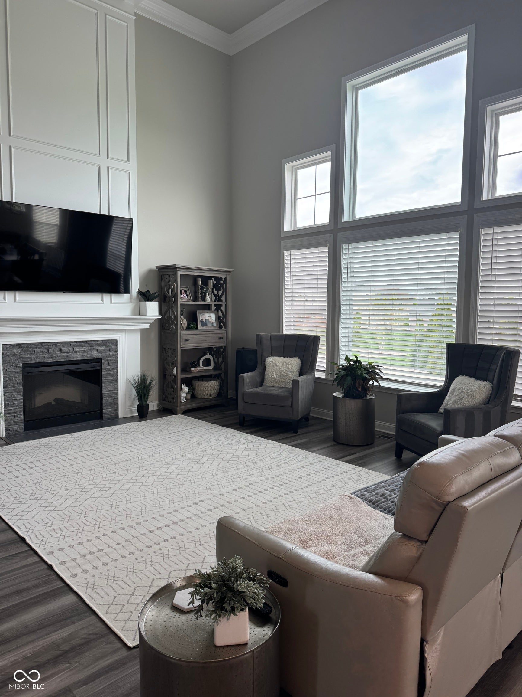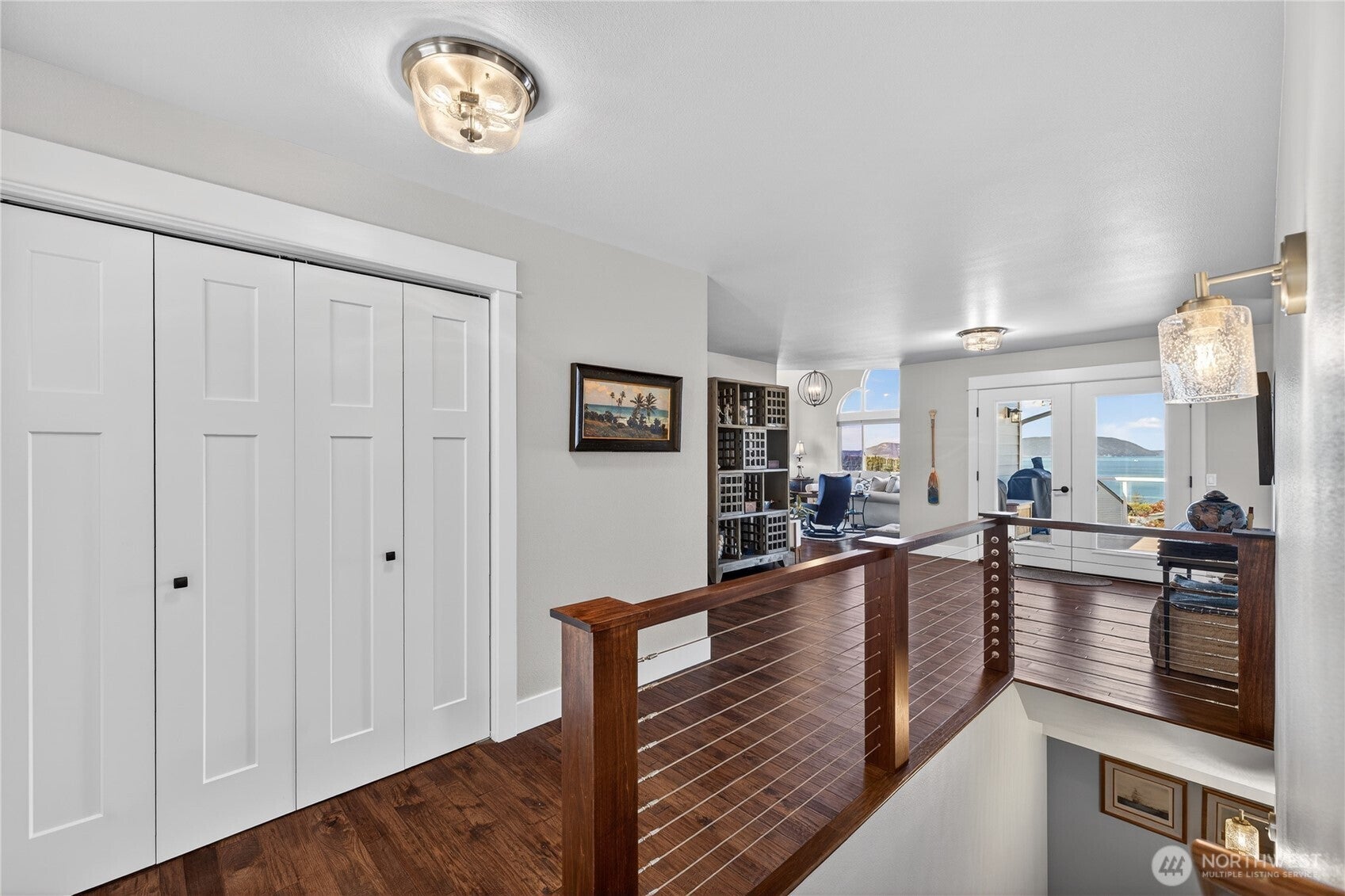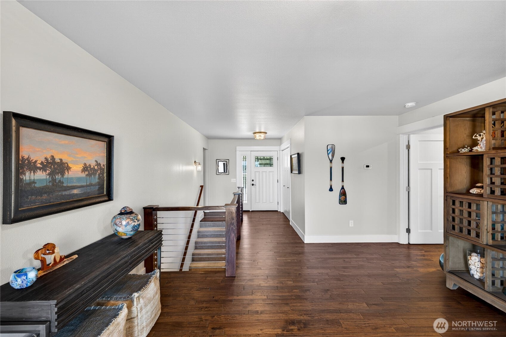 Perched on a beautifully landscaped corner lot, this light-filled home captures sweeping water, island, and mountain views that define the Pacific Northwest lifestyle. Step inside to an inviting open-concept layout where rich hardwood floors, vaulted ceilings, and a stunning stone fireplace create a warm, elevated living space designed for both everyday comfort and effortless entertaining.