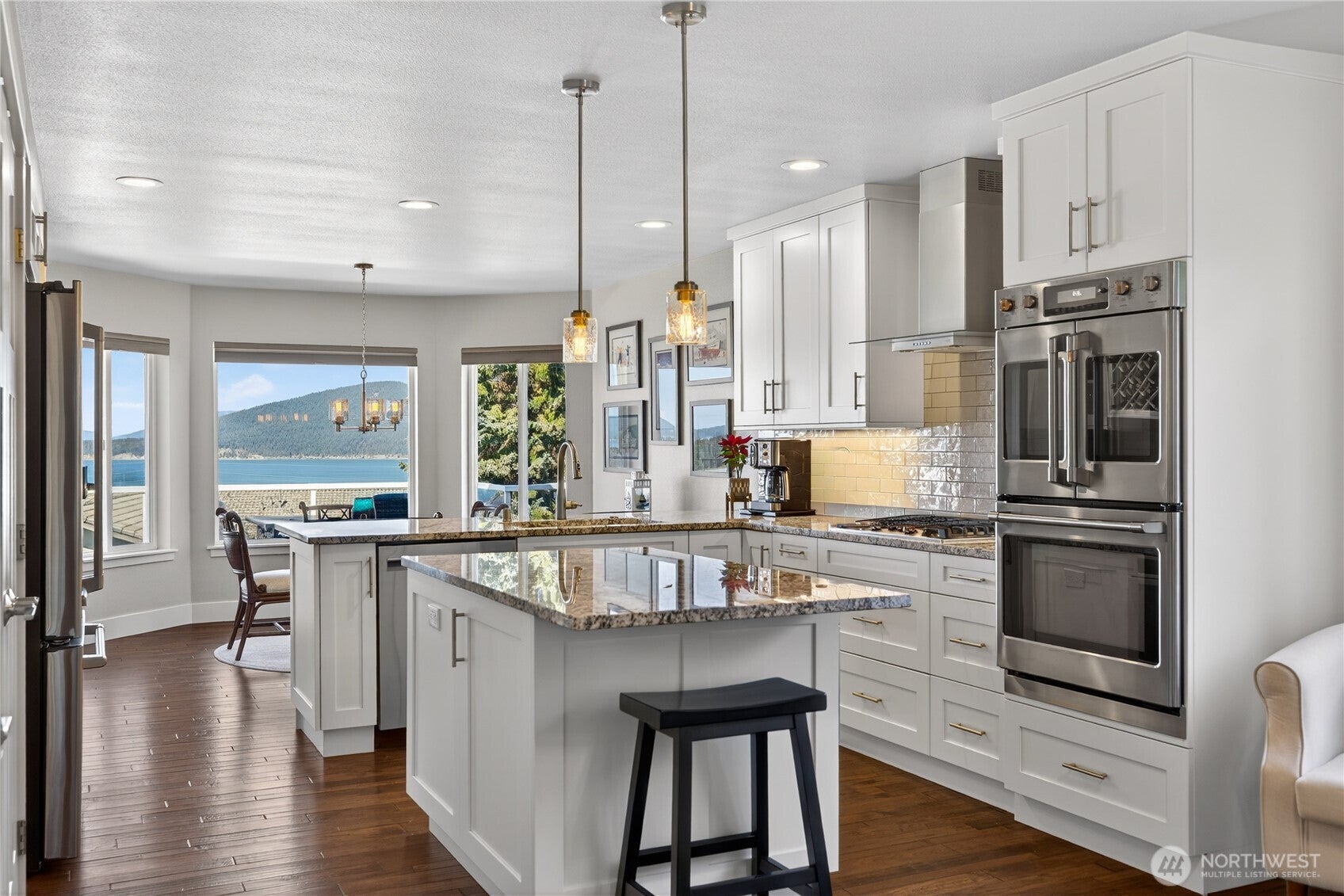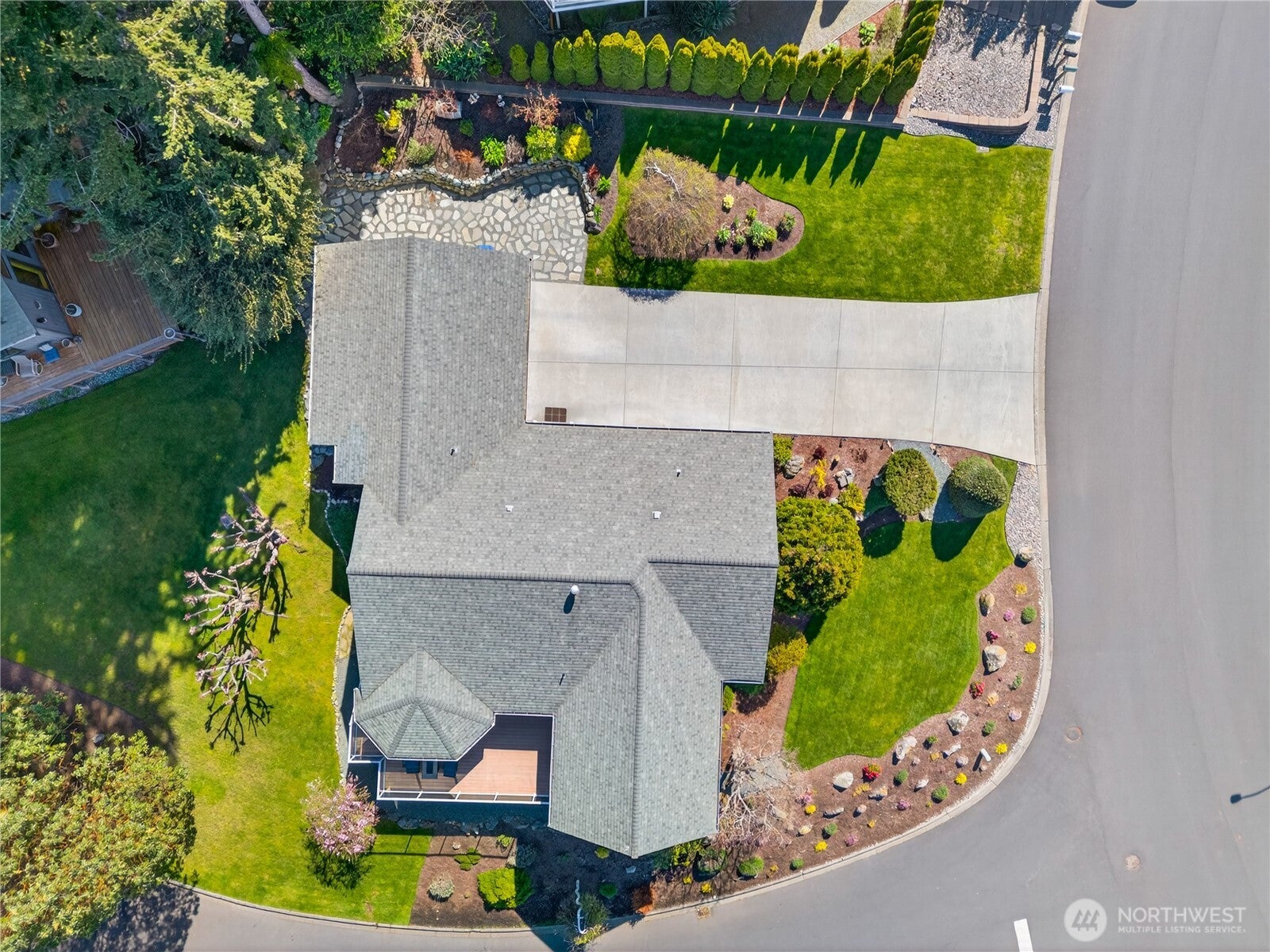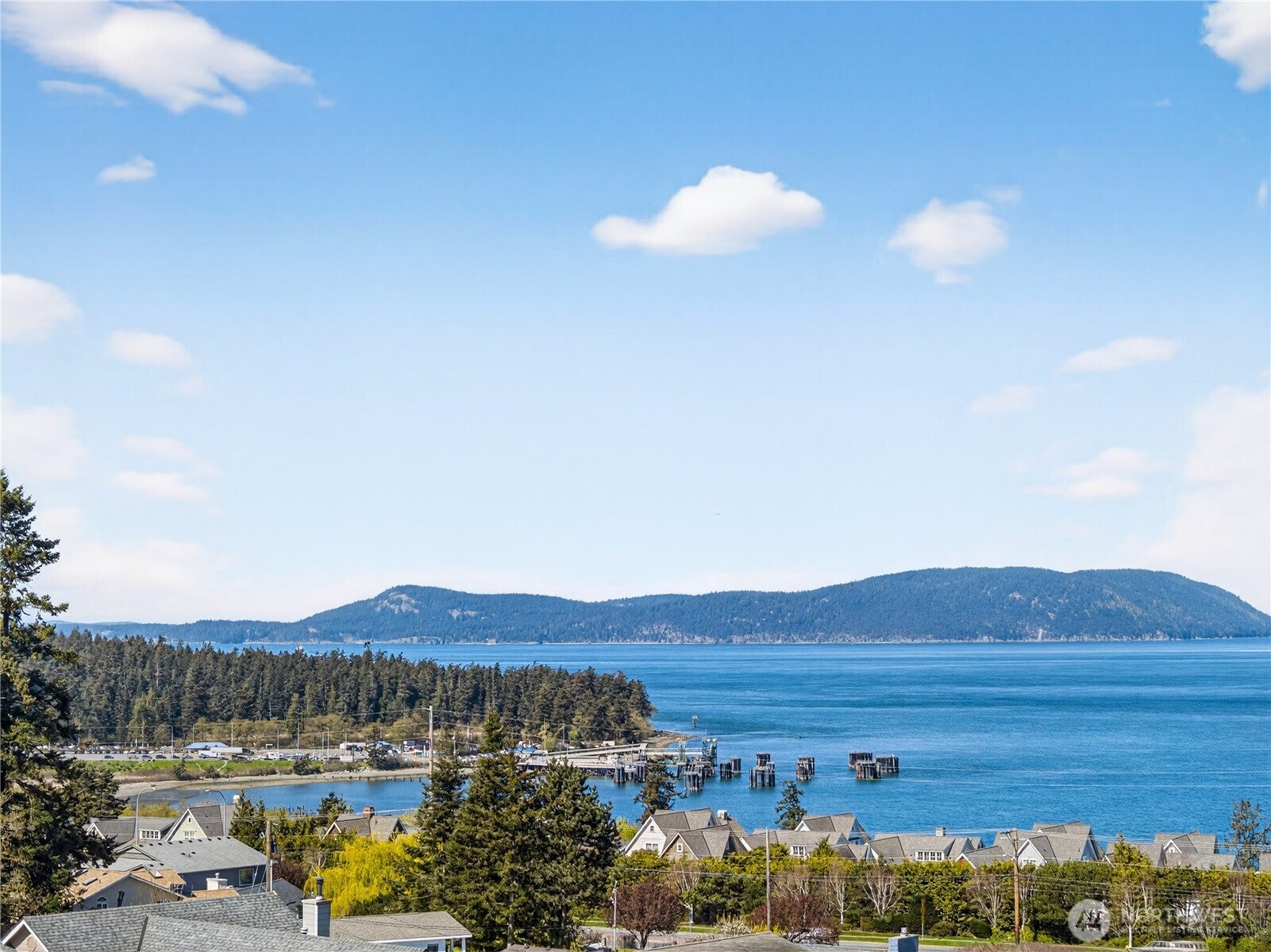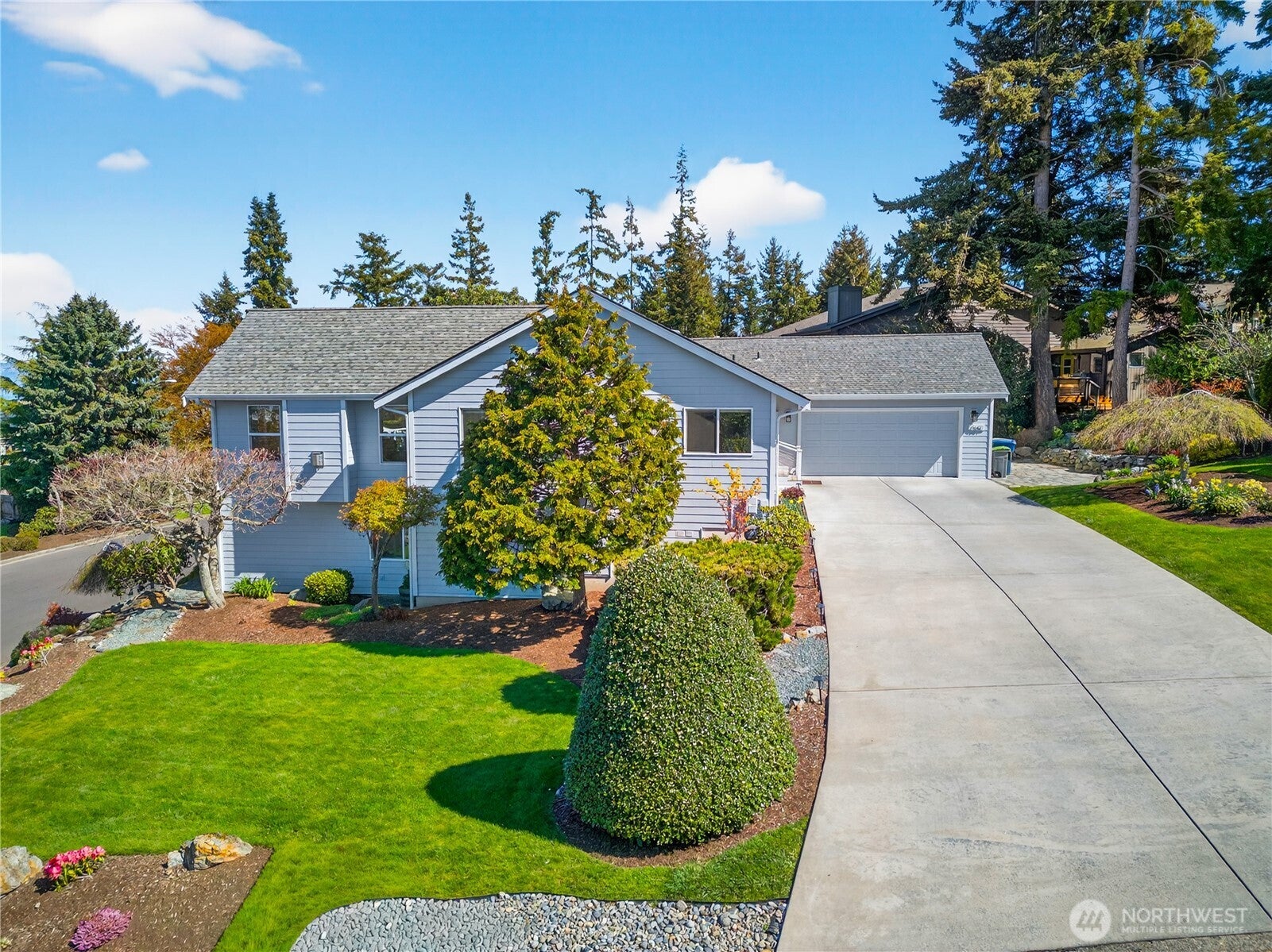 Perched on a beautifully landscaped corner lot, this light-filled home captures sweeping water, island, and mountain views that define the Pacific Northwest lifestyle. Step inside to an inviting open-concept layout where rich hardwood floors, vaulted ceilings, and a stunning stone fireplace create a warm, elevated living space designed for both everyday comfort and effortless entertaining. The chef-inspired kitchen features expansive granite countertops, crisp white cabinetry, stainless steel appliances, and a generous island that flows seamlessly into the dining and living areas. Large windows frame breathtaking views, bringing natural beauty indoors. Unwind in the spa-like primary suite with a luxurious walk-in tile shower and serene soaking tub, thoughtfully designed for relaxation. Outdoor living shines with an expansive view deckperfect for morning coffee or sunset gatheringsoverlooking the water and surrounding neighborhood. The meticulously maintained grounds offer striking curb appeal with curated landscaping, stone pathways, and vibrant plantings. A spacious garage and additional parking provide flexibility, while nearby community amenities, including sports courts, enhance an active lifestyle. This is more than a homeits a front-row seat to the lifestyle youve been waiting for.