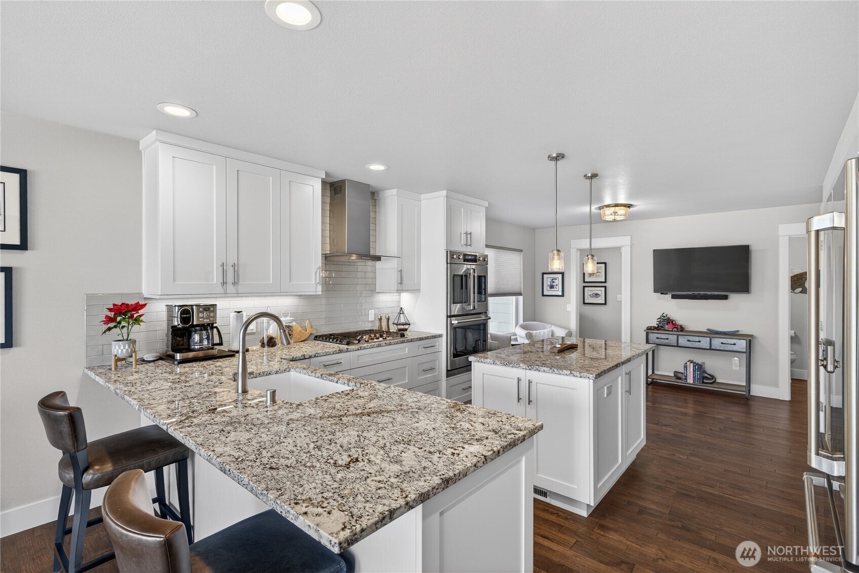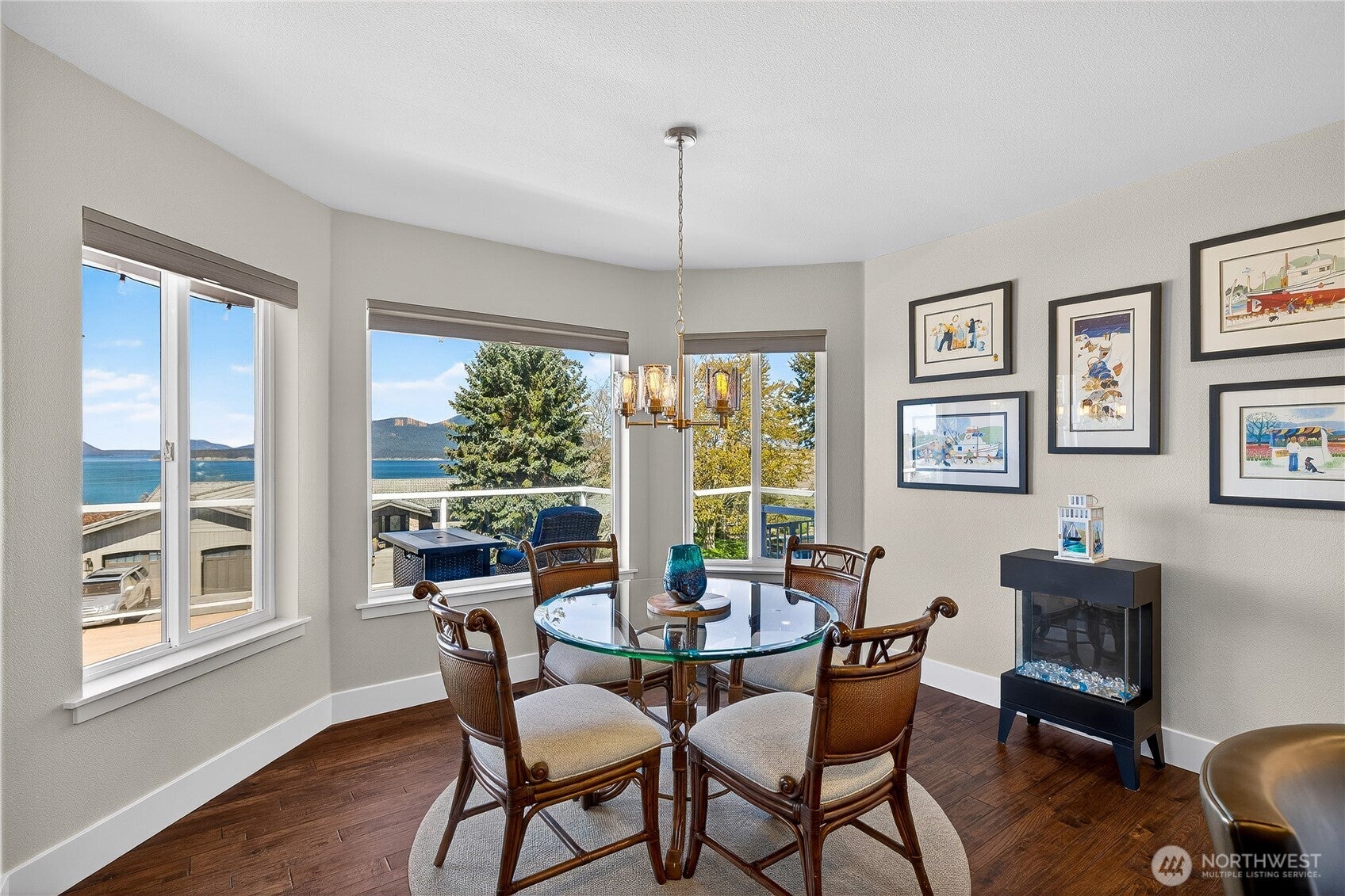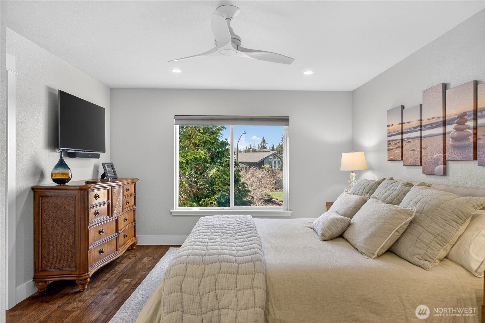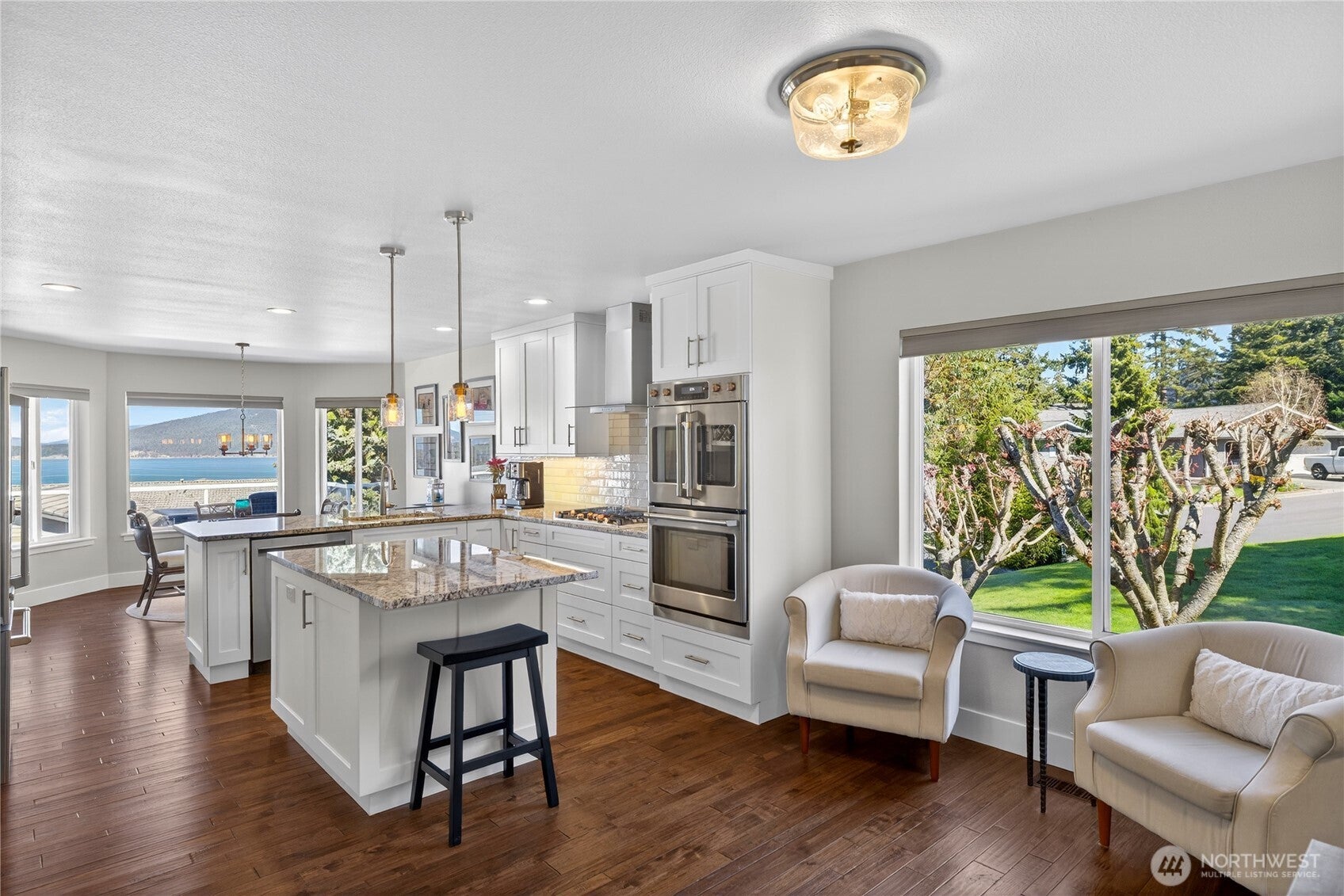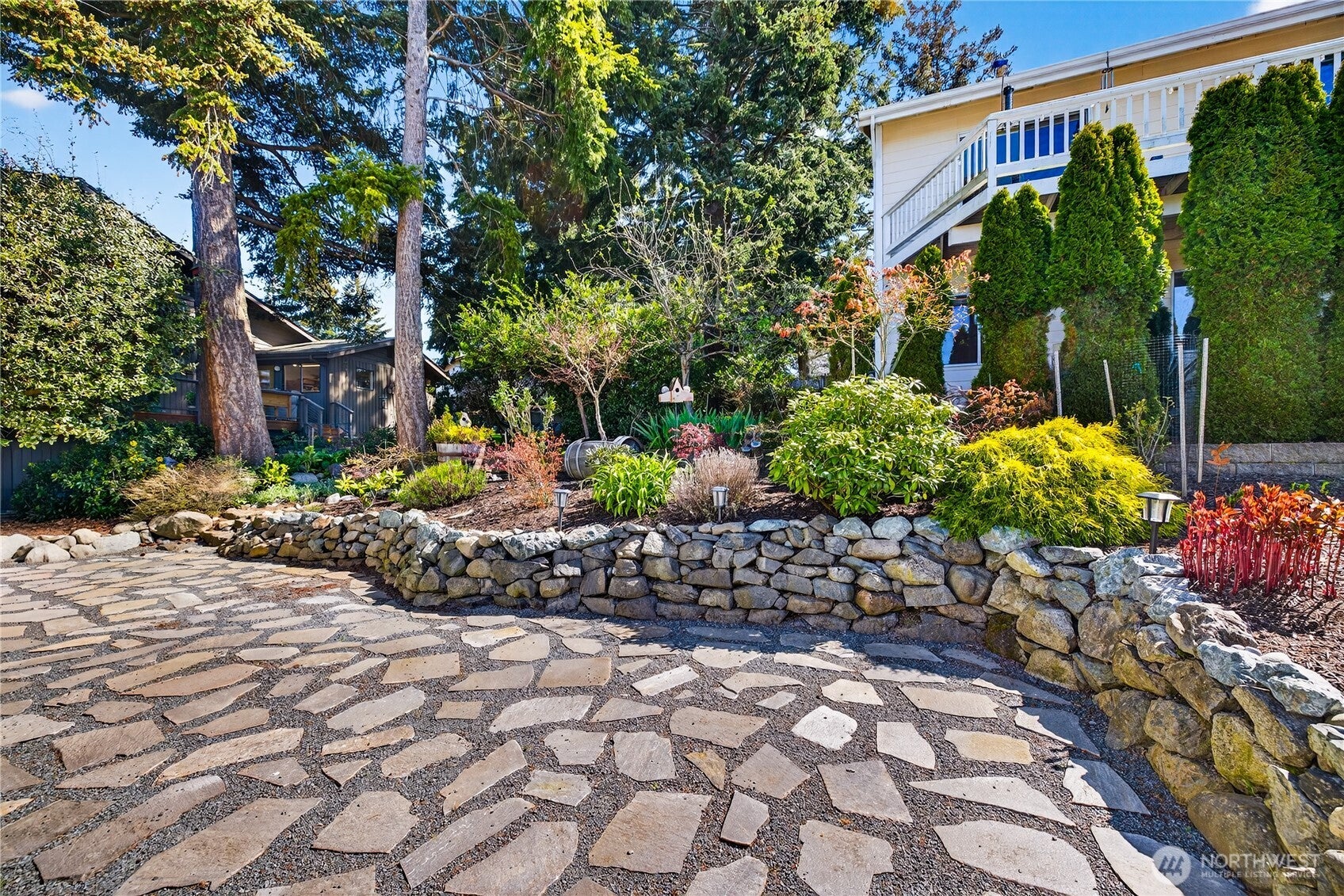 Perched on a beautifully landscaped corner lot, this light-filled home captures sweeping water, island, and mountain views that define the Pacific Northwest lifestyle. Step inside to an inviting open-concept layout where rich hardwood floors, vaulted ceilings, and a stunning stone fireplace create a warm, elevated living space designed for both everyday comfort and effortless entertaining. The chef-inspired kitchen features expansive granite countertops, crisp white cabinetry, stainless steel appliances, and a generous island that flows seamlessly into the dining and living areas. Large windows frame breathtaking views, bringing natural beauty indoors. Unwind in the spa-like primary suite with a luxurious walk-in tile shower and serene soaking tub, thoughtfully designed for relaxation. Outdoor living shines with an expansive view deckperfect for morning coffee or sunset gatheringsoverlooking the water and surrounding neighborhood. The meticulously maintained grounds offer striking curb appeal with curated landscaping, stone pathways, and vibrant plantings. A spacious garage and additional parking provide flexibility, while nearby community amenities, including sports courts, enhance an active lifestyle. This is more than a homeits a front-row seat to the lifestyle youve been waiting for.