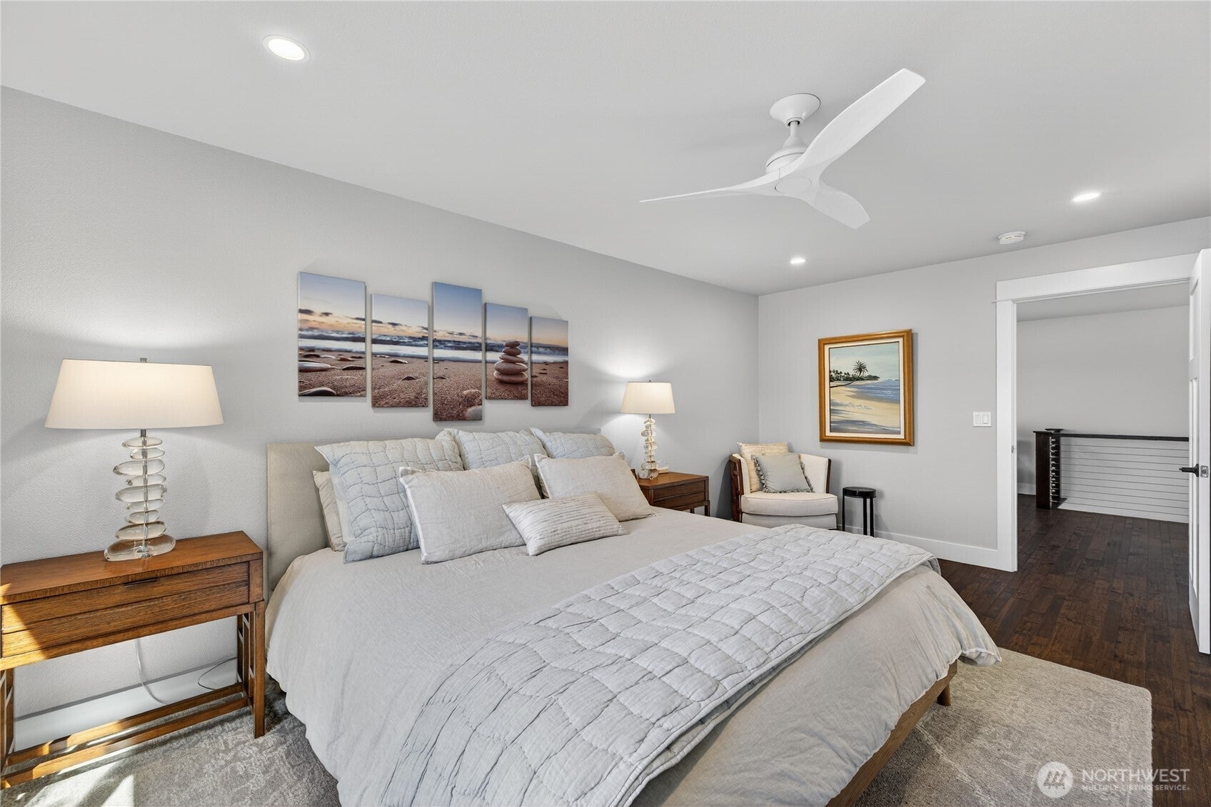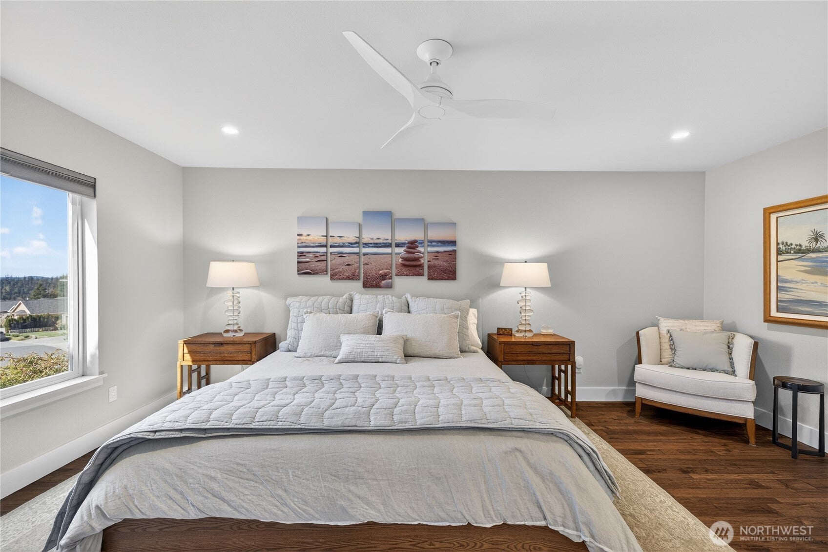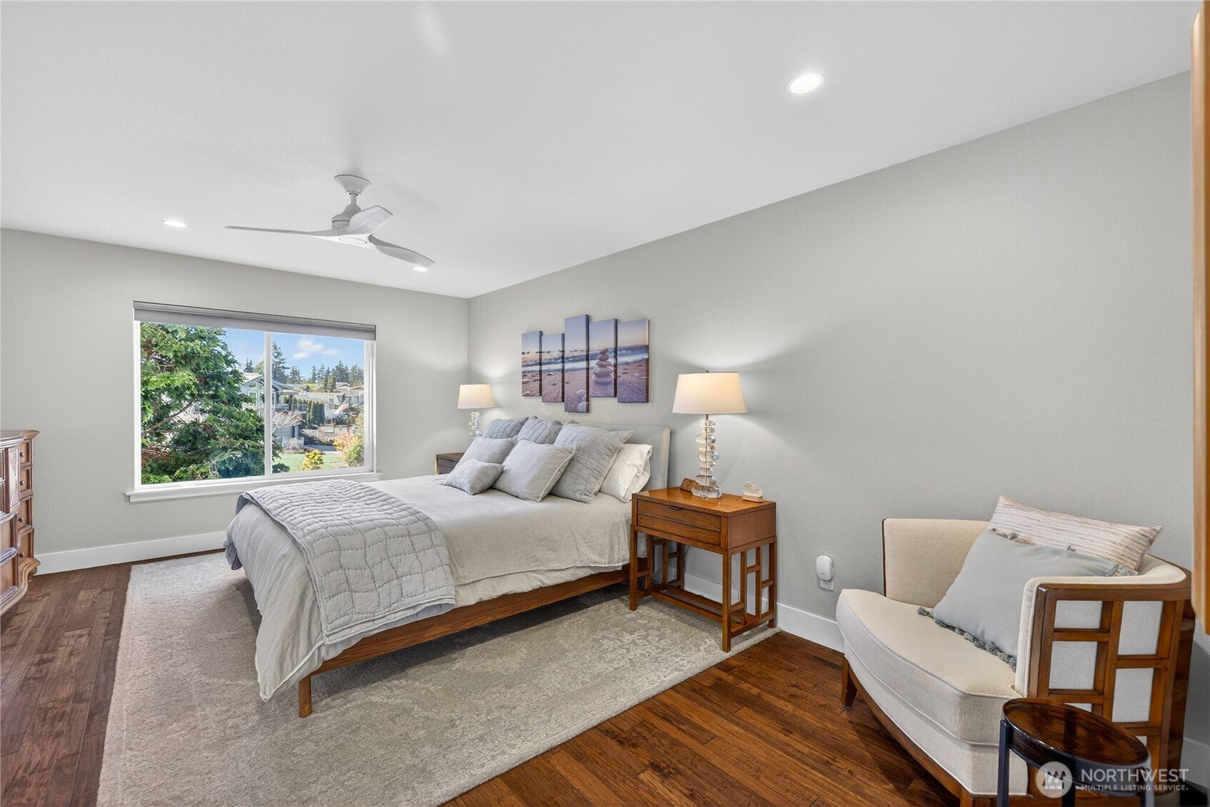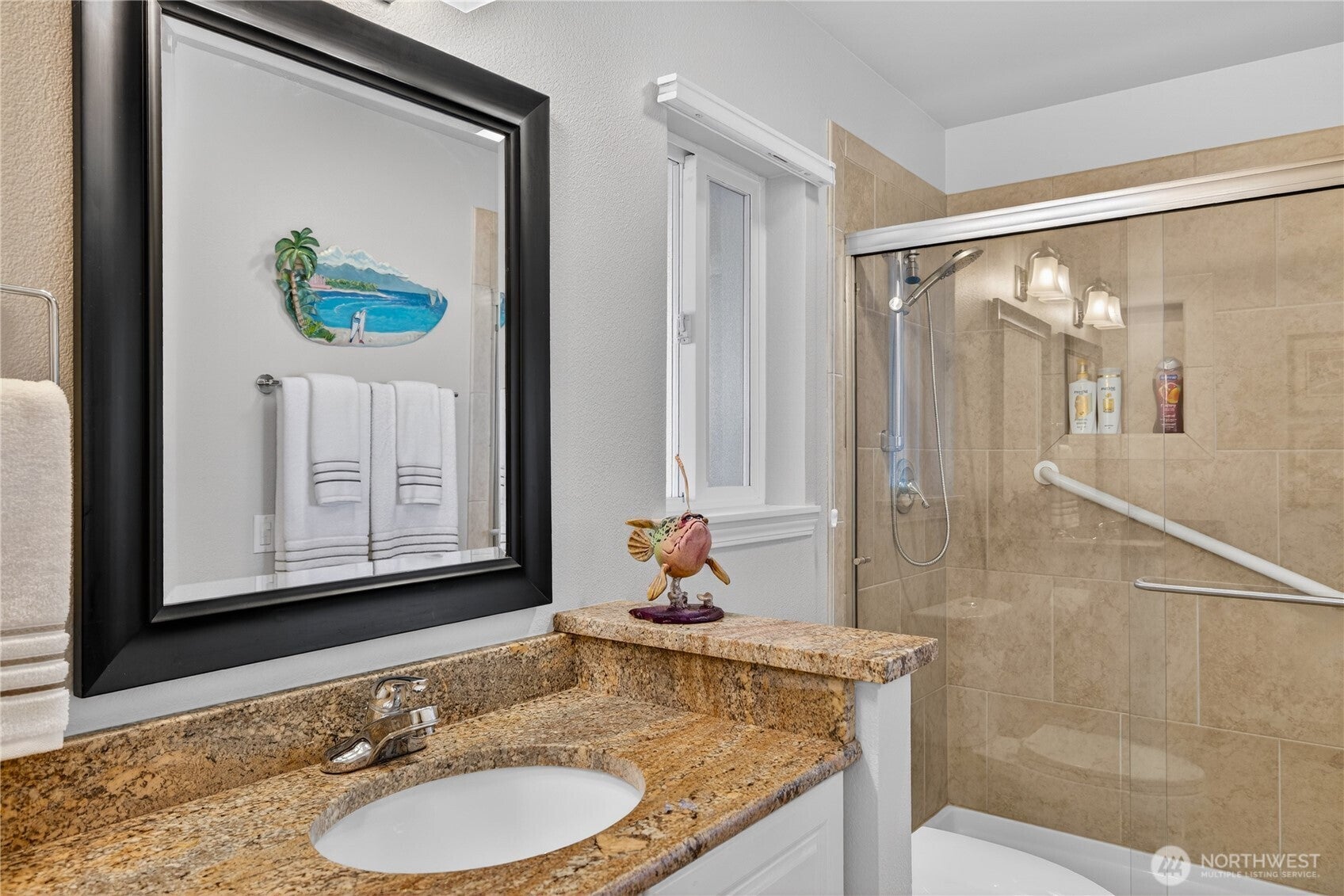 Perched on a beautifully landscaped corner lot, this light-filled home captures sweeping water, island, and mountain views that define the Pacific Northwest lifestyle. Step inside to an inviting open-concept layout where rich hardwood floors, vaulted ceilings, and a stunning stone fireplace create a warm, elevated living space designed for both everyday comfort and effortless entertaining. The chef-inspired kitchen features expansive granite countertops, crisp white cabinetry, stainless steel appliances, and a generous island that flows seamlessly into the dining and living areas. Large windows frame breathtaking views, bringing natural beauty indoors. Unwind in the spa-like primary suite with a luxurious walk-in tile shower and serene soaking tub, thoughtfully designed for relaxation. Outdoor living shines with an expansive view deckperfect for morning coffee or sunset gatheringsoverlooking the water and surrounding neighborhood. The meticulously maintained grounds offer striking curb appeal with curated landscaping, stone pathways, and vibrant plantings. A spacious garage and additional parking provide flexibility, while nearby community amenities, including sports courts, enhance an active lifestyle. This is more than a homeits a front-row seat to the lifestyle youve been waiting for.