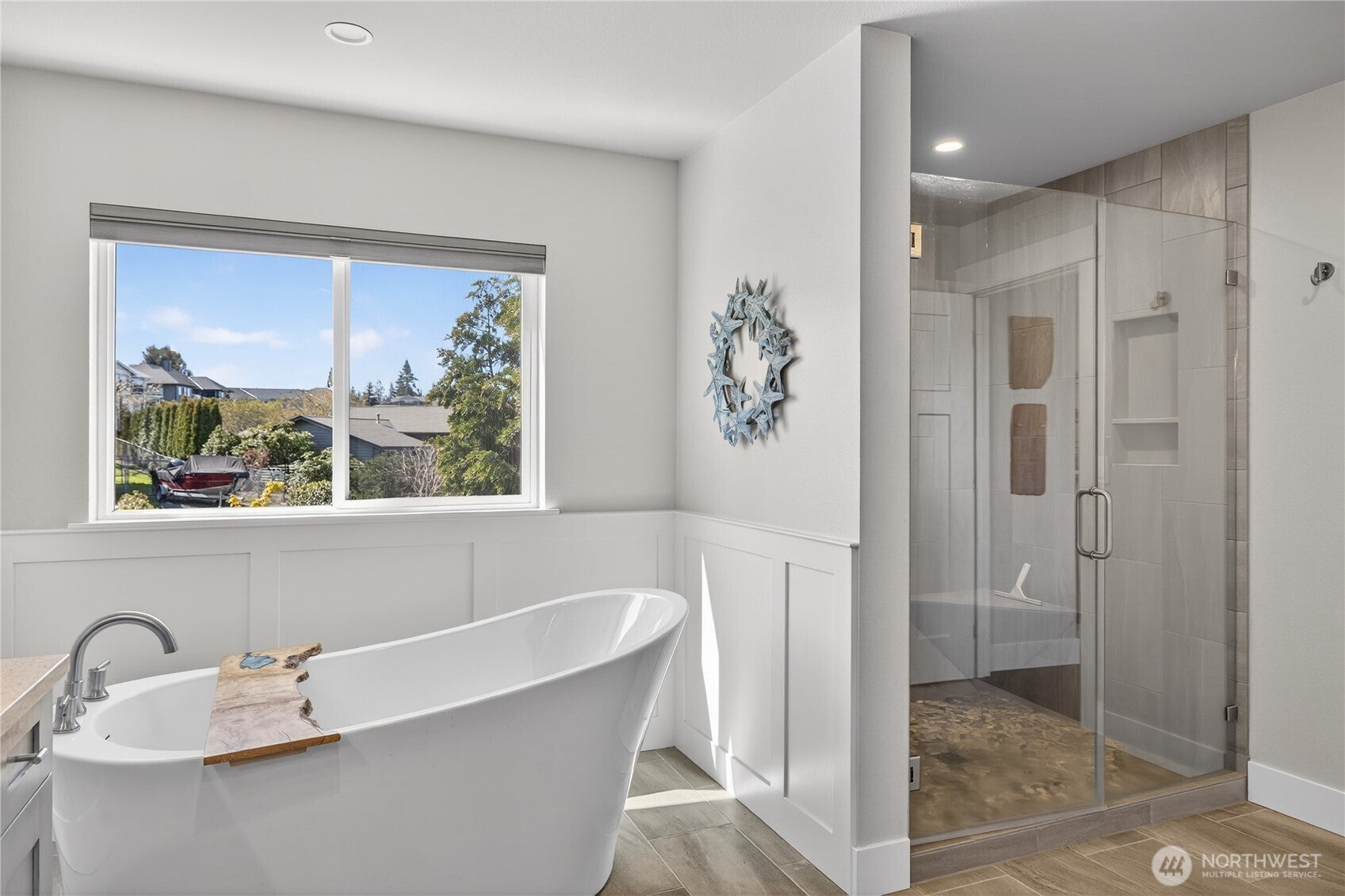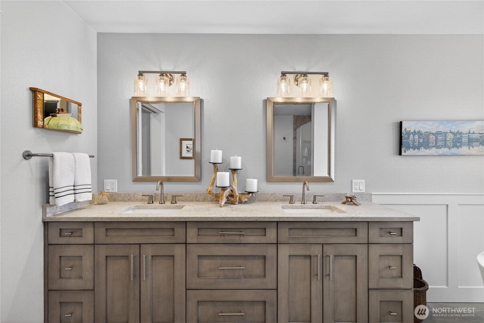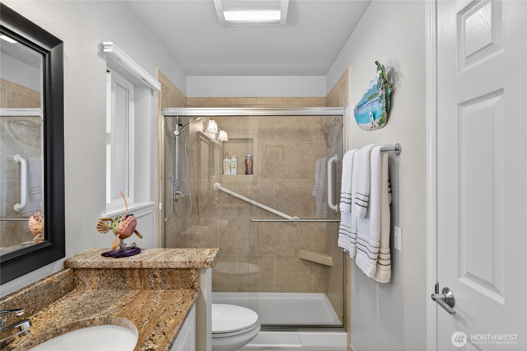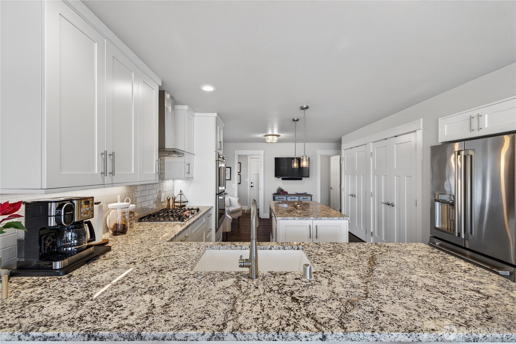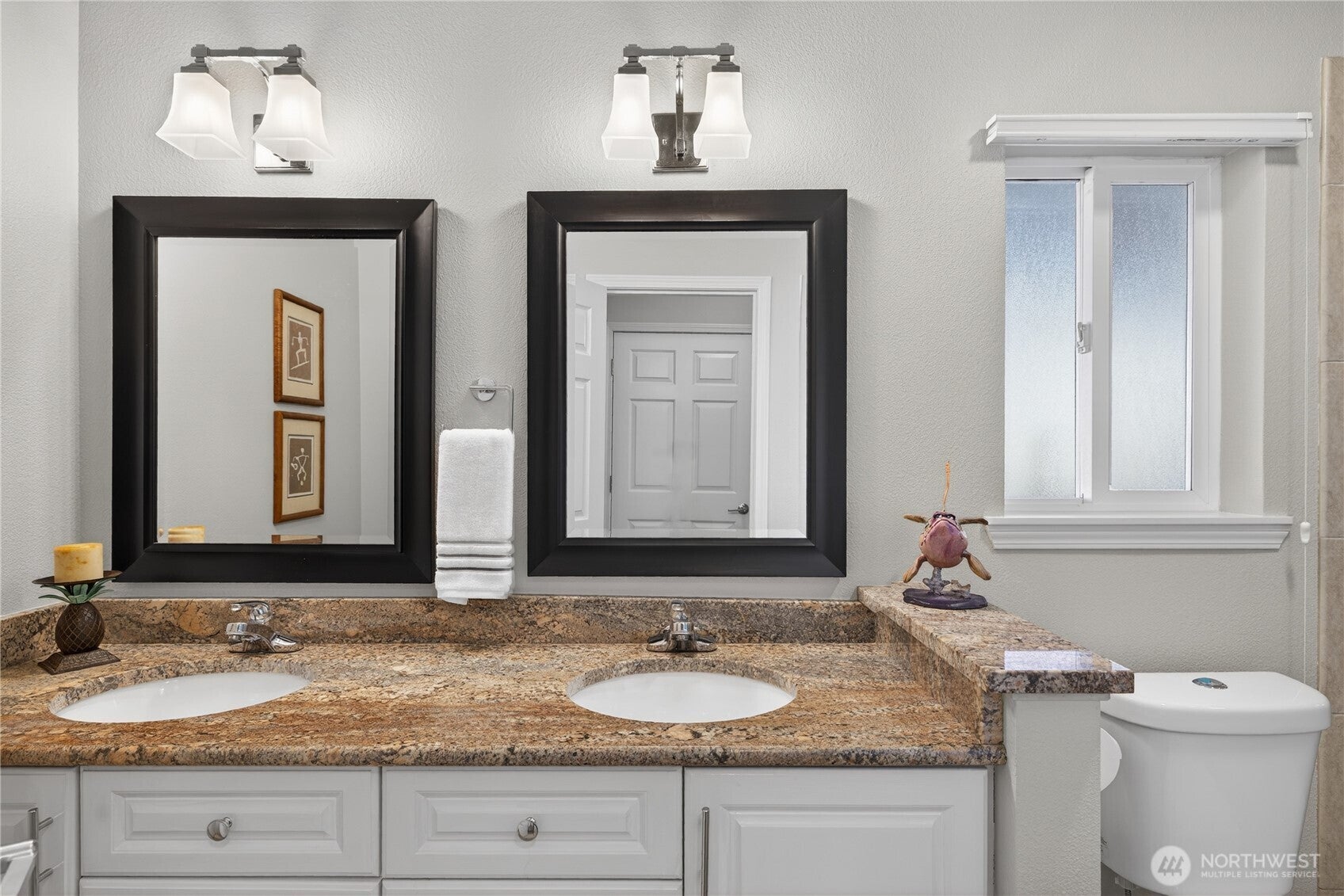 Perched on a beautifully landscaped corner lot, this light-filled home captures sweeping water, island, and mountain views that define the Pacific Northwest lifestyle. Step inside to an inviting open-concept layout where rich hardwood floors, vaulted ceilings, and a stunning stone fireplace create a warm, elevated living space designed for both everyday comfort and effortless entertaining. The chef-inspired kitchen features expansive granite countertops, crisp white cabinetry, stainless steel appliances, and a generous island that flows seamlessly into the dining and living areas. Large windows frame breathtaking views, bringing natural beauty indoors. Unwind in the spa-like primary suite with a luxurious walk-in tile shower and serene soaking tub, thoughtfully designed for relaxation. Outdoor living shines with an expansive view deckperfect for morning coffee or sunset gatheringsoverlooking the water and surrounding neighborhood. The meticulously maintained grounds offer striking curb appeal with curated landscaping, stone pathways, and vibrant plantings. A spacious garage and additional parking provide flexibility, while nearby community amenities, including sports courts, enhance an active lifestyle. This is more than a homeits a front-row seat to the lifestyle youve been waiting for.