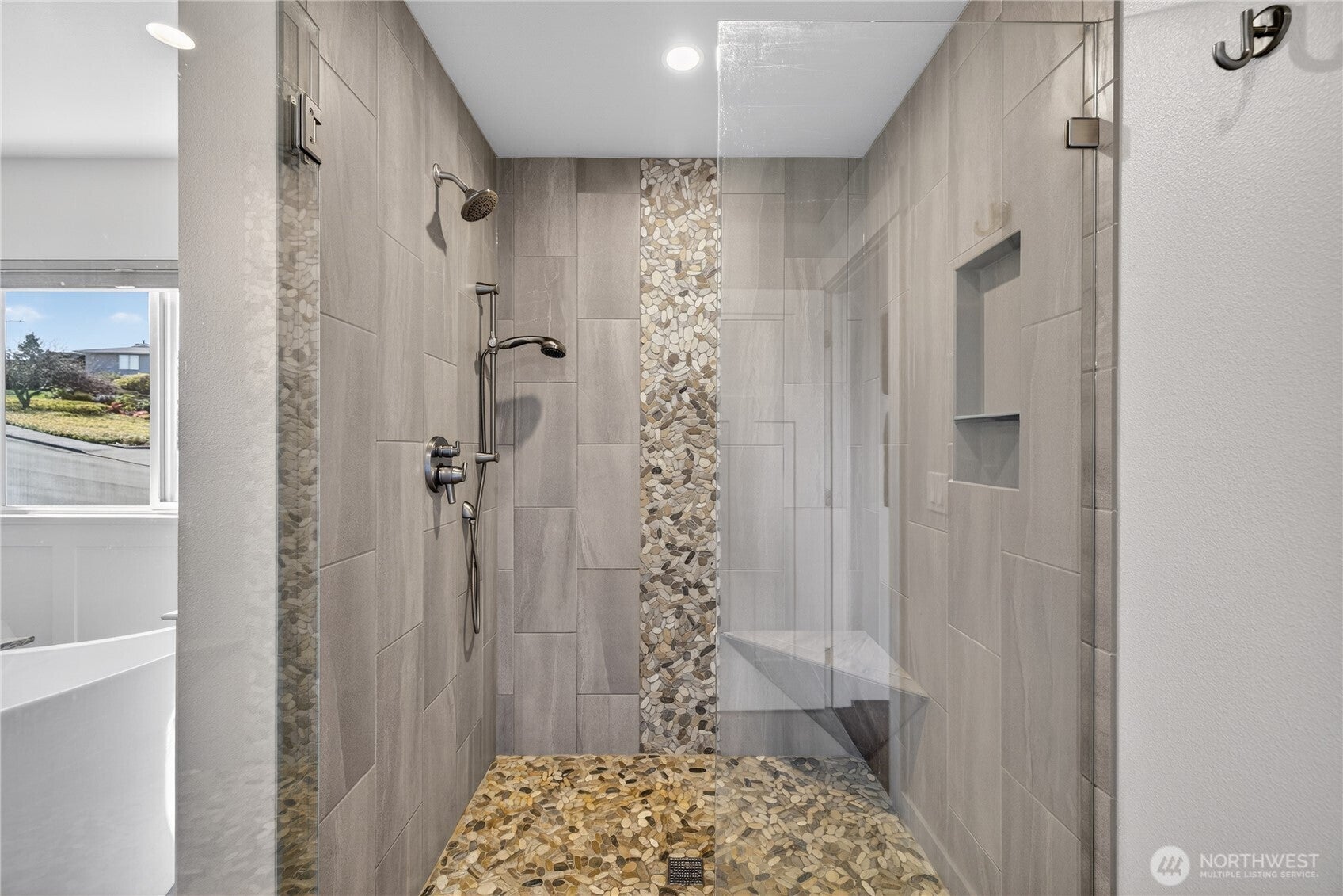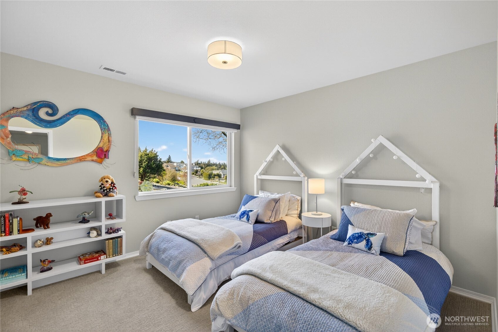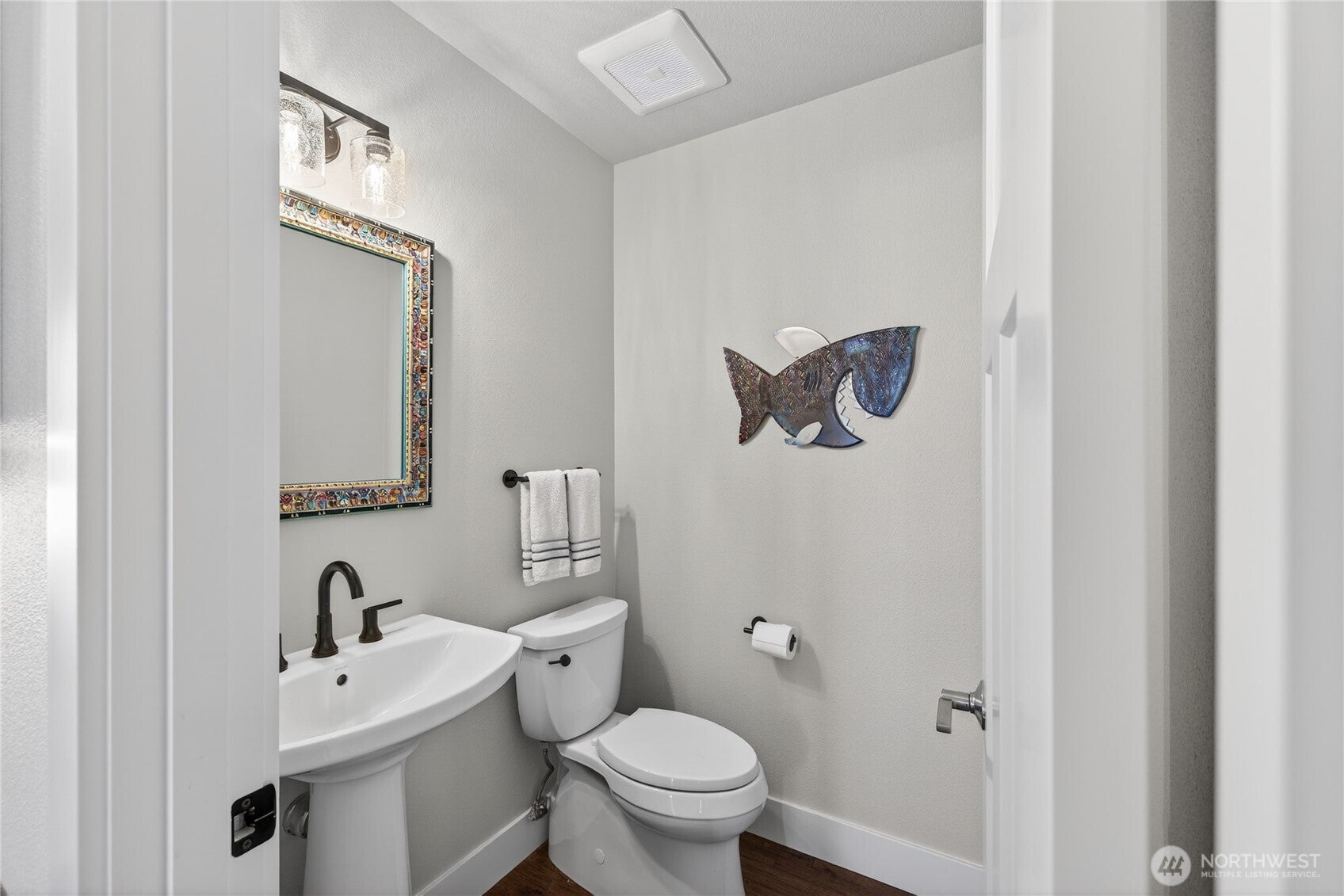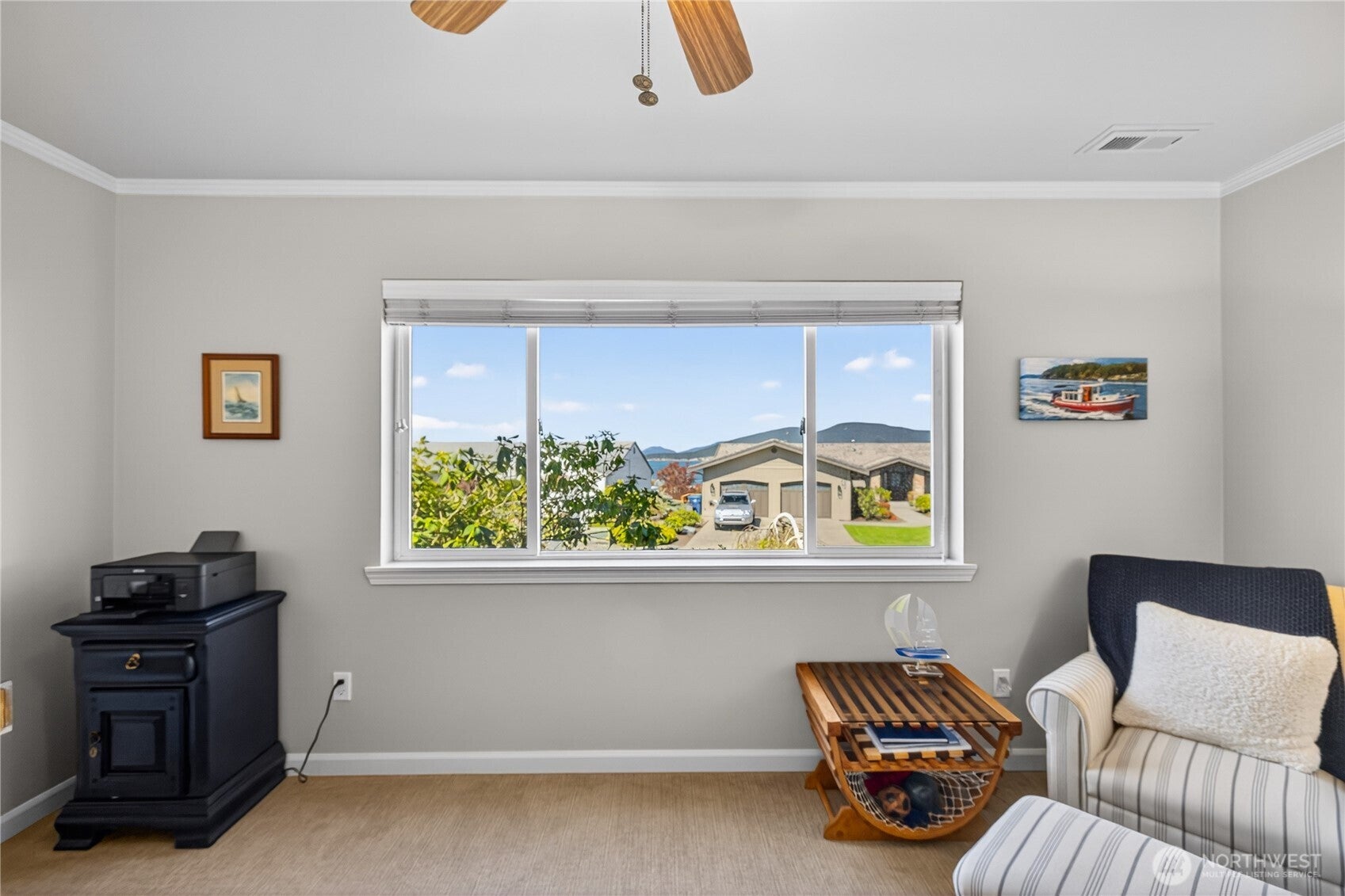 Perched on a beautifully landscaped corner lot, this light-filled home captures sweeping water, island, and mountain views that define the Pacific Northwest lifestyle. Step inside to an inviting open-concept layout where rich hardwood floors, vaulted ceilings, and a stunning stone fireplace create a warm, elevated living space designed for both everyday comfort and effortless entertaining. The chef-inspired kitchen features expansive granite countertops, crisp white cabinetry, stainless steel appliances, and a generous island that flows seamlessly into the dining and living areas. Large windows frame breathtaking views, bringing natural beauty indoors. Unwind in the spa-like primary suite with a luxurious walk-in tile shower and serene soaking tub, thoughtfully designed for relaxation. Outdoor living shines with an expansive view deckperfect for morning coffee or sunset gatheringsoverlooking the water and surrounding neighborhood. The meticulously maintained grounds offer striking curb appeal with curated landscaping, stone pathways, and vibrant plantings. A spacious garage and additional parking provide flexibility, while nearby community amenities, including sports courts, enhance an active lifestyle. This is more than a homeits a front-row seat to the lifestyle youve been waiting for.