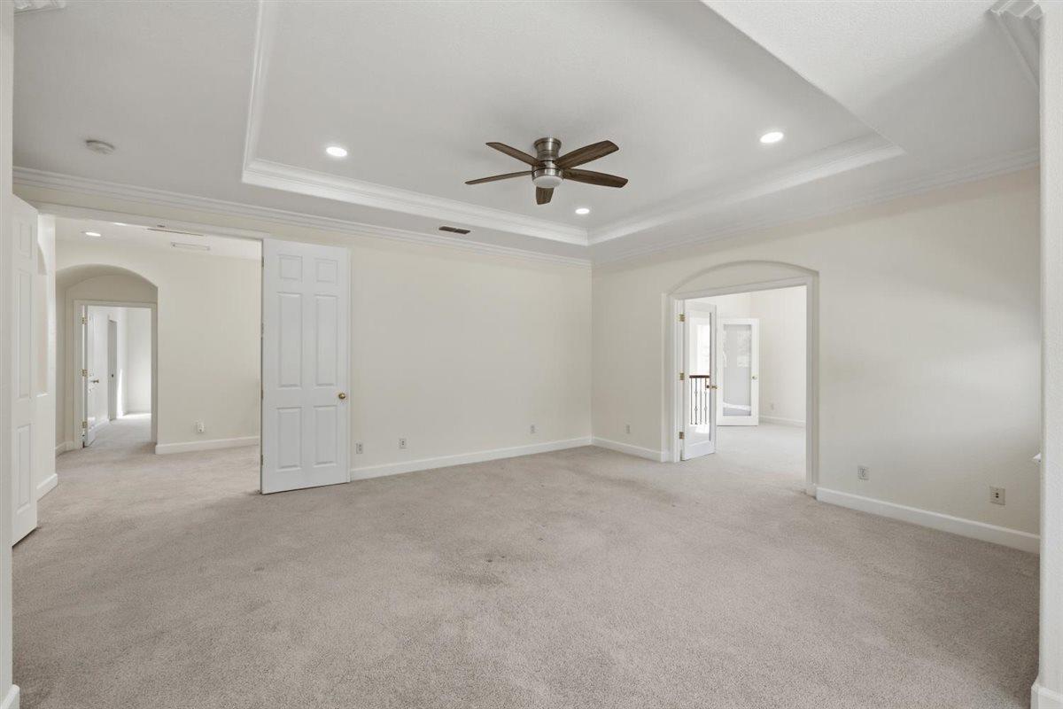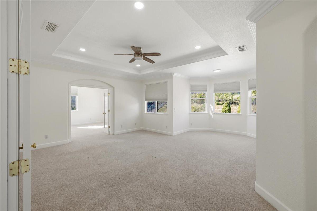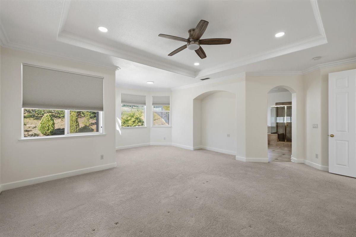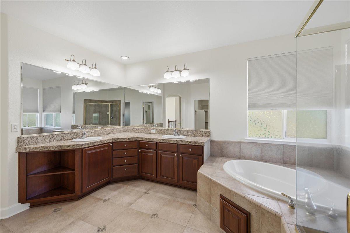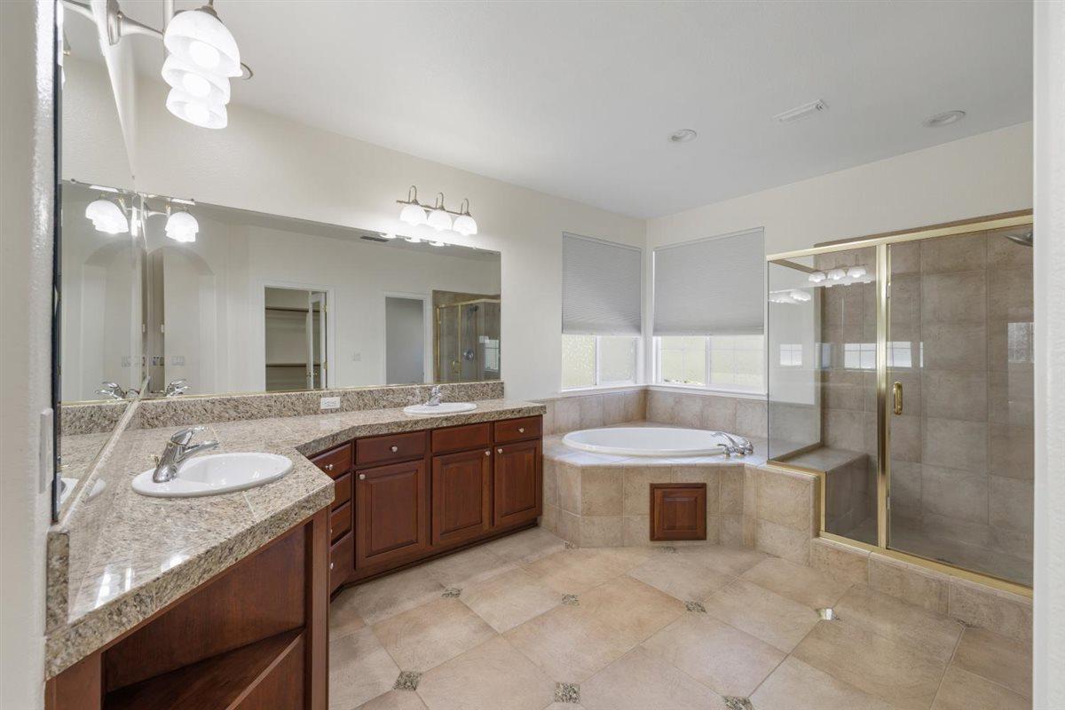 Pride of ownership located in the desirable & prestigious Serrano community!! Elegant and inviting home, high ceilings, open and airy, functional, flowing and comfortable design. Grand entry with soaring ceilings, helical staircase with wrought iron railing. Large formal living w/fireplace, formal dining room, high end kitchen w/ island & ample granite counters, stainless steel appliances (new double oven and microwave), newly stained cabinets, provides flowing entertainment possibilities overlooking expansive family room w/fireplace. 4 Bedrooms and 3 full baths, as well as a flexible additional room with a wet bar and wine cooler off the main suite overlooking the living area through a French door. Luxurious primary bath with huge counter space, double sinks, oval soaking tub and separate shower stall, extra large walk-in closet with organizers and floor cedar planks. One bedroom and full bath downstairs. 2 bedrooms upstairs w/shared bath & double sink. Large laundry room with cabinets and folding counter plus wall closet with extra shelving. Private low maintenance backyard with 2 patios with covers great for summer entertainment and relaxation. 3 car garage with wall to wall cabinets and shelves.HOA maintains front yard, 24-hour roaming security. Walking distance to neighborhood park. Easy access to shopping, entertainment, and HWY 50. Great schools.