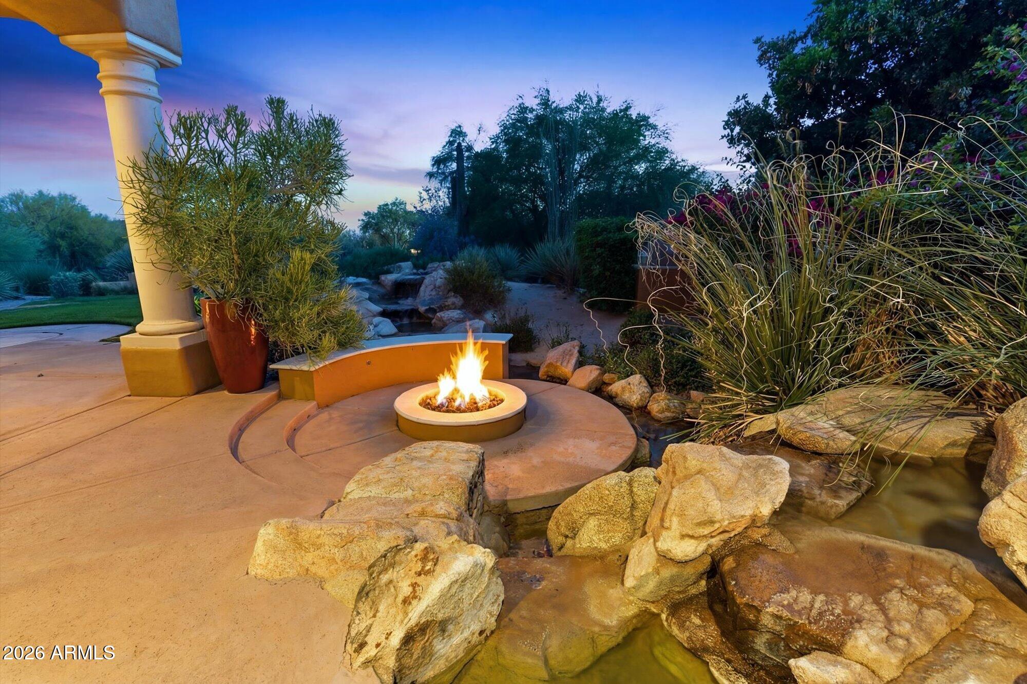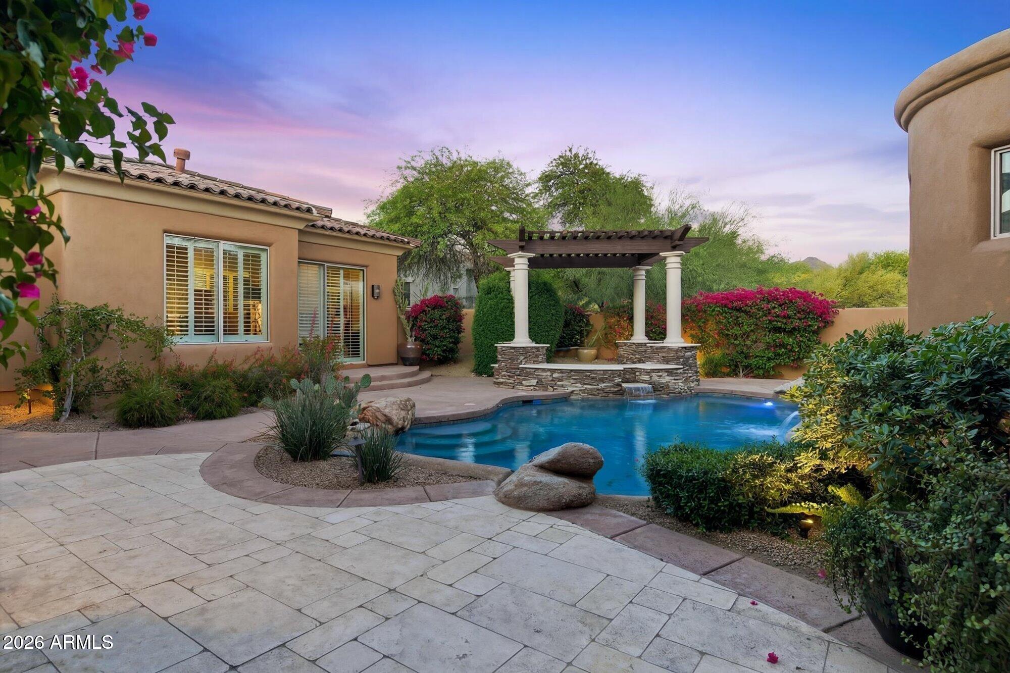 One of the best streets in DC Ranch! This 4 bedroom home has a detached casita, timeless character and warm, classic tones. Professionally designed features like limestone & hand-scraped distressed hardwood flooring, custom marble & French limestone countertops, coffered & wood-beamed ceilings, surround sound, and 3 gas fireplaces. Situated on a unique pie-shaped corner lot with soft curves, this home features two inviting backyards: a private pool oasis courtyard with heated pebble-tec pool, spa, water feature, and stacked-stone gazebo, plus a wrap-around south-east facing backyard with all the benefits of golf course adjacency - complete privacy, breathtaking mountain views - without any golf balls. Boulder water feature feels like a resort. Close to DC Ranch Country Club too!