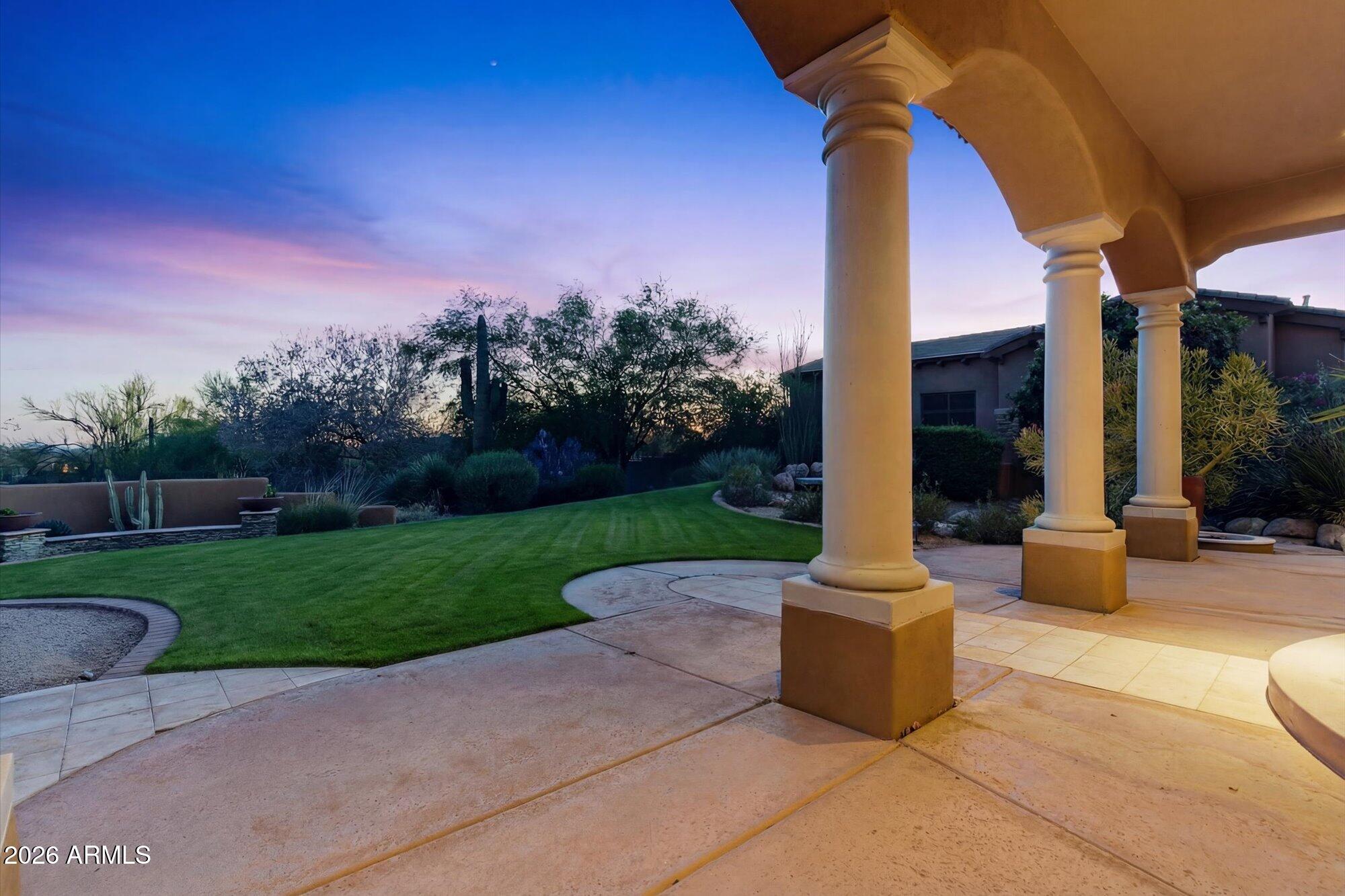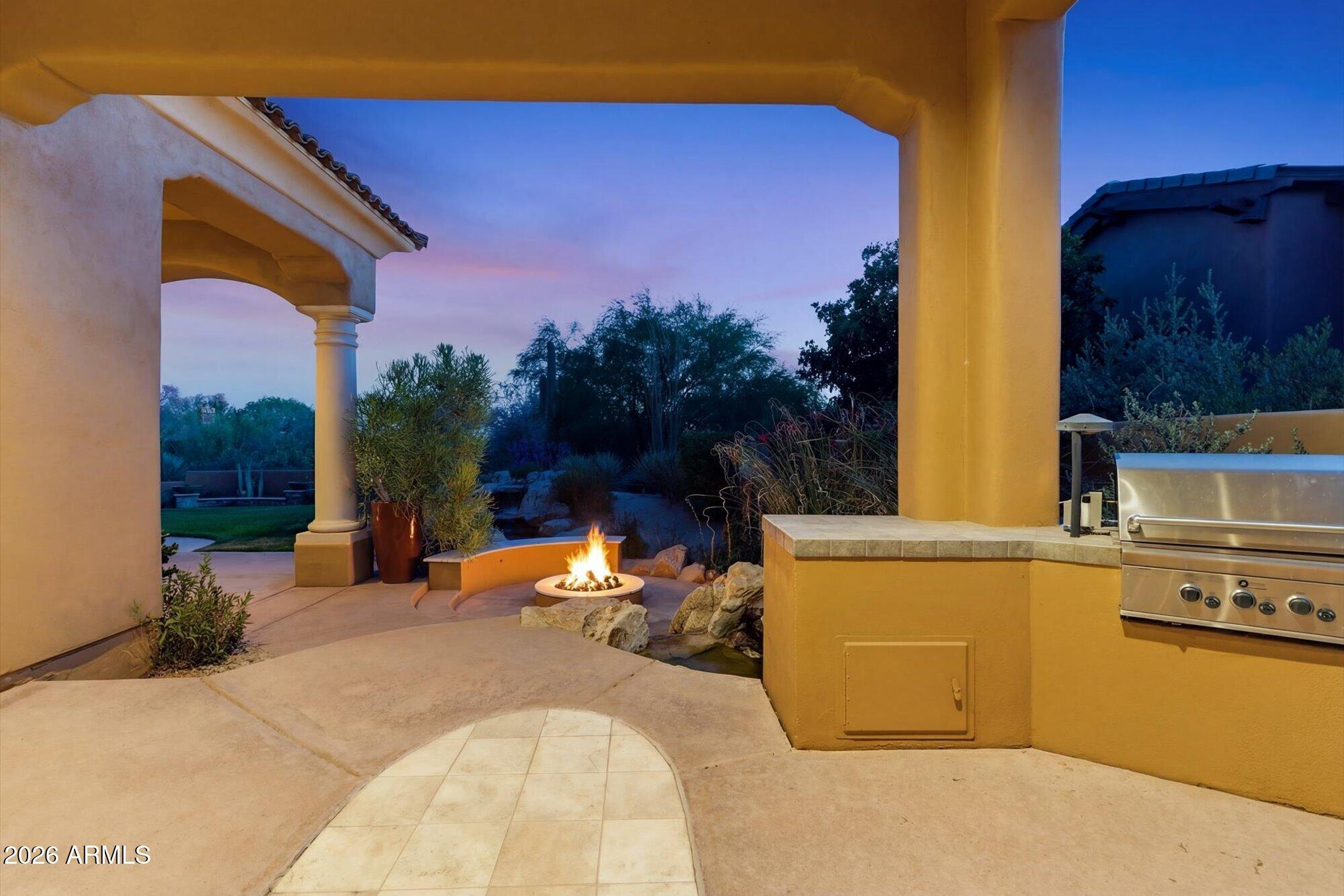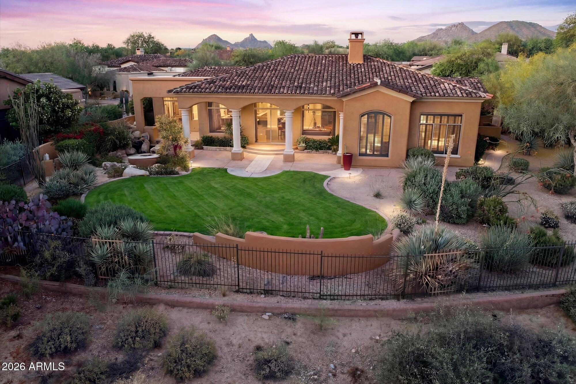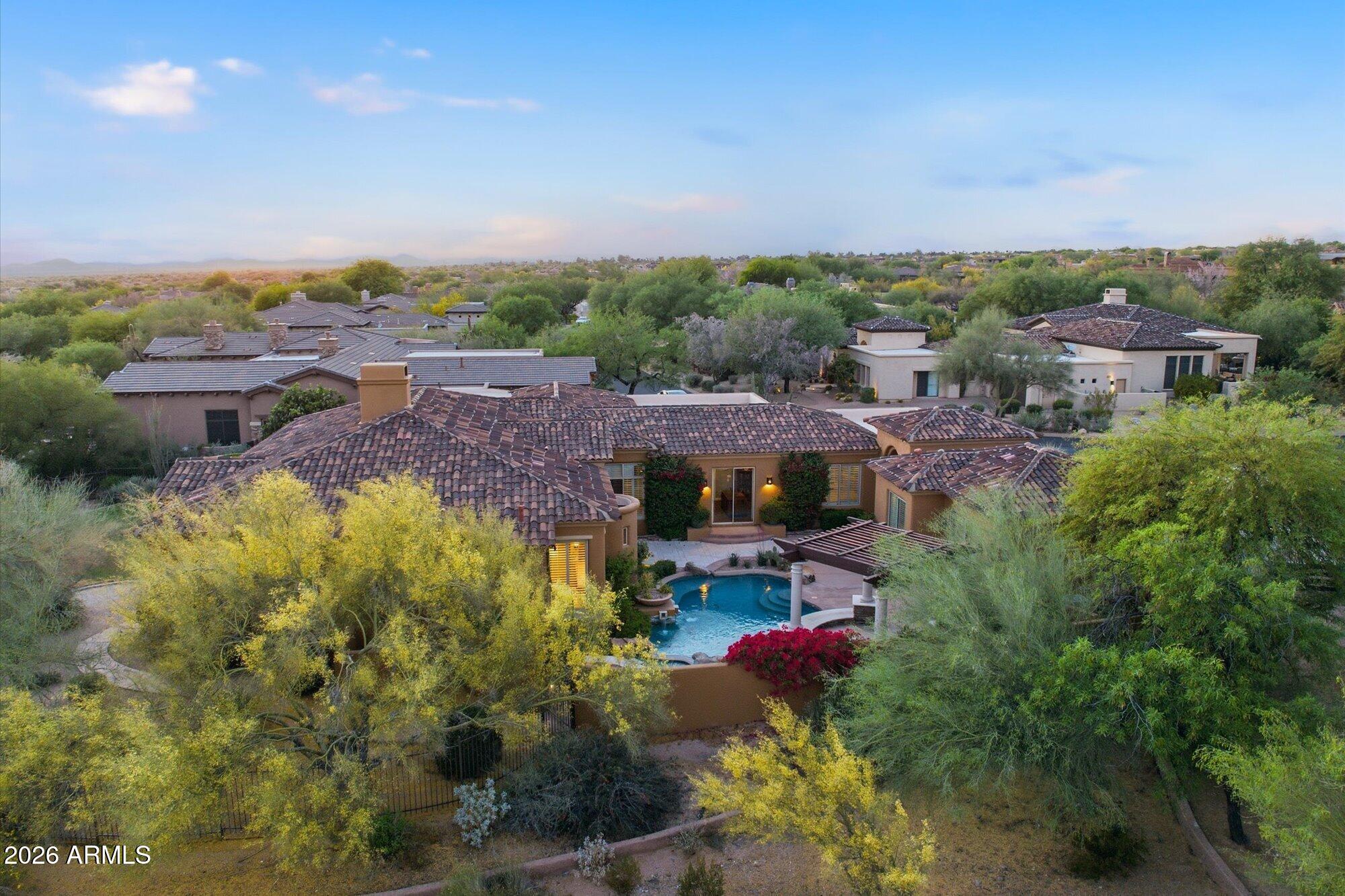 One of the best streets in DC Ranch! This 4 bedroom home has a detached casita, timeless character and warm, classic tones. Professionally designed features like limestone & hand-scraped distressed hardwood flooring, custom marble & French limestone countertops, coffered & wood-beamed ceilings, surround sound, and 3 gas fireplaces.