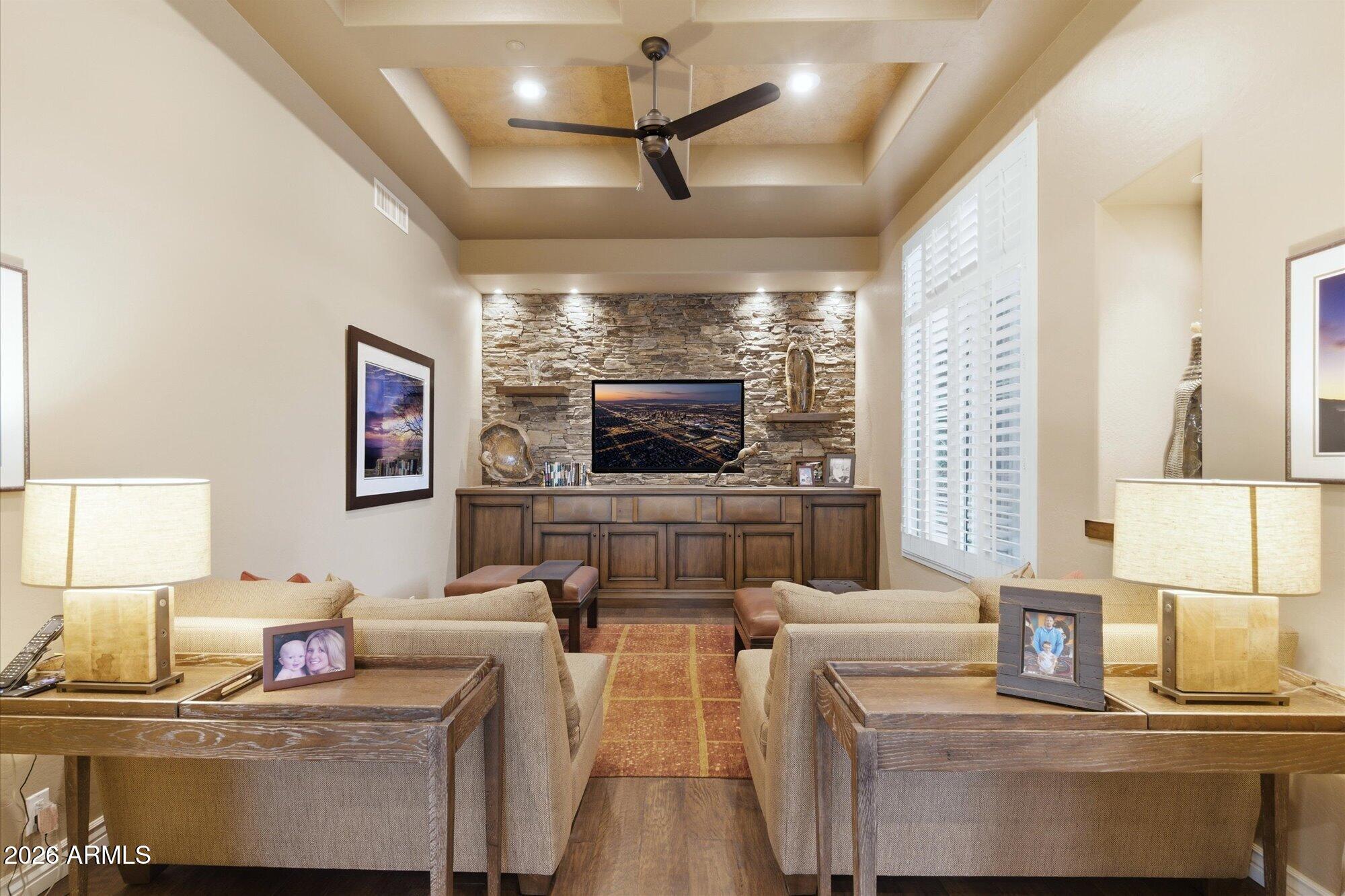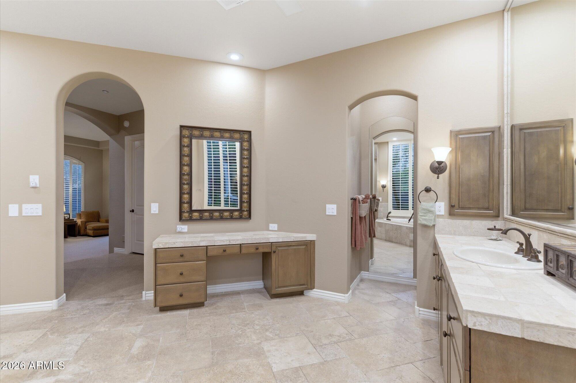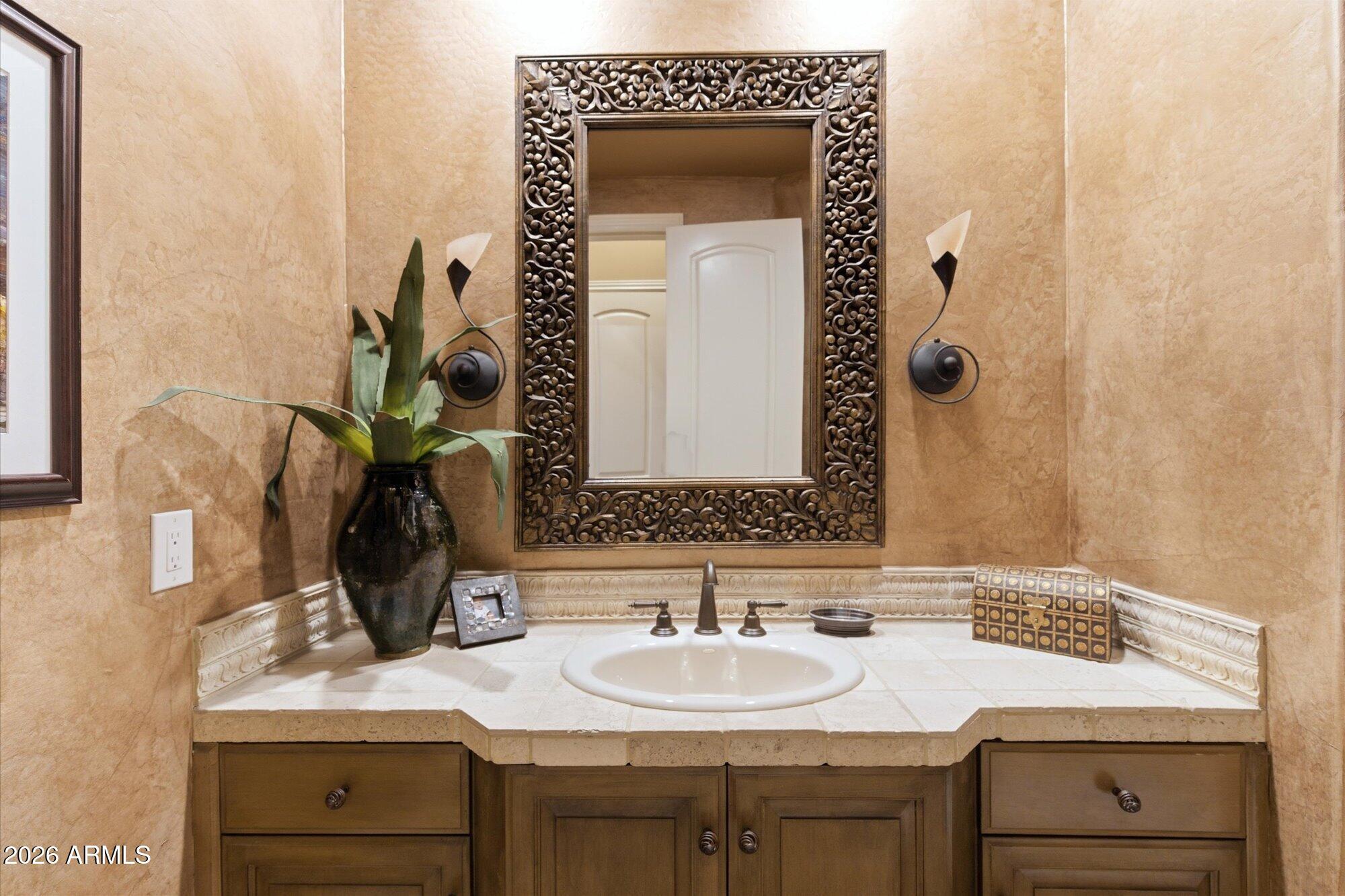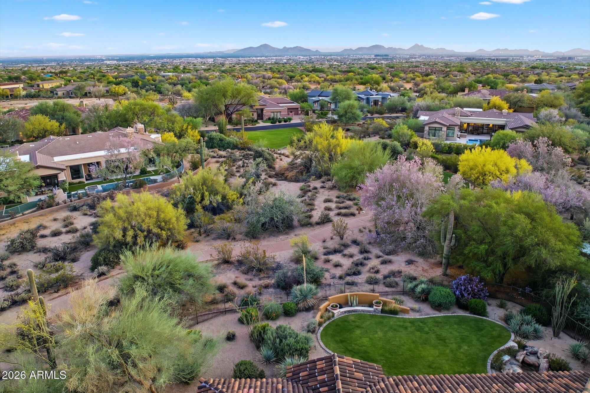 One of the best streets in DC Ranch! This 4 bedroom home has a detached casita, timeless character and warm, classic tones. Professionally designed features like limestone & hand-scraped distressed hardwood flooring, custom marble & French limestone countertops, coffered & wood-beamed ceilings, surround sound, and 3 gas fireplaces.