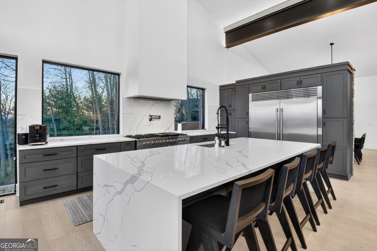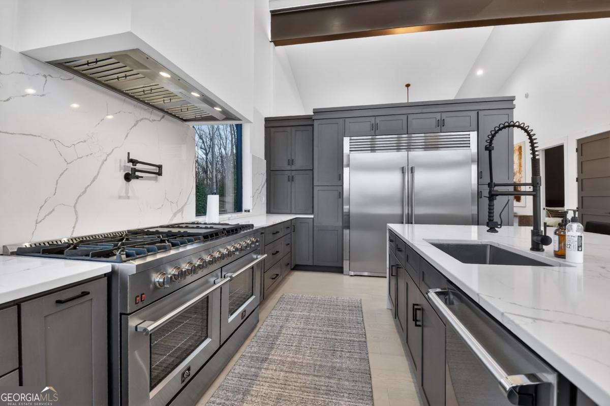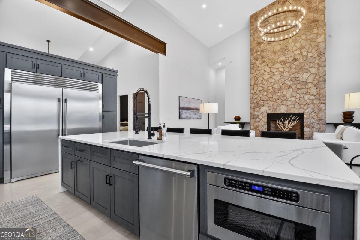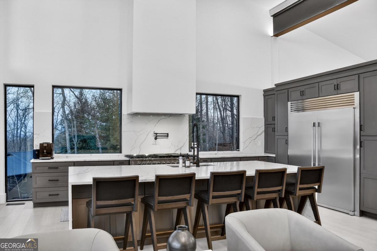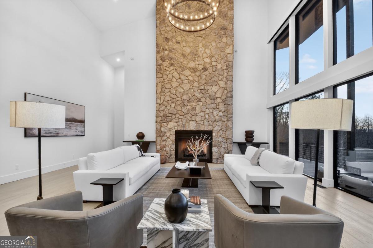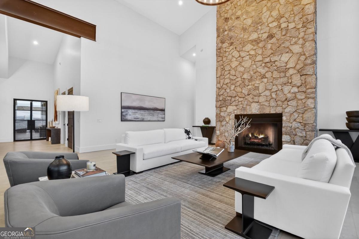 Located in the exclusive gated community of Lake Rabun Bluffs in Lakemont, Georgia, this substantial three level formal Craftsman style mountain home commands breathtaking long range mountain and lake views from nearly every room. Perched high on a mountaintop, it overlooks the sparkling lower basin of Lake Rabun and the distant peaks of Highlands, North Carolina, offering a perfect front row seat to the spectacular Fourth of July fireworks launched over the water. The exterior showcases timeless stone construction with a welcoming covered porch, white columns, and lush landscaping that frames the entrance beautifully. A circular driveway leads to the attached garage and provides plenty of parking and guest space, while an additional building site offers future expansion potential. Step inside to soaring ceilings, exposed wooden beams, and warm wood paneled walls that create an inviting yet elegant atmosphere. A grand stone fireplace centers the spacious living area, with large windows that flood the space with natural light and those incredible vistas. The primary suite is a true retreat, featuring a luxurious bed with scenic views, a sitting area, and direct access to a private balcony where you can sip coffee while gazing across the treetops to the lake and mountains beyond. Spa like bathrooms include a deep soaking tub positioned to enjoy the view, double vanities, and elegant finishes. An open yet formal layout flows seamlessly, with a well appointed kitchen boasting white cabinetry, granite counters, stainless appliances, and a large island perfect for gathering. The dining room, bathed in natural light from multiple windows, easily seats family and friends. Multiple outdoor living spaces, including generous decks and a covered porch with rocking chairs, let you soak in the fresh mountain air and panoramic scenery day or night. This extraordinary home is perfectly suited for year round living or as a carefree lock and leave vacation property. It offers convenient marina access to Lake Rabun and is located near the historic Lake Rabun Hotel and Maxs Lakeside for great food. This is a rare chance to own one of the most spectacular mountaintop homes in the Lake Rabun area, where timeless architecture meets unmatched natural beauty.