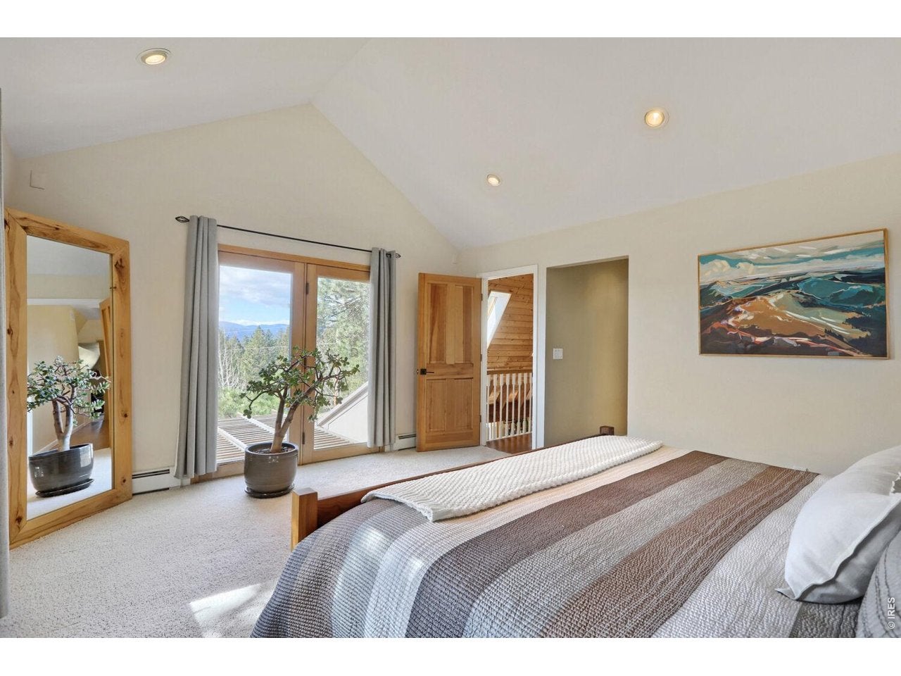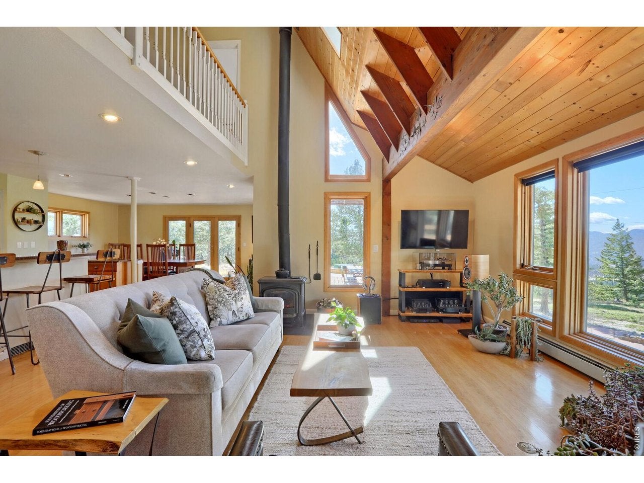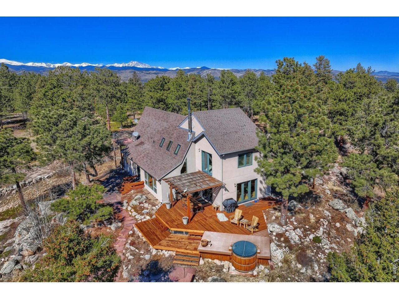 A Modern Colorado Mountain Home with City Convenience. ** Starting at Broadway and Baseline, 4 songs from your playlist lead you up a paved road to a private alpine drive that takes you back into the trees to your own private retreat. A flat driveway and 7 exceptional acres of trees, rock outcroppings, panoramic views backing directly up to the 2,880-acre Walker Ranch open space. **Thoughtfully designed for both comfort and connection, this home offers a warm, inviting flow ideal for hosting, gathering, and creating lasting memories. Vaulted ceilings, wood beams and wood flooring complement streaming daylight from walls of windows custom designed to give you nature views from every single room. **An updated kitchen, induction cook top, stainless appliances and bar allow room for two chefs at the same time and plenty of space for entertaining. Dining is a fun decision between a formal dining room or the large deck off the kitchen. The primary is complete with a large walk-in closet and a fully appointed deluxe bath. The extended upstairs family/recreation or office leads to a raised deck for meditation or sun bathing. ** Outside, note the maintenance free stucco and high-end windows and doors. The oversized, private, wrap around deck has views of rolling hills and distant mountain tops. Now add the serenity of an adjacent year-round water feature. A hot tub to enjoy dark sky nights with millions of stars. A firepit for meaningful conversations. Elevated above all other surroundings, the land is ideal to take a break from your work life to walk, play, climb trees, build forts, relax and simply live the dream life.** The oversized 2 car heated garage even has an elevator to magically raise up every thing you want to store in 120 sq ft of attic storage. **Should you ever have to leave the privacy of your home, its a 15 minute cruise back down to town conveniences with incredible views looking down over Boulder and out to Kansas.
