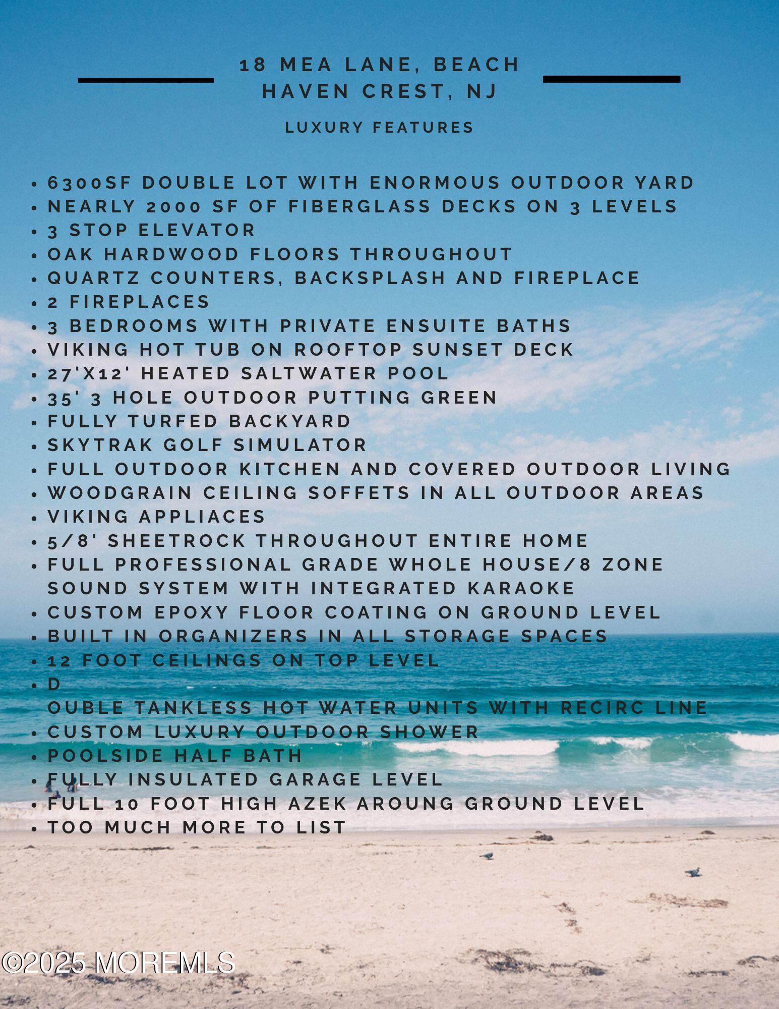 MIAMI MEETS LBI!!! Welcome to Bayview Manor, a spectacular custom estate home designed by CWB Architects and completed in 2025. Situated on a 6300sf double lot, the home features 3200 of luxury living space over 2000sf of outdoor deck space. Located on LBIs south Side in Beach Haven Crest on the narrowest part of the island, enjoy the best of both worlds being only 14 homes from the beach and 9 homes from the bay. The features of the home are too many to list: -Heated Saltwater 27x12 inground pool with spill over spa -Fully turfed yard with 35 foot 3 hole putting green -Full Outdoor Kitchen -Rooftop Hot Tub -SkyTrak Golf Simulator -Dayton Wifi Controlled whole house sound system with integrated Karaoke -Oak wood Floors throughout -On Demand Hot Water -Built ins in all closets -Gourmet Kitchen with Viking Appliances, Quartz counters and backsplash and oversized island with seating for 6.-3 Stop Elevator-Charger for EV-and so much moreGenerating 200k/year in rental income, the home is a great investment property. Not a stone was left unturned, nor an expense spared in the construction of this home.