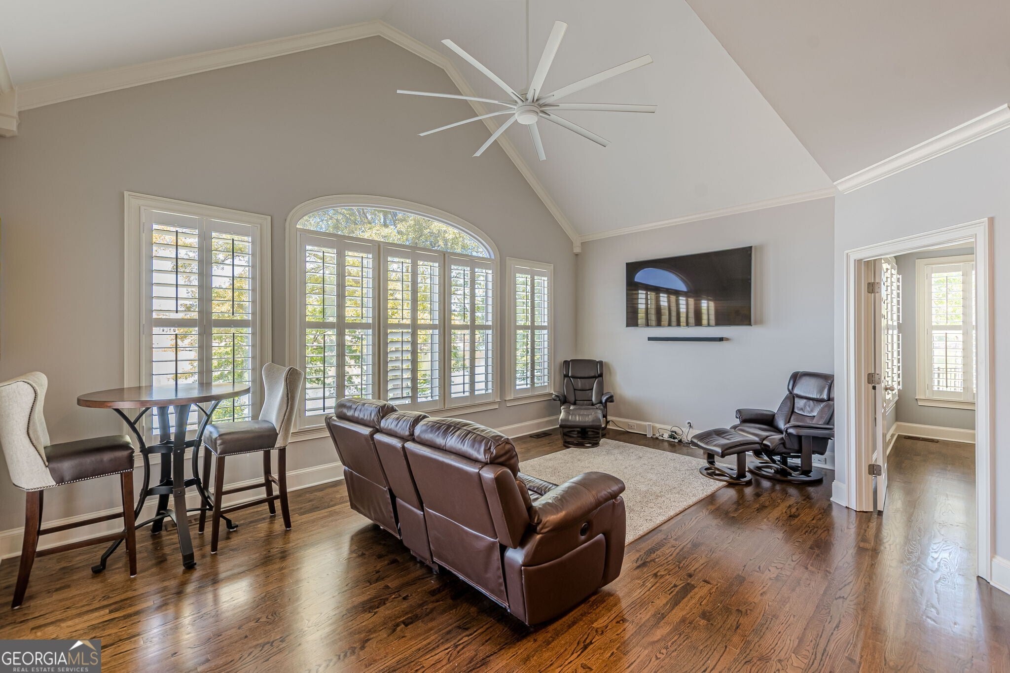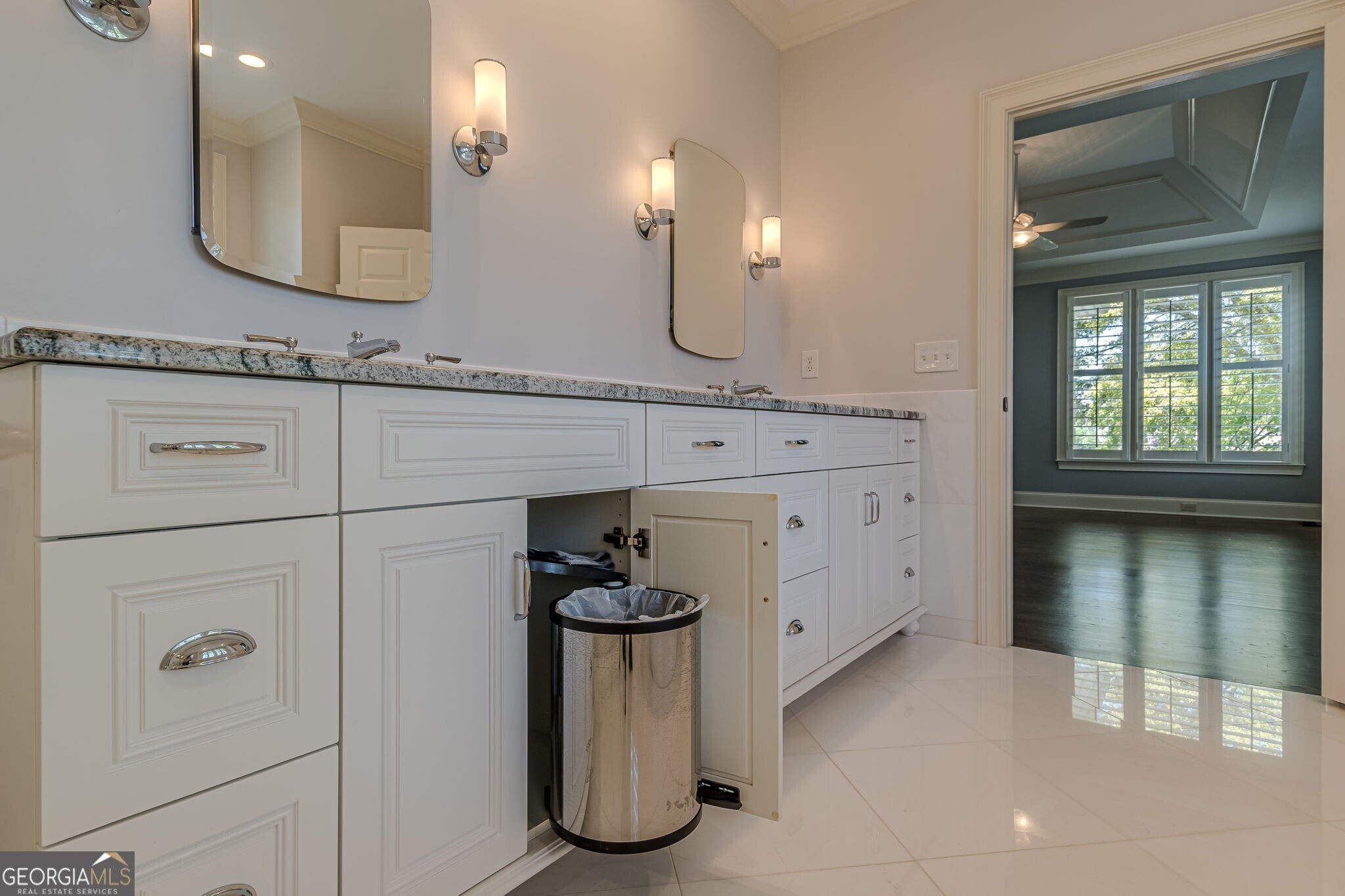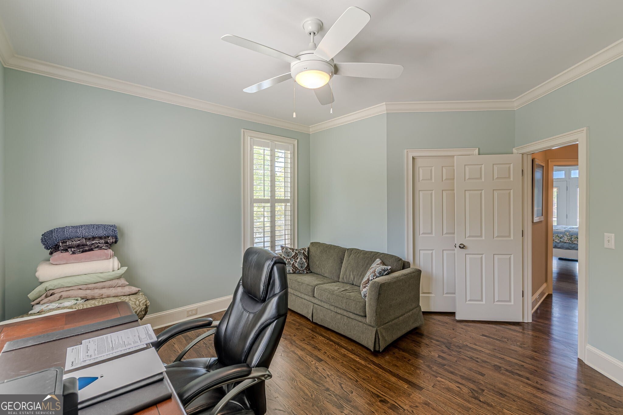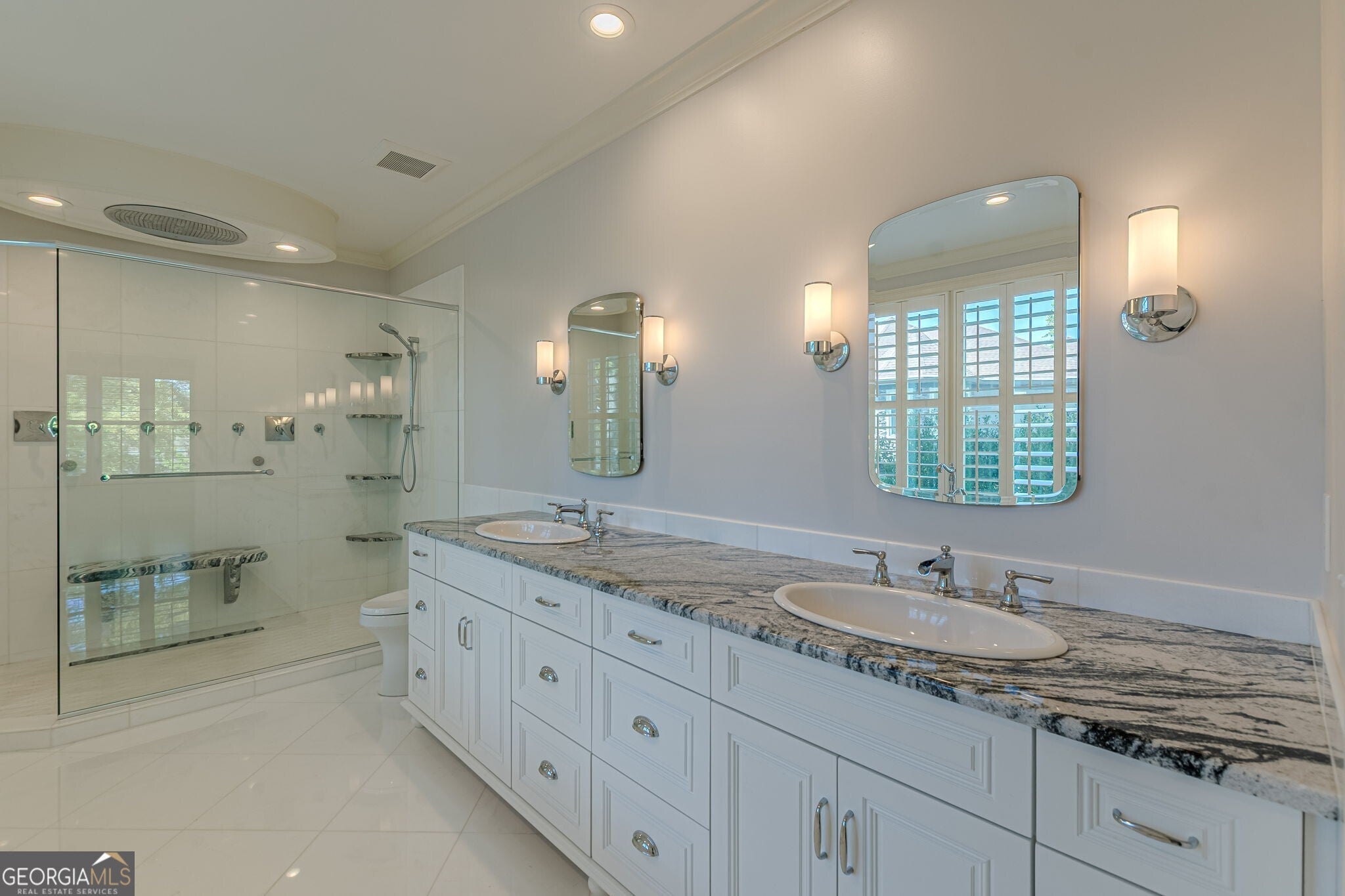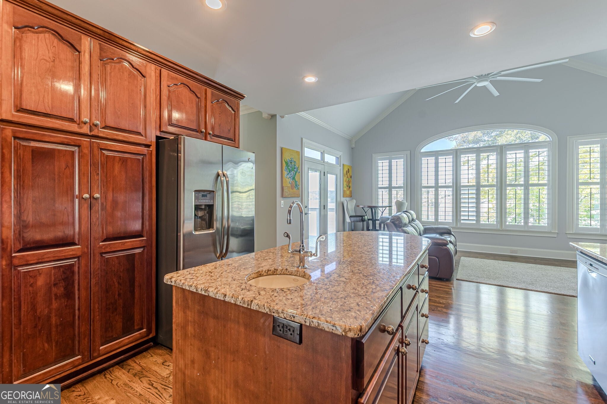 Welcome to your private paradise with this stunning lakefront retreat nestled in the sought-after Lake Redwine community in Newnan, Georgia. Perfectly positioned on a private cul-de-sac lot with 240 of lake frontage with custom seawall, this beautifully maintained ranch plan offers breathtaking, panoramic water views and a lifestyle of peaceful luxury. Step inside to an open, light-filled floorplan designed for both elegant entertaining and comfortable everyday living. Expansive windows frame the sparkling lake from the main living areas, creating a seamless connection between indoor and outdoor spaces. High end custom plantation shutters. The spacious great room, anchored by a cozy fireplace and custom built-ins, flows effortlessly into the gourmet kitchen featuring a large island, custom cabinetry with pull out shelving and pantry, Bosch cooktop and top of the line appliances - all with access to the deck -- perfect for enjoying morning coffee or sunset views. Water/gas plumbed for outdoor kitchen. The owners suite is a dream with serene lake views, a luxurious spa-inspired remodeled bath, and generous walk-in closet, while two additional guest ensuites on the main offer comfort and privacy. The finished terrace level provides flexible living space ideal for entertaining, hobbies, or guest/ inlaw suite along with ample storage. Safe remains! In addition to the main level garage, the lower level garage features workshop and parking for RV or up to approx 7 vehicles - perfect for the car enthusiasts! Outdoors, the beautifully landscaped yard, patio, and deck create the perfect setting for lakeside gatherings or quiet relaxation. Enjoy fresh fruits from the peach trees and lush blueberry bushes. With its impeccable condition, timeless finishes, and unmatched waterfront setting, this home is a rare opportunity to enjoy lake living at its finest.