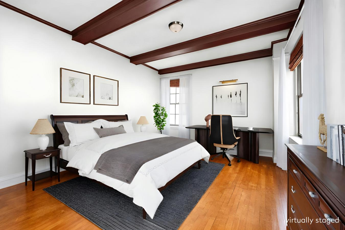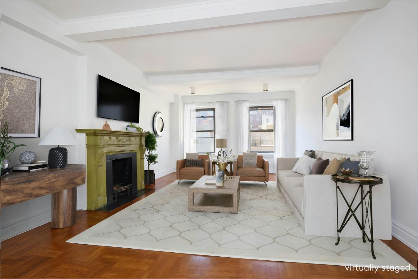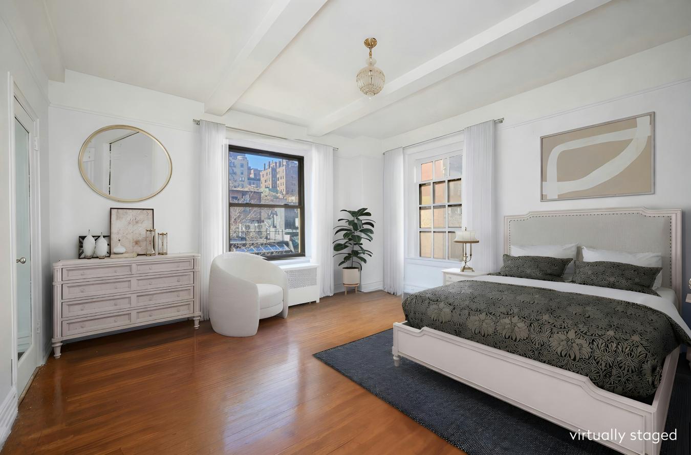 Gracious Classic: 6 Rooms Beaming with Light: Create your dream home. Gracious layout, generous rooms, open city views, and excellent light are the extraordinary features of this special apartment that needs your imagination. Enter into a large welcoming center gallery that connects to all major rooms: the living room, dining room, pantry/kitchen, and private bedroom hall. The expansive living room has two south-facing windows letting sunlight pour into the space. High beamed ceilings, pre-war detail, and a handsome wood-burning fireplace complete this special room. The west-facing dining room can accommodate large gatherings or be repurposed as a dining room/library. The butlers pantry flows into the large eat-in windowed kitchen with an adjoining windowed staff room/office with its bath. The private bedroom hall leads to a corner, south- and west-facing primary bedroom with a windowed en suite bath and oversized closet. The second bedroom faces west and north and has access to the adjacent bath, which can also function as a guest bath. Use of an outside storage unit comes with the apartment. Washer/dryers are permitted. Located on the northwest corner of 74th Street and Lexington Avenue, this landmarked boutique cooperative consists of 11 floors and 33 apartments and was built in 1925. There is a 24-hour attended lobby, a live-in resident manager, and it is pet friendly (dogs max 40 lbs. with approval). In the heart of the Upper East Side, this building is within minutes of everything the UES offers.