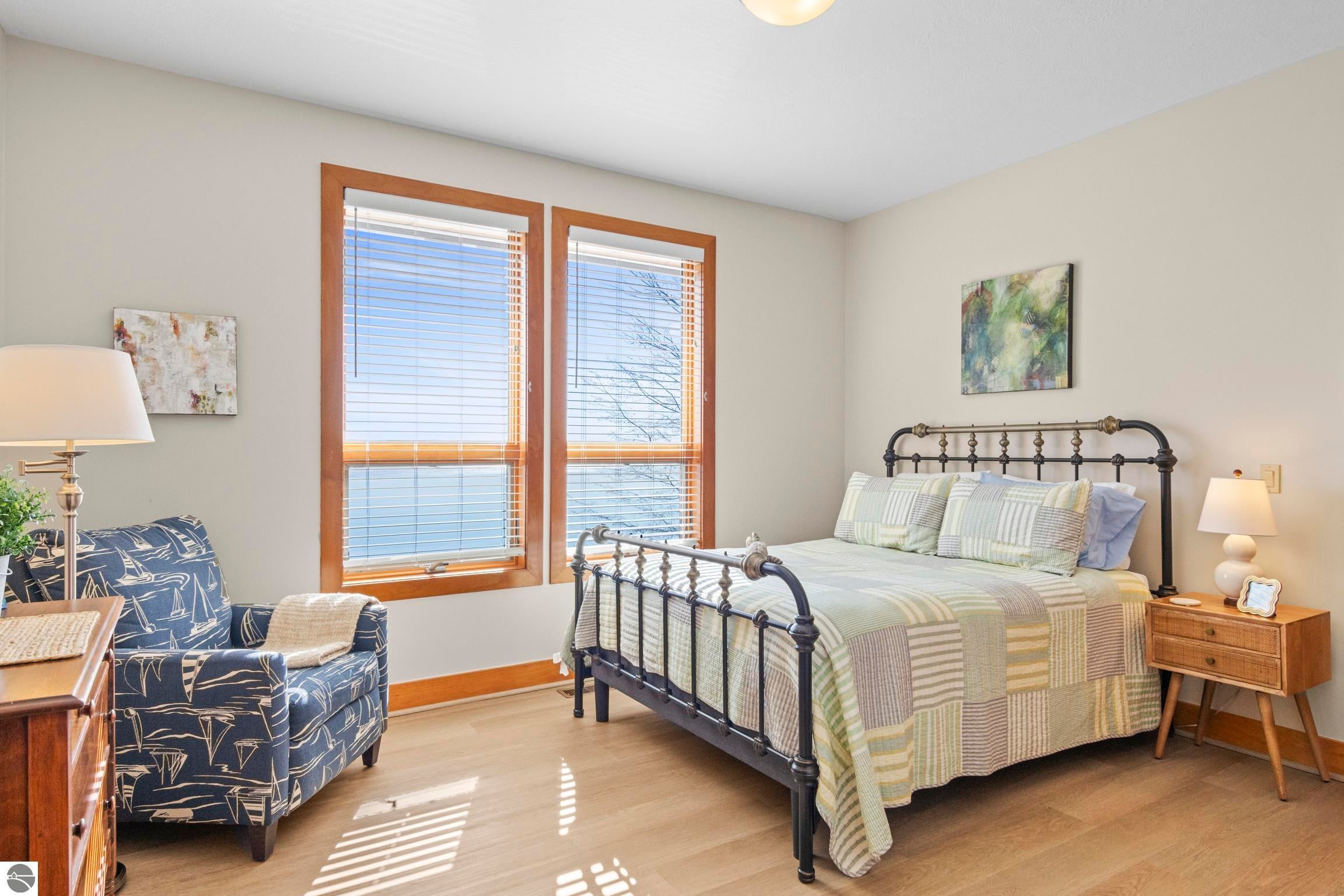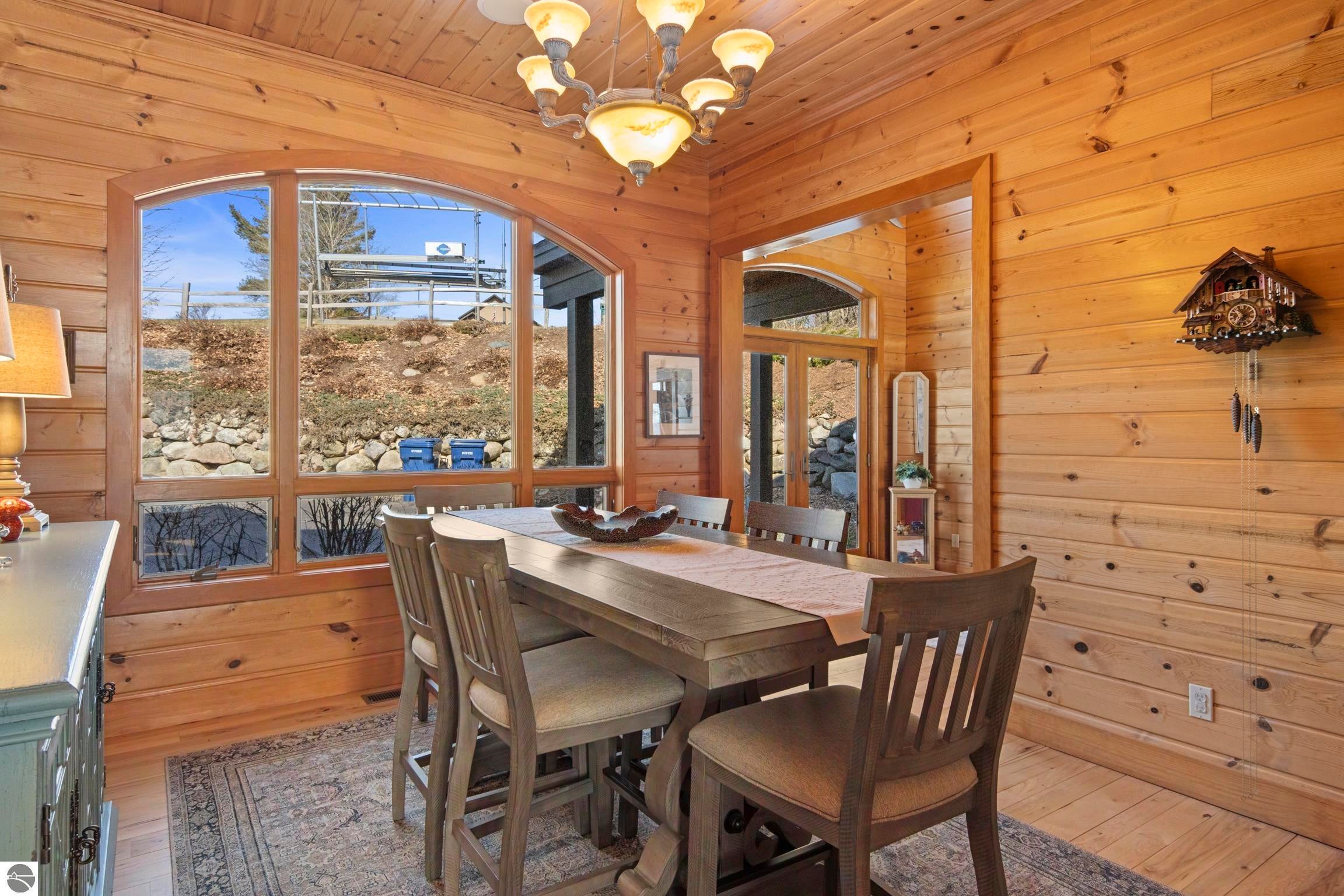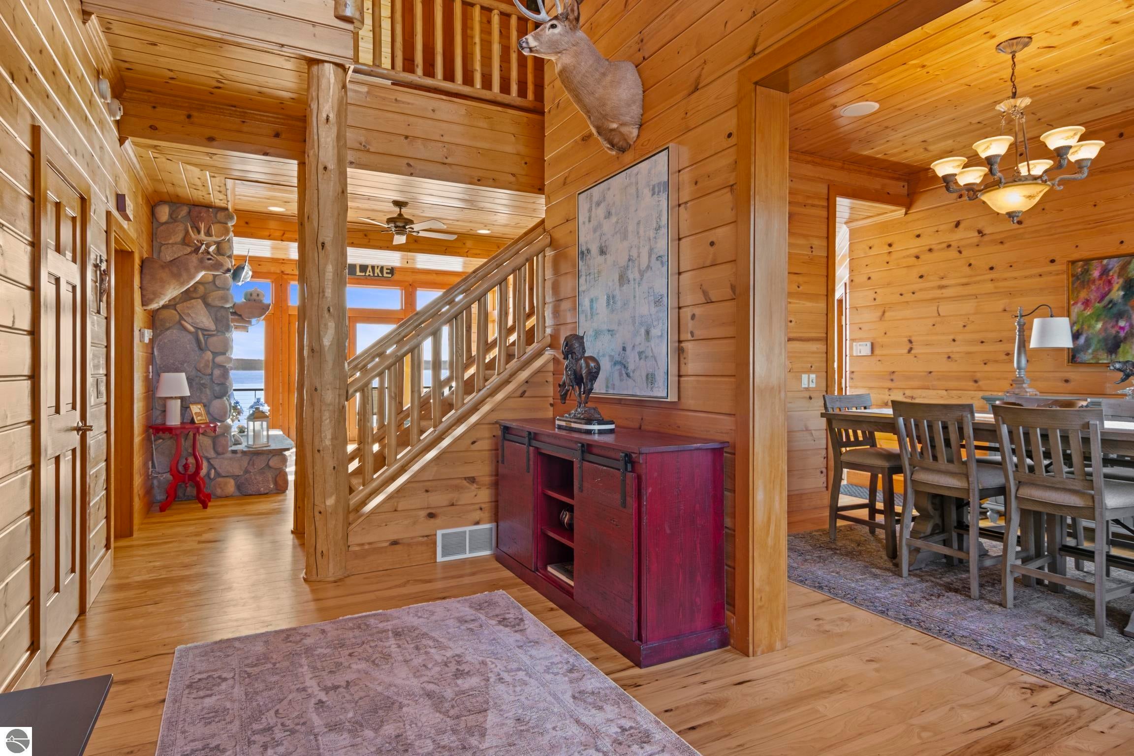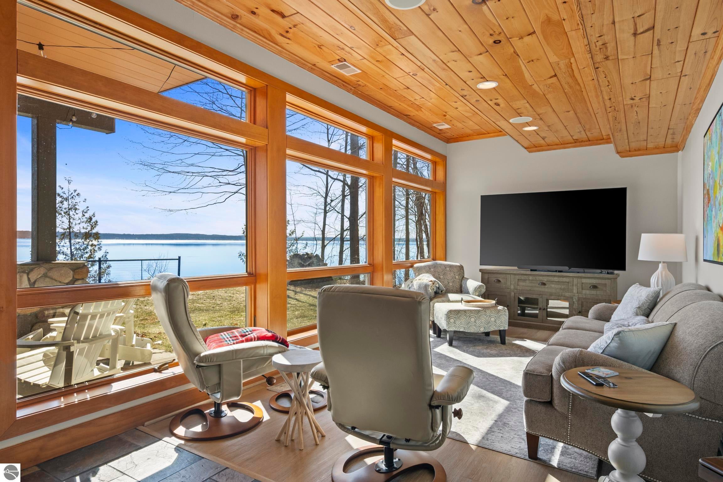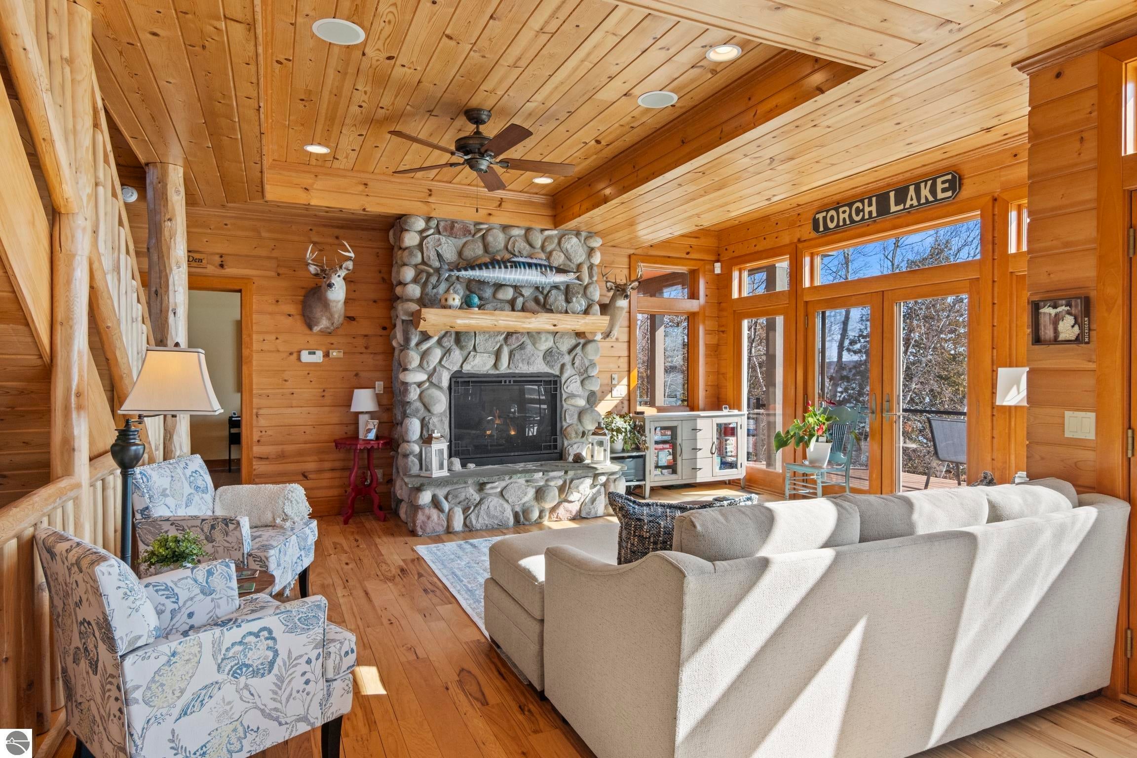 TORCH LAKE LIVING AT ITS FINEST! This the home you have been dreaming of on beautiful Torch Lakes Turtle Cove, a coveted and wind protected cove, with packed sand frontage. Imagine your kids and grandkids splashing in the clear blue waters, learning to waterski, catching the wind on their sailboat on a clear summer morning, dropping a fishing line and the thrill of the first tug on the bobber, this is lake life, where rest, relaxation and memories happen every day. This newly updated home is just waiting for you to experience the best of Northern Michigan living. As you begin your tour of this lovingly cared for home you will be impressed with the architectural details you will discover throughout. The main floor is enhanced by an open living areas with abundant glass allowing natural light and breathtaking views. Gather in front of the beautiful stone fireplace in the living room after a day spent on the water. A designer kitchen with beautifully painted cabinets; new Bosch refrigerator and dishwasher; New Thermador cooktop; bar seating and built in desk area. Serve up your culinary creations in the formal dining room. Two primary owners suites each a tranquil retreat featuring spa like bathrooms and spacious closets. The walkout lower level features a beautiful second kitchen with stone accents and large bar with seating; french doors for seamless indoor to outdoor living; family room; large bedroom suite with spacious private bath; guest bath and mechanical room. Additional amenities include 6 bedrooms, 7 baths; newly refinished hickory wood floors, pine walls and ceilings on the main floor; 6-panel doors; a large laundry room; central air conditioning; 2-car attached garage and more. Get ready to relax and immerse yourself in the stunning surroundings from the spacious deck with updated modern cable system railings and maintenance free composite decking. Entertaining will be a breeze with multiple outdoor living spaces.