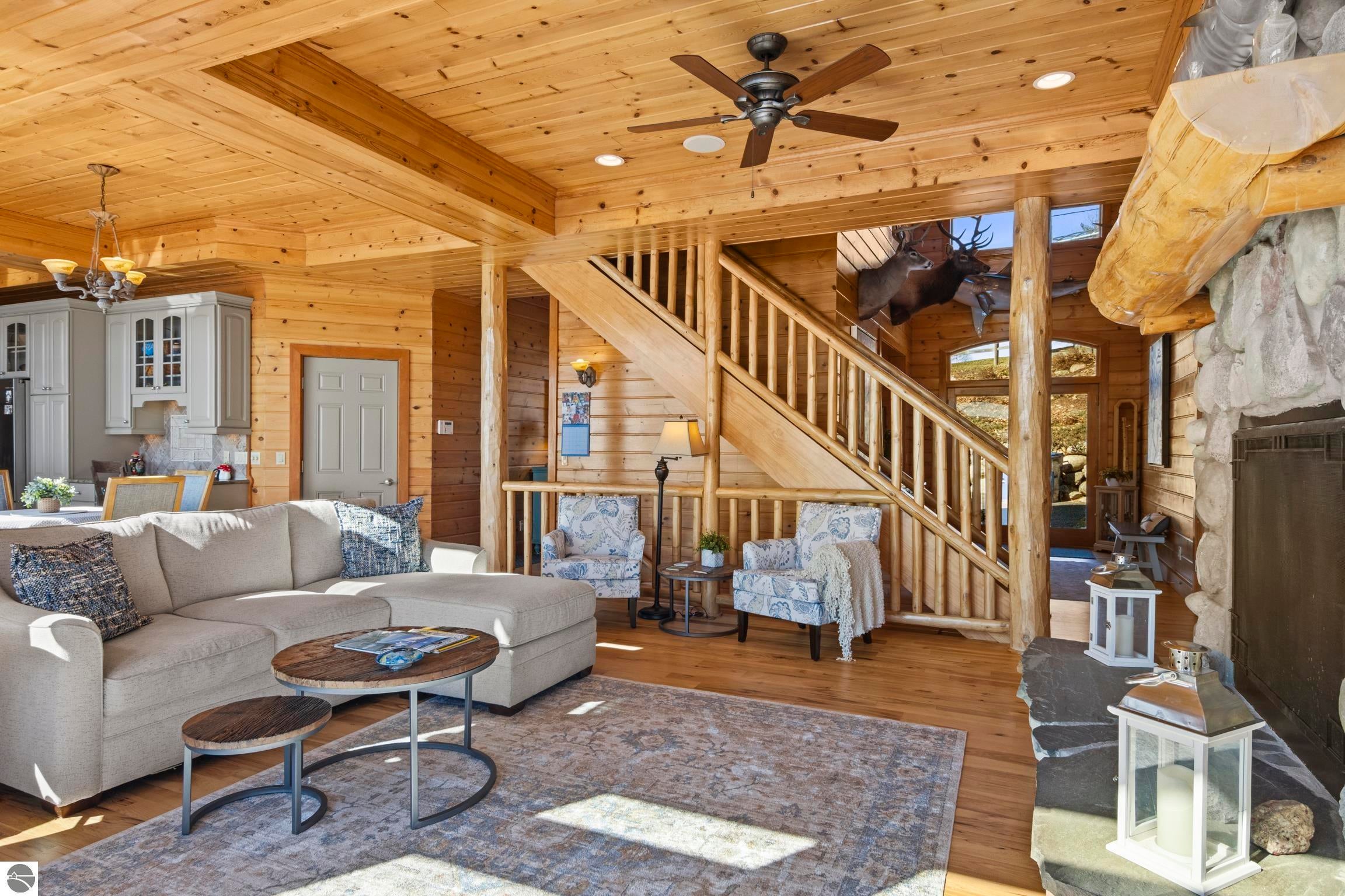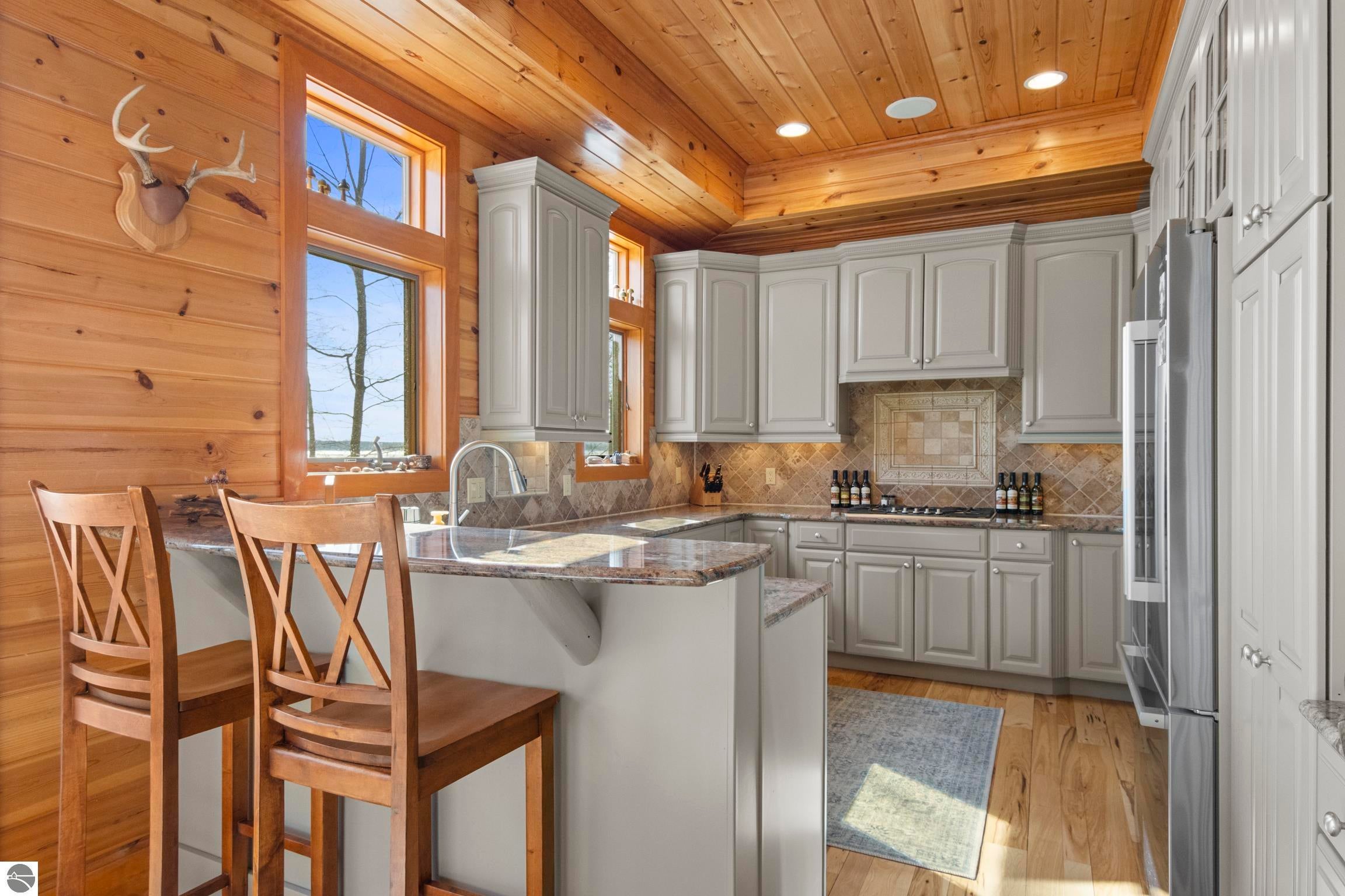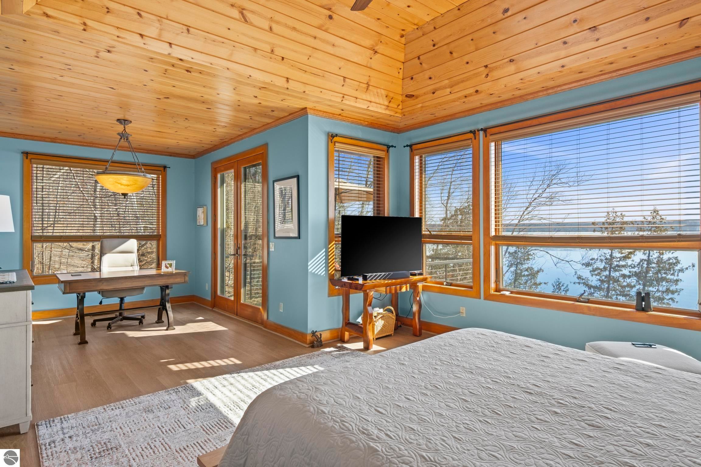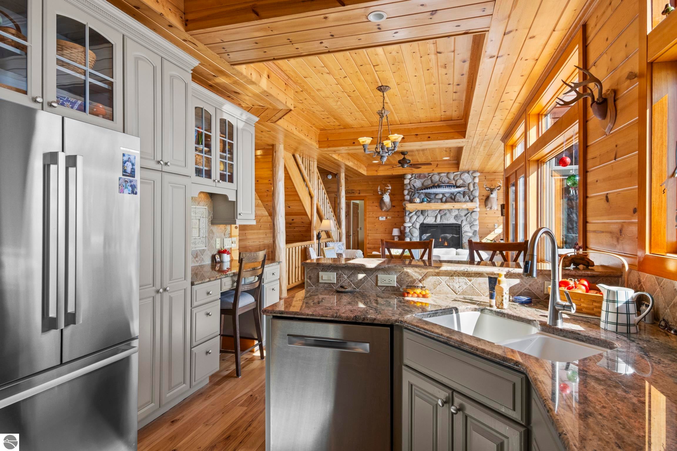 TORCH LAKE LIVING AT ITS FINEST! This the home you have been dreaming of on beautiful Torch Lakes Turtle Cove, a coveted and wind protected cove, with packed sand frontage. Imagine your kids and grandkids splashing in the clear blue waters, learning to waterski, catching the wind on their sailboat on a clear summer morning, dropping a fishing line and the thrill of the first tug on the bobber, this is lake life, where rest, relaxation and memories happen every day. This newly updated home is just waiting for you to experience the best of Northern Michigan living. As you begin your tour of this lovingly cared for home you will be impressed with the architectural details you will discover throughout. The main floor is enhanced by an open living areas with abundant glass allowing natural light and breathtaking views. Gather in front of the beautiful stone fireplace in the living room after a day spent on the water. A designer kitchen with beautifully painted cabinets; new Bosch refrigerator and dishwasher; New Thermador cooktop; bar seating and built in desk area. Serve up your culinary creations in the formal dining room. Two primary owners suites each a tranquil retreat featuring spa like bathrooms and spacious closets. The walkout lower level features a beautiful second kitchen with stone accents and large bar with seating; french doors for seamless indoor to outdoor living; family room; large bedroom suite with spacious private bath; guest bath and mechanical room. Additional amenities include 6 bedrooms, 7 baths; newly refinished hickory wood floors, pine walls and ceilings on the main floor; 6-panel doors; a large laundry room; central air conditioning; 2-car attached garage and more. Get ready to relax and immerse yourself in the stunning surroundings from the spacious deck with updated modern cable system railings and maintenance free composite decking. Entertaining will be a breeze with multiple outdoor living spaces.