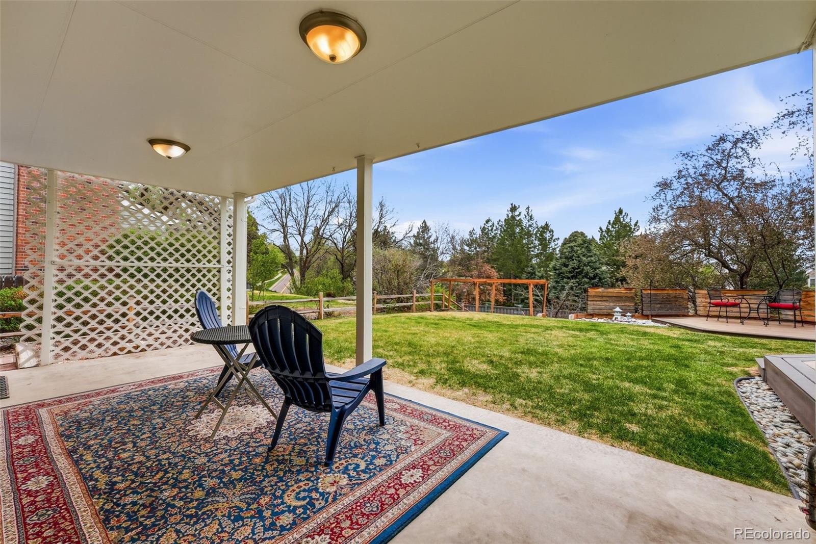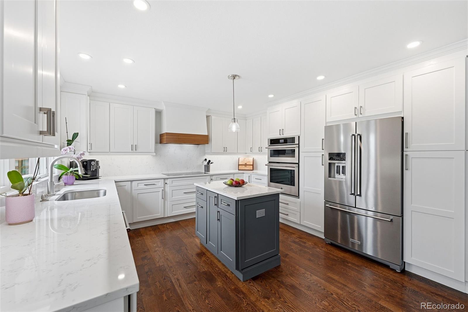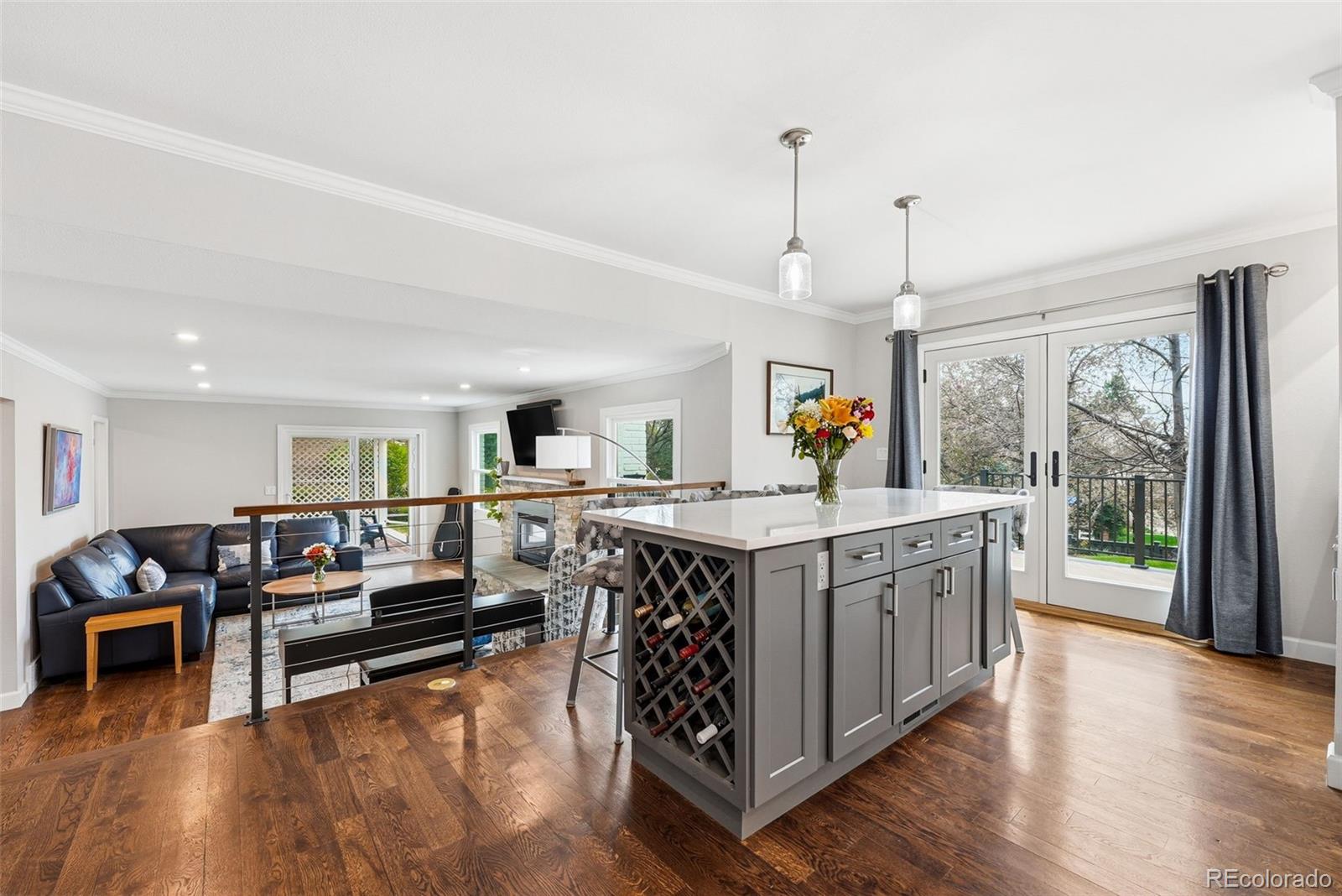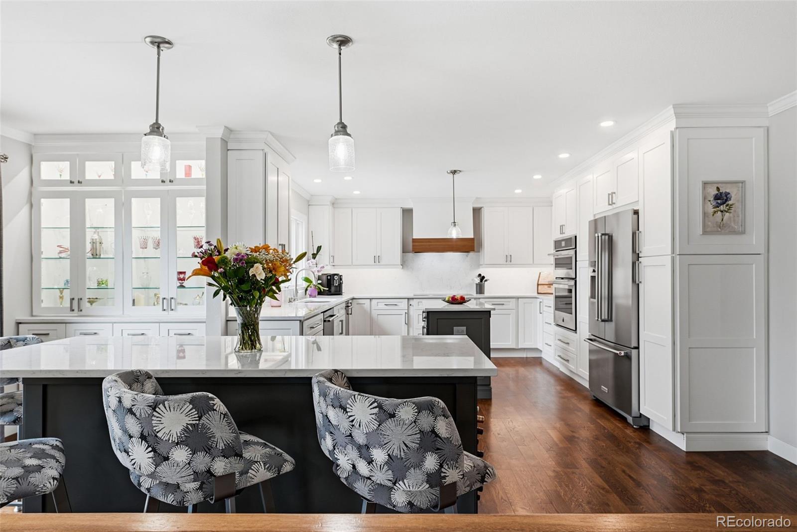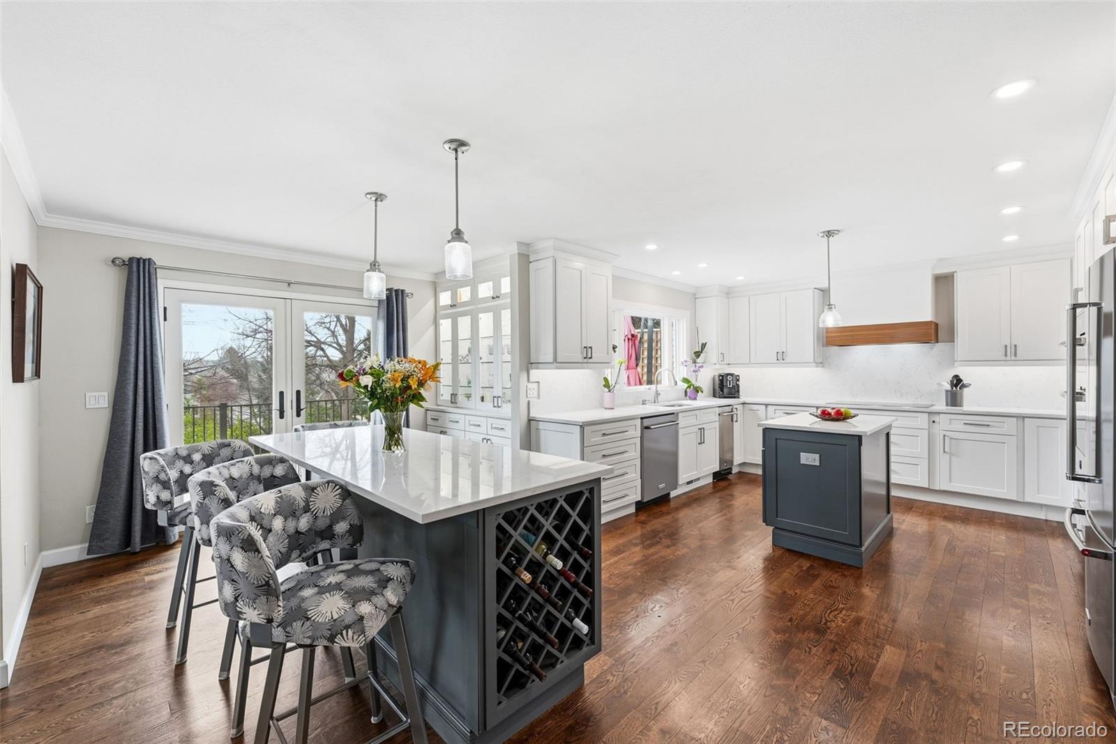 Settled on a peaceful, tree-lined street, this beautifully maintained home blends charm with thoughtful upgrades. A covered front porch opens to a bright interior featuring Andersen windows, wide-plank hardwood floors and elegant finishes throughout. Sunlight fills the open sitting and dining areas, leading to the stylish double island eat-in kitchen with stainless steel appliances, stone surfaces and views of the backyard. Glass doors open to two levels of decks overlooking a private, terraced backyard with mature trees, fountain, a south-facing garden and a patio with covered seating. Just below the kitchen, a cozy living room offers a gas fireplace and direct outdoor access. This level also includes a laundry room, large home office with custom built-ins, a powder room and access to the oversized 2-car garage. Upstairs, the freshly remodeled primary suite features a luxurious ensuite bath with a frameless glass-enclosed shower, dual vanity and linen storage plus walk-in closet. Three additional bedrooms and a full bath with a private water closet and laundry chute complete the upper level. The garden-level basement adds extra living space with a bright family room, bath and ample storage. Most recent upgrades: Primary suite (2026), furnace & A/C (2025), main floor office (2025), radon mitigation (2025), water heater (2024). Located in the award-winning Cherry Creek School District, with fantastic HOA amenities including pools, tennis courts, playgrounds, green belts and community events plus easy access to shopping, dining, south-suburban bike trails, I-25, E-470, Downtown Denver, DIA and the Rocky Mountains.