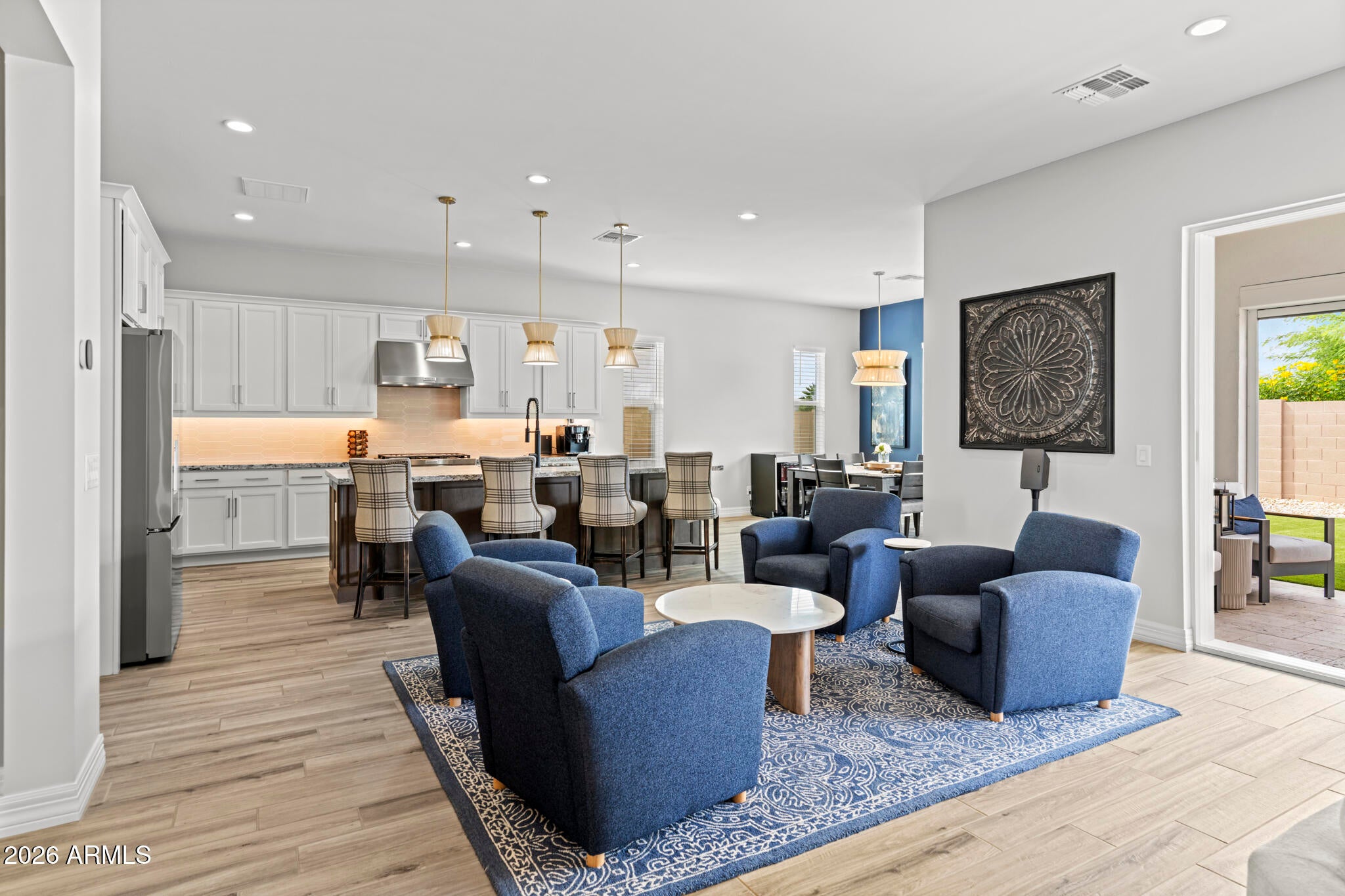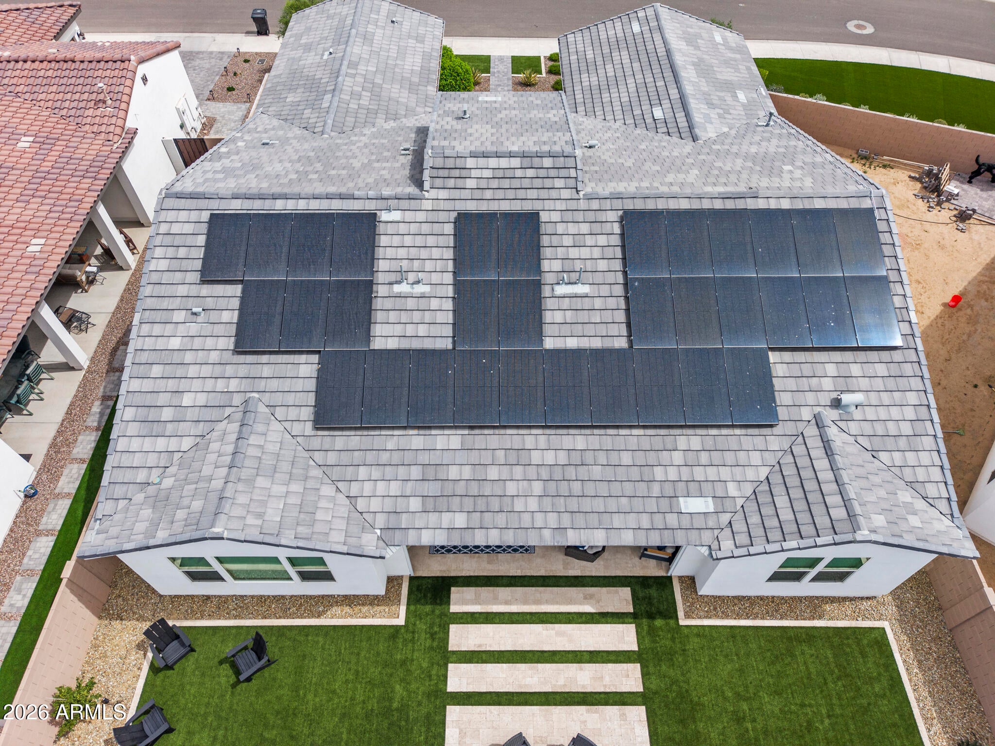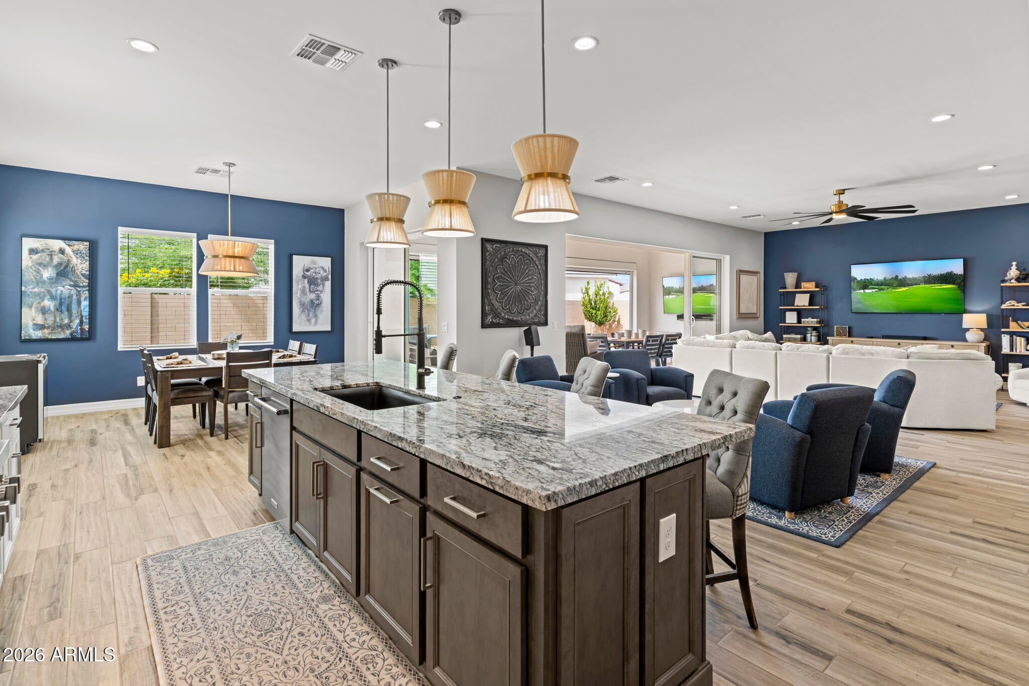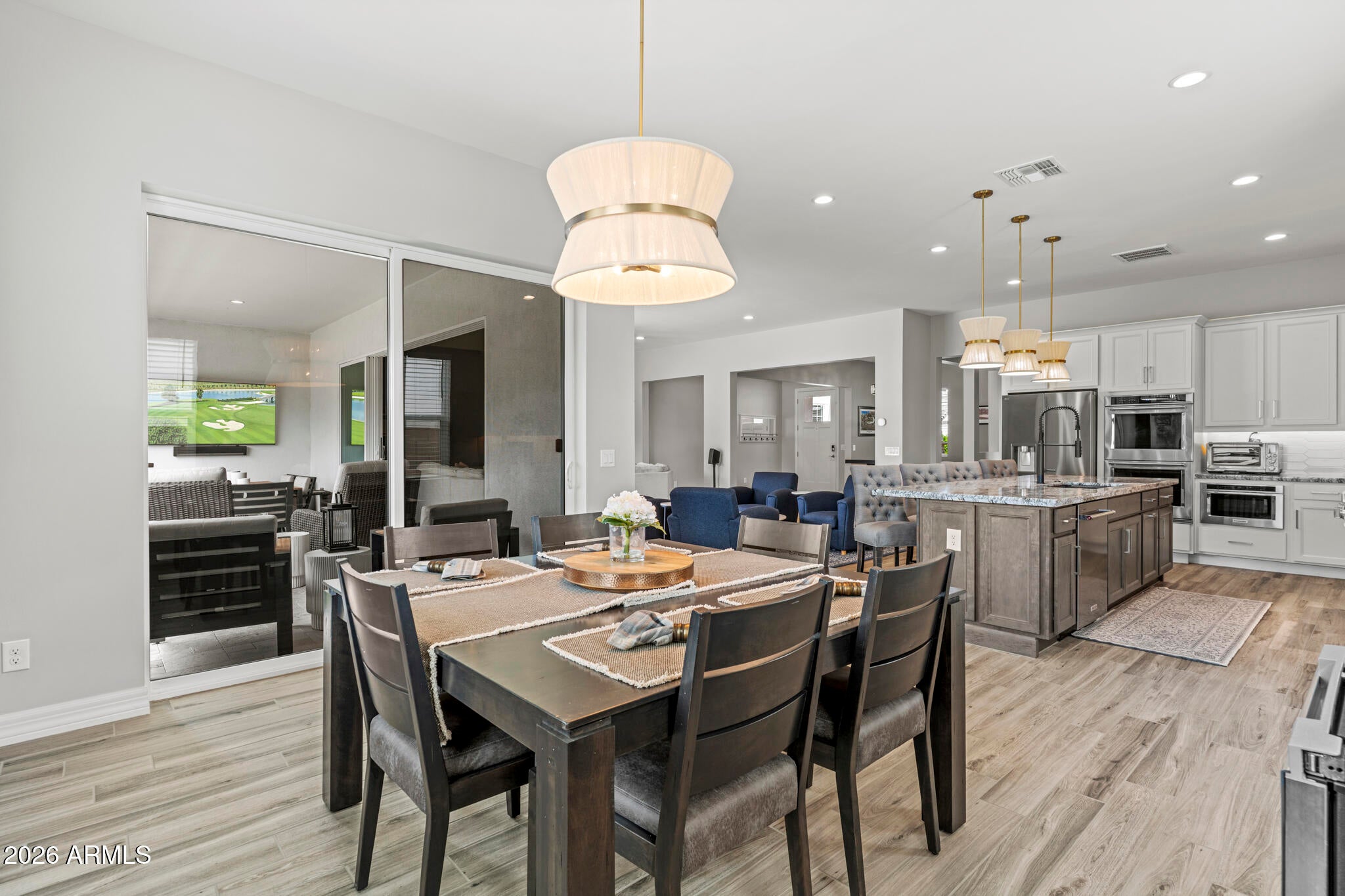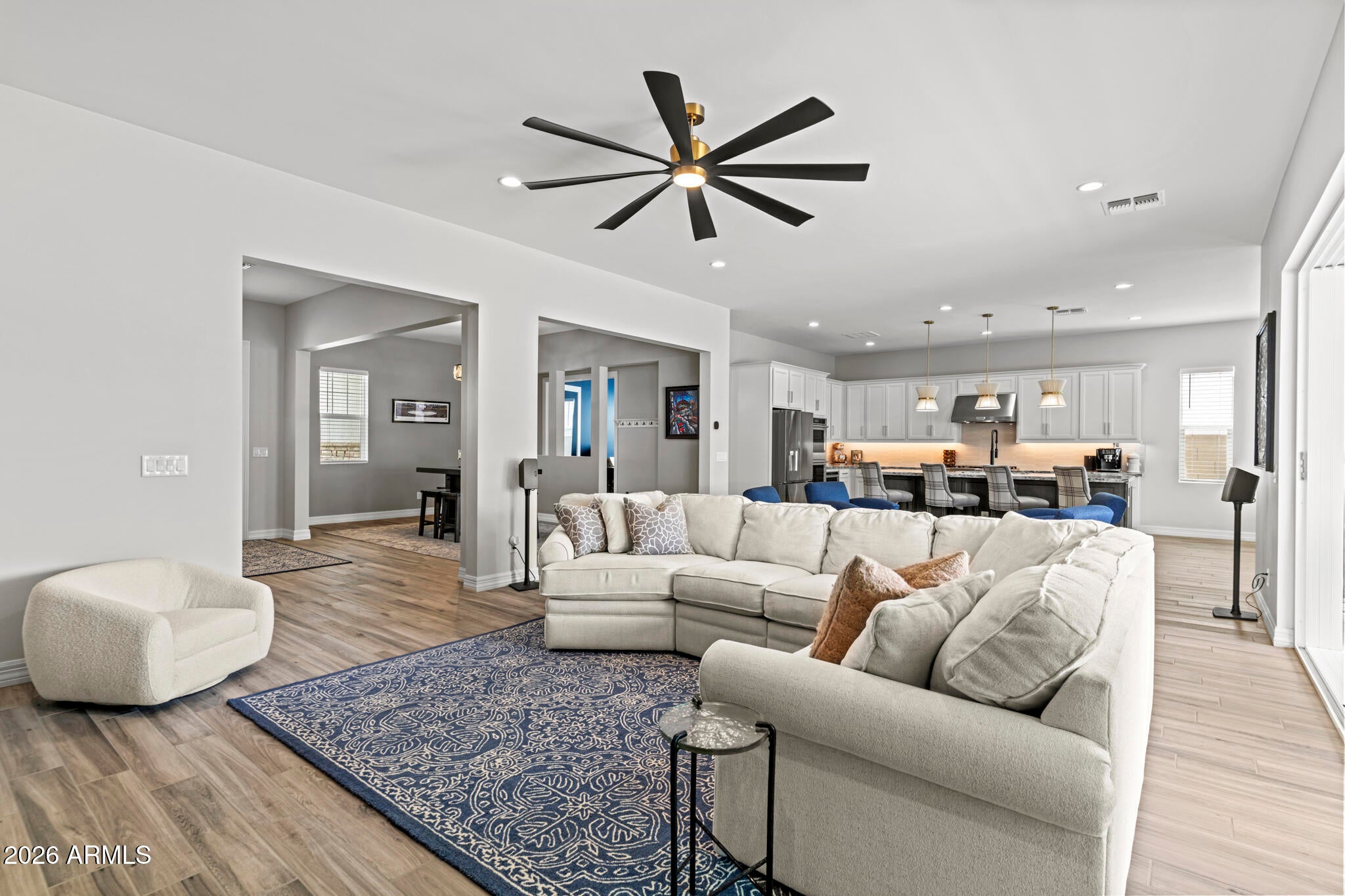 Solar! Dedicated office! Extra garage storage air conditioned garage. Electronic screened patio. And... WHAT A GREAT ROOM! Conveniently located a stones throw from the entrance/exit gate, this Sterling Grove home is impressively upgraded, and a beautifully landscaped ...on an oversized premium lot. The kitchen is designed with upgraded cabinets and luxurious quartz countertops.