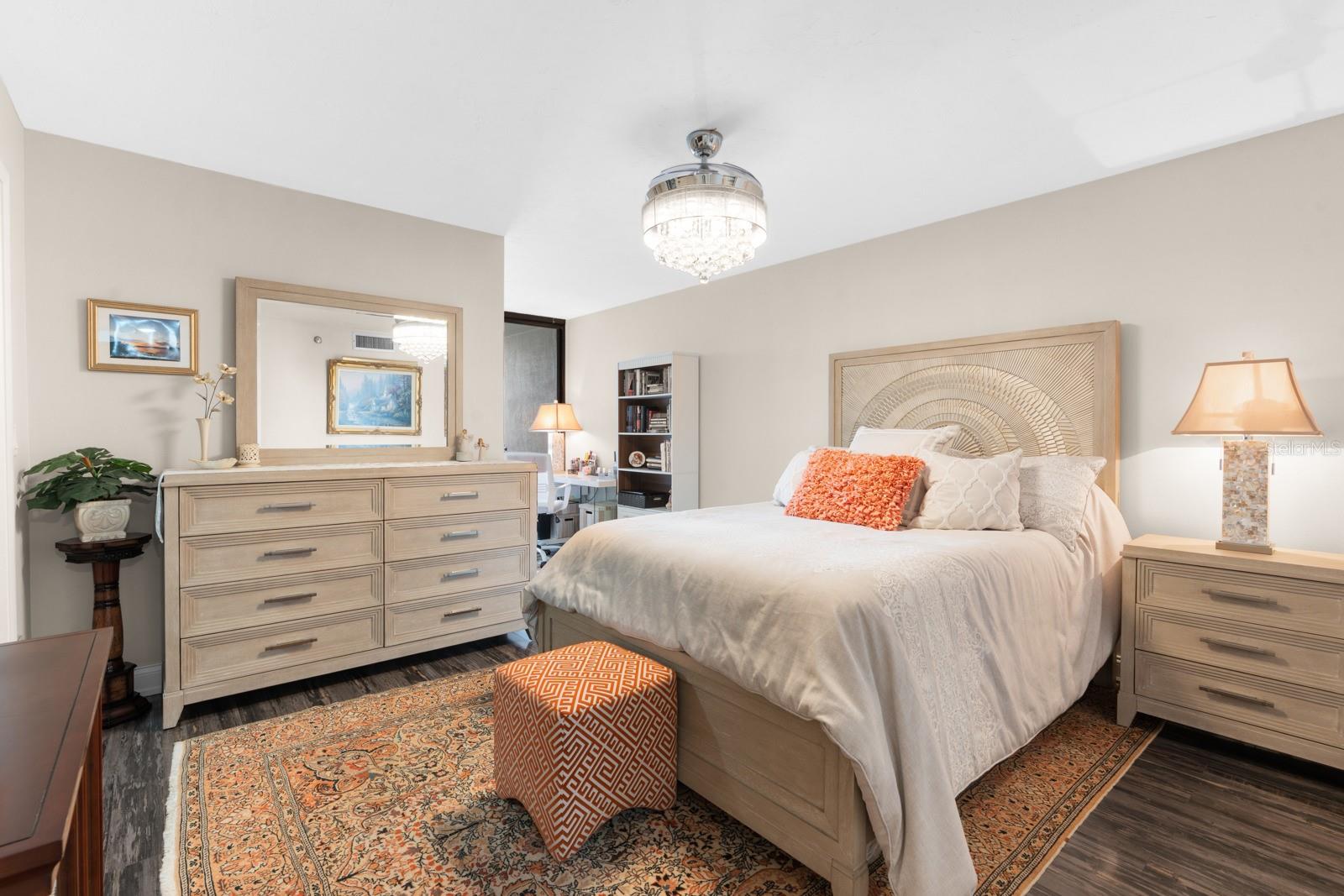 Introducing a residence within Dans Island, a private gated beachfront community located on the pristine sands of Sand Key. This well-appointed 2-bedroom, 2-bath condominium offers approximately 1,880 square feet of interior living space, thoughtfully designed with a contemporary aesthetic, abundant natural light, private storage closet and expansive terraces capturing sweeping Intercoastal views.The open floor plan provides a seamless connection between the main living and dining areas, ideal for both everyday living and entertaining. Large sliding glass doors extend the living space outdoors to an oversized terrace, offering unobstructed water views. The updated kitchen is centrally positioned and features granite countertops, custom cabinetry, a modern backsplash, and a GE Caf appliance suite.A split-bedroom layout enhances privacy, with both bedrooms offering direct access to the terrace. The primary suite includes a spacious en-suite bath with stone surfaces, a walk-in glass shower, soaking tub, bidet, and tile finishes throughout. Additional features include a contemporary fireplace, custom lighting, crown molding, textured ceilings, a full utility room, and ample storage.Recent improvements include a new HVAC system (2026) and water heater (2023). The condominium association is scheduled to complete a new roof by May 2026.Residents of Dans Island enjoy a variety of amenities, including a Gulf-front heated pool and hot tub, sun deck, grilling area, and clubhouse with fitness center, racquetball and basketball courts, sauna, kitchen and billiards room. Boat slips may be available for purchase or lease, subject to availability. Conveniently located near shopping, dining, and local attractions, this property offers a comfortable coastal lifestyle in a well-maintained community and gorgeous landscaping perfect for a tropical escape!