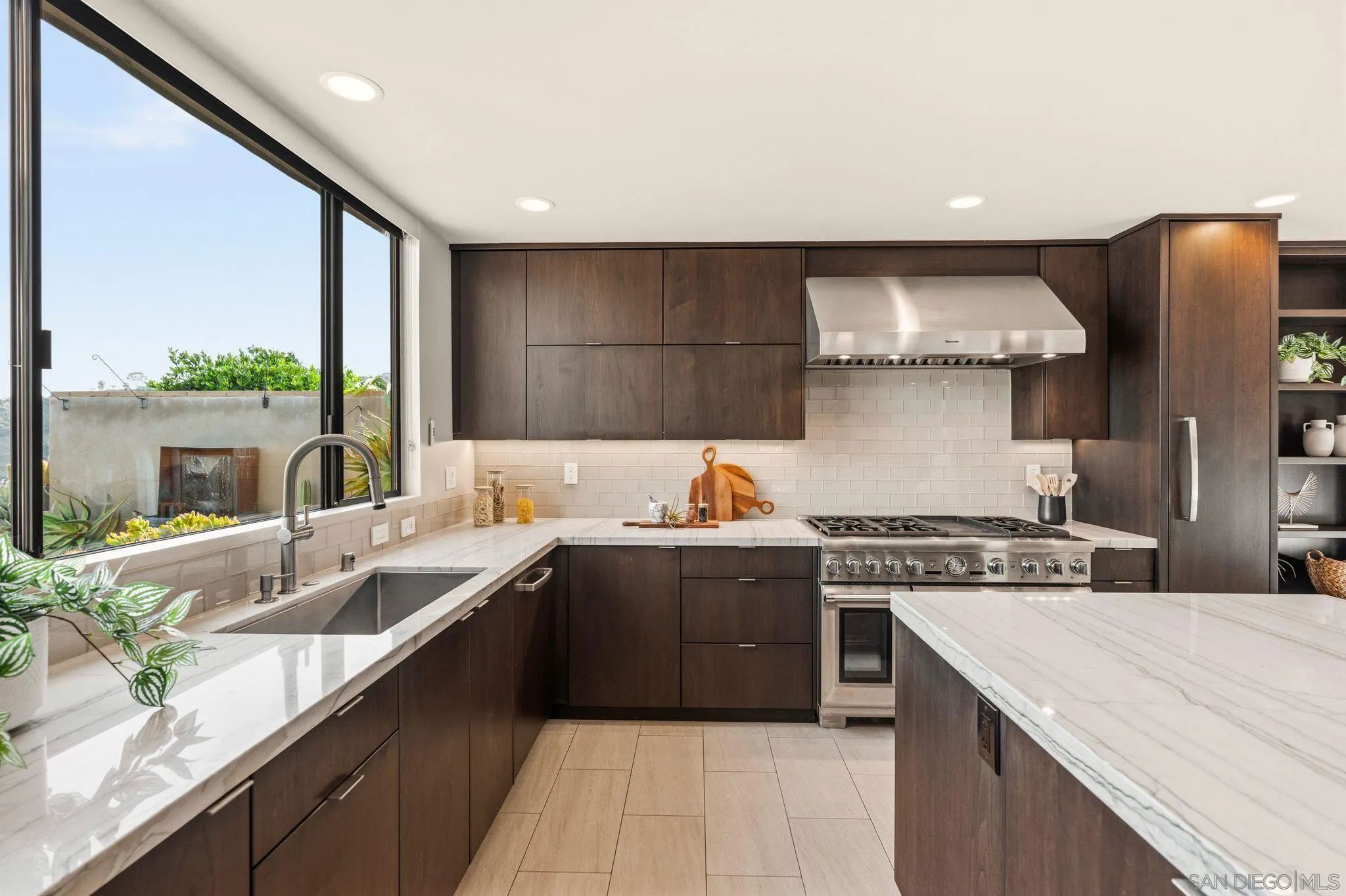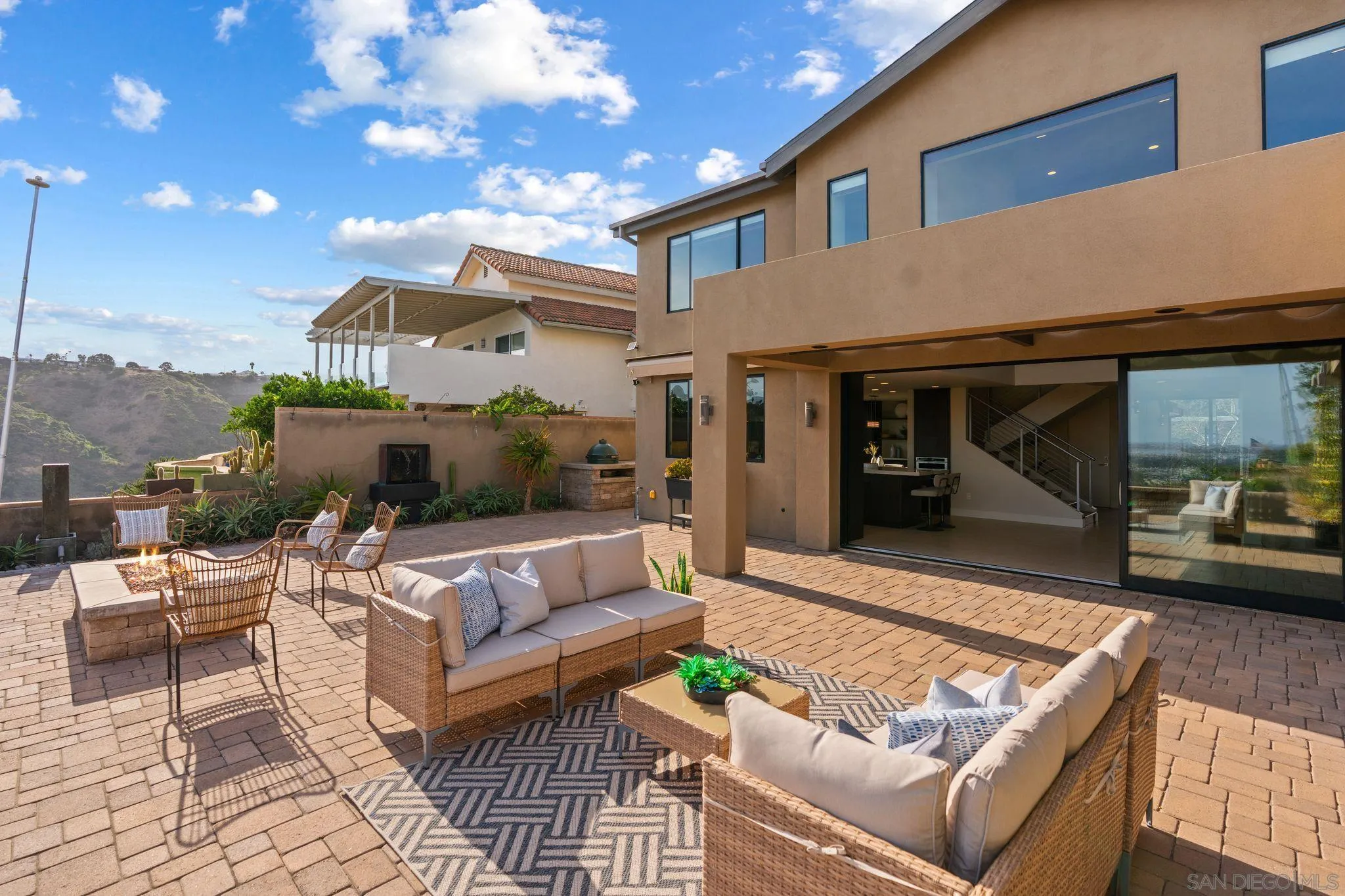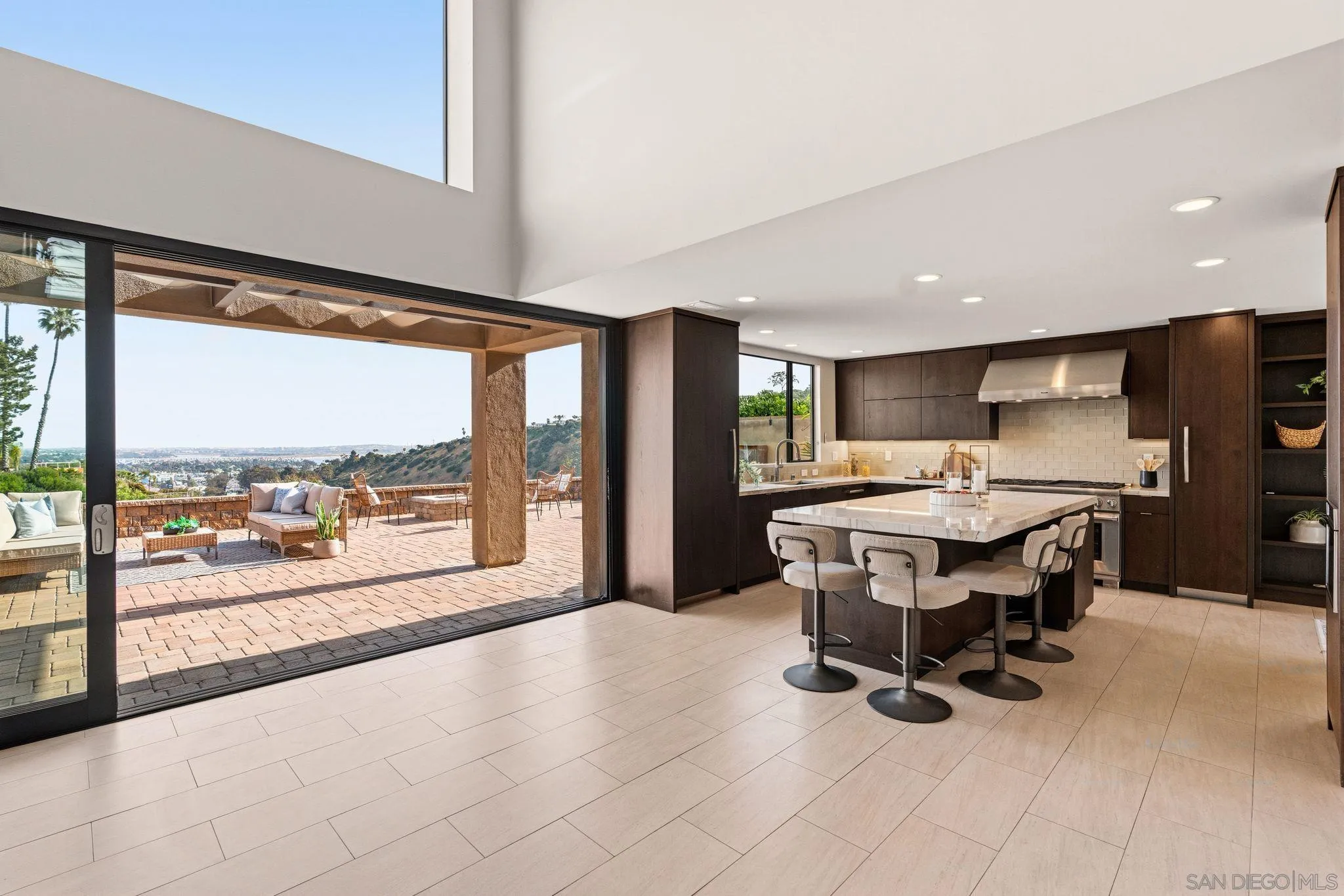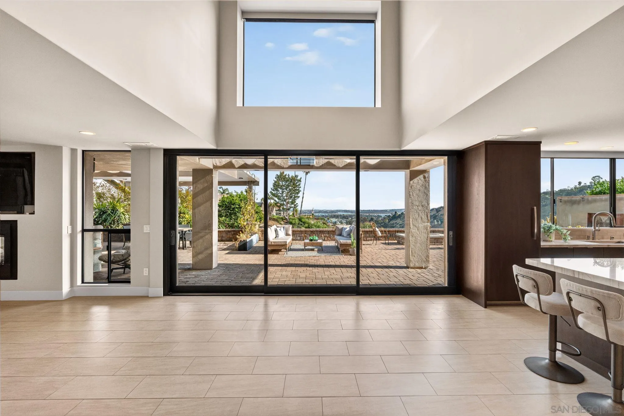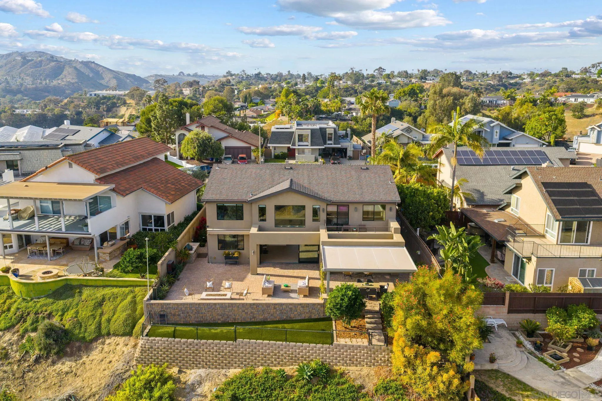 This exceptional contemporary home offers much more than just its impressive views, it truly feels like you are living at a resort.Completely remodeled from the foundation up in 2014, every detail of this permitted renovation blends high-end finishings with a tranquil sophisticated design.Curb appeal begins by walking through an inviting fenced courtyard leading to a welcoming Western Glass Pivot front entry door and sleek frosted glass garage doors.The exterior is engineered for low-maintenance luxury, featuring custom pavers, a dedicated 35 RV parking space with full hookups, & a sustainable landscape including a butterfly garden & a mini-orchard of Passion Fruit, Dragon Fruit, and citrus trees.Gourmet kitchen with custom Walnut-stained cabinetry with natural quartz slabs,& oversized island. The professional-grade Thermador appliances include a 6-burner gas range with a flat griddle, plus a separate refrigerator and freezer.Enjoy the seamless indoor/outdoor living with panoramic multi-slide glass doors, leading out to the spacious covered patio with the indoor/outdoor fire area a perfect place to watch the Seaworld fireworks. The additional gas fire pit and built-in Big Green Egg BBQ/smoker make entertaining effortless. Sonos sound system downstairs and in the backyard.The backyard is pet friendly with a large designated dog run. Ample storage throughout with custom closet organizers and huge easily accessible walk-in storage room. Primary suite offers vaulted ceilings, soaking tub, impressive walk-in closet , private balcony & an attached multi functional room.