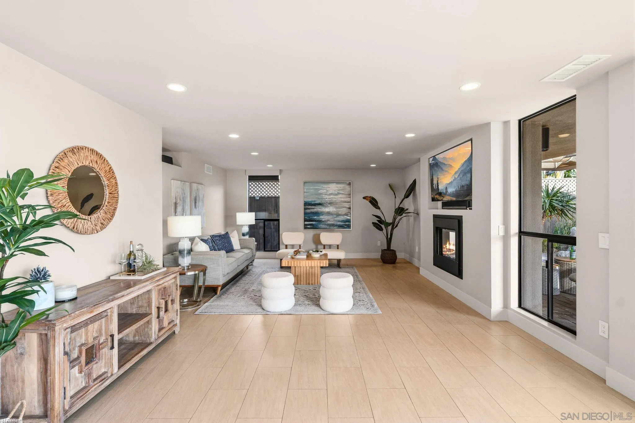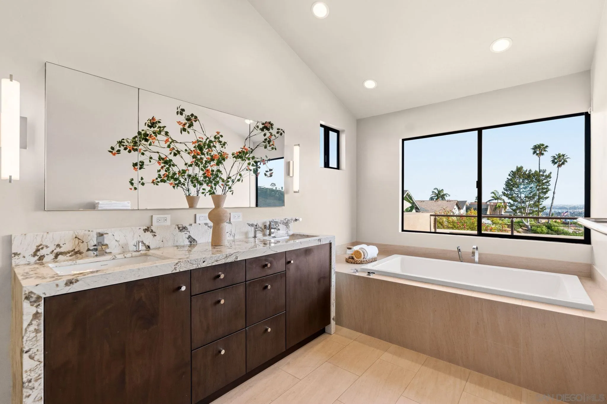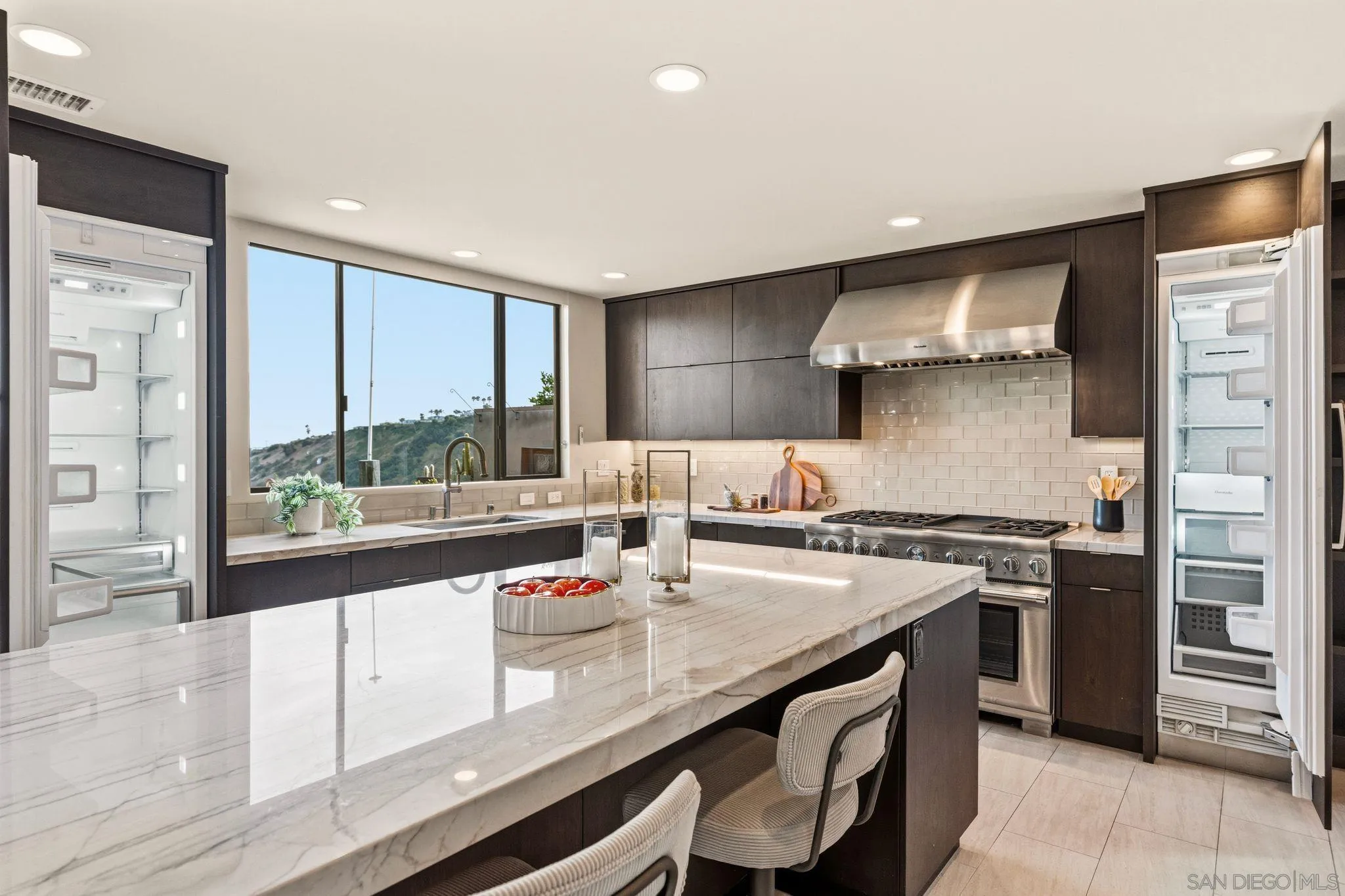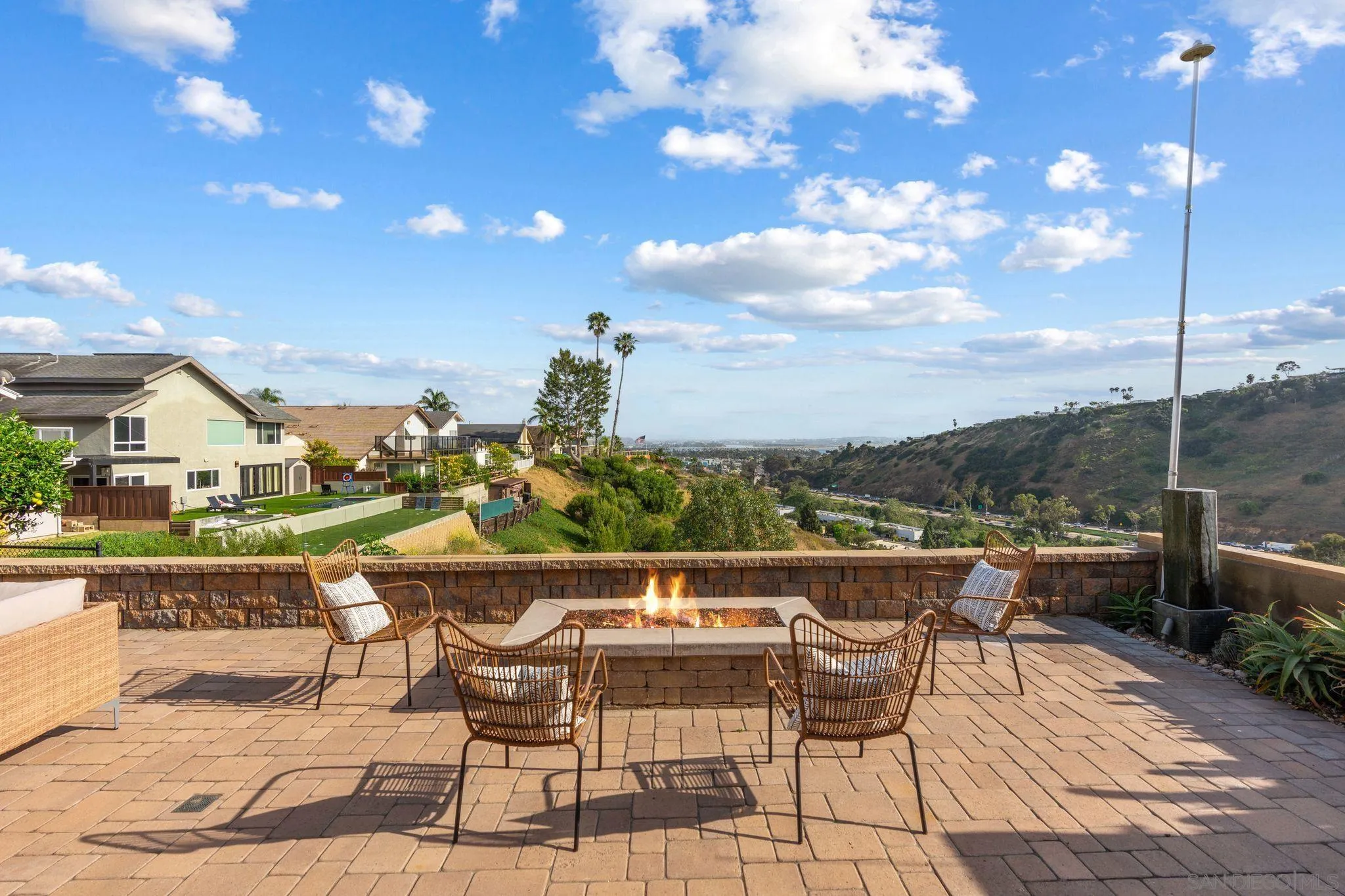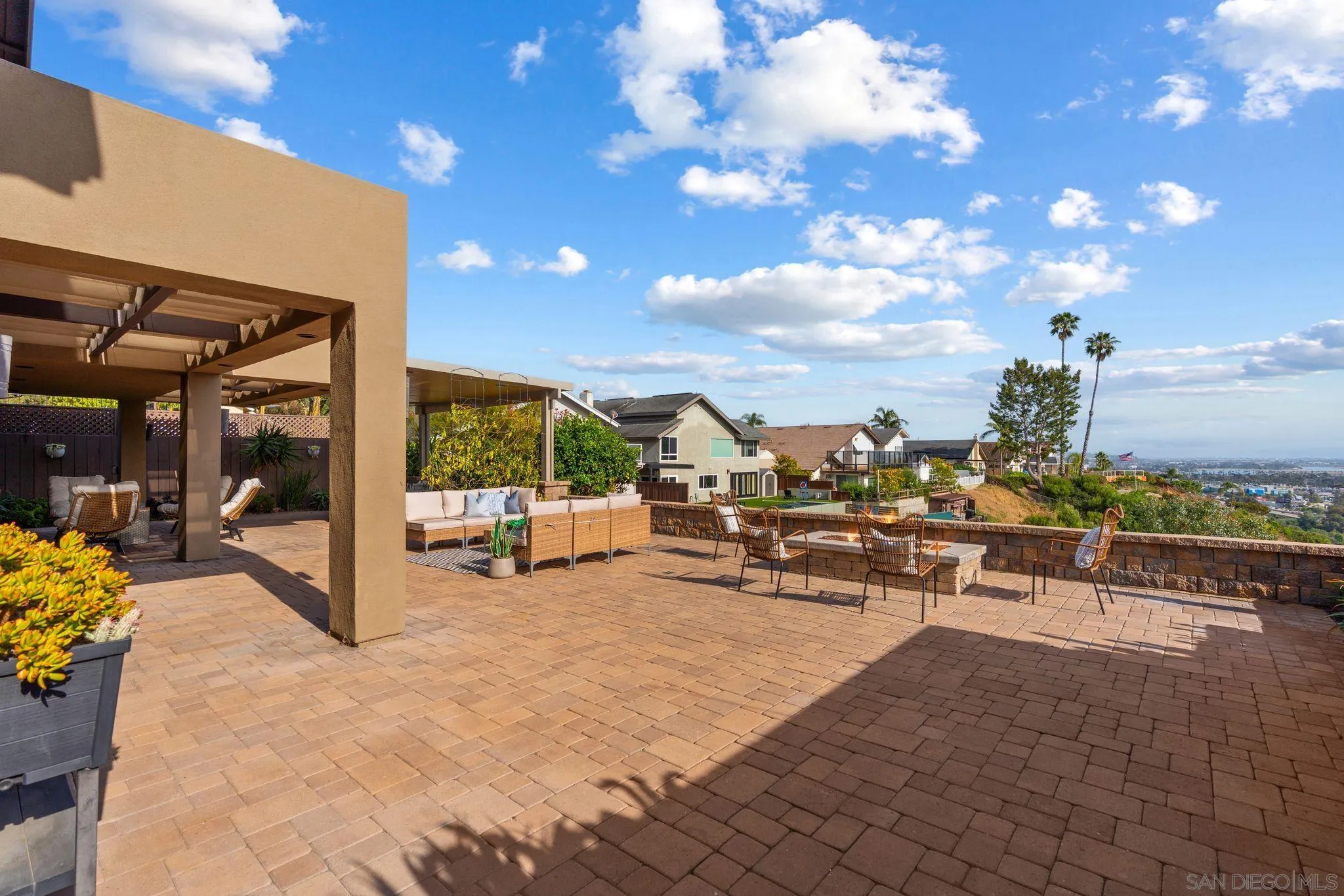 This exceptional contemporary home offers much more than just its impressive views, it truly feels like you are living at a resort.Completely remodeled from the foundation up in 2014, every detail of this permitted renovation blends high-end finishings with a tranquil sophisticated design.Curb appeal begins by walking through an inviting fenced courtyard leading to a welcoming Western Glass Pivot front entry door and sleek frosted glass garage doors.The exterior is engineered for low-maintenance luxury, featuring custom pavers, a dedicated 35 RV parking space with full hookups, & a sustainable landscape including a butterfly garden & a mini-orchard of Passion Fruit, Dragon Fruit, and citrus trees.Gourmet kitchen with custom Walnut-stained cabinetry with natural quartz slabs,& oversized island. The professional-grade Thermador appliances include a 6-burner gas range with a flat griddle, plus a separate refrigerator and freezer.Enjoy the seamless indoor/outdoor living with panoramic multi-slide glass doors, leading out to the spacious covered patio with the indoor/outdoor fire area a perfect place to watch the Seaworld fireworks. The additional gas fire pit and built-in Big Green Egg BBQ/smoker make entertaining effortless. Sonos sound system downstairs and in the backyard.The backyard is pet friendly with a large designated dog run. Ample storage throughout with custom closet organizers and huge easily accessible walk-in storage room. Primary suite offers vaulted ceilings, soaking tub, impressive walk-in closet , private balcony & an attached multi functional room.