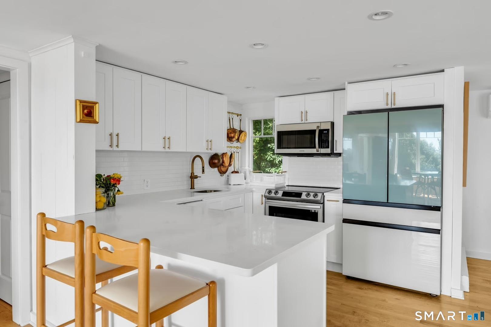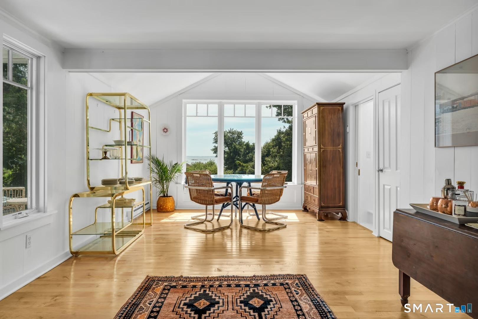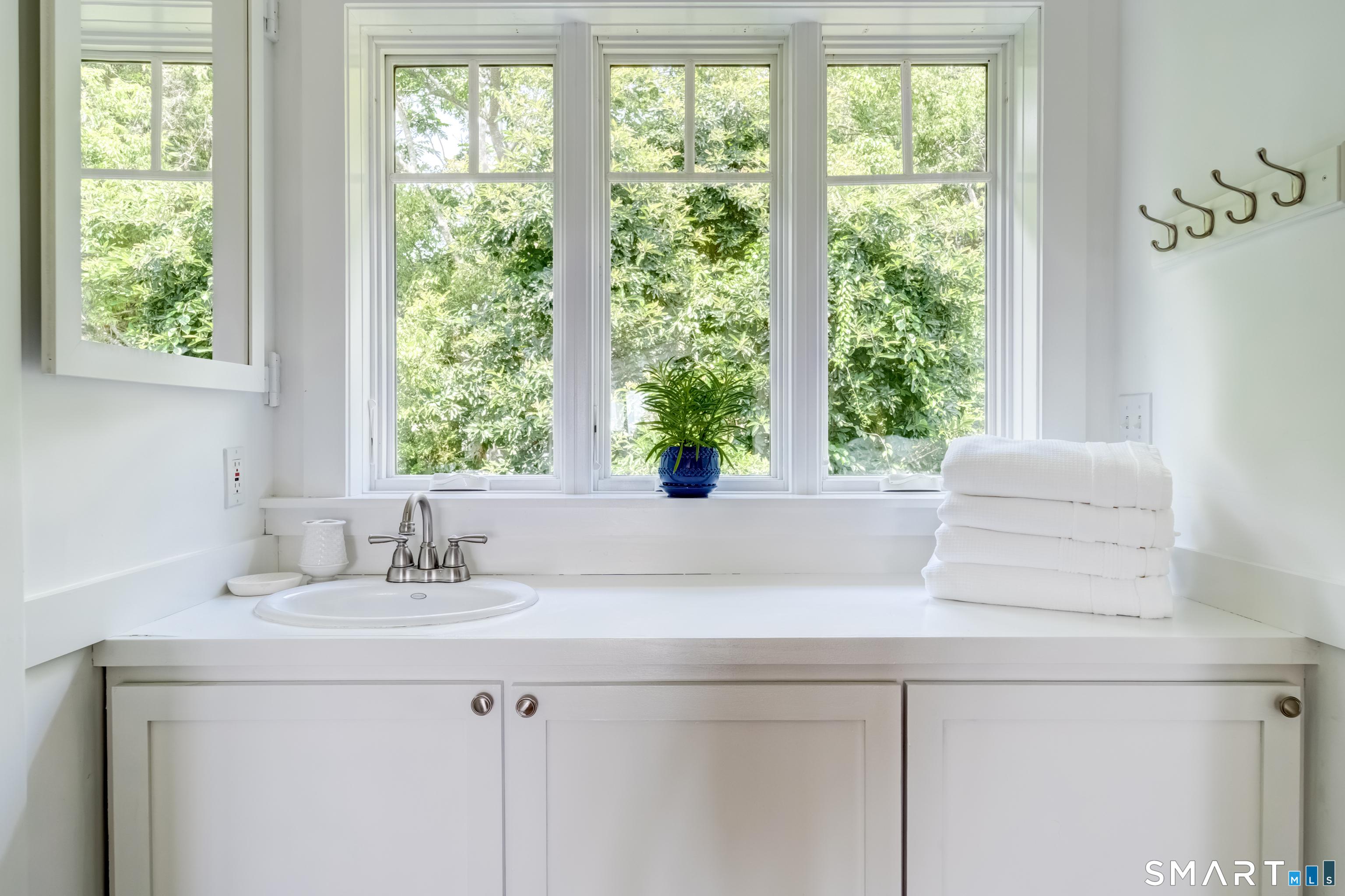 Tucked away at the end of private Cedar Grove Road in the serene enclave of Tuttles Point, this charming cedar shake classic cottage offers the kind of lifestyle most people only dream about. Perched high above the floodplain on a lush 1/3-acre lot, 59 Cedar Grove Road enjoys spectacular, million-dollar views of Long Island Sound, surrounded by mature perennial plantings in a secret garden setting. The homes three bedrooms and two full baths are thoughtfully arranged across approximately 1,500 square feet of warm, welcoming living space - plenty of room to relax, entertain, and truly settle in. Two bedrooms are located on the first floor, as well as a primary bath with a walk-in shower. The loft-like second floor suite, with sweeping views of the Sound, includes a large sitting area, full bath with tub and laundry room. The kitchen and baths were fully renovated in 2023, and new hardwood maple floors were installed throughout. An outdoor shower with cedar enclosure was added in 2024. In addition to all this, a detached garage and heated, renovated studio round out the property - perfect for a writers study, playroom, or home office. Every major mechanical system has been updated, including ductless AC, a tankless water heater, gas fireplace-ready, Generac generator, casement windows, and a newer roof - move right in with complete peace of mind. This turn key house checks all the boxes: private beach rights, low taxes, stunning views all waiting for you!