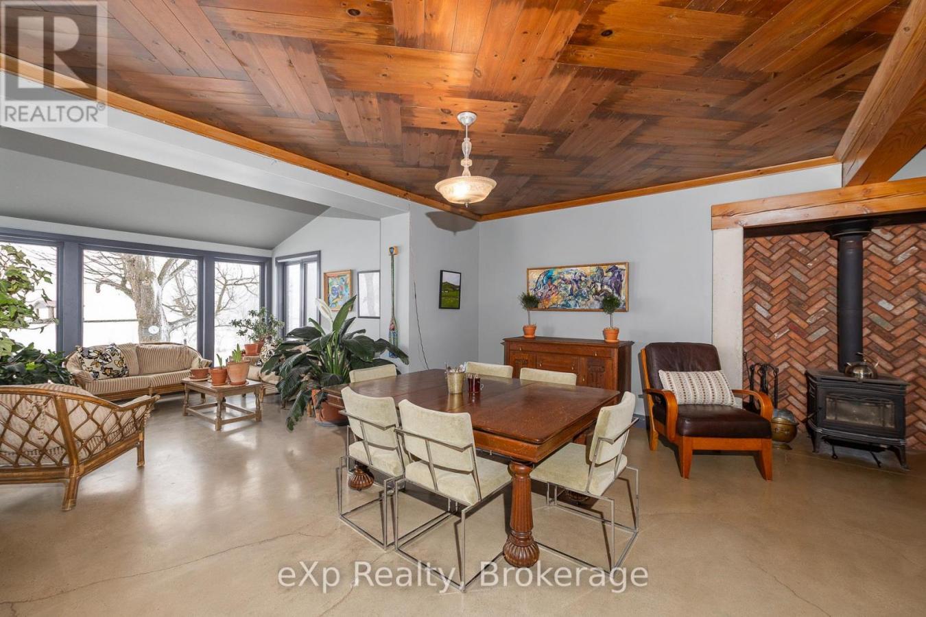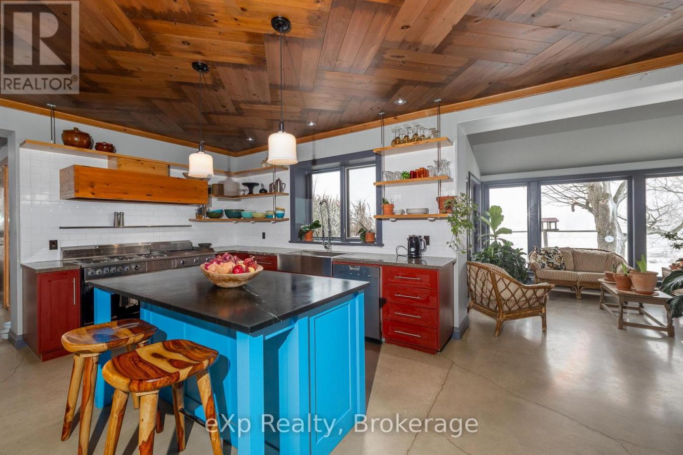 Step inside this meticulously crafted home on 150 acres, centrally located between Meaford, Grey Highlands, and The Blue Mountains. The interior blends rich textures and thoughtful design, preserving history with custom wood features made from the original farmhouse. A brick-backed fireplace with a classic black wood stove anchors the spacious great room, while the chefs kitchen features bold red cabinetry, a bright blue island, open shelving, a farmhouse sink, and a high-performance professional-style electric range with a smooth cooktop, multiple burners, and double ovens. Heated polished concrete floors flow through the living, kitchen, dining, and four-season sunroom, which opens to a private deck perfect for outdoor dining. The primary bedroom is a private retreat with double walk-in closets, access to the covered balcony, and a walk-through to an extra-large office and family room with a second balcony. Three additional bedrooms and one and a half baths provide space for family and guests. An oversized mud/laundry room with built-in storage, a large tile shower, and direct access to the two-car garage. Outside, the home blends historic character with modern style, featuring weathered wood siding on the original home paired with a clean-lined contemporary addition. The land includes two large hardwood stands, about 100 acres of open land, much in hay and suitable for cash cropping, with the balance in pasture, naturally drained soil, and excellent fencing on the front 50 acres. The Rocklyn Creek adds more beauty in all seasons as it meanders through the property. A fully insulated, in-floor heated 32x64 shop with 10 kW solar; a 42x92 Coverall barn (2014) with heated tack and feed rooms, ten 12x12 stalls, oversized aisles, and ample storage; plus a 4-year-old 74x144 riding arena make this property ideal for agricultural or equestrian pursuits. (id:58753)