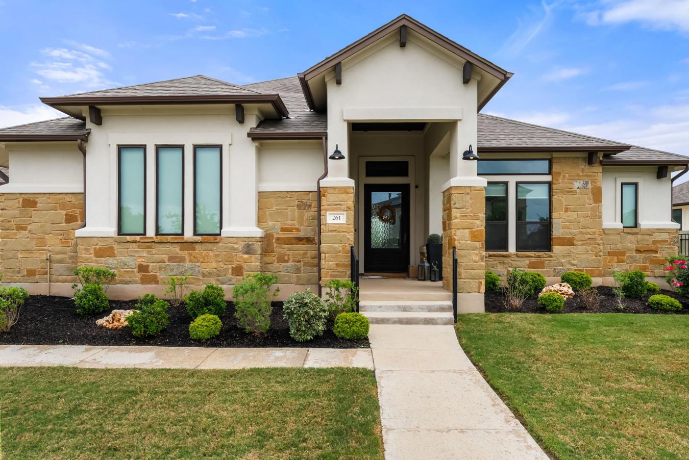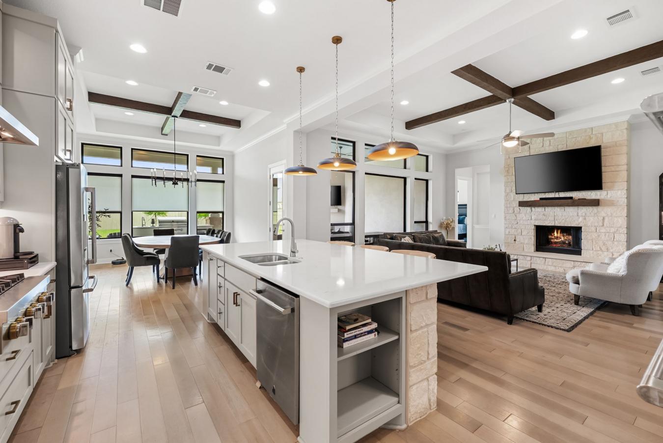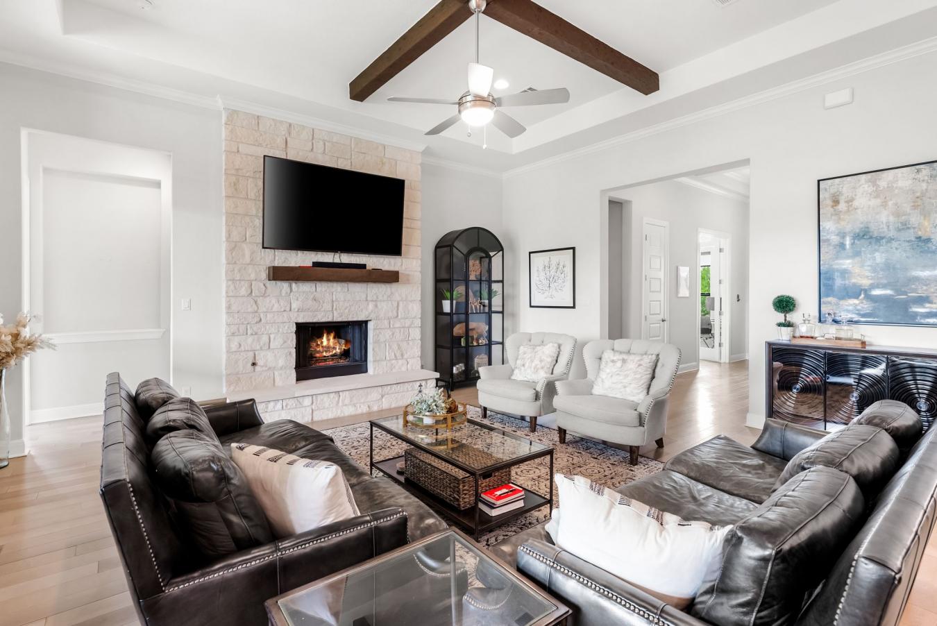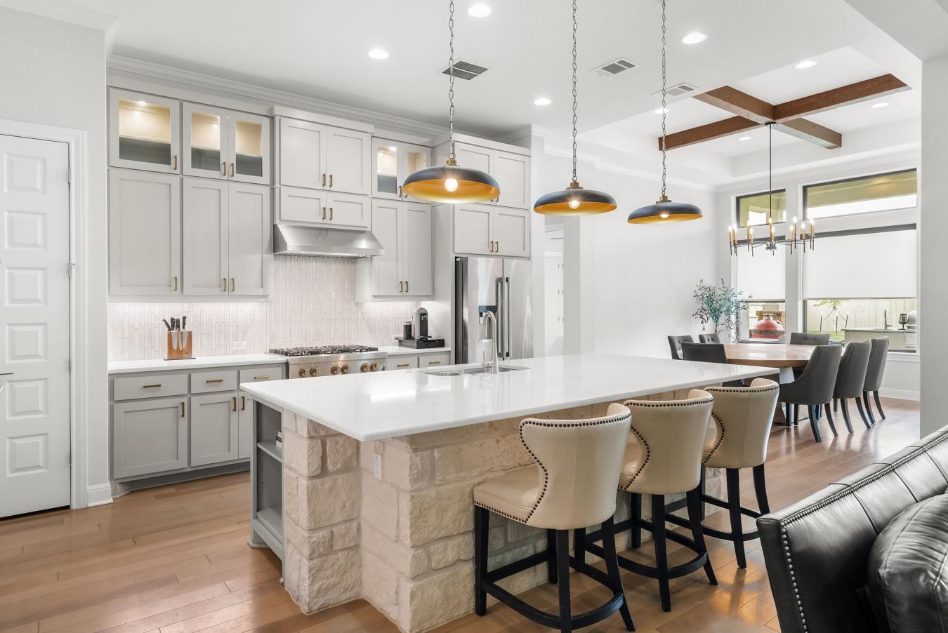 Located in the highly sought-after community of Santa Rita Ranch, this former model home sits on an expansive 90-foot homesite spanning over one third of an acre with no direct back neighbors. This single-story residence offers over 3,100 square feet with four bedrooms, five bathrooms, and a thoughtfully designed layout that blends luxury with functionality. From the moment you enter, the home showcases elevated design with tray ceilings, crown molding, and abundant natural light. The main living area is anchored by a floor-to-ceiling stone fireplace and flows seamlessly into the chefs kitchen, featuring a striking stone island with built-in storage, a six-burner industrial range, double ovens, two pantries, under-cabinet lighting, and custom cabinetry extending to the ceiling with glass fronts and integrated lighting. The primary suite is a true retreat, offering a spa-inspired bathroom with tile to the ceiling, a frameless super shower with two shower heads including a rain head, and dual benches for a luxurious experience. All secondary bedrooms are en suite, providing privacy and comfort for family and guests alike. A dedicated office with French glass doors and a closet adds flexibility while creating clearly defined living spaces throughout the home. Step outside to an oversized covered patio designed for entertaining, complete with a full outdoor kitchen and fireplace, all overlooking the spacious backyard with no direct rear neighbors. The three-car garage features epoxy flooring, adding both function and a clean finished look. Additional upgrades include premium hardware throughout, thoughtful designer touches, and the elevated finish out expected from a former model home. Located in Liberty Hill within Georgetown ISD, Santa Rita Ranch offers resort-style amenities including pools, parks, trails, a fitness center, and community events, making this home an exceptional opportunity in one of the areas most desirable neighborhoods.