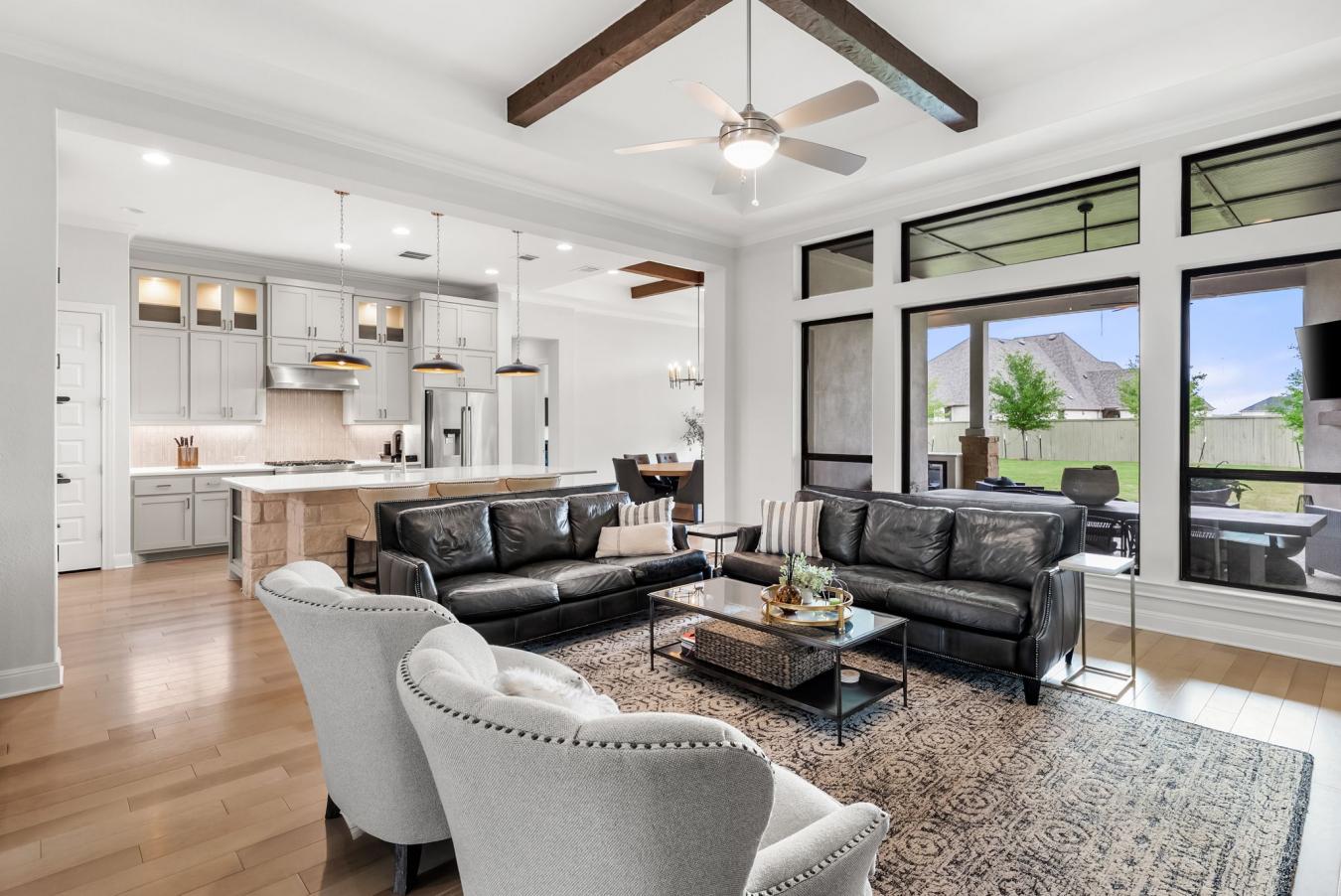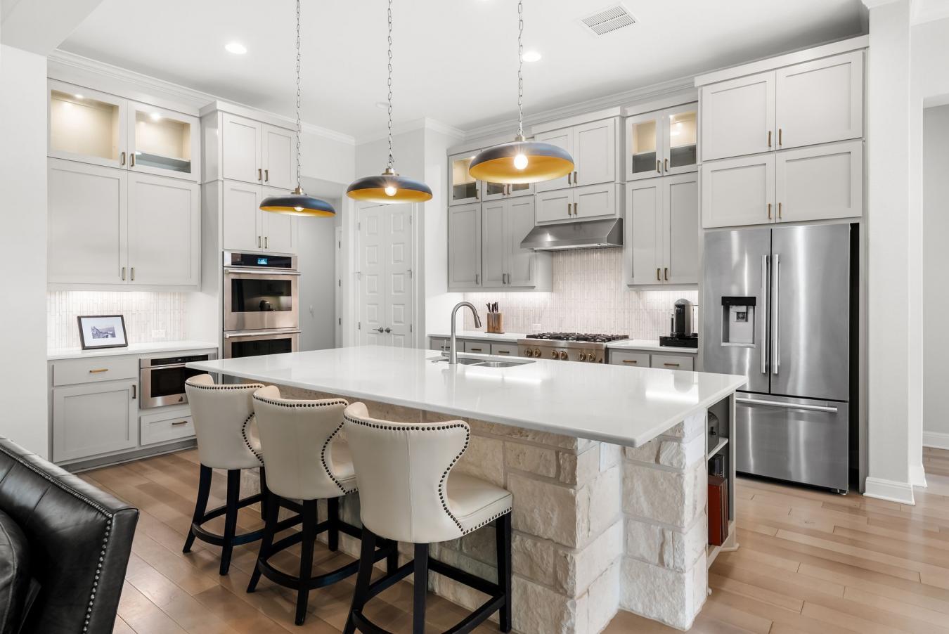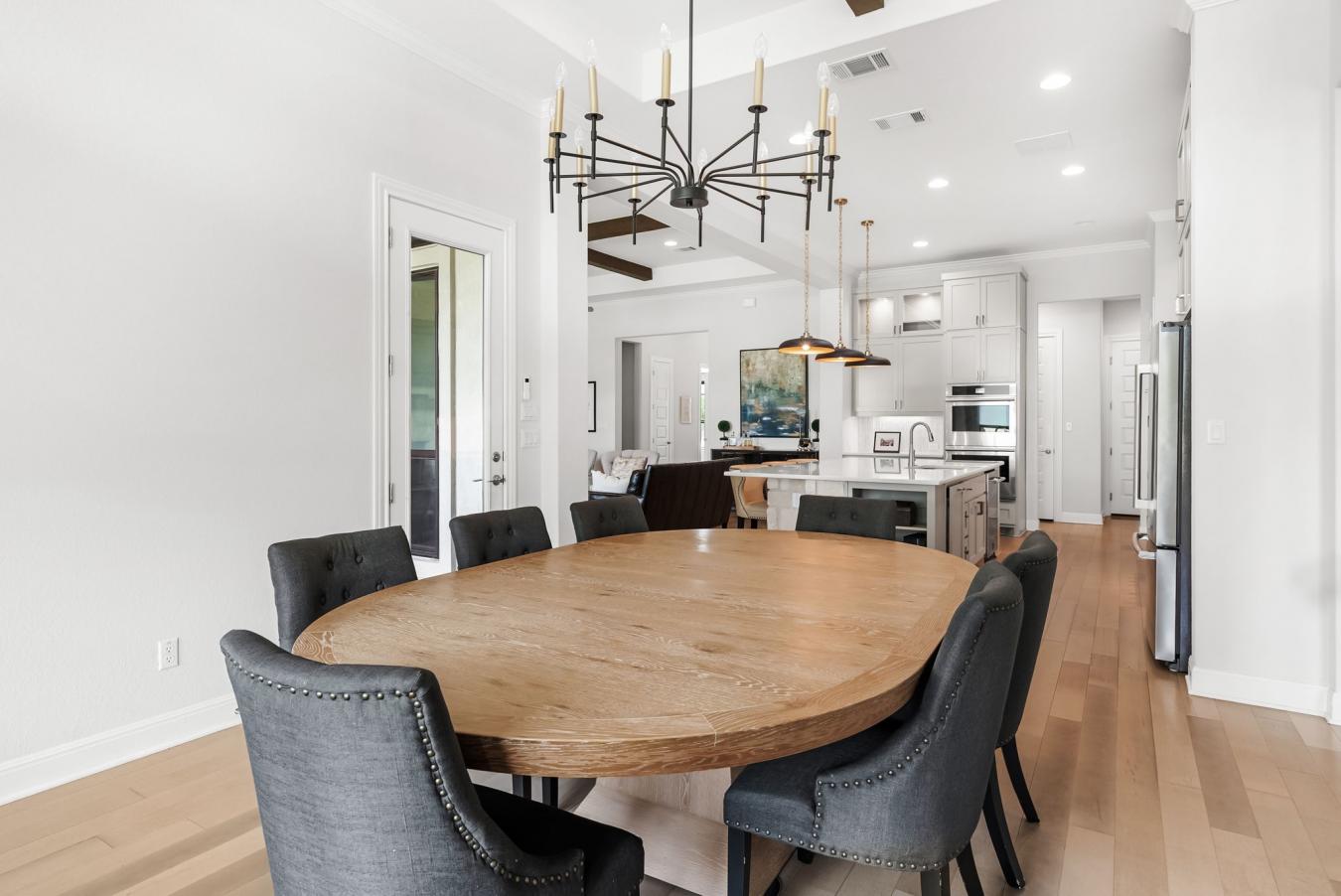 Located in the highly sought-after community of Santa Rita Ranch, this former model home sits on an expansive 90-foot homesite spanning over one third of an acre with no direct back neighbors. This single-story residence offers over 3,100 square feet with four bedrooms, five bathrooms, and a thoughtfully designed layout that blends luxury with functionality. From the moment you enter, the home showcases elevated design with tray ceilings, crown molding, and abundant natural light. The main living area is anchored by a floor-to-ceiling stone fireplace and flows seamlessly into the chefs kitchen, featuring a striking stone island with built-in storage, a six-burner industrial range, double ovens, two pantries, under-cabinet lighting, and custom cabinetry extending to the ceiling with glass fronts and integrated lighting. The primary suite is a true retreat, offering a spa-inspired bathroom with tile to the ceiling, a frameless super shower with two shower heads including a rain head, and dual benches for a luxurious experience. All secondary bedrooms are en suite, providing privacy and comfort for family and guests alike. A dedicated office with French glass doors and a closet adds flexibility while creating clearly defined living spaces throughout the home. Step outside to an oversized covered patio designed for entertaining, complete with a full outdoor kitchen and fireplace, all overlooking the spacious backyard with no direct rear neighbors. The three-car garage features epoxy flooring, adding both function and a clean finished look. Additional upgrades include premium hardware throughout, thoughtful designer touches, and the elevated finish out expected from a former model home. Located in Liberty Hill within Georgetown ISD, Santa Rita Ranch offers resort-style amenities including pools, parks, trails, a fitness center, and community events, making this home an exceptional opportunity in one of the areas most desirable neighborhoods.
