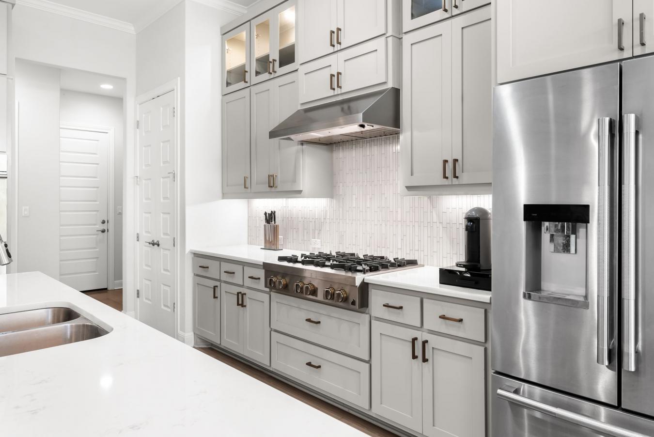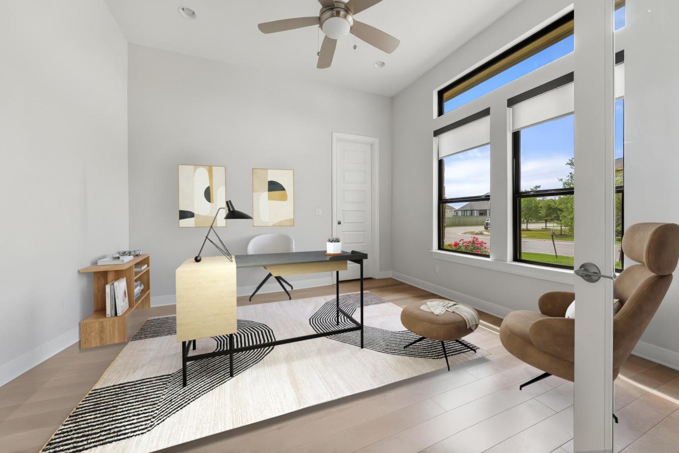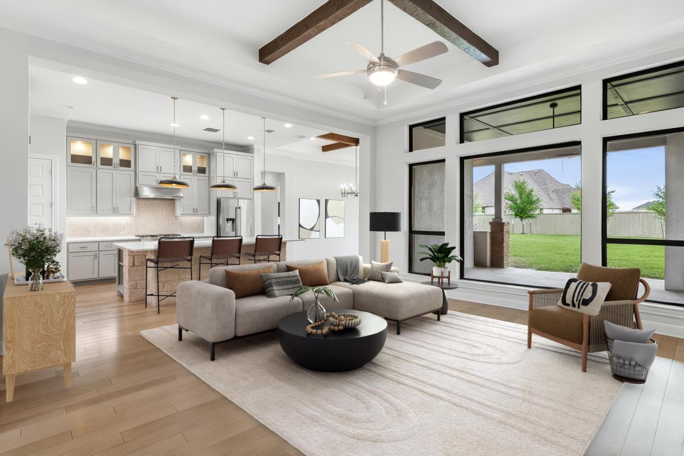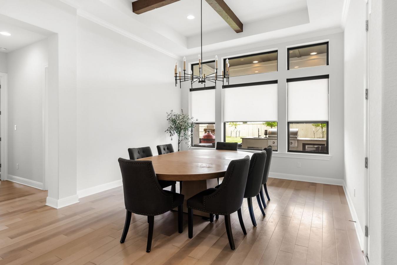 Located in the highly sought-after community of Santa Rita Ranch, this former model home sits on an expansive 90-foot homesite spanning over one third of an acre with no direct back neighbors. This single-story residence offers over 3,100 square feet with four bedrooms, five bathrooms, and a thoughtfully designed layout that blends luxury with functionality. From the moment you enter, the home showcases elevated design with tray ceilings, crown molding, and abundant natural light. The main living area is anchored by a floor-to-ceiling stone fireplace and flows seamlessly into the chefs kitchen, featuring a striking stone island with built-in storage, a six-burner industrial range, double ovens, two pantries, under-cabinet lighting, and custom cabinetry extending to the ceiling with glass fronts and integrated lighting. The primary suite is a true retreat, offering a spa-inspired bathroom with tile to the ceiling, a frameless super shower with two shower heads including a rain head, and dual benches for a luxurious experience. All secondary bedrooms are en suite, providing privacy and comfort for family and guests alike. A dedicated office with French glass doors and a closet adds flexibility while creating clearly defined living spaces throughout the home. Step outside to an oversized covered patio designed for entertaining, complete with a full outdoor kitchen and fireplace, all overlooking the spacious backyard with no direct rear neighbors. The three-car garage features epoxy flooring, adding both function and a clean finished look. Additional upgrades include premium hardware throughout, thoughtful designer touches, and the elevated finish out expected from a former model home. Located in Liberty Hill within Georgetown ISD, Santa Rita Ranch offers resort-style amenities including pools, parks, trails, a fitness center, and community events, making this home an exceptional opportunity in one of the areas most desirable neighborhoods.