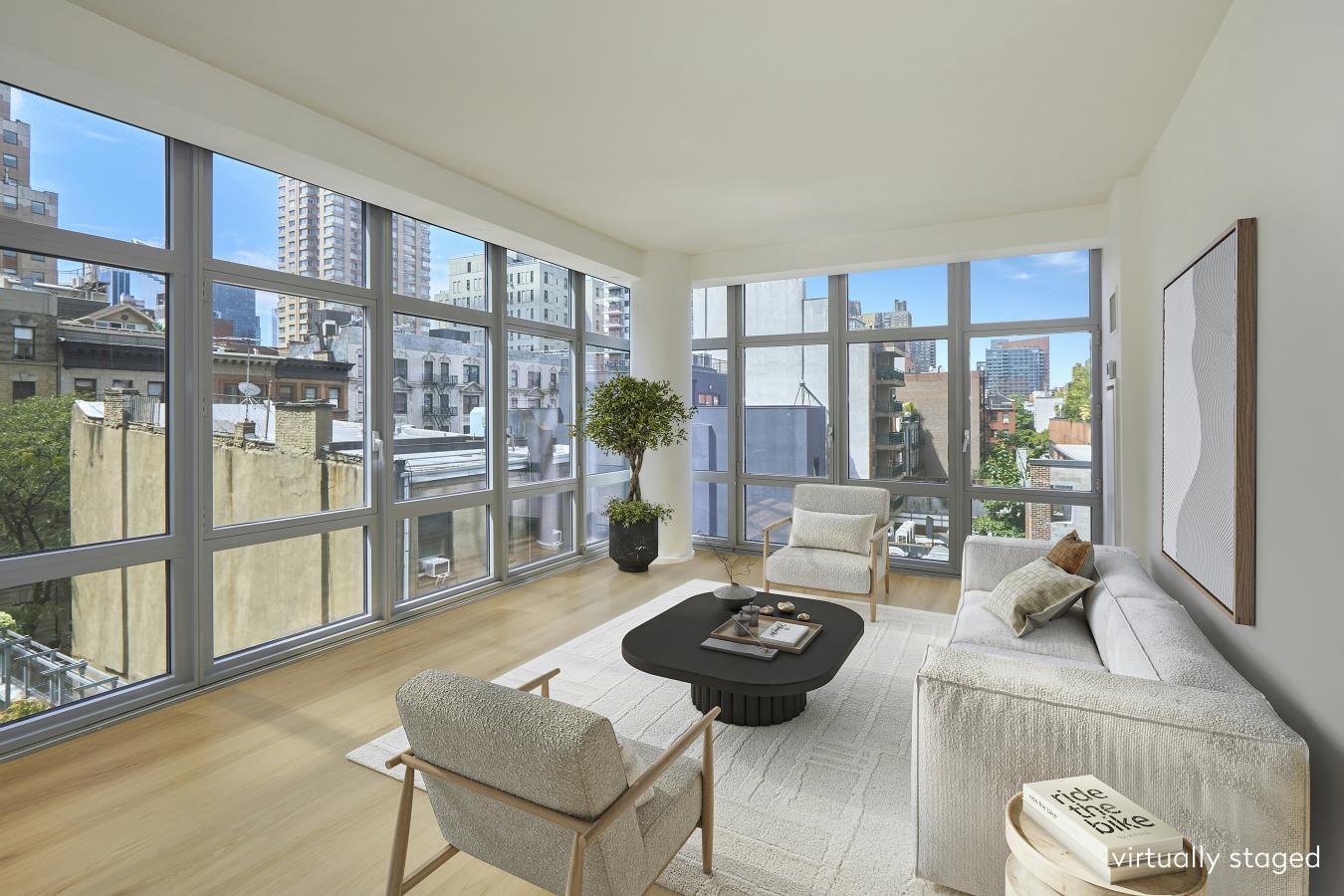 Sun-Filled Corner Residence at The Link Condominium Welcome to your elegant new 2-bedroom, 2-bath corner residence at The Link Condominium with captivating views and magnificent sunsets. Bathed in natural light, this beautifully appointed home features 9-foot floor-to-ceiling wraparound window walls showcasing south and west cityscape vistas while overlooking the buildings tranquil Zen meditation garden. The primary bedroom boasts a luxurious en-suite bath, and both full bathrooms feature spa-like finishes, including ocean glass subway tile and backlit mirrored vanities-with double sinks in the primary. The chefs kitchen is outfitted with Poggenpohl cabinetry, Bluestone countertops, and high-end Bosch appliances, including a cooktop, oven, microwave, dishwasher, and Sub-Zero refrigerator. Additional highlights include automatic touch-control window treatments, an in-unit washer/dryer, and hardwood floors throughout. The Link Condominium-a striking glass and steel tower designed by internationally acclaimed architect Costas Kondylis-offers full-service amenities including a 24-hour doorman/concierge, grand lobby, state-of-the-art fitness center, landscaped outdoor terrace, and a serene Zen garden to escape the citys pace. This unbeatable location is near Central Park, the Theater District, Lincoln Center, Columbus Circle, Whole Foods, premier dining, shopping, and all major transportation options. Pet-friendly.