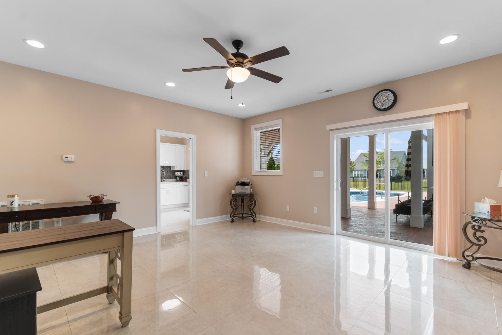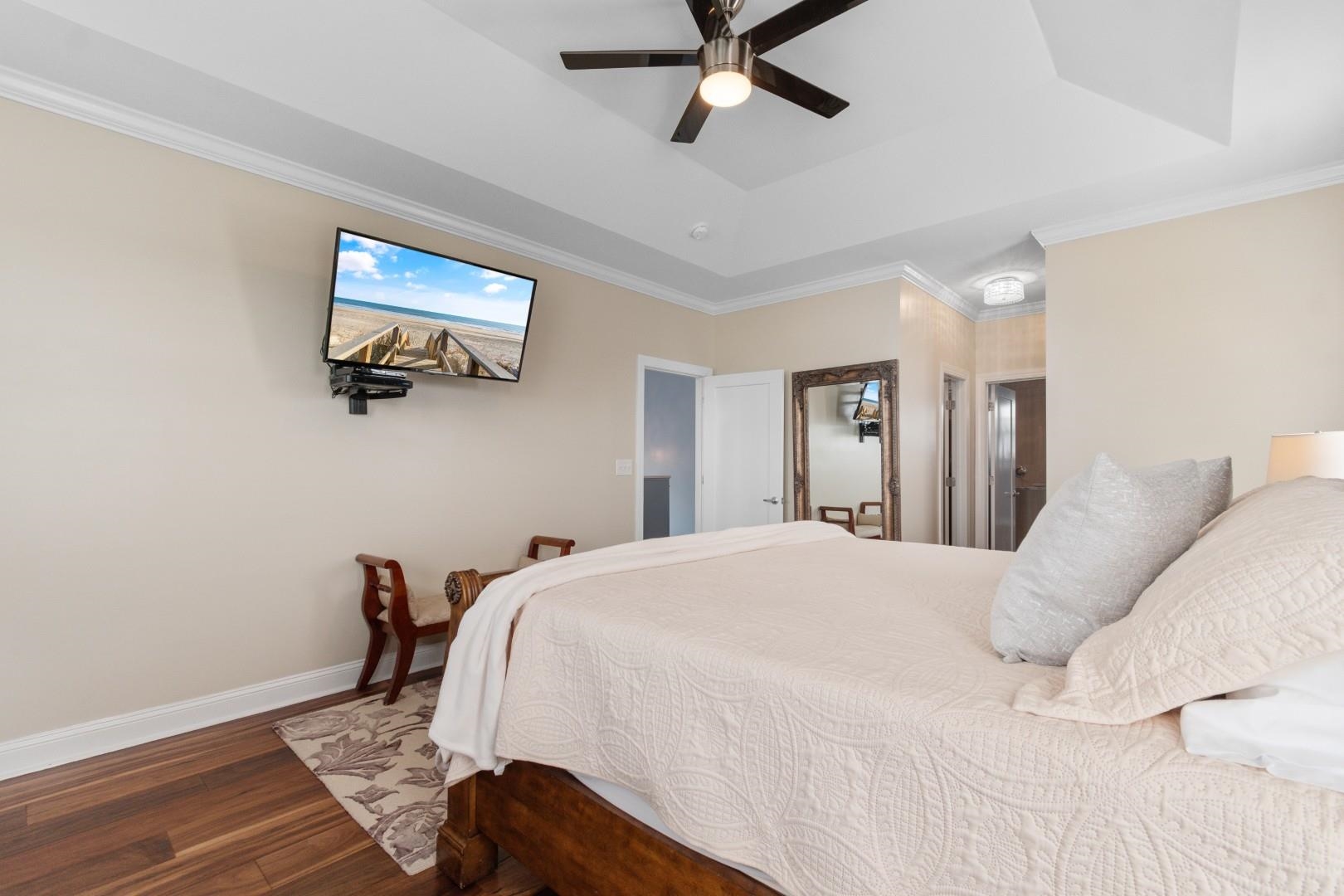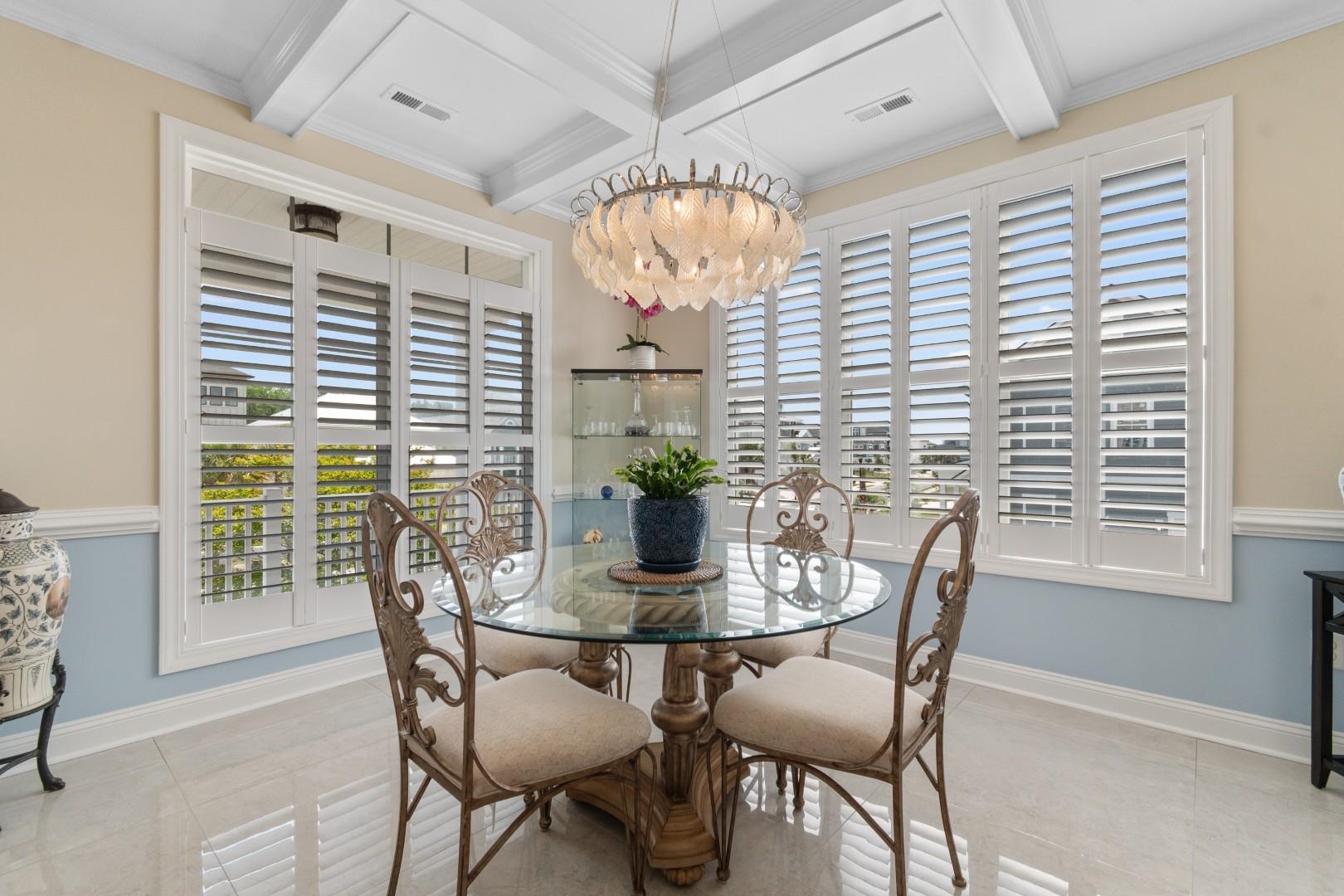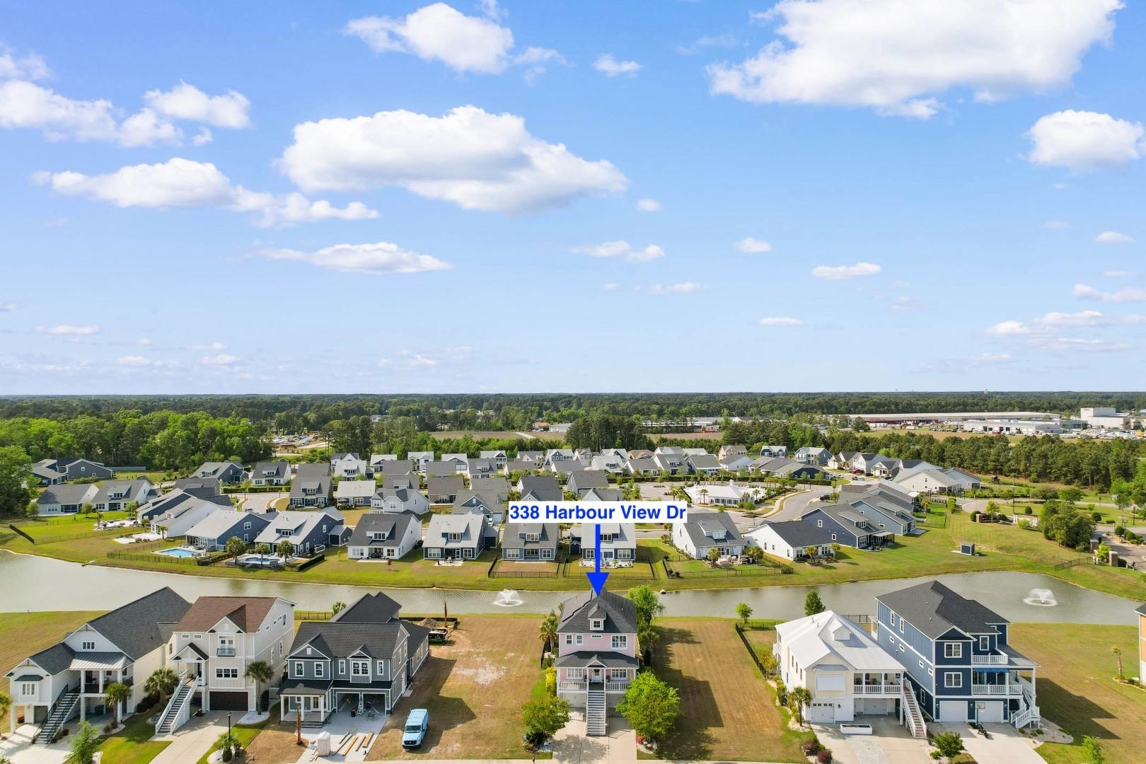 Embrace a lifestyle of contemporary coastal elegance at 338 Harbour View Drive, a breathtaking three-story sanctuary situated in the prestigious Boardwalk on the Waterway enclave. Defined by crisp minimalism and polished sophistication, the interior shines with 30x30 reflective floor tiles and a gourmet kitchen outfitted with high-gloss cabinetry from Holland and swirled marble-granite surfaces. From the formal dining room's ornate coffered ceilings to the dazzling Ethan Allen centerpiece over the staircase, every corner of this 3,134-square-foot residence has been curated to maximize natural light and views of the surrounding boating paradise. The property's layout is uniquely functional, highlighted by a ground-level living space that offers immense lifestyle value. This self-contained suite features a stylish kitchenette, private laundry, and a full bath, serving perfectly as an in-law/guest retreat, luxurious poolside cabana, or family game-room & flex space. Large sliding doors provide seamless transitions from this suite to a backyard oasis, where a heated saltwater pool sits framed by privacy hedges and swaying palms. Whether you are relaxing on the oversized second-story veranda or enjoying the evening glow of the pool's dusk-to-dawn lighting, the outdoor living spaces are designed for effortless entertaining. Opulence continues on the top floor within the primary suite, a sprawling refuge featuring a tray ceiling and a spectacular walk-through wet room shower. Beyond the visual appeal, this home is a model of modern efficiency, boasting a fully owned 17-panel solar system that slashes energy expenses, alongside a tankless water heater and a three-car capacity garage with epoxy flooring. With exclusive access to a community boat launch and a scenic boardwalk, this home represents a rare opportunity to own a high-tech, custom-built gem just minutes from the sands of Myrtle Beach.