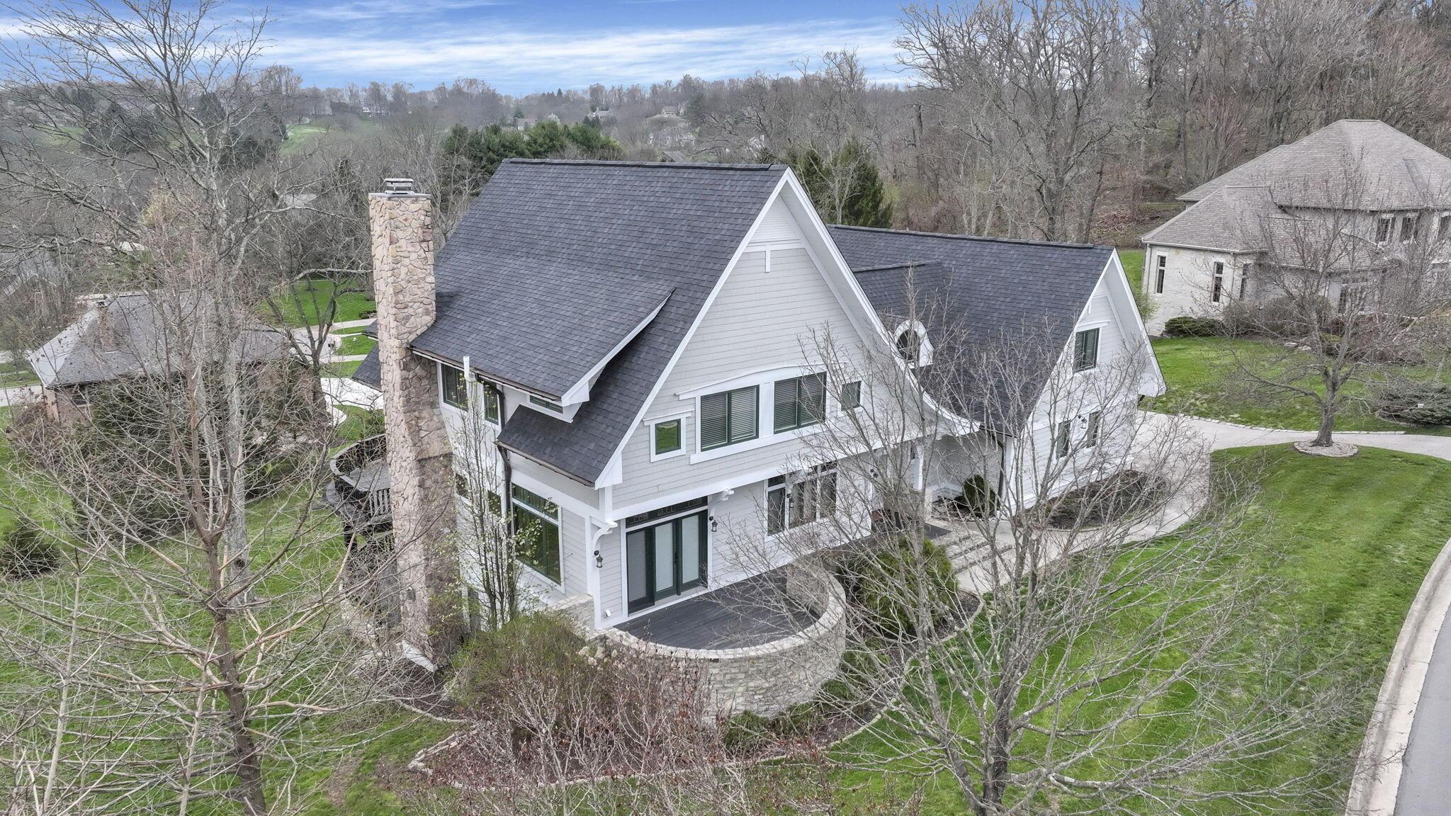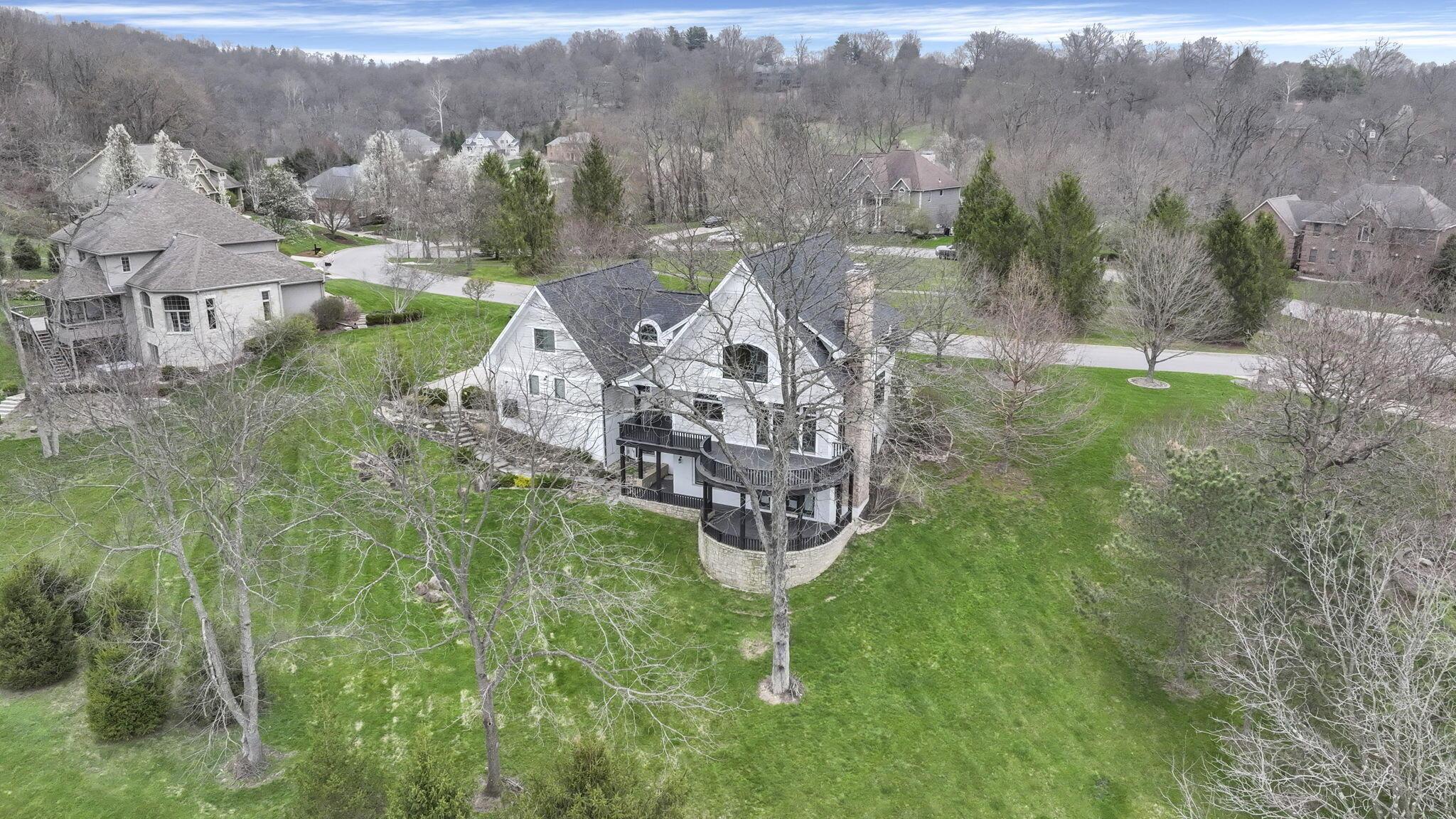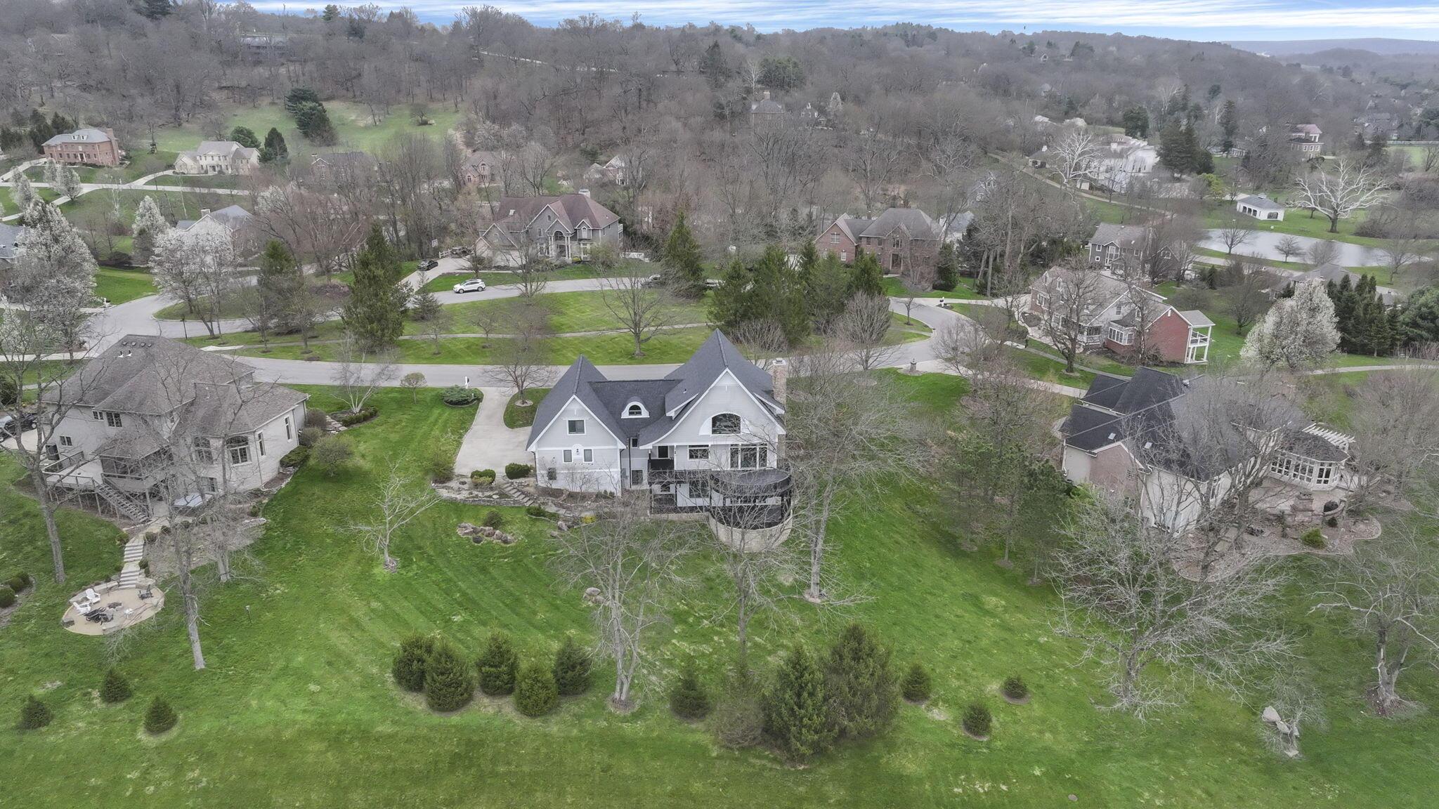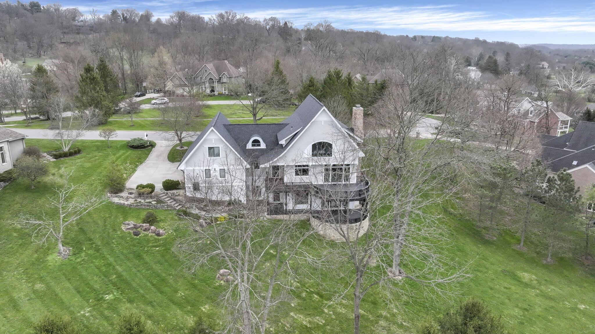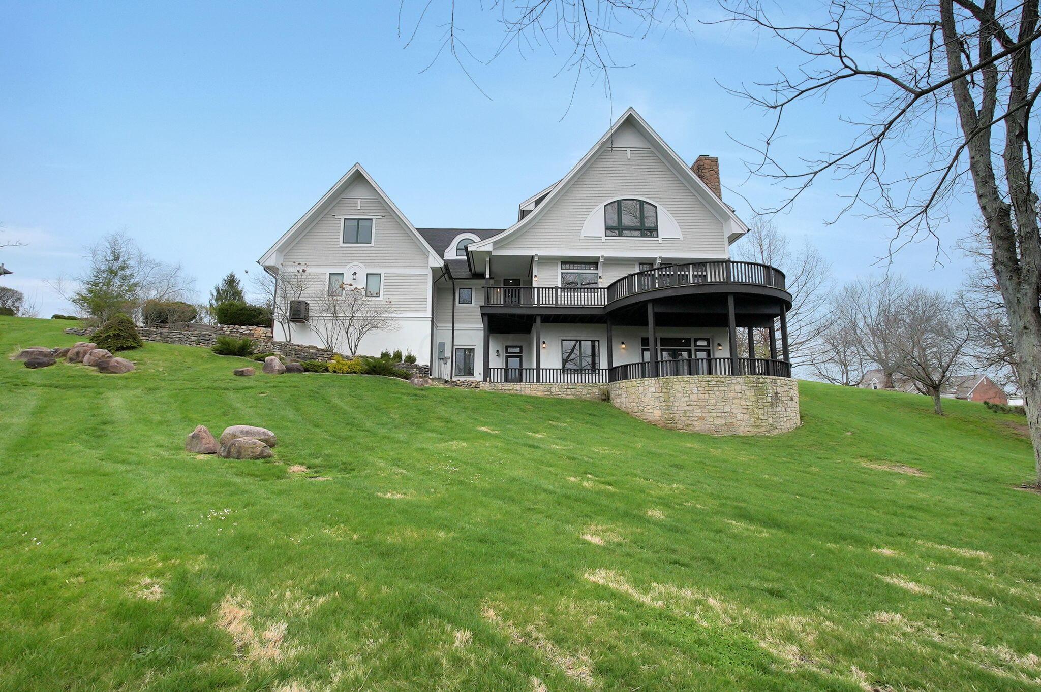 Set on a picturesque hilltop in the sought-after Bryn Du Woods community, this custom-built home offers exceptional privacy at the end of a quiet cul-de-sac and breathtaking, year-round views. The incredible home showcases high-end craftsmanship throughout, including rich woodwork, striking stone accents, custom built-ins, gleaming hardwood floors, and three inviting decks designed to capture the natural surroundings, perfect for relaxing and entertaining.The thoughtfully designed open floor plan blends elegance and functionality, featuring a chefs kitchen with soapstone countertops that flows seamlessly into the spacious great room with a stunning stone fireplace, as well as an eat-in area and formal dining room--ideal for both everyday living and entertaining.The luxurious owners suite is a true retreat, complete with a spa-inspired bath, generous walk-in closet, and a dramatic picture window framing serene, panoramic views.Additional highlights include a main-level den or office, comfortable family bedrooms, and an expansive walk-out lower level with a private entrance. This versatile space features a wet bar, stone fireplace, an additional bedroom, office, and a full bath--perfect for guests, multi-generational living, or an in-law suite.This exceptional home combines refined living with natural beauty in one of Granvilles most desirable neighborhoods.