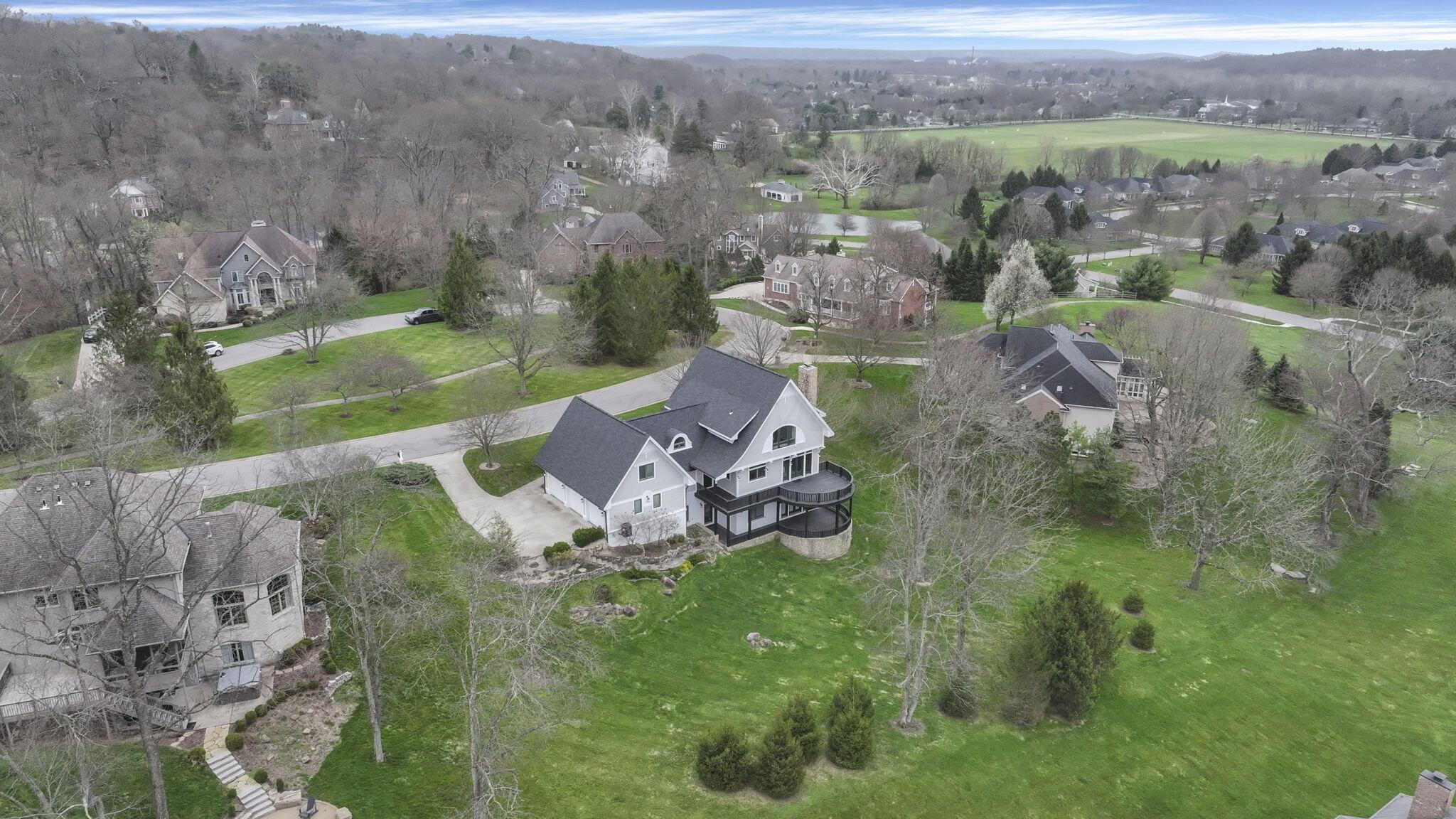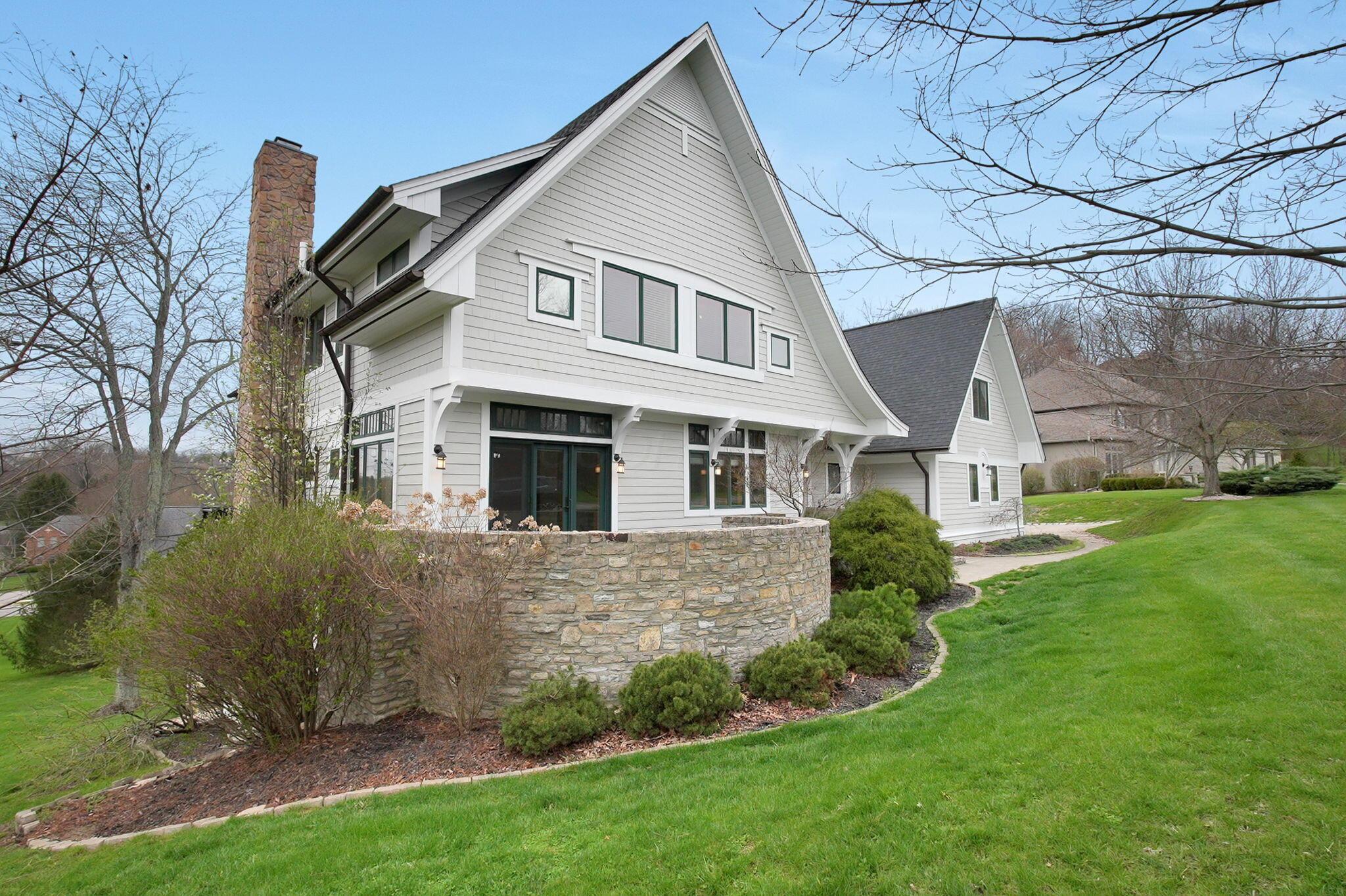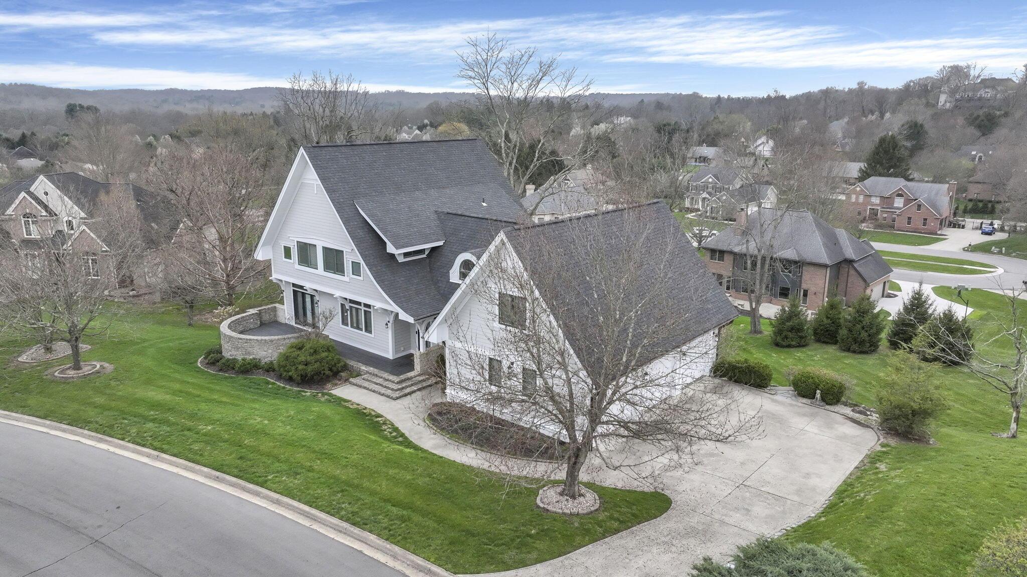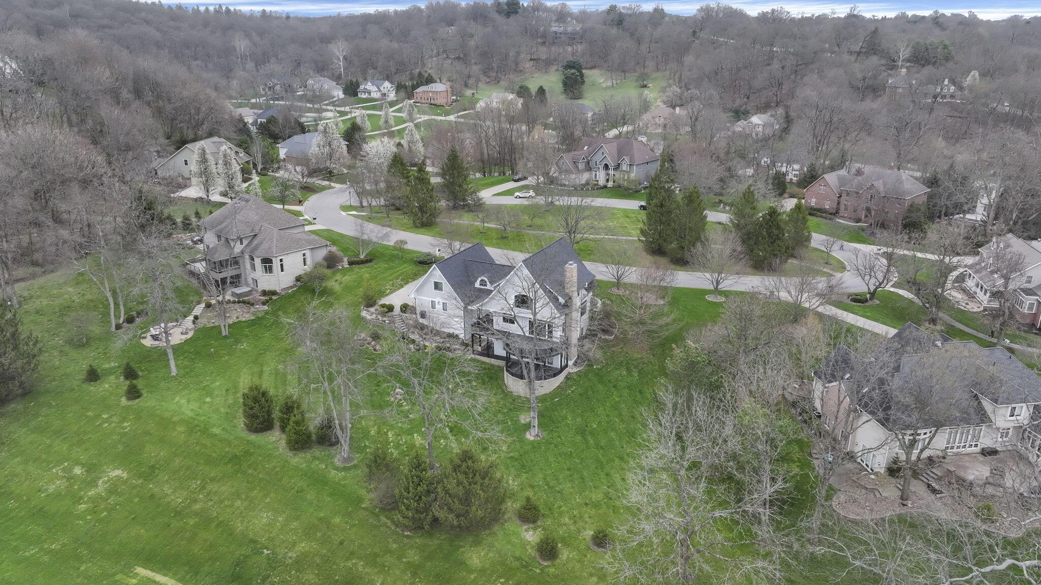 Set on a picturesque hilltop in the sought-after Bryn Du Woods community, this custom-built home offers exceptional privacy at the end of a quiet cul-de-sac and breathtaking, year-round views. The incredible home showcases high-end craftsmanship throughout, including rich woodwork, striking stone accents, custom built-ins, gleaming hardwood floors, and three inviting decks designed to capture the natural surroundings, perfect for relaxing and entertaining.The thoughtfully designed open floor plan blends elegance and functionality, featuring a chefs kitchen with soapstone countertops that flows seamlessly into the spacious great room with a stunning stone fireplace, as well as an eat-in area and formal dining room--ideal for both everyday living and entertaining.The luxurious owners suite is a true retreat, complete with a spa-inspired bath, generous walk-in closet, and a dramatic picture window framing serene, panoramic views.Additional highlights include a main-level den or office, comfortable family bedrooms, and an expansive walk-out lower level with a private entrance. This versatile space features a wet bar, stone fireplace, an additional bedroom, office, and a full bath--perfect for guests, multi-generational living, or an in-law suite.This exceptional home combines refined living with natural beauty in one of Granvilles most desirable neighborhoods.