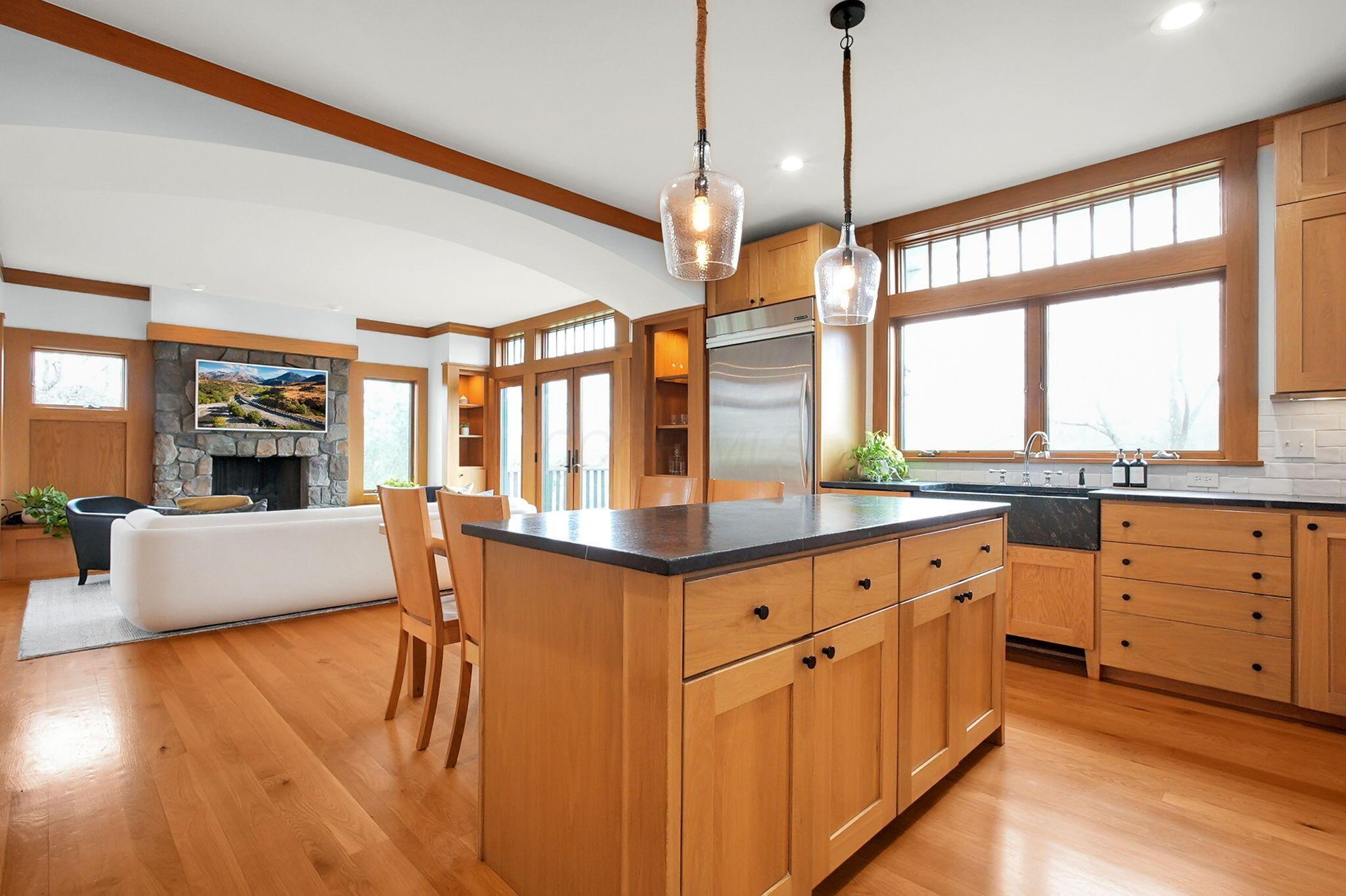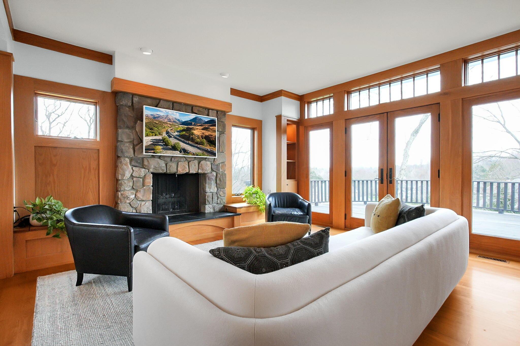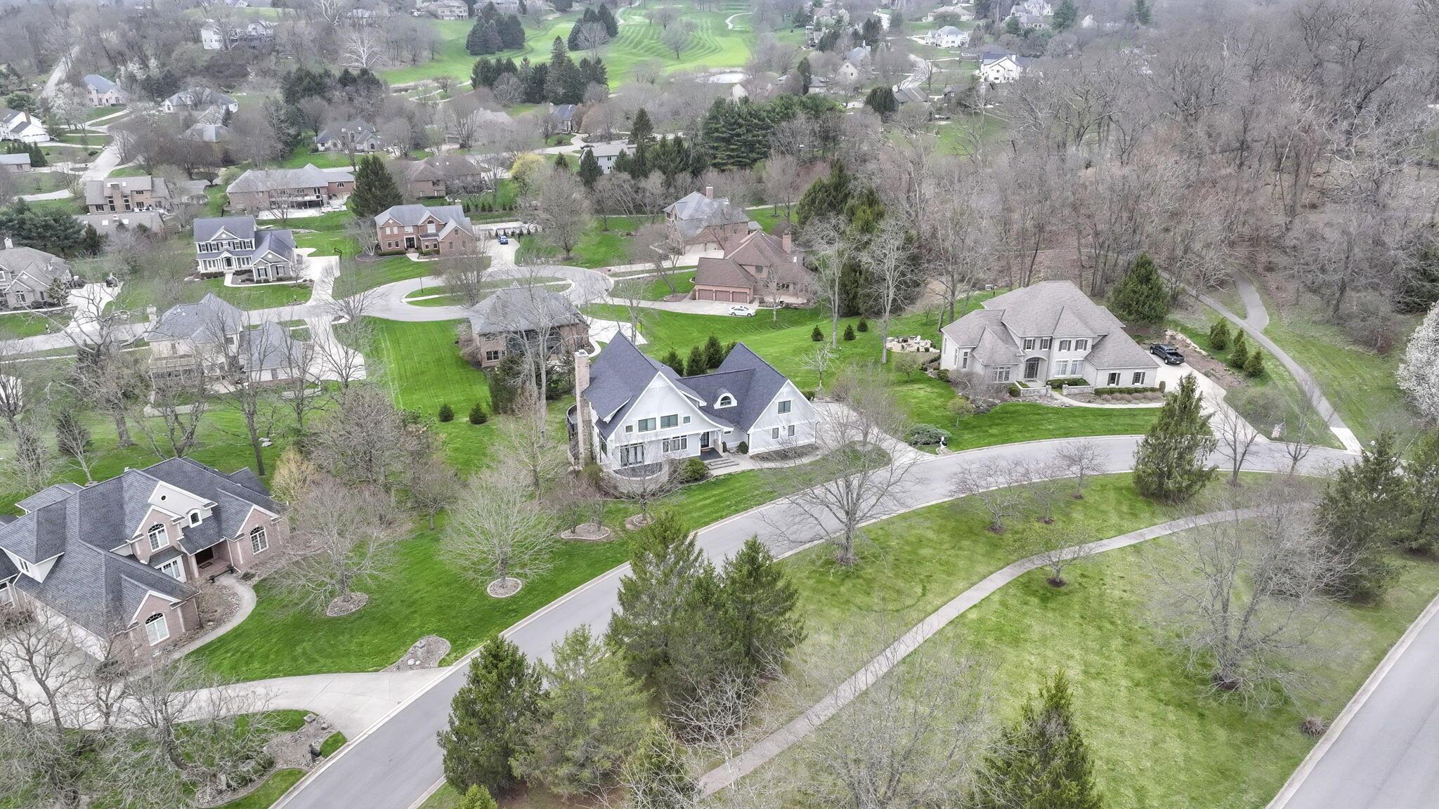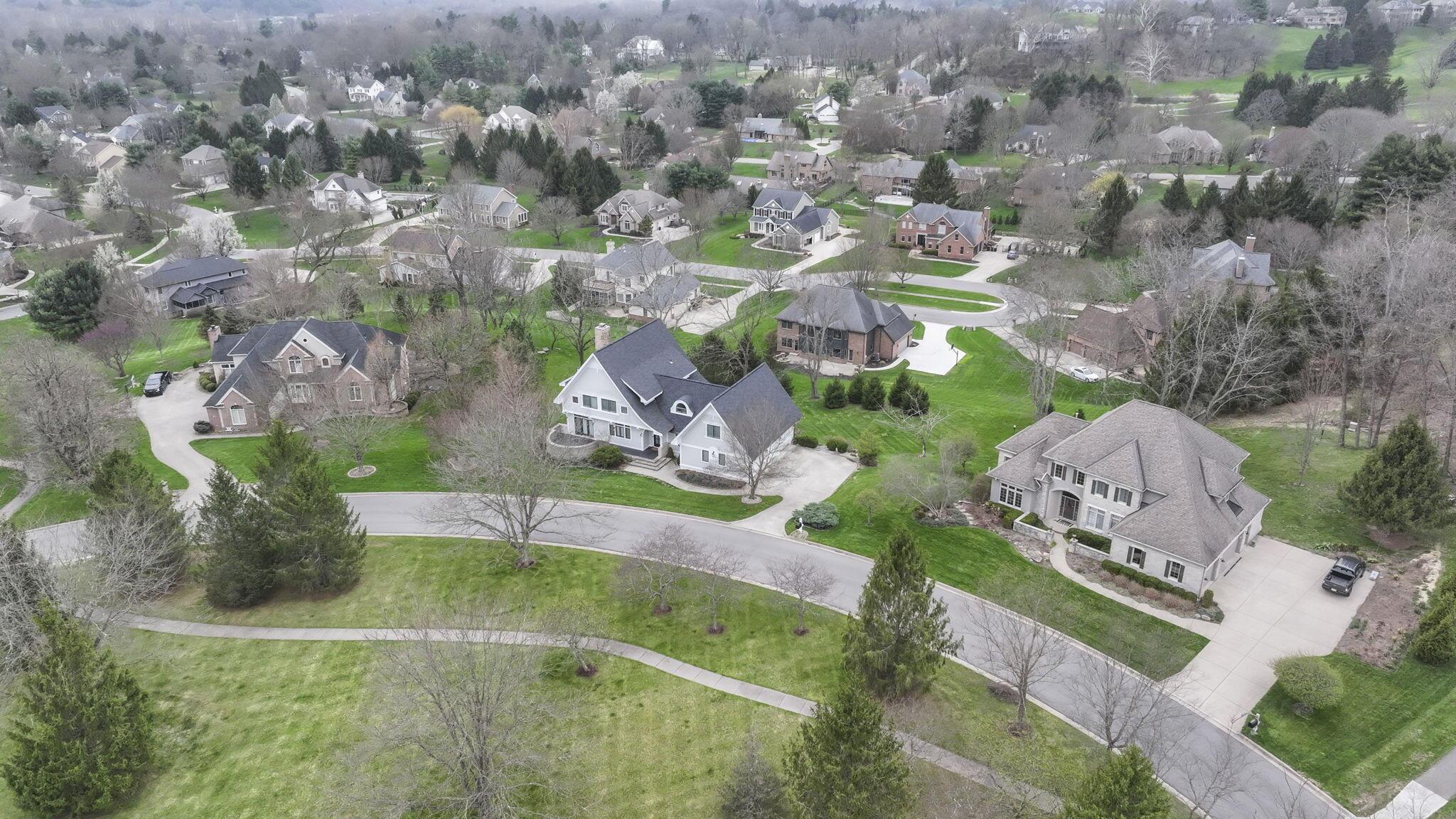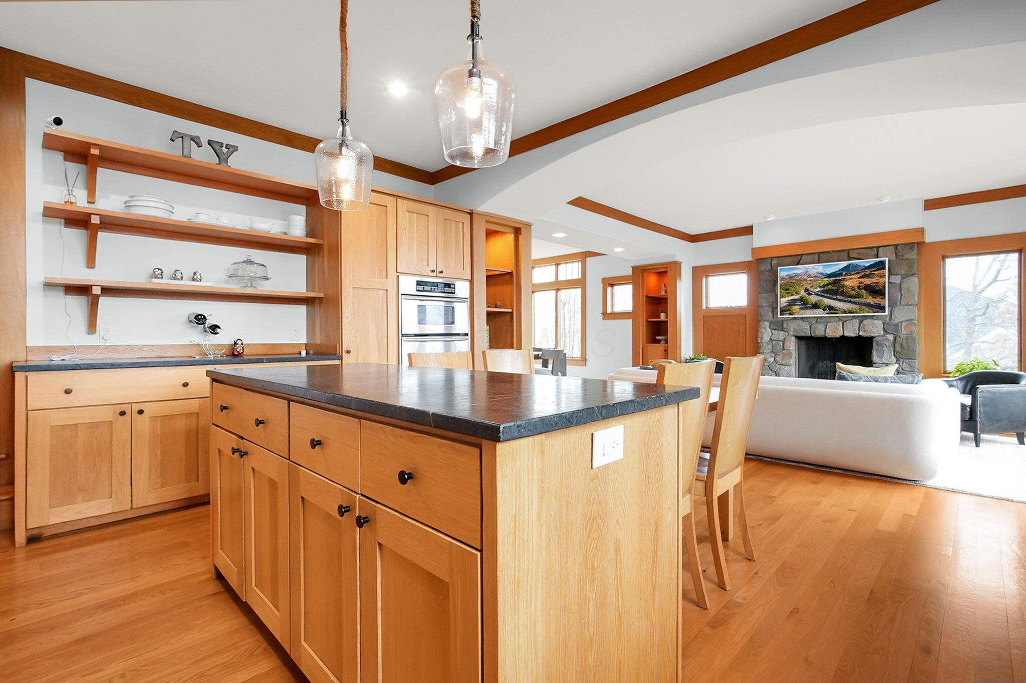 Set on a picturesque hilltop in the sought-after Bryn Du Woods community, this custom-built home offers exceptional privacy at the end of a quiet cul-de-sac and breathtaking, year-round views. The incredible home showcases high-end craftsmanship throughout, including rich woodwork, striking stone accents, custom built-ins, gleaming hardwood floors, and three inviting decks designed to capture the natural surroundings, perfect for relaxing and entertaining.The thoughtfully designed open floor plan blends elegance and functionality, featuring a chefs kitchen with soapstone countertops that flows seamlessly into the spacious great room with a stunning stone fireplace, as well as an eat-in area and formal dining room--ideal for both everyday living and entertaining.The luxurious owners suite is a true retreat, complete with a spa-inspired bath, generous walk-in closet, and a dramatic picture window framing serene, panoramic views.Additional highlights include a main-level den or office, comfortable family bedrooms, and an expansive walk-out lower level with a private entrance. This versatile space features a wet bar, stone fireplace, an additional bedroom, office, and a full bath--perfect for guests, multi-generational living, or an in-law suite.This exceptional home combines refined living with natural beauty in one of Granvilles most desirable neighborhoods.