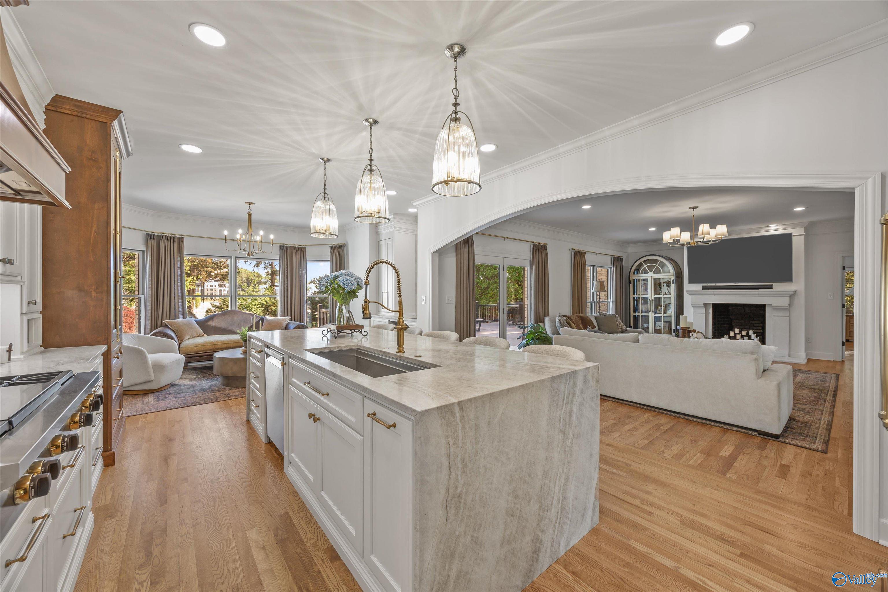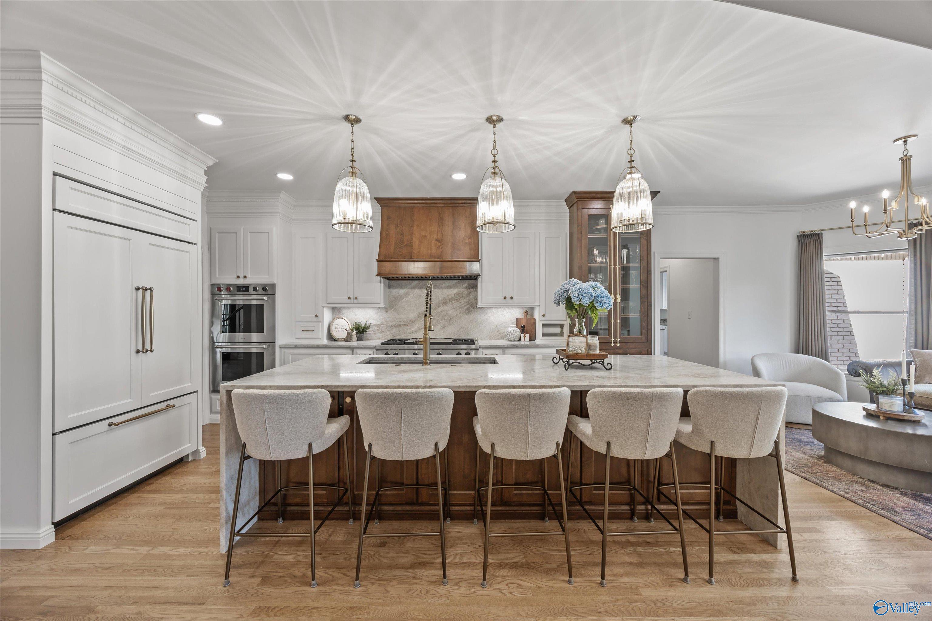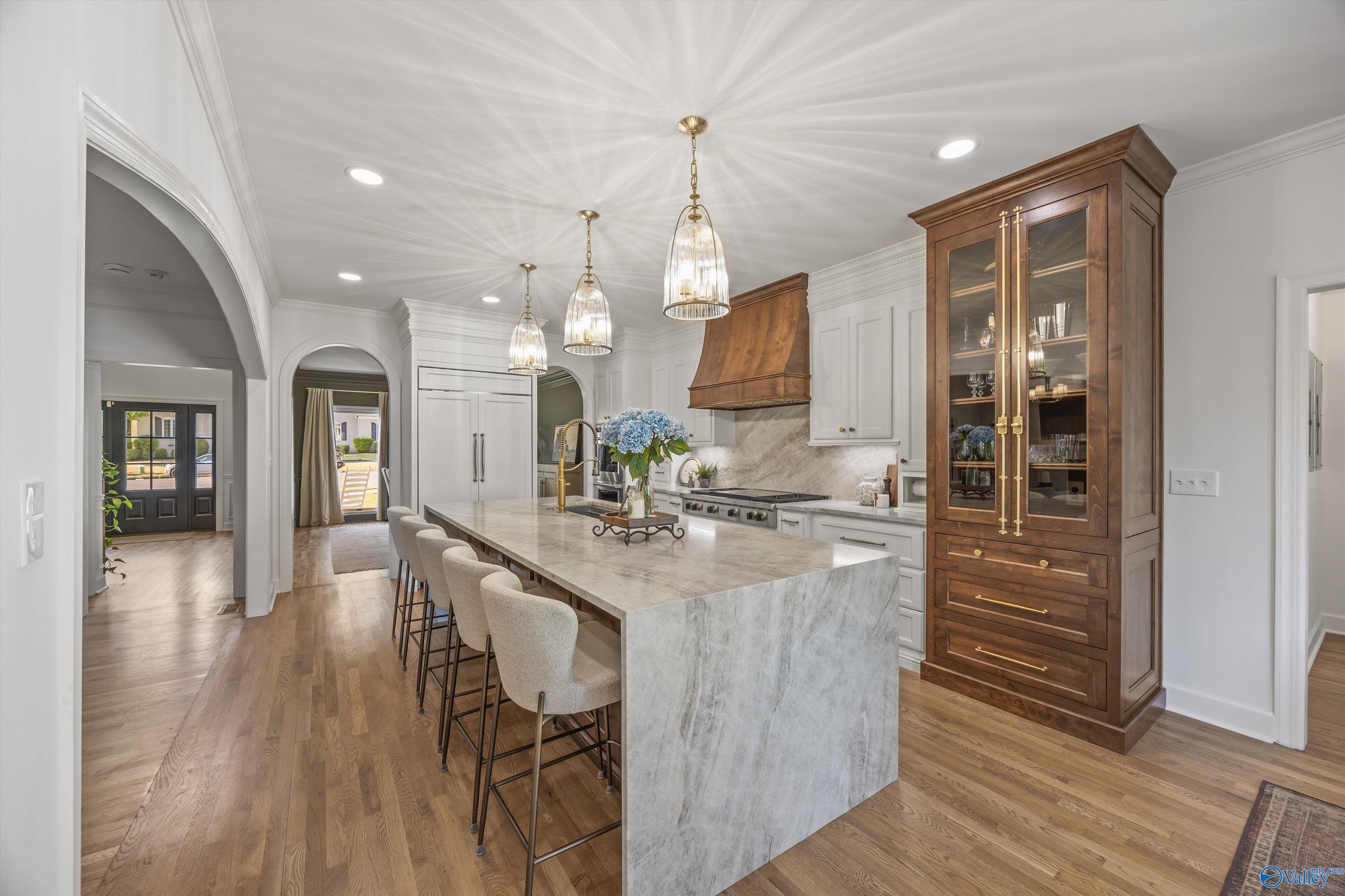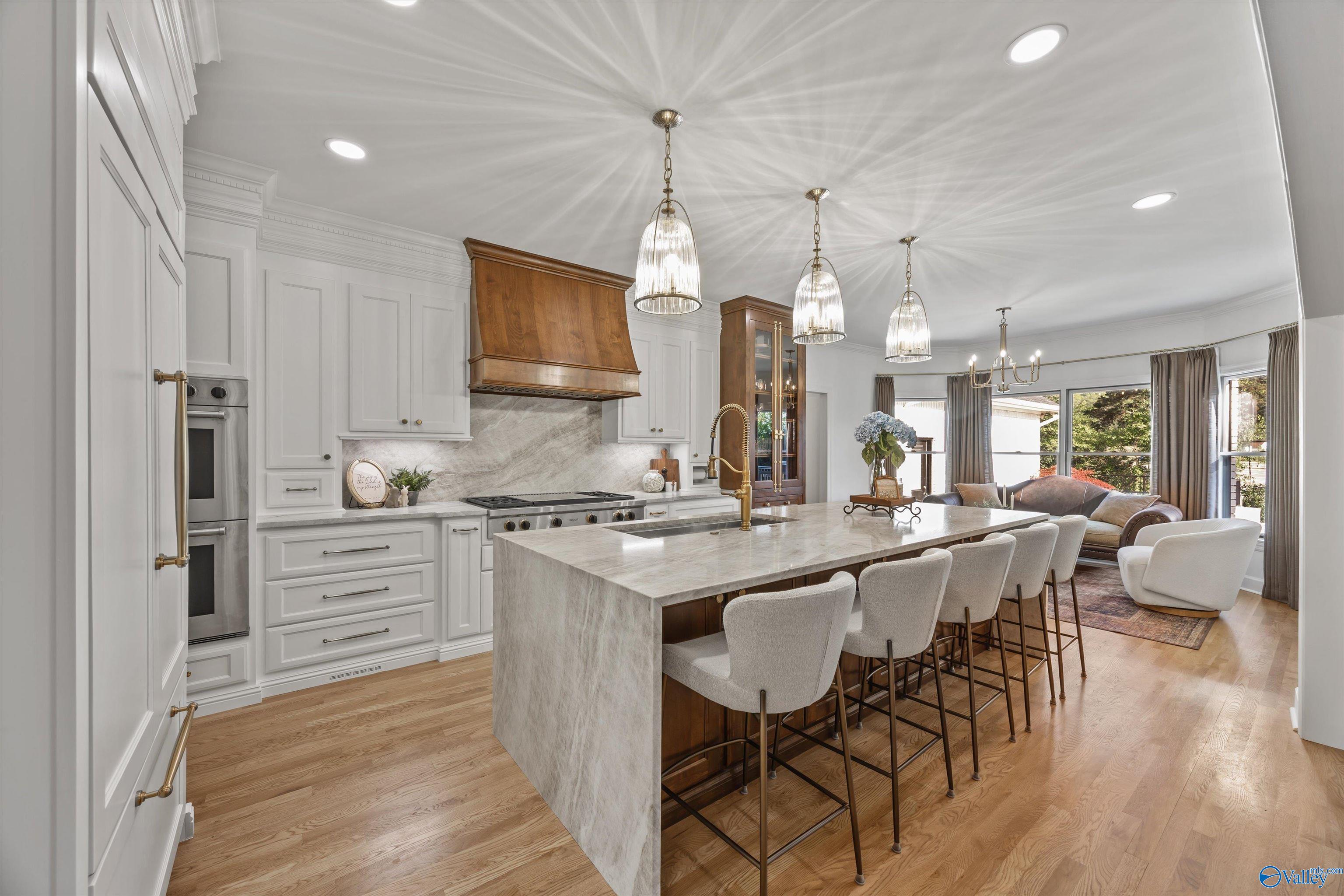 Refined and striking, this Jones Valley residence pairs architectural presence with effortless livability, set on a secluded cul de sac. The kitchen is a study in form and function, featuring waterfall Quartzite counters, Wolf and SubZero appliances, and custom cabinetry, opening to sunlit interiors with hardwood floors throughout the main level.